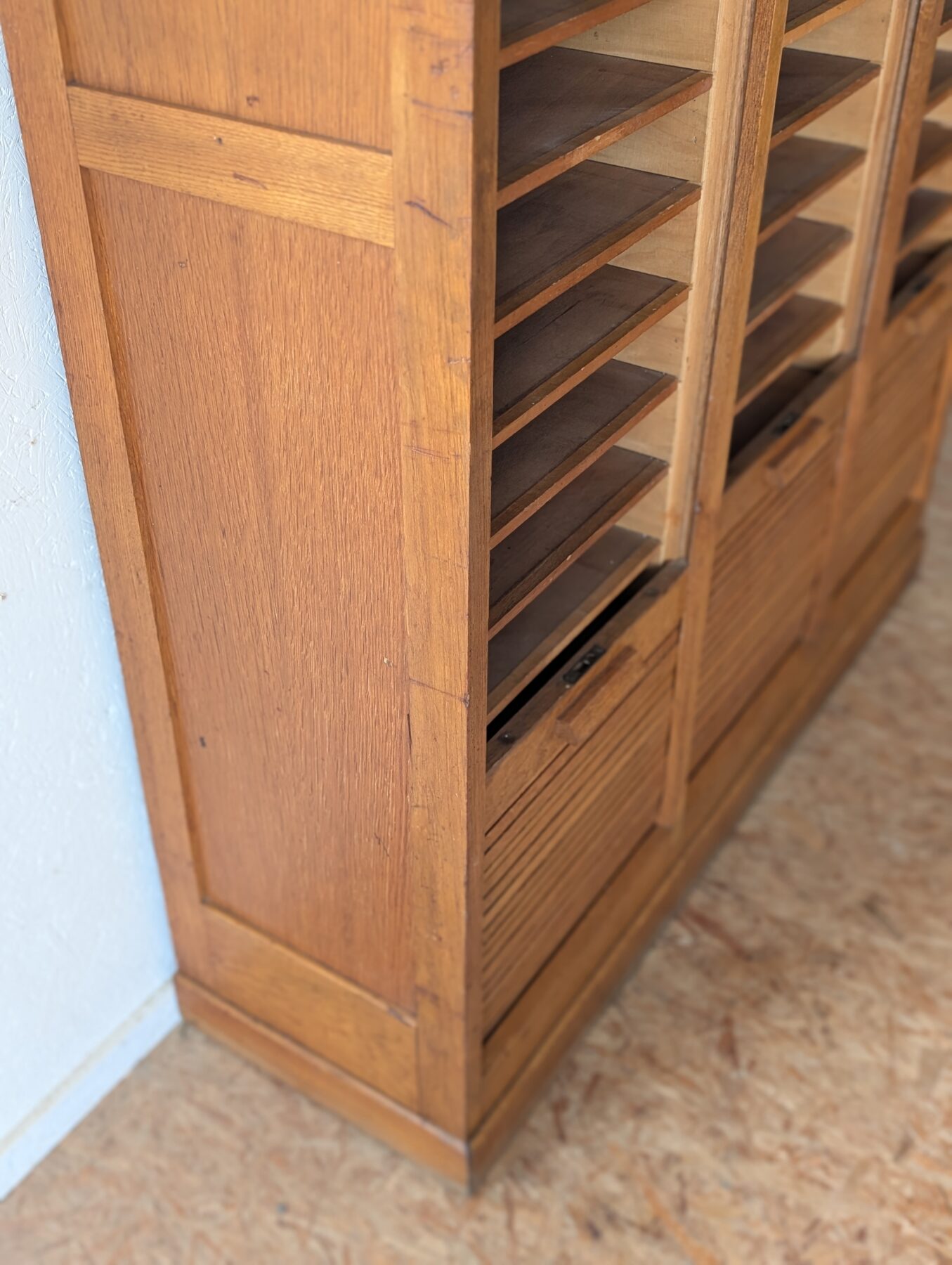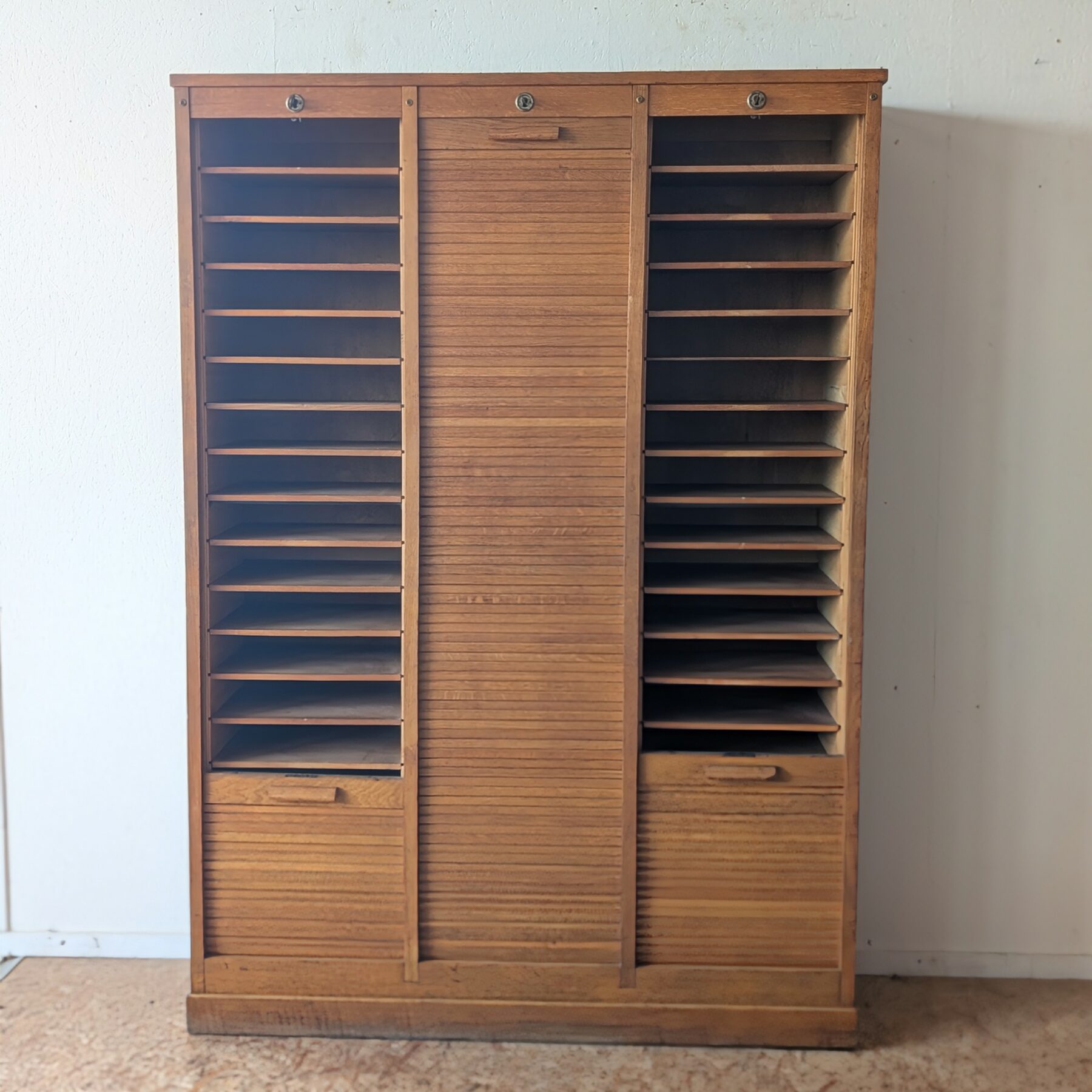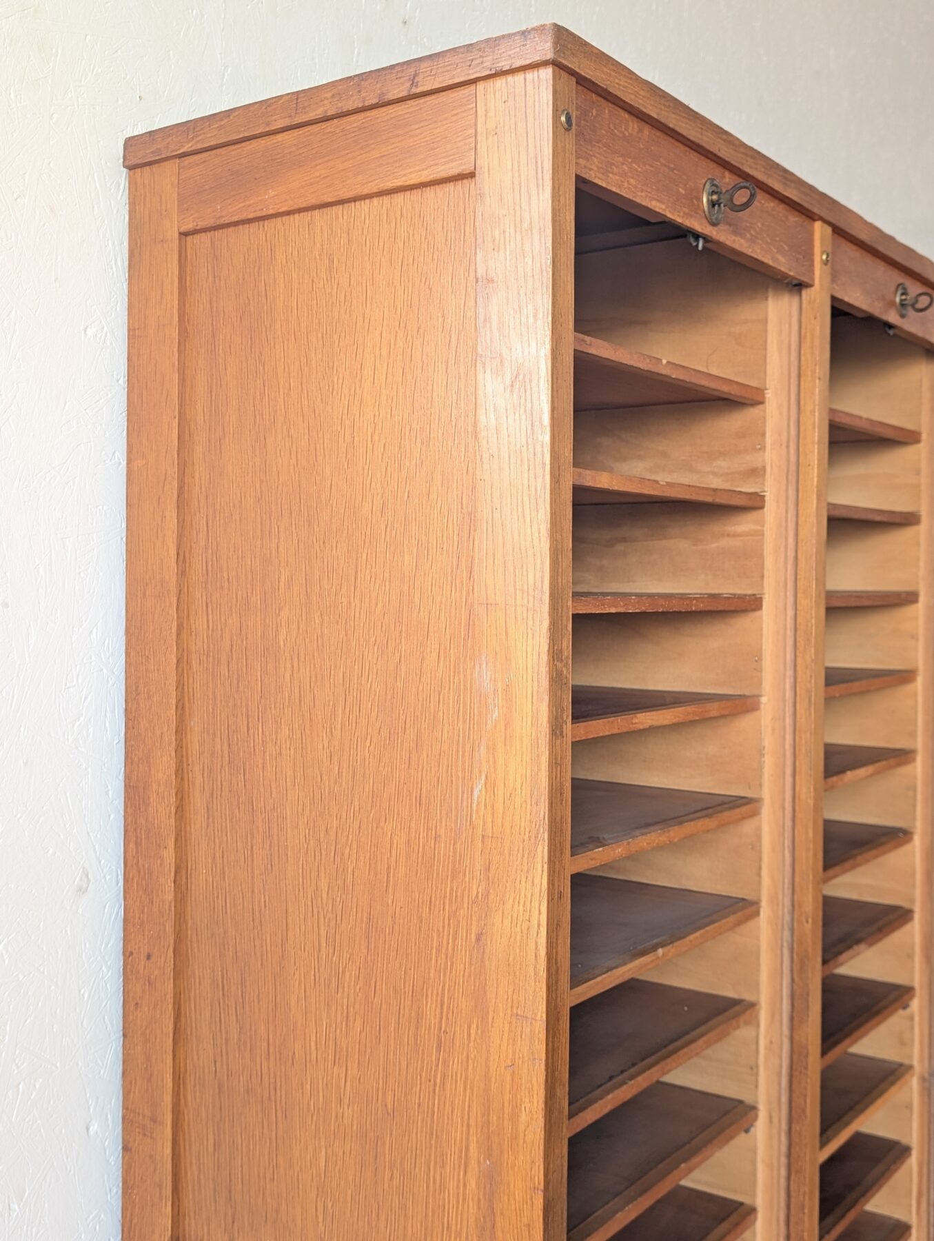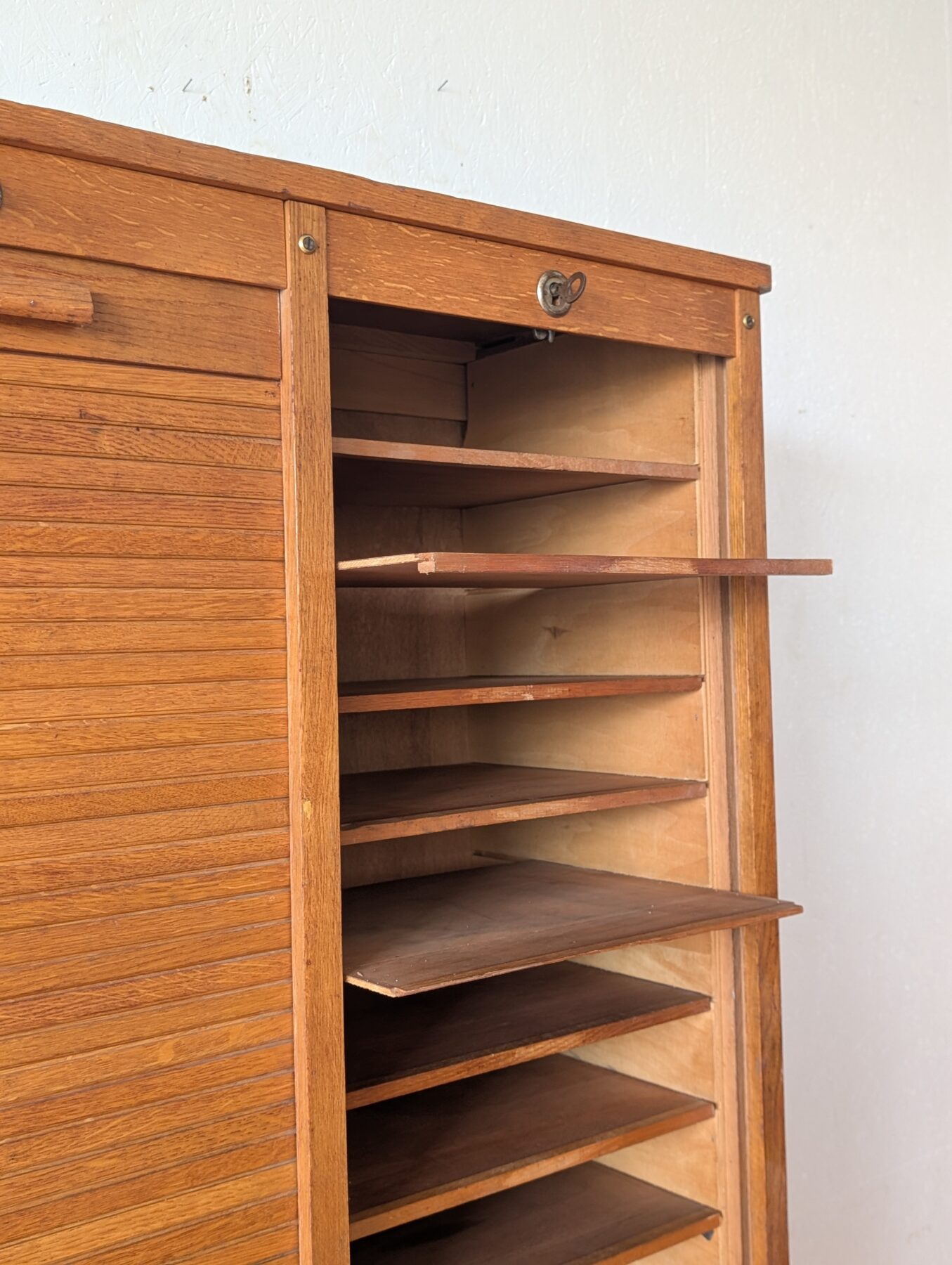 Ancien meuble de métier en chêne avec 3 compartiments à rideaux se fermant à clé et s’ouvrant sur un ensemble d’étagères. Idéal pour y ranger documents et/ou vinyles, et comme chaque tablette est amovible, il peut convenir aussi à de multiples usages en adaptant les espaces avec des hauteurs modulables. Vous pouvez ainsi l’imaginer comme bibliothèque ou meuble de rangement dans une entrée, bureau, chambre…