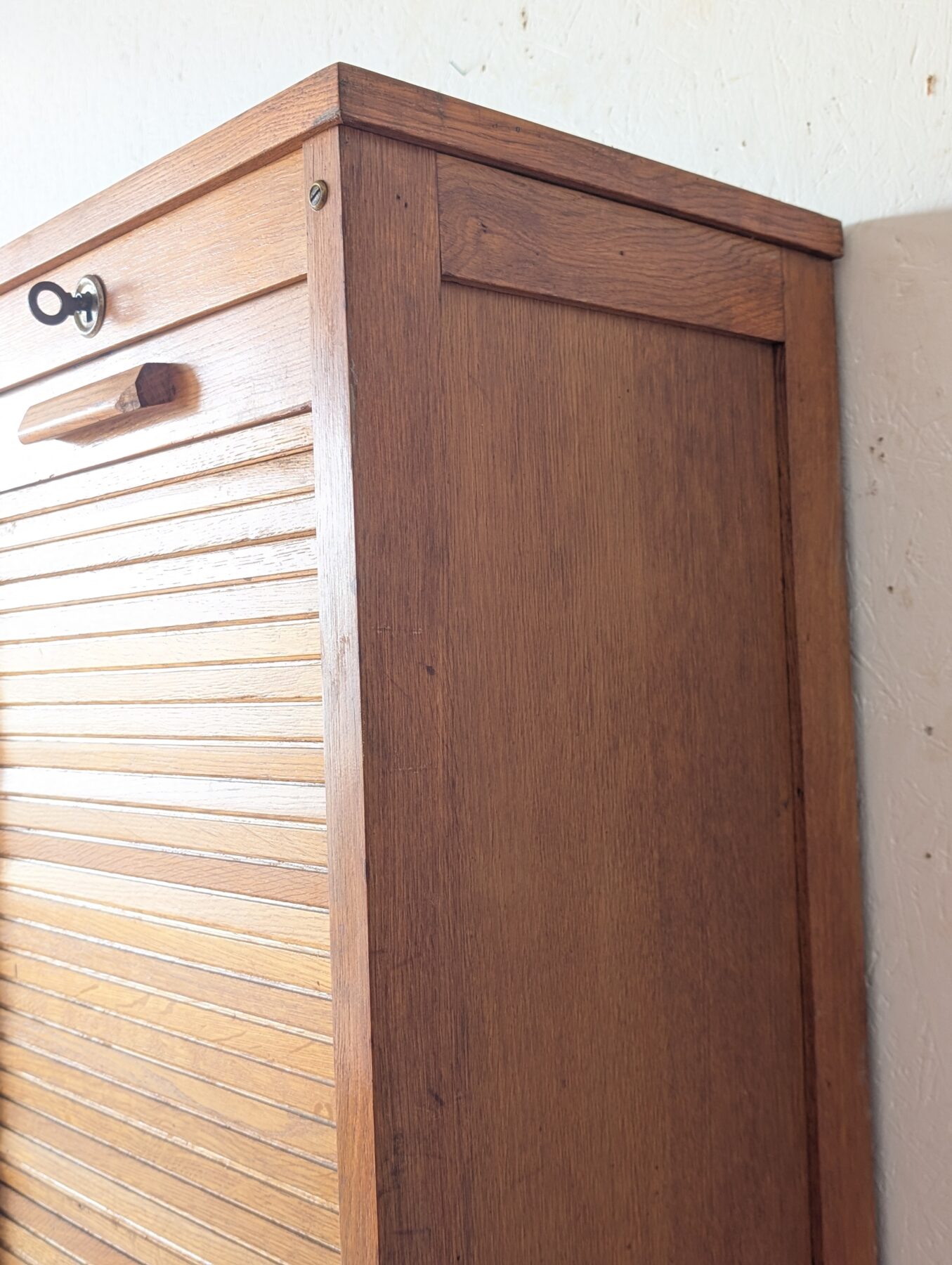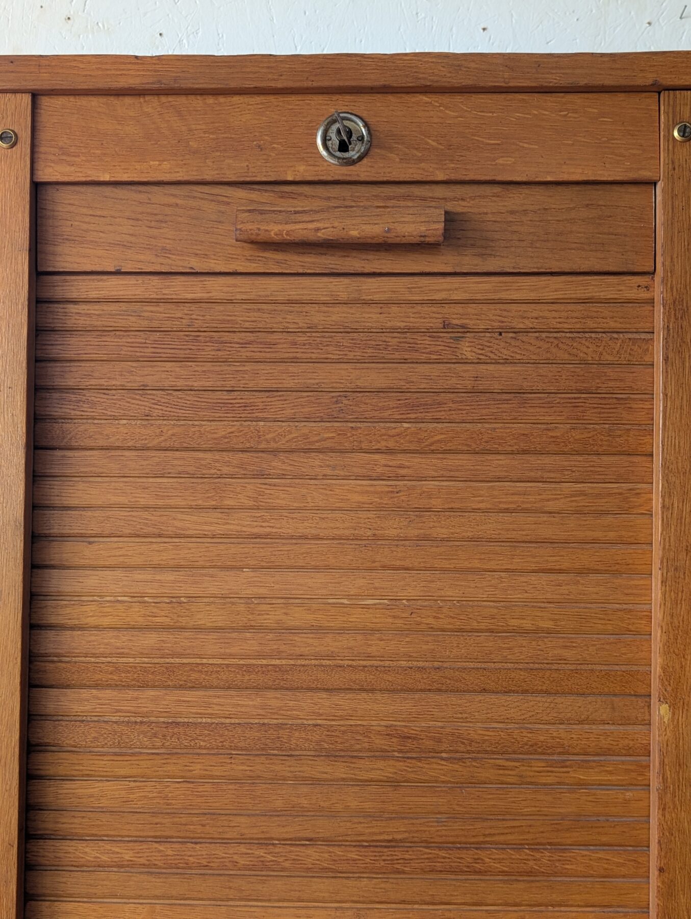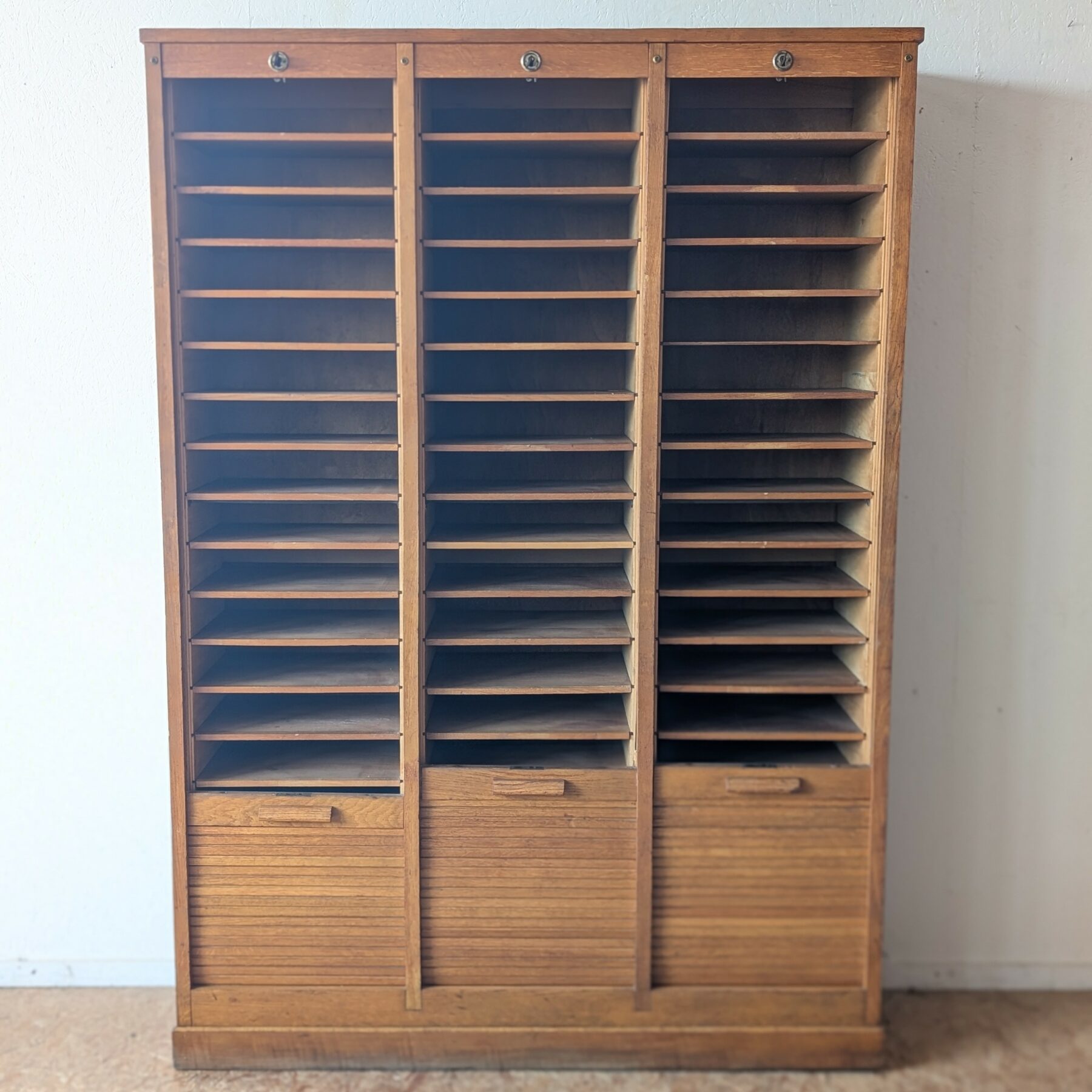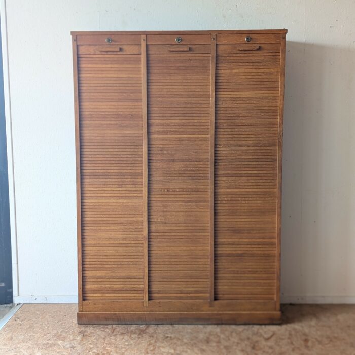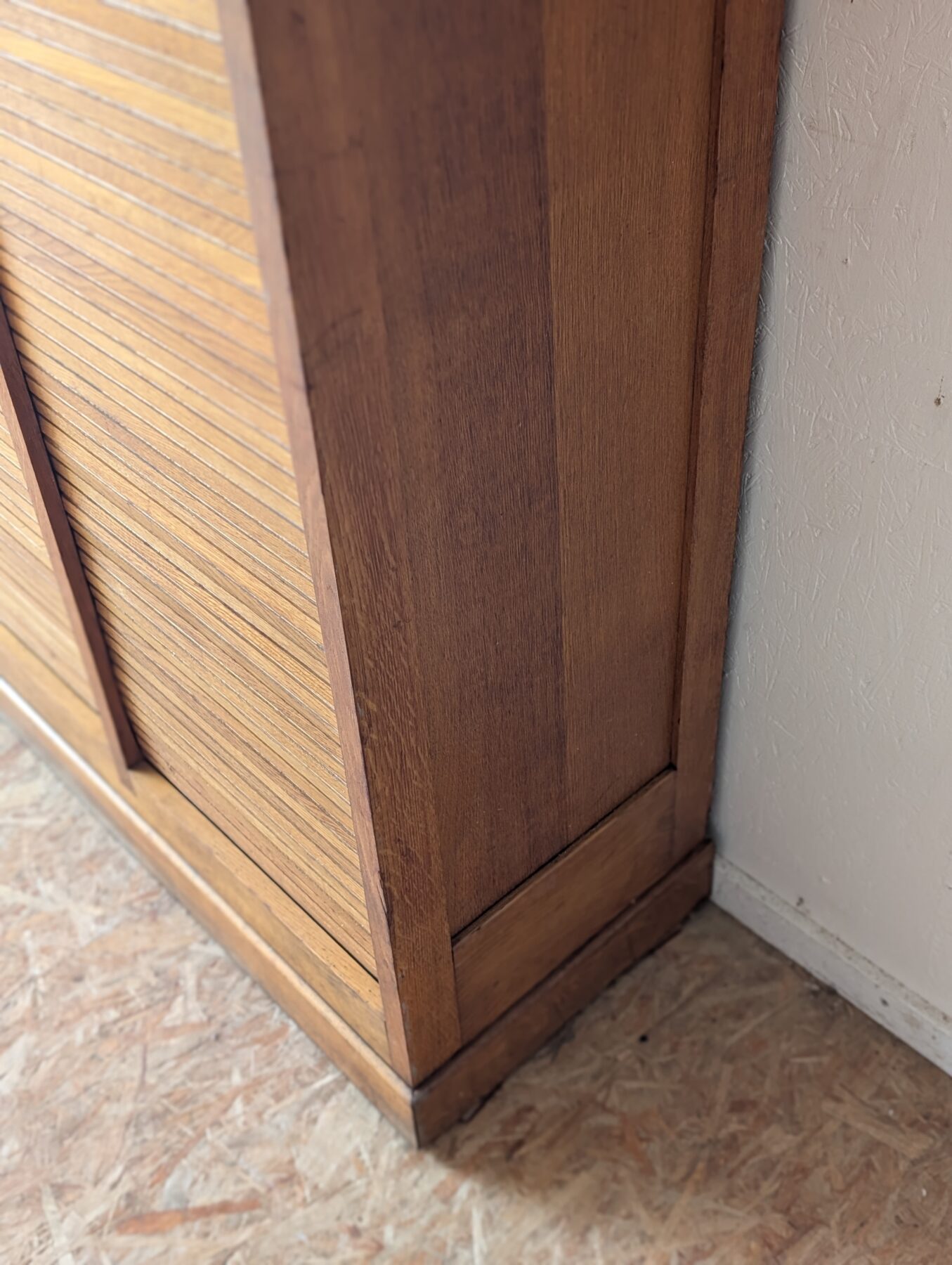 Ancien meuble de métier en chêne avec 3 compartiments à rideaux se fermant à clé et s’ouvrant sur un ensemble d’étagères. Idéal pour y ranger documents et/ou vinyles, et comme chaque tablette est amovible, il peut convenir aussi à de multiples usages en adaptant les espaces avec des hauteurs modulables. Vous pouvez ainsi l’imaginer comme bibliothèque ou meuble de rangement dans une entrée, bureau, chambre…