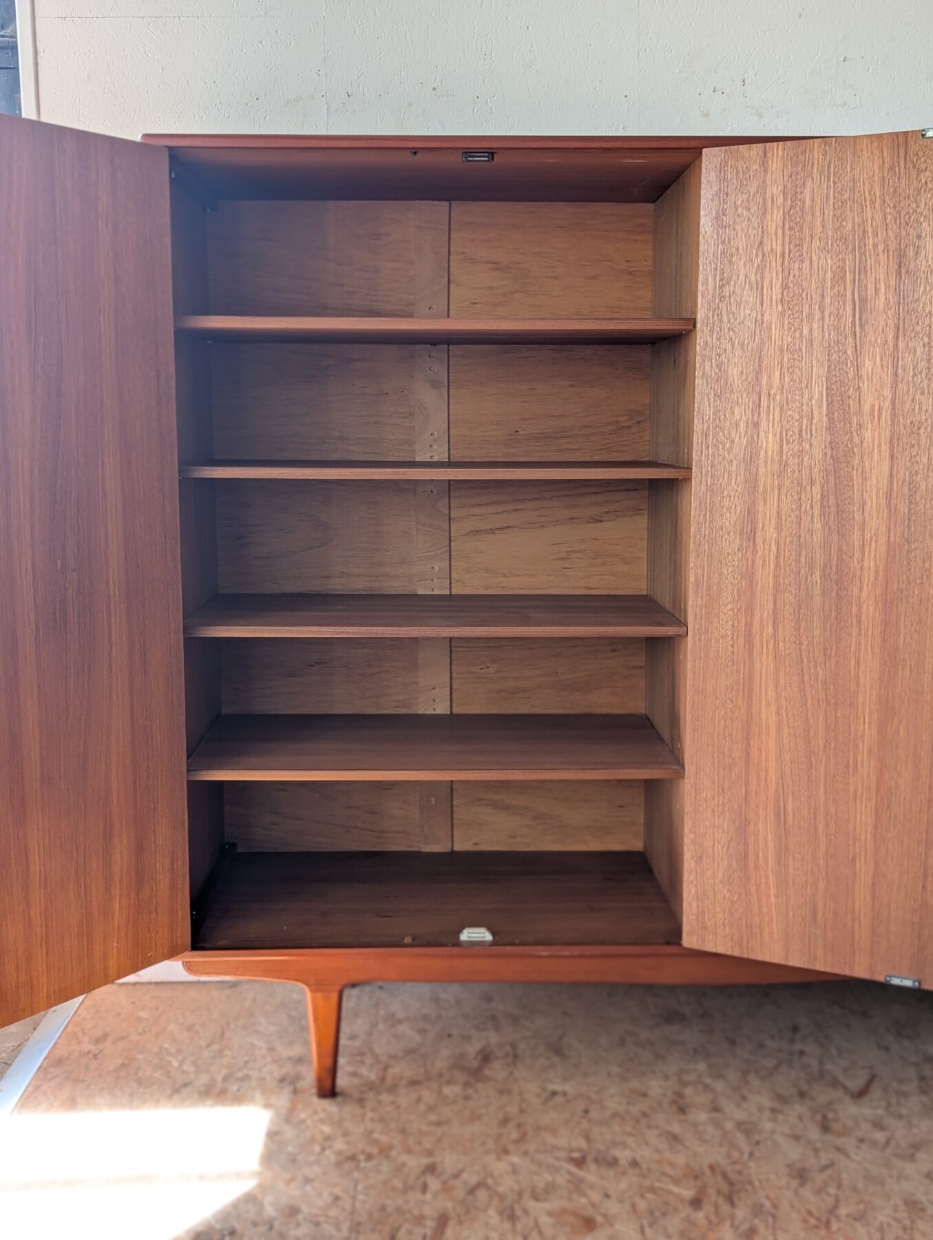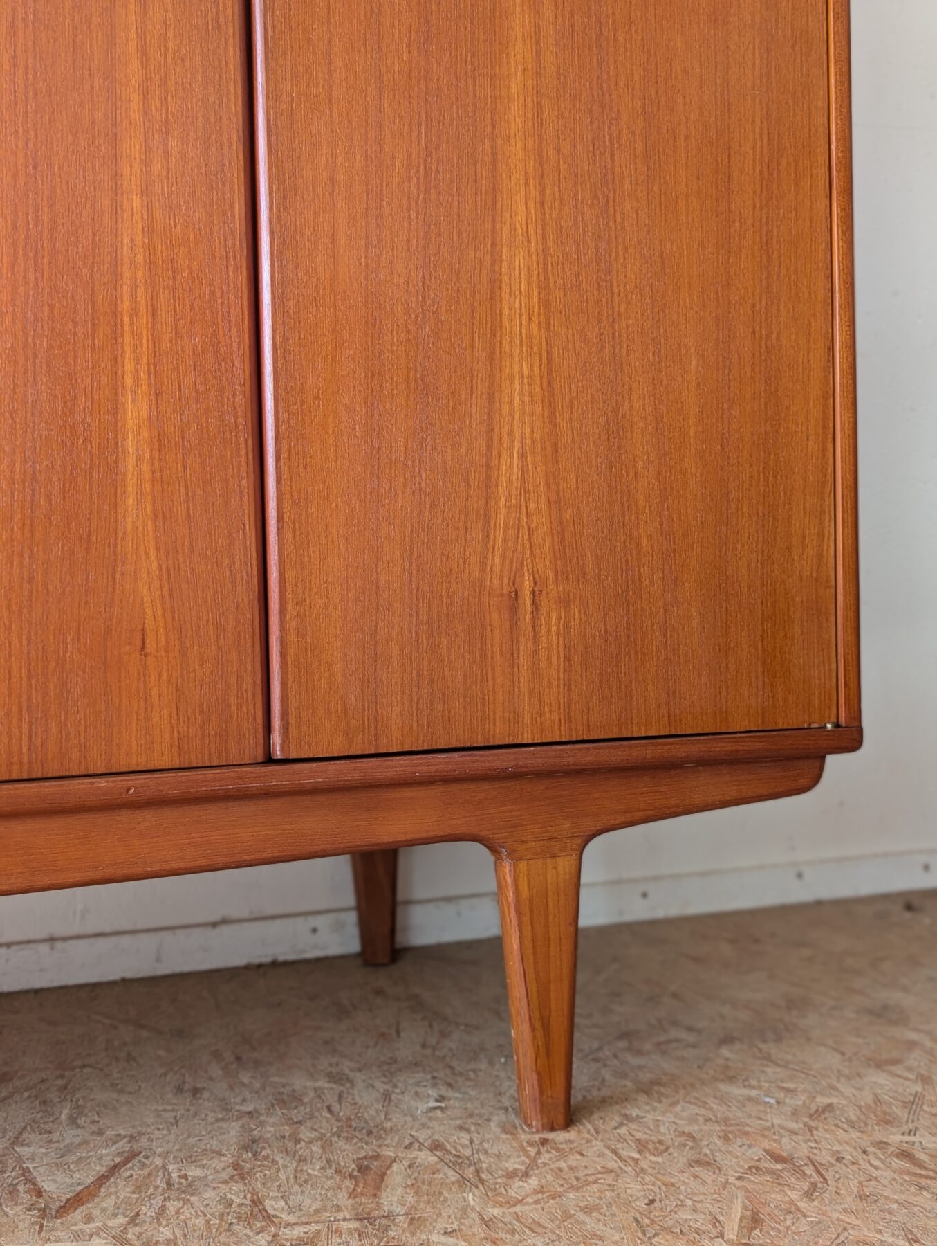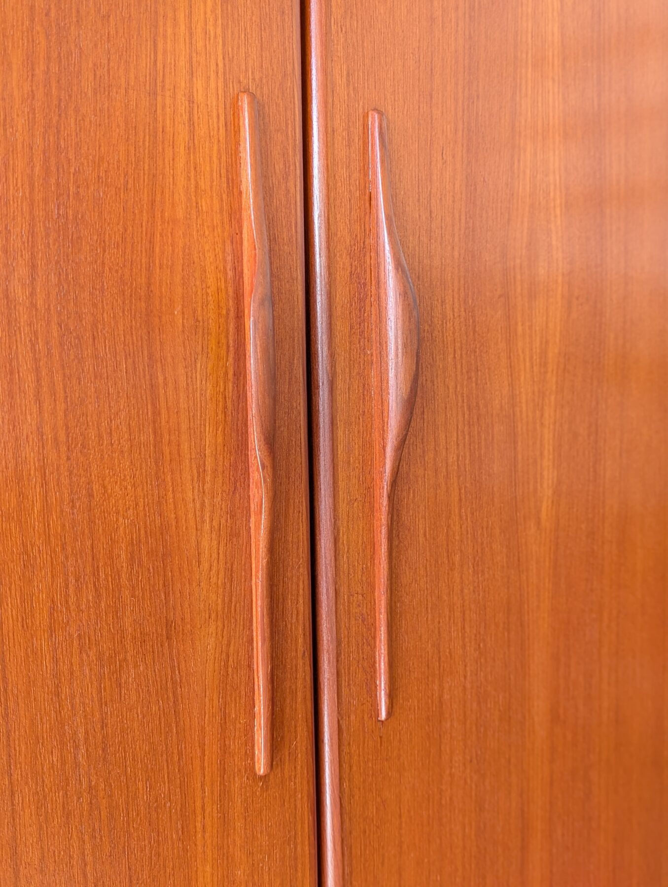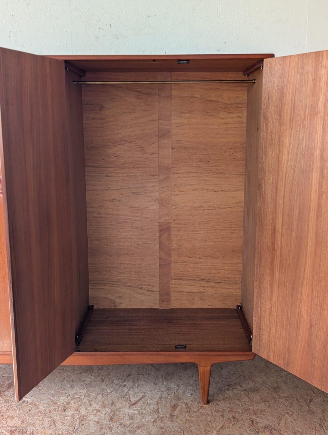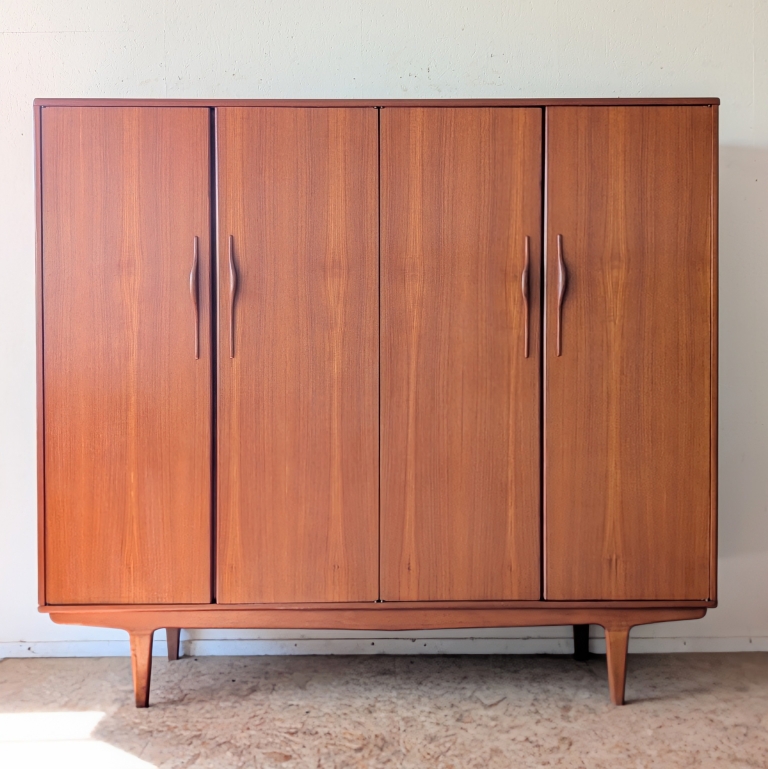 Armoire teck scandinave des années 60 avec 4 portes ouvrant sur des étagères et une grande penderie.