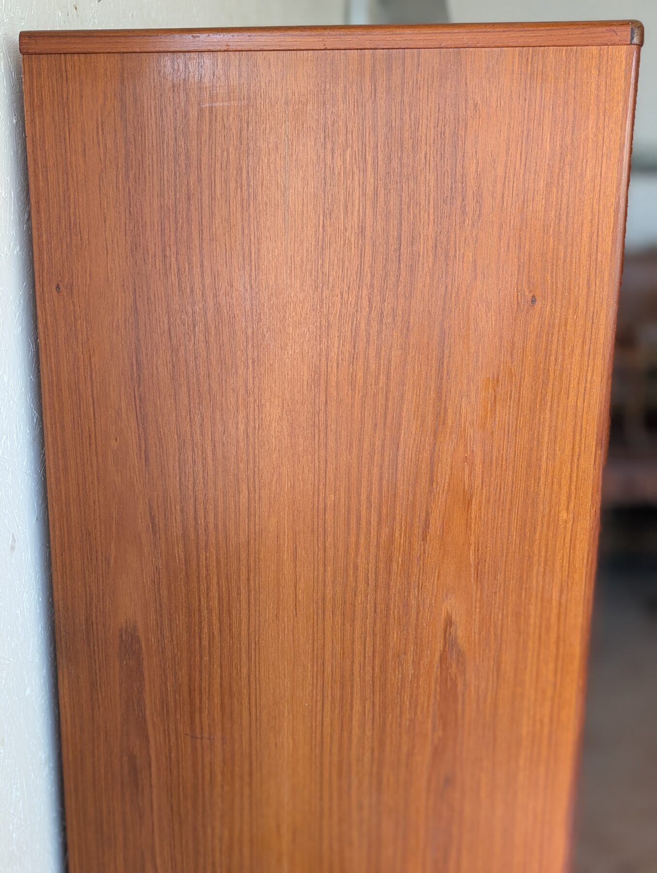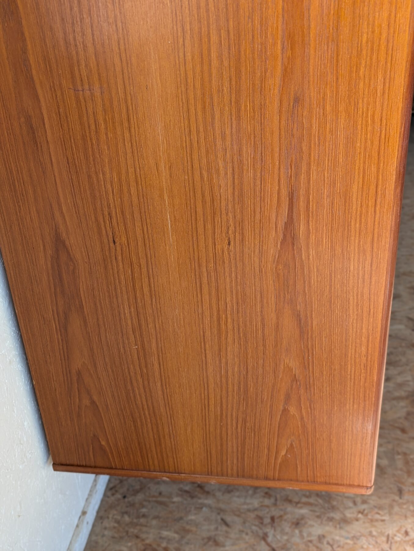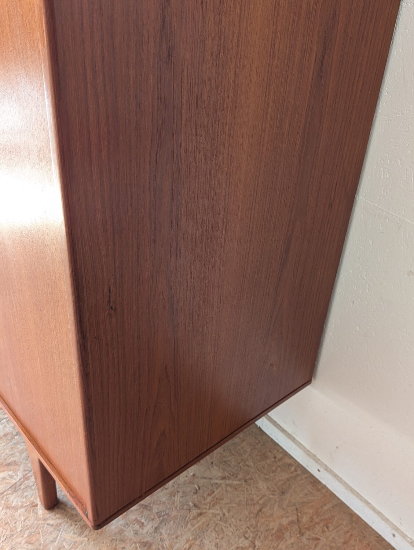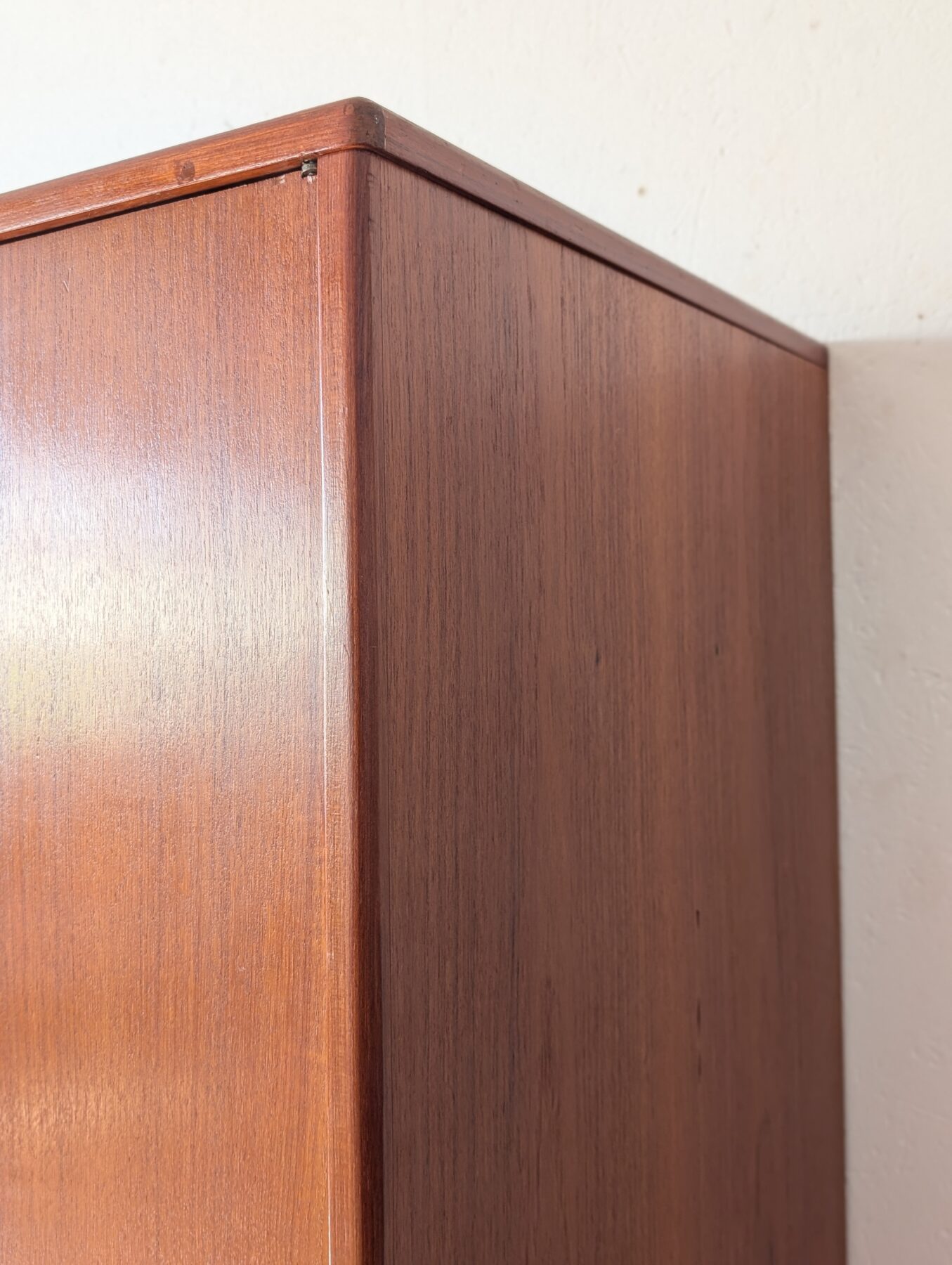 Armoire teck scandinave des années 60 avec 4 portes ouvrant sur des étagères et une grande penderie.