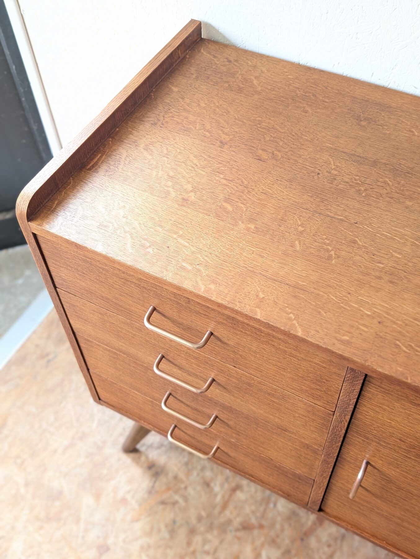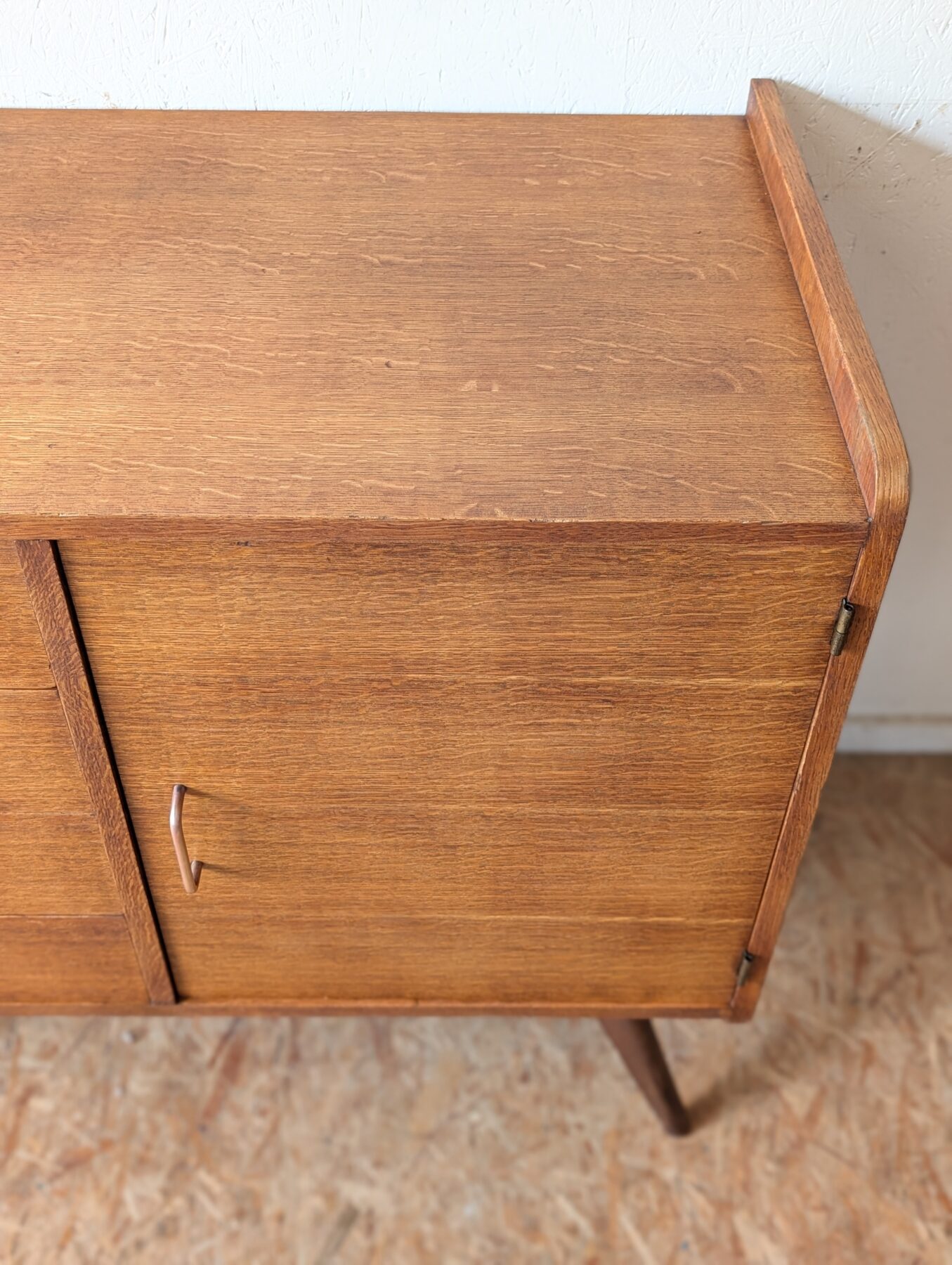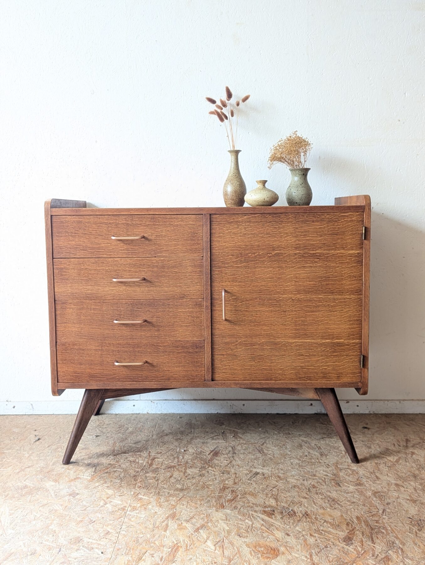 Bahut placage chêne pieds compas des années 50 avec une porte et 4 tiroirs.
