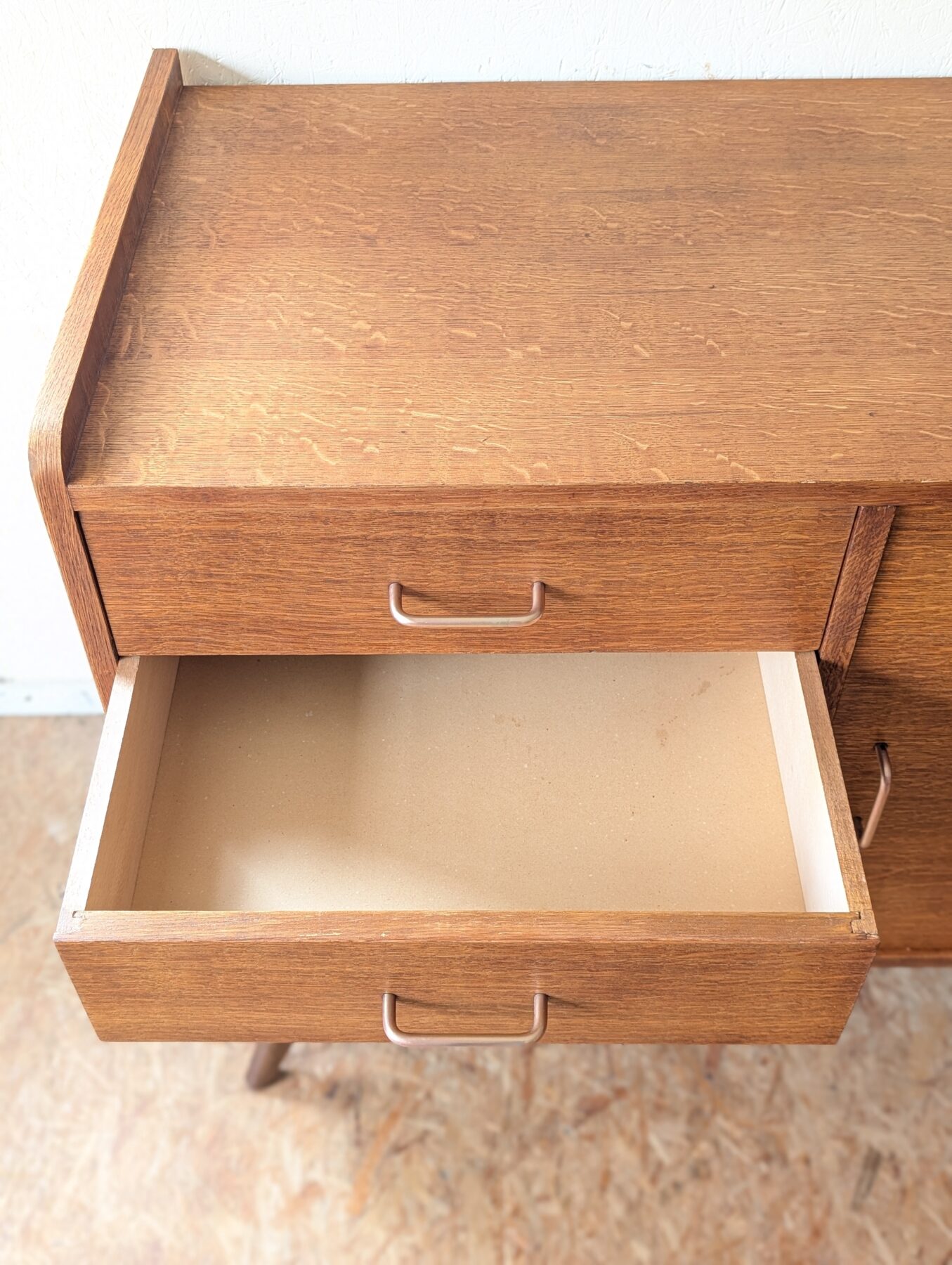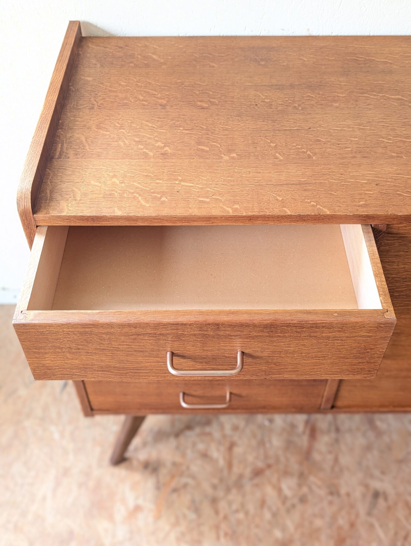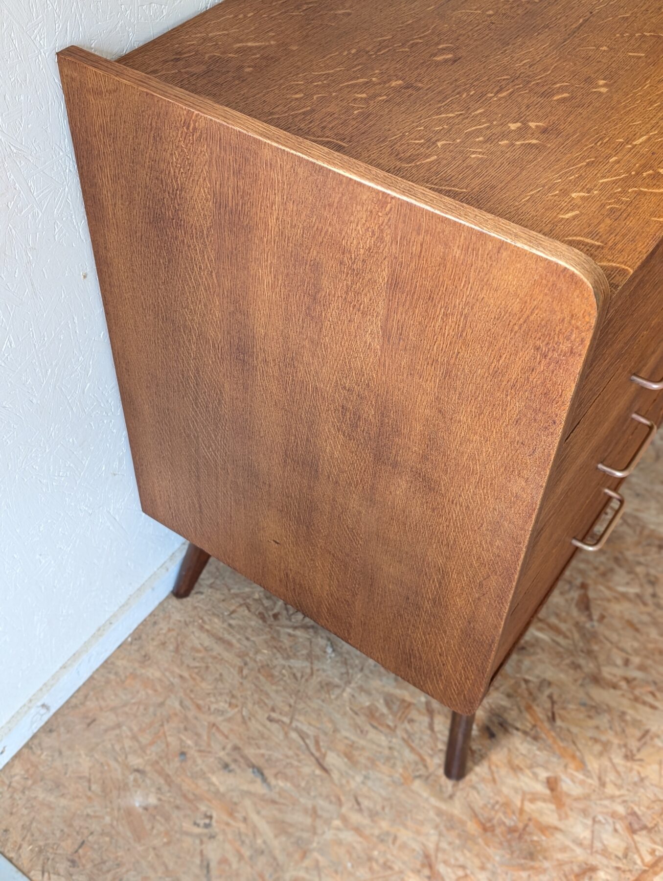 Bahut placage chêne pieds compas des années 50 avec une porte et 4 tiroirs.