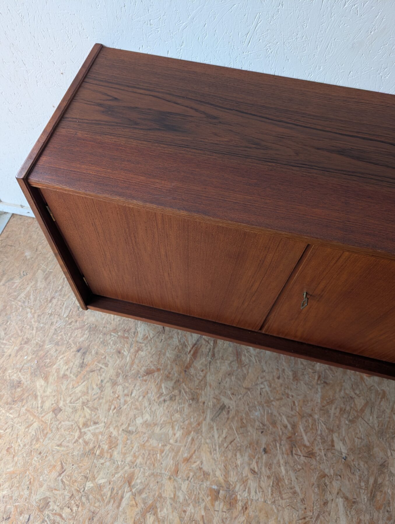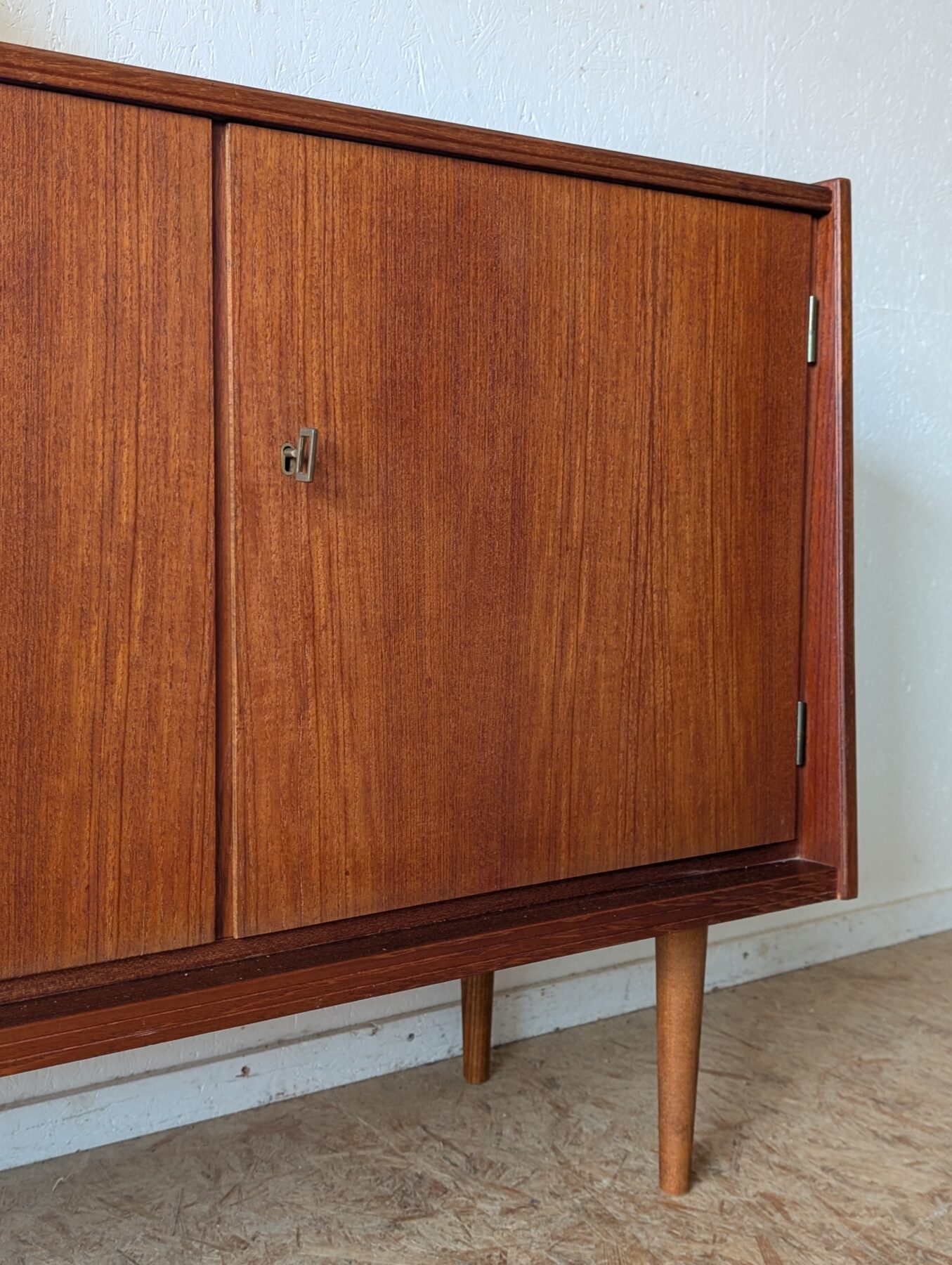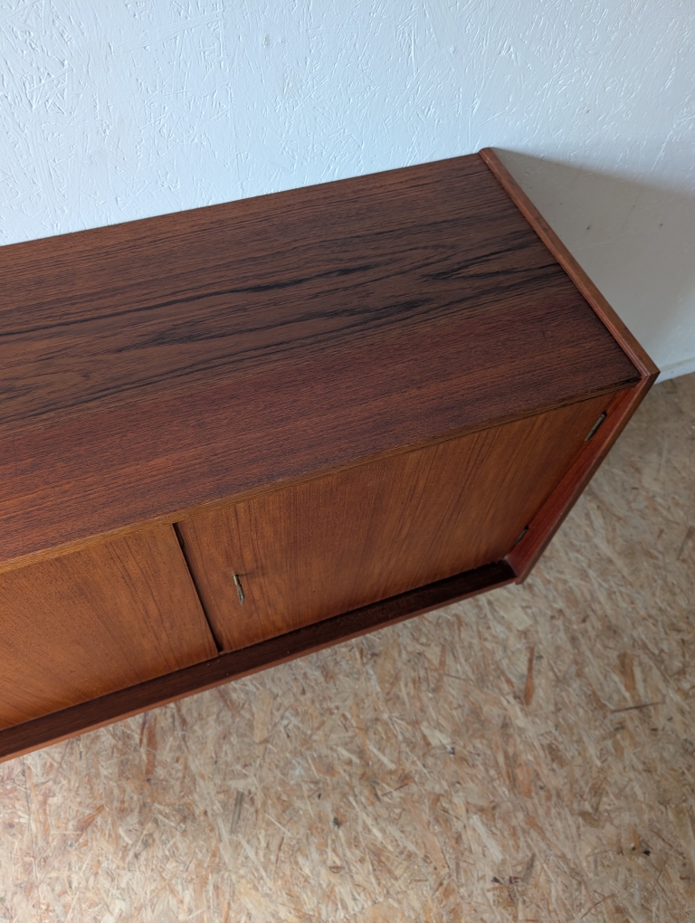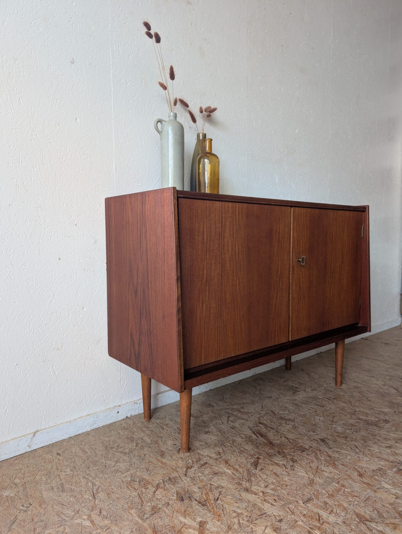Bahut en placage teck danois des années 60/70 avec 2 portes ouvrant sur un placard avec une étagère amovible.
