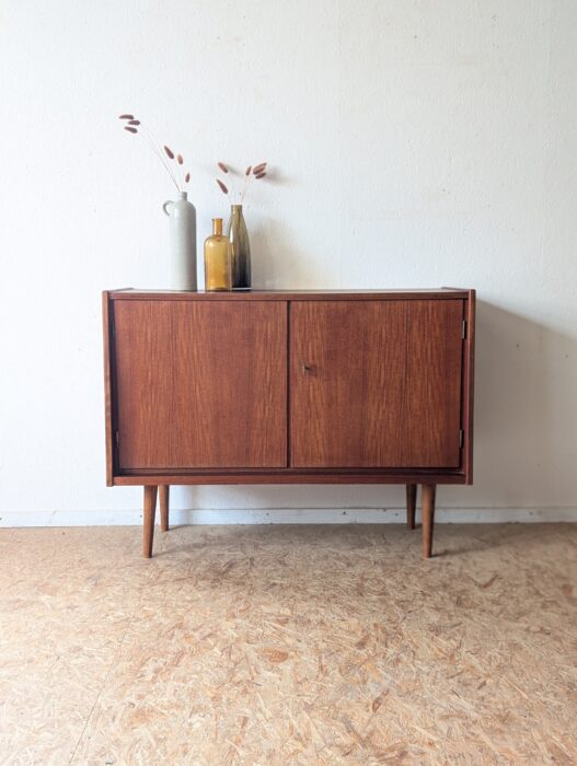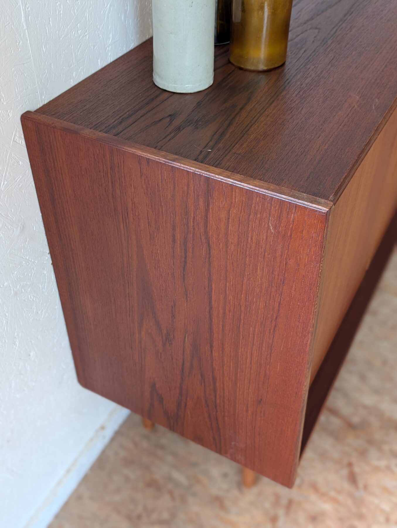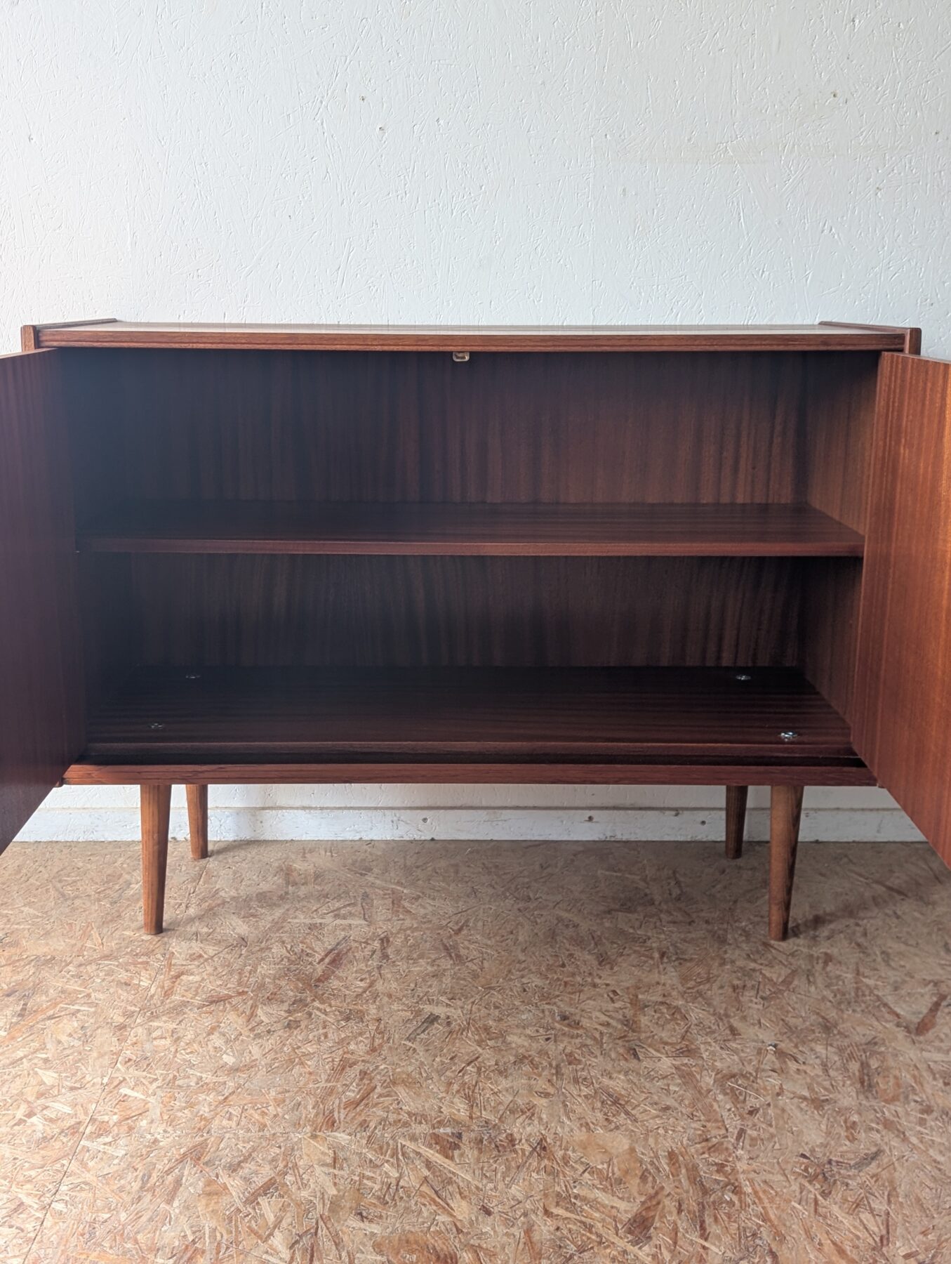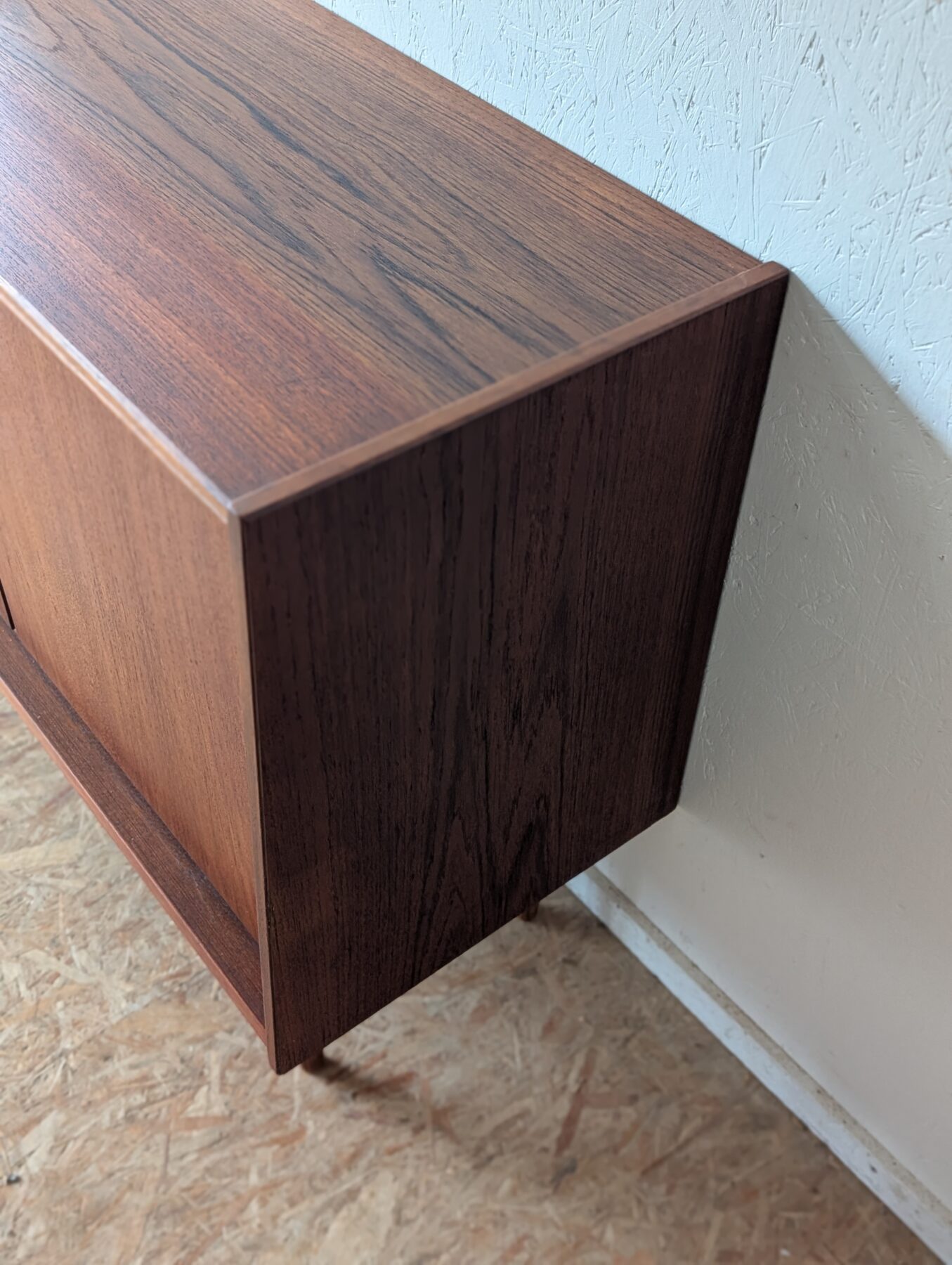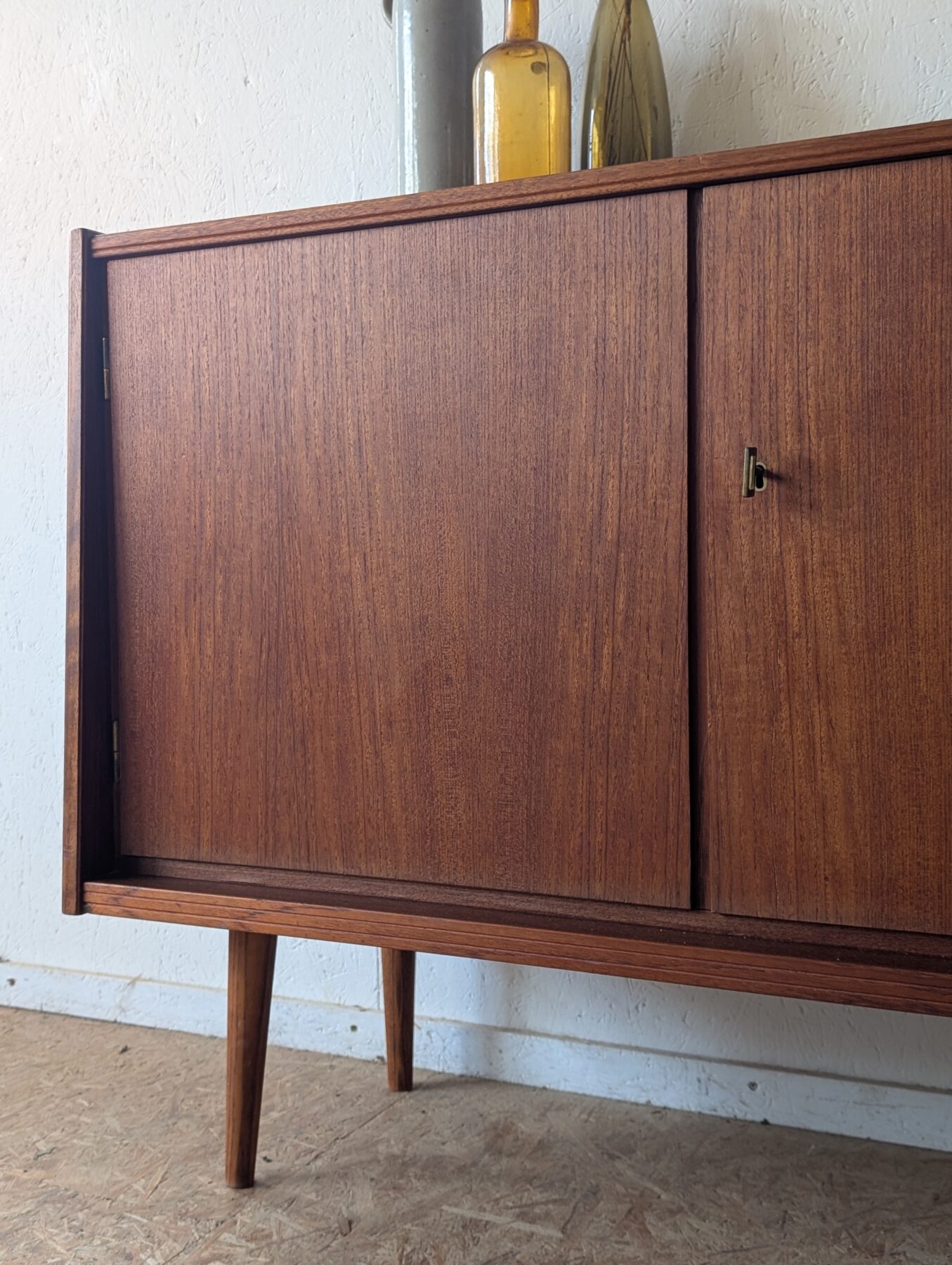 Bahut en placage teck danois des années 60/70 avec 2 portes ouvrant sur un placard avec une étagère amovible.