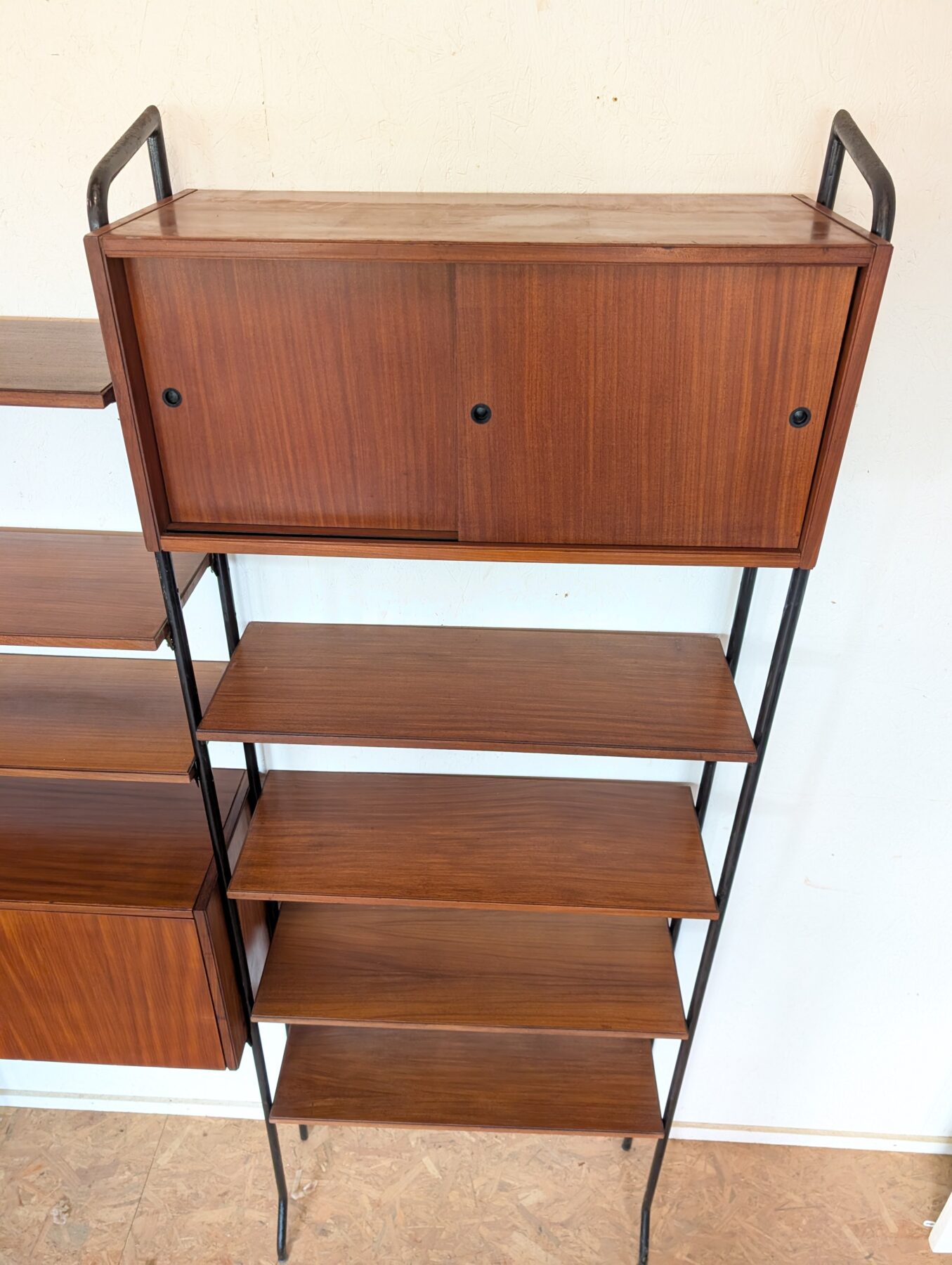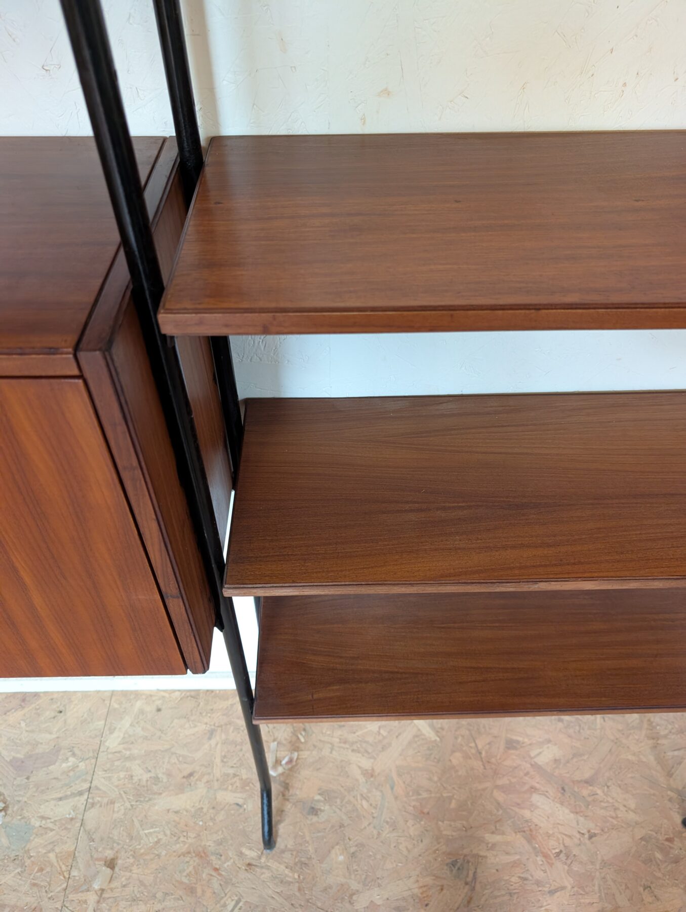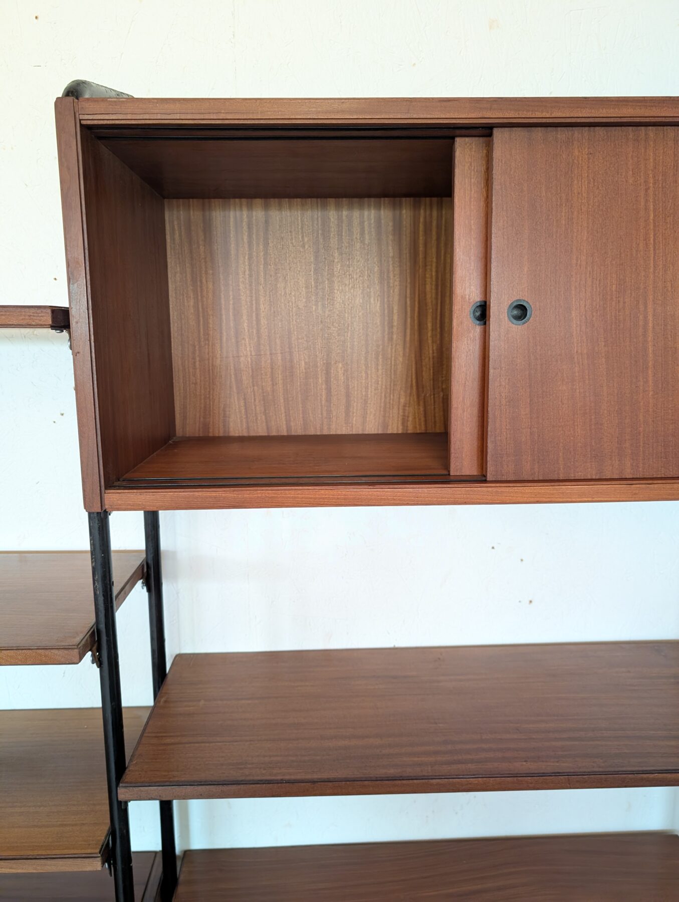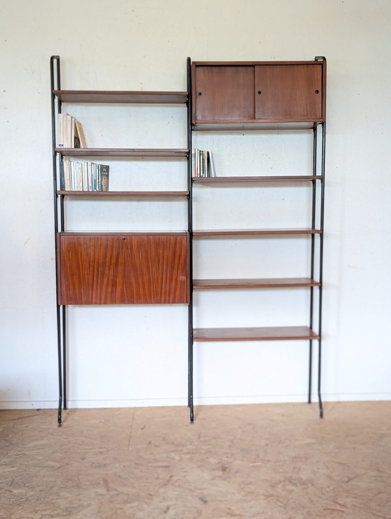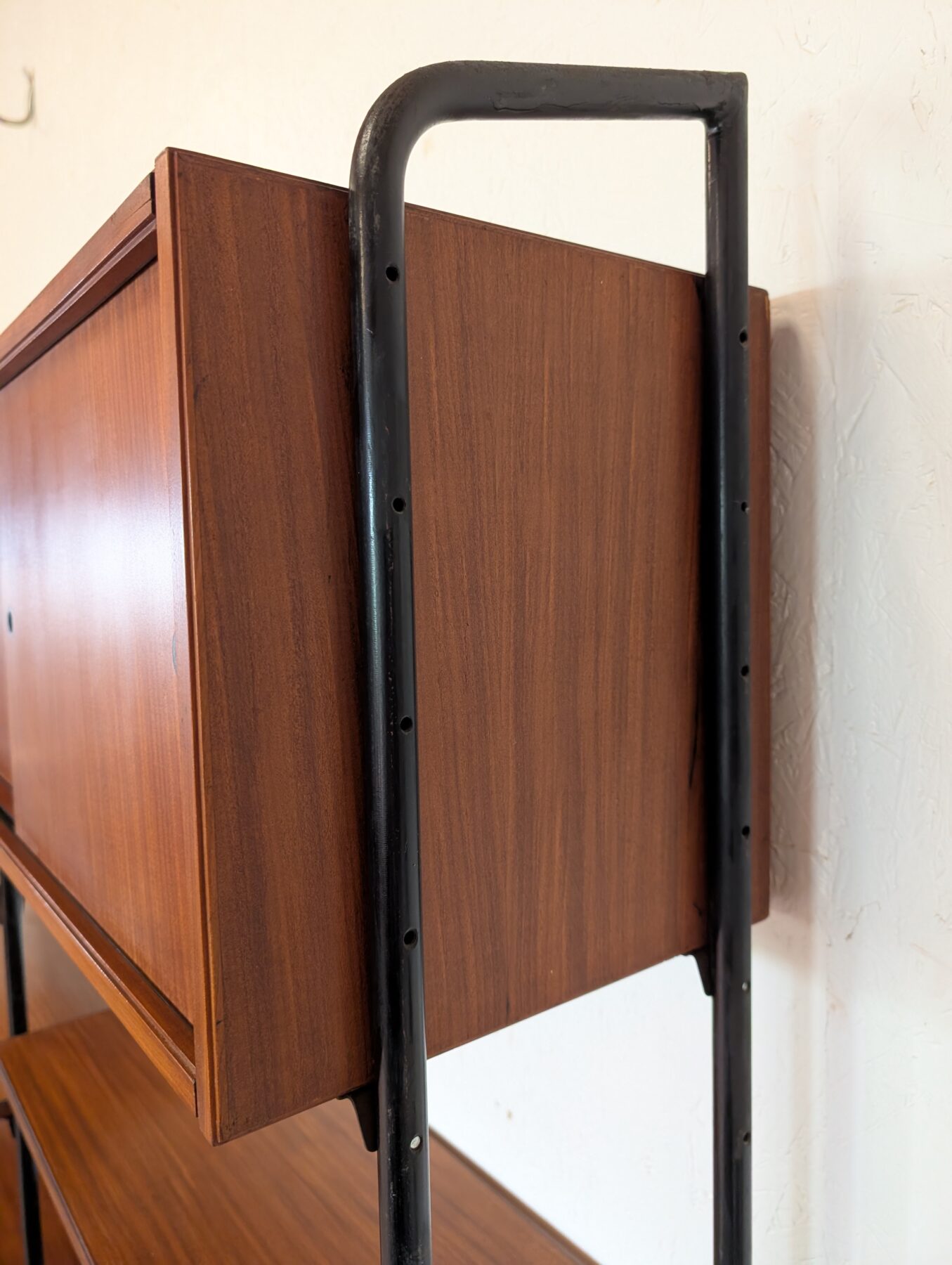 Bibliothèque autoportante en teck, Italie, années 60. Elle comprend 3 montants métalliques noirs, 1 caisson avec une porte secrétaire, 1 caisson avec 2 portes coulissantes et 7 étagères.