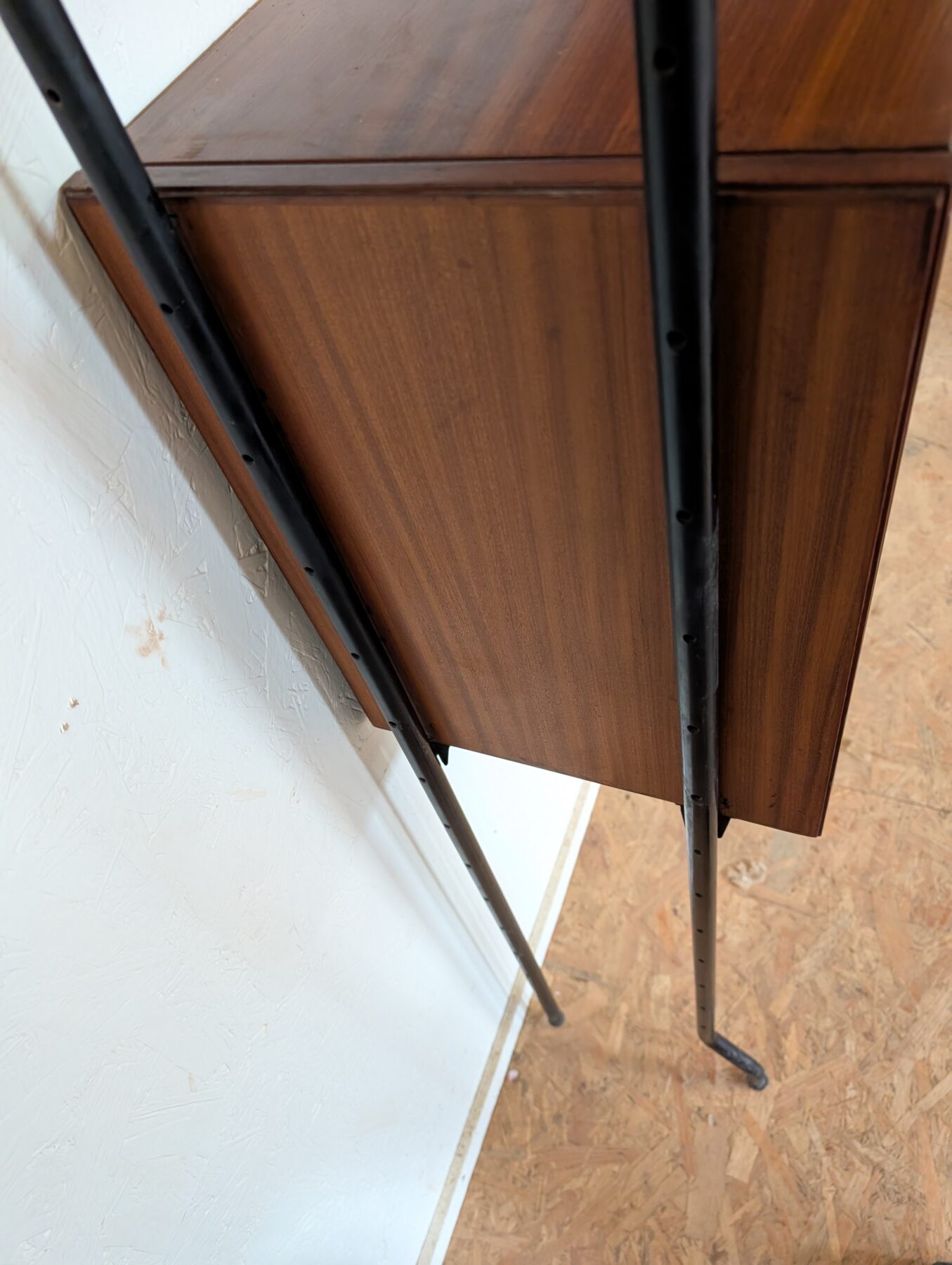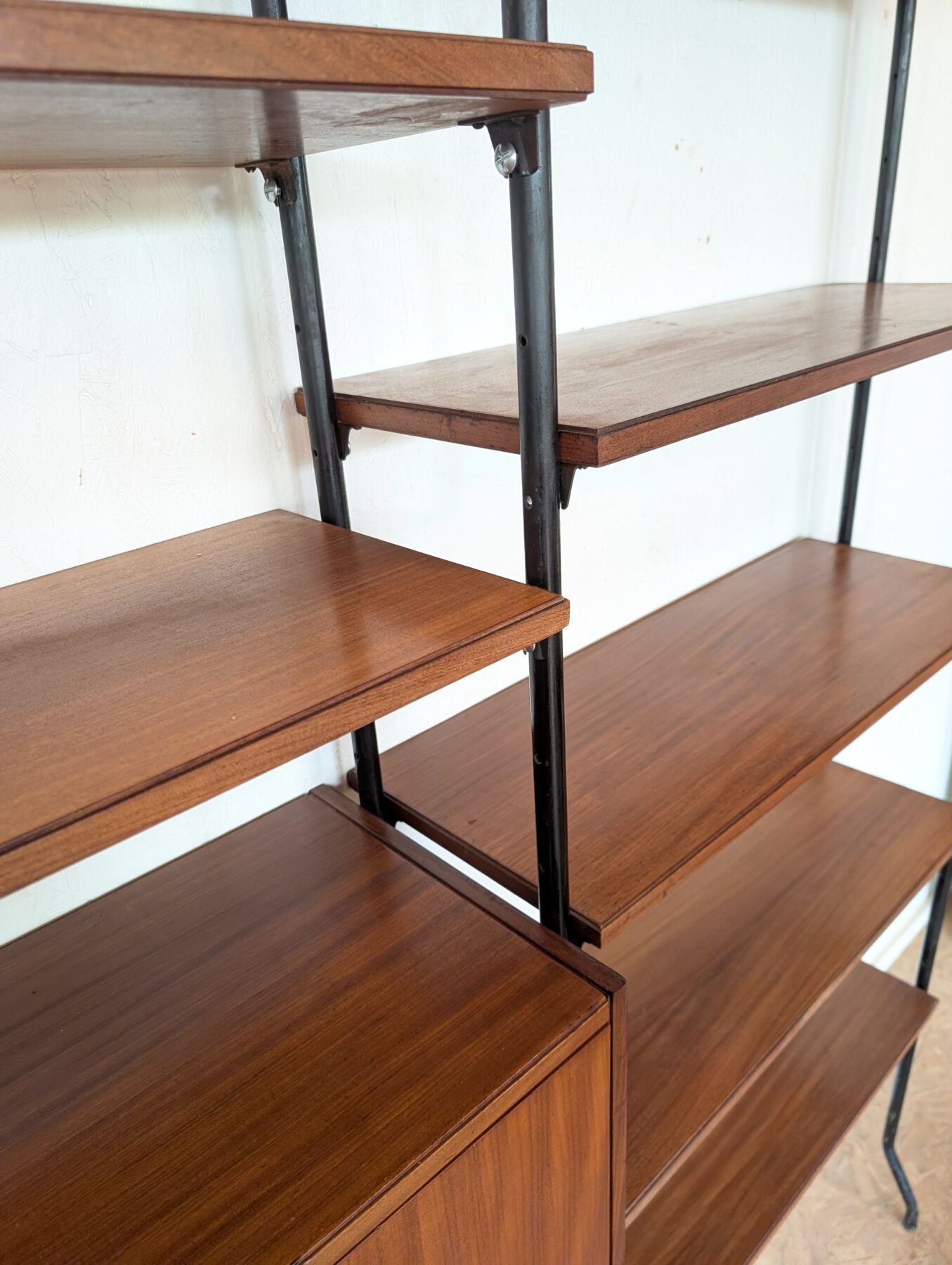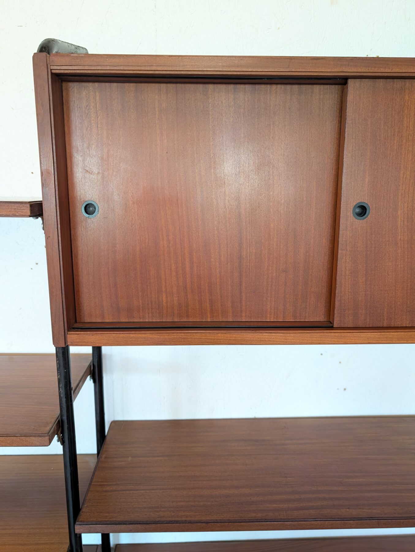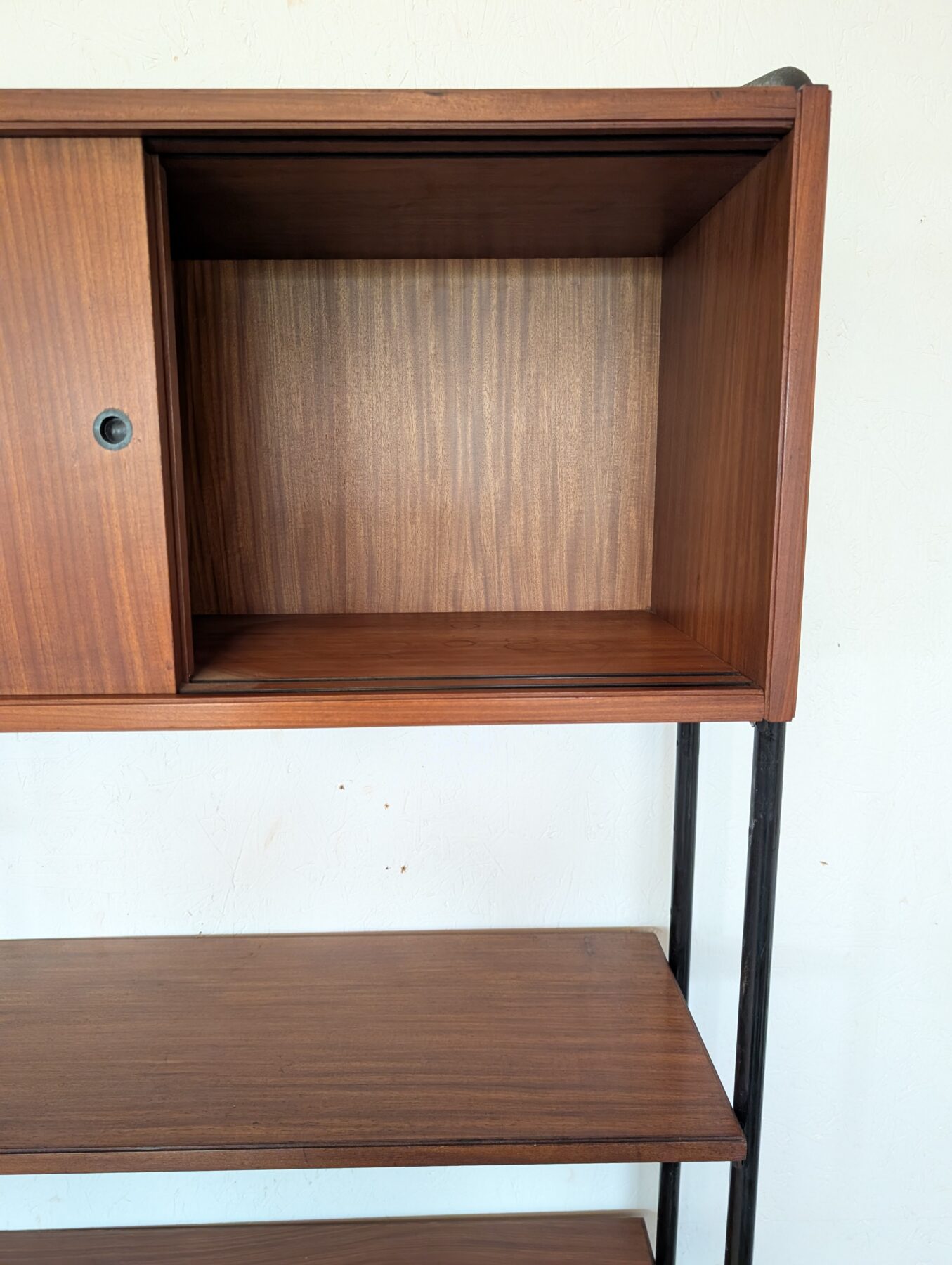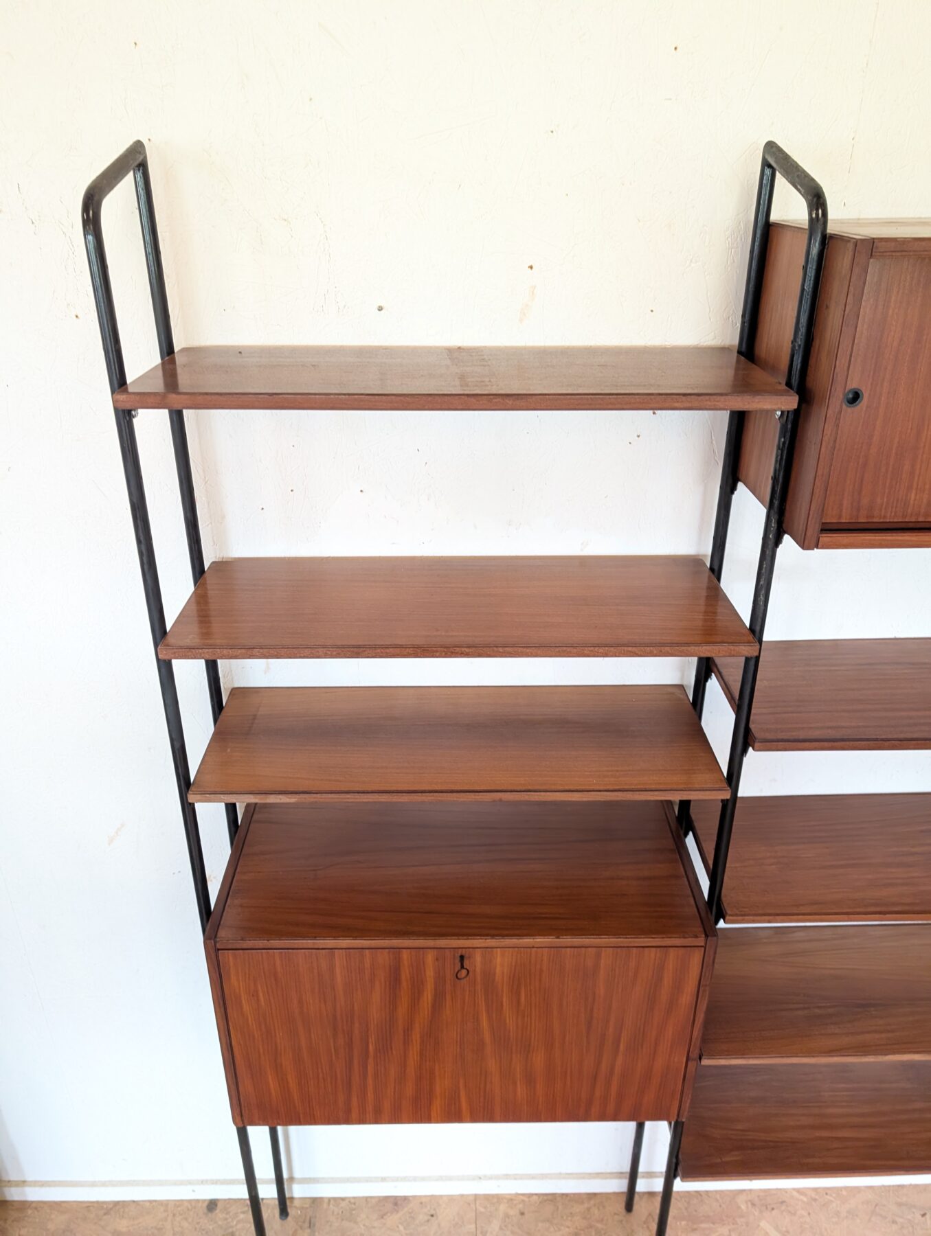 Bibliothèque autoportante en teck, Italie, années 60. Elle comprend 3 montants métalliques noirs, 1 caisson avec une porte secrétaire, 1 caisson avec 2 portes coulissantes et 7 étagères.