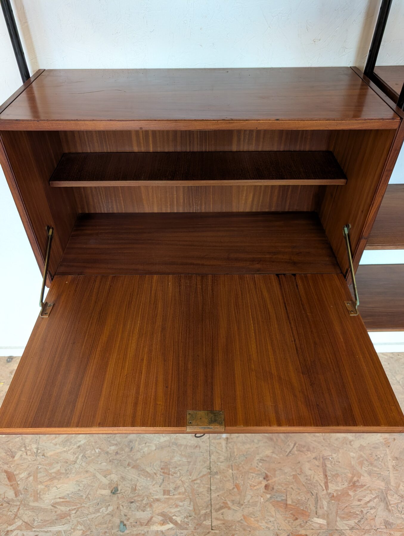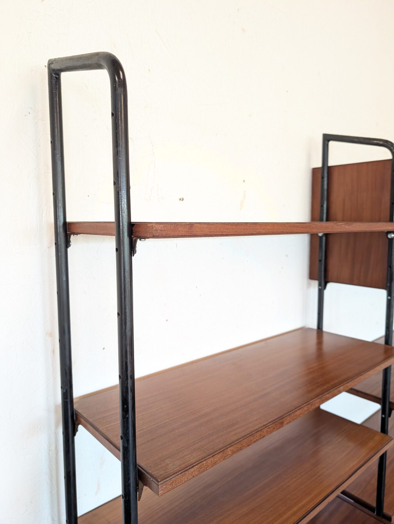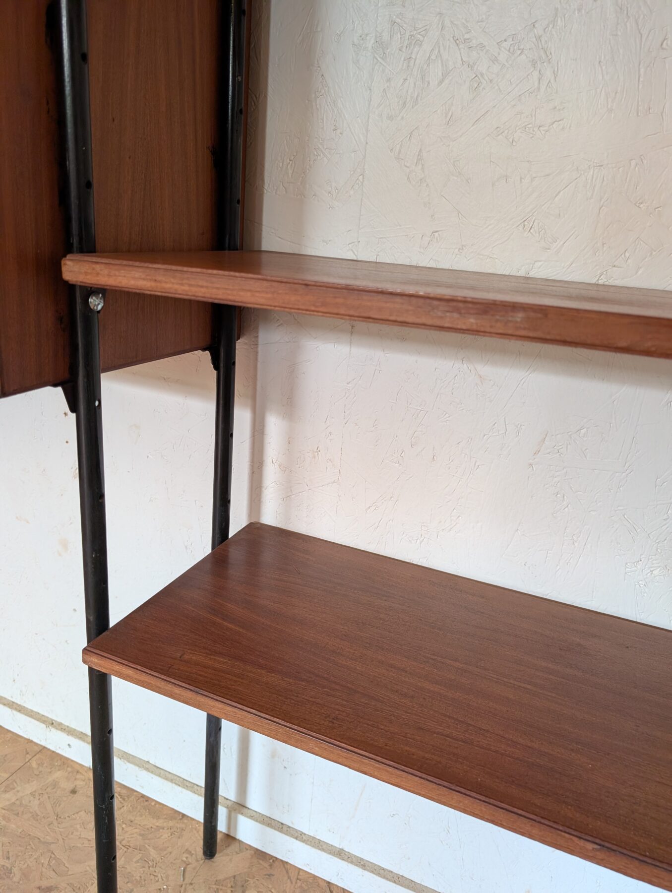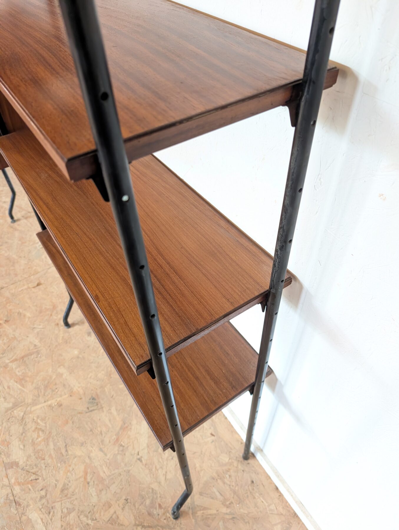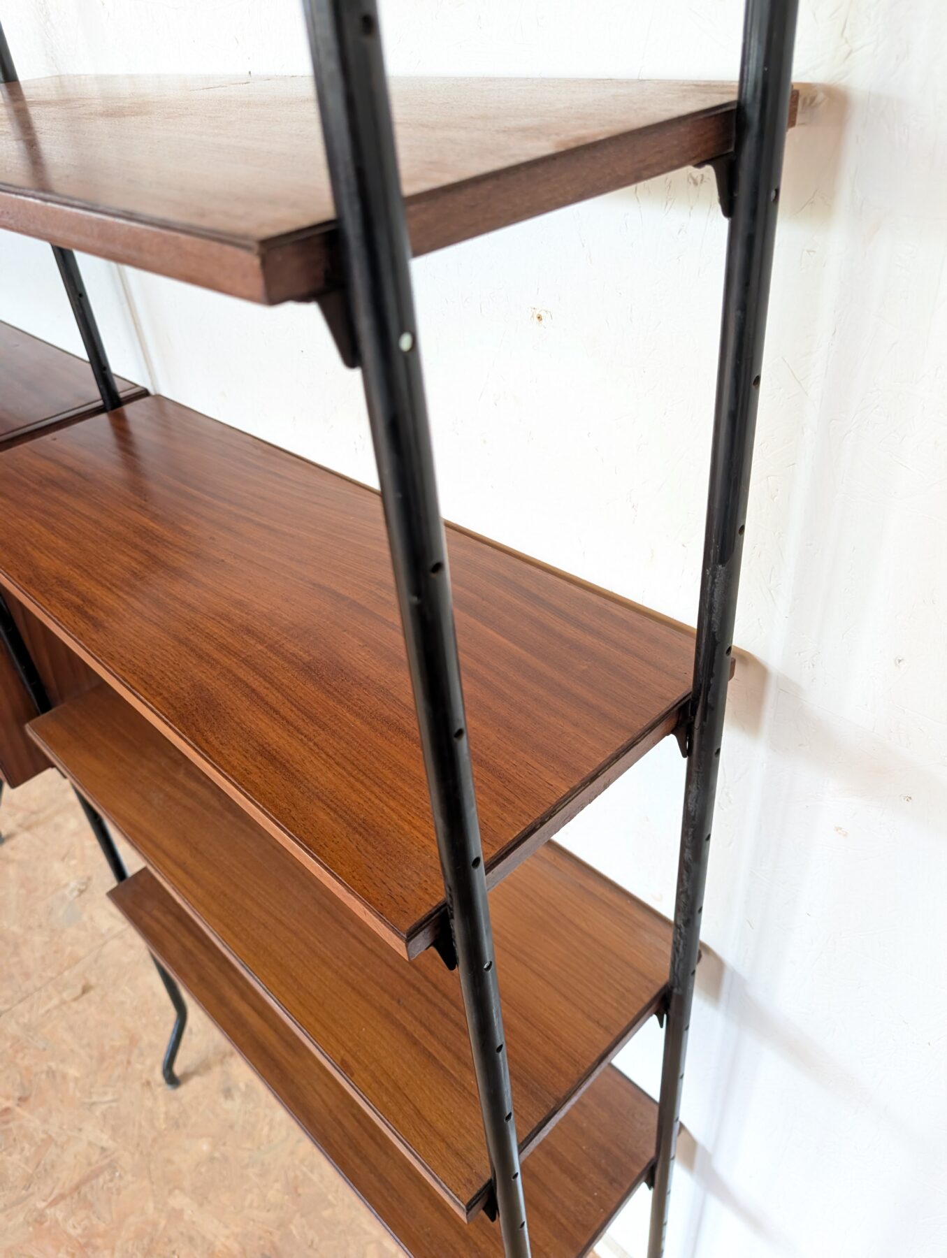 Bibliothèque autoportante en teck, Italie, années 60. Elle comprend 3 montants métalliques noirs, 1 caisson avec une porte secrétaire, 1 caisson avec 2 portes coulissantes et 7 étagères.