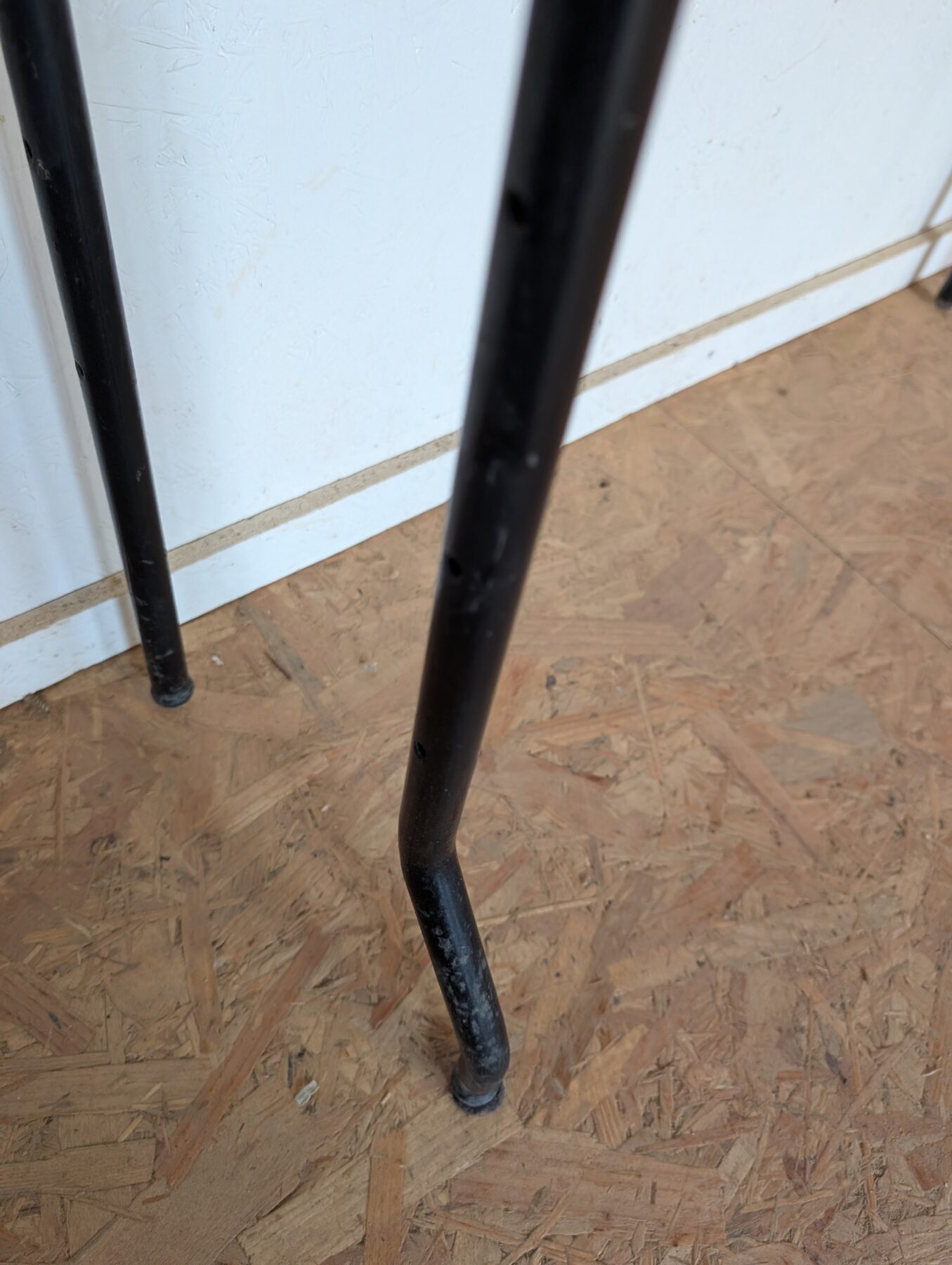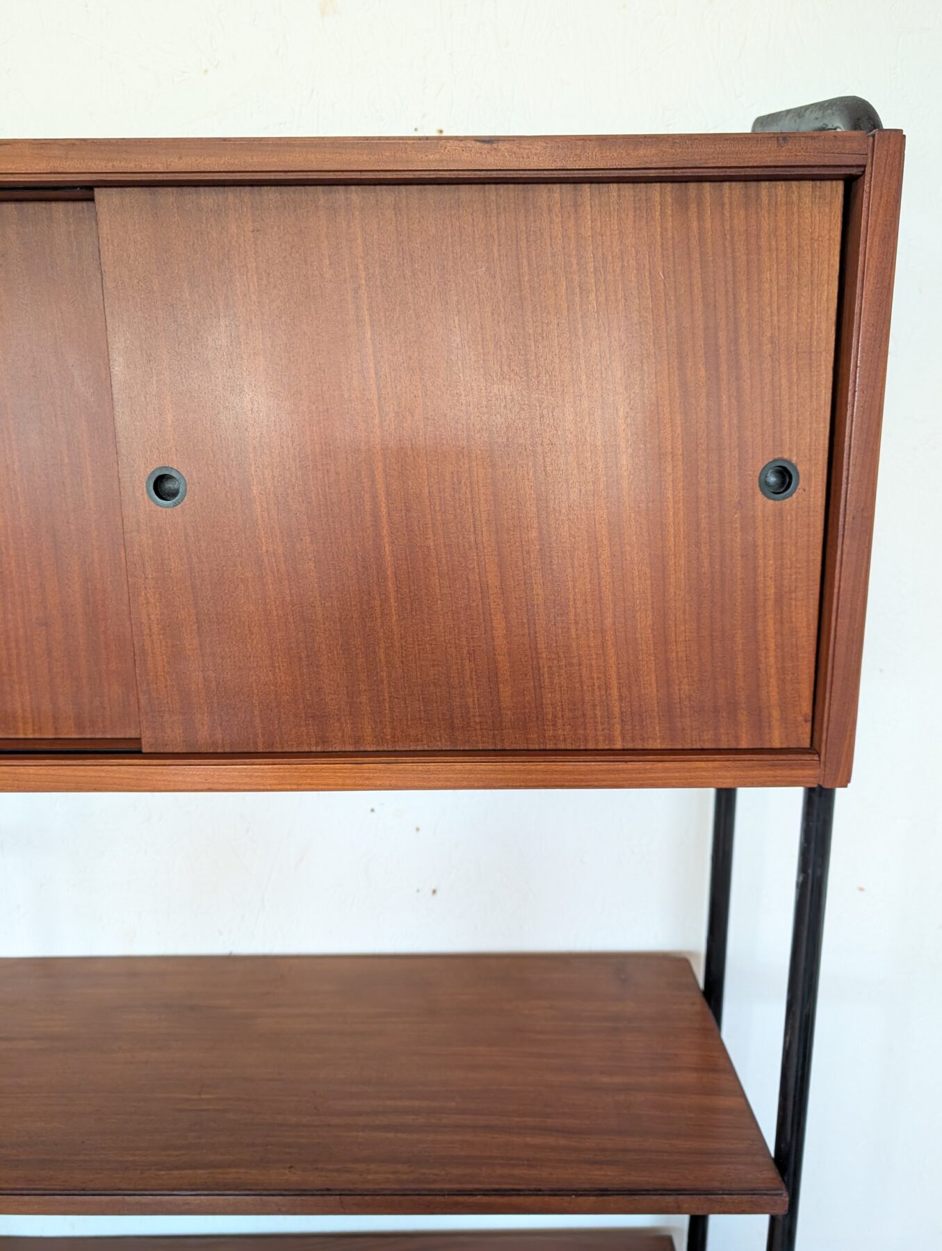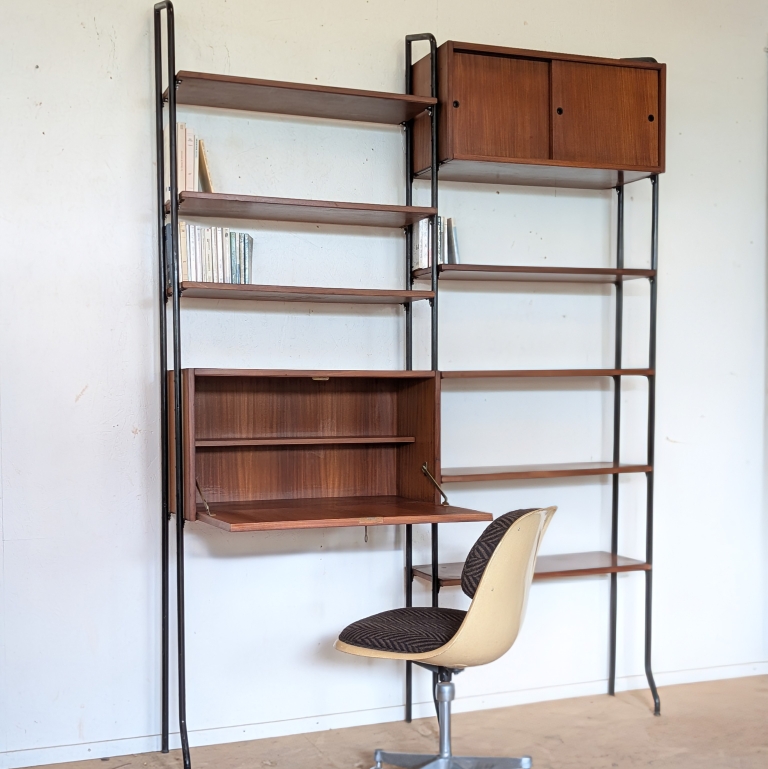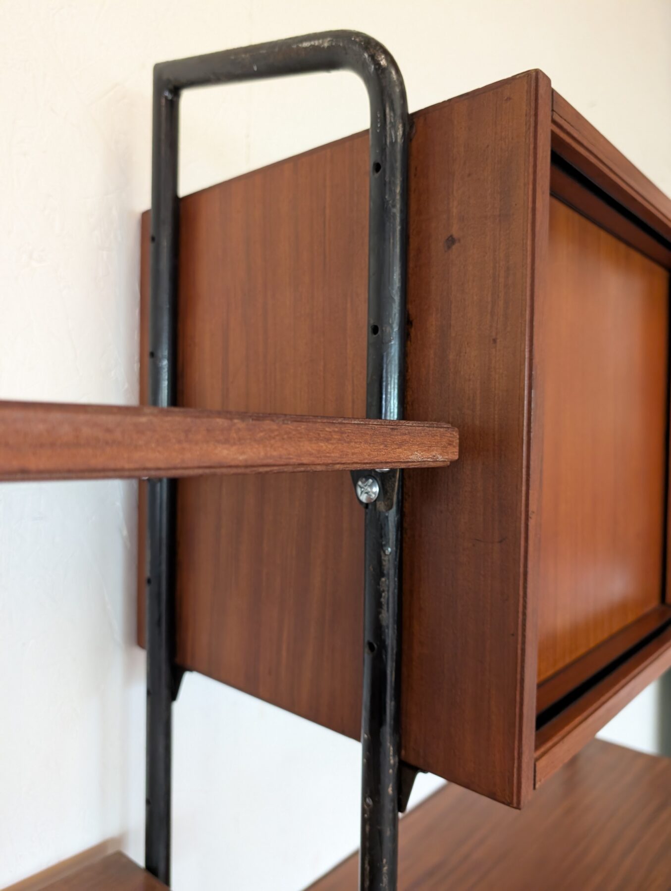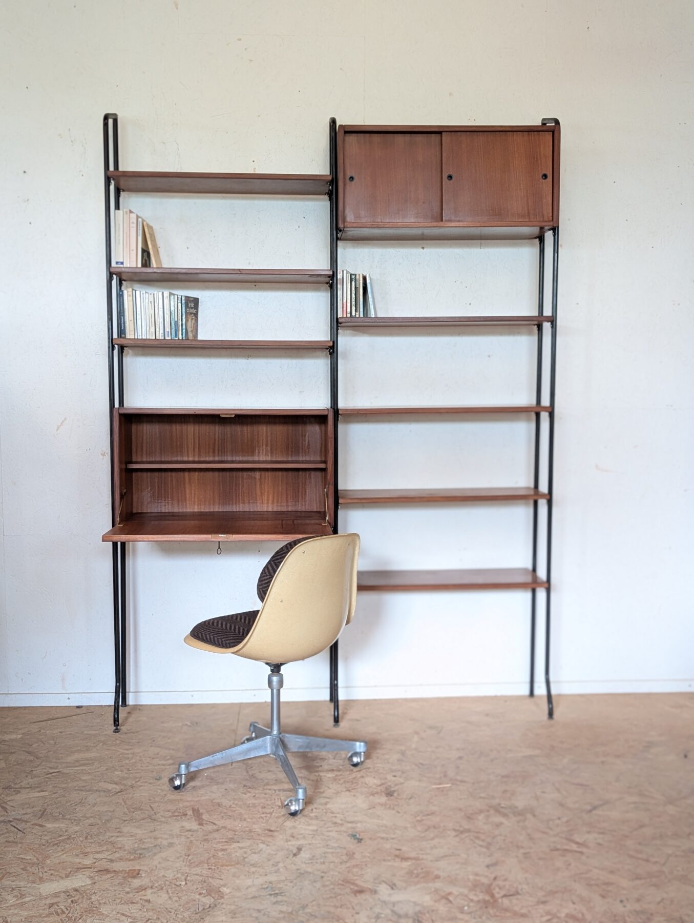 Bibliothèque autoportante en teck, Italie, années 60. Elle comprend 3 montants métalliques noirs, 1 caisson avec une porte secrétaire, 1 caisson avec 2 portes coulissantes et 7 étagères.