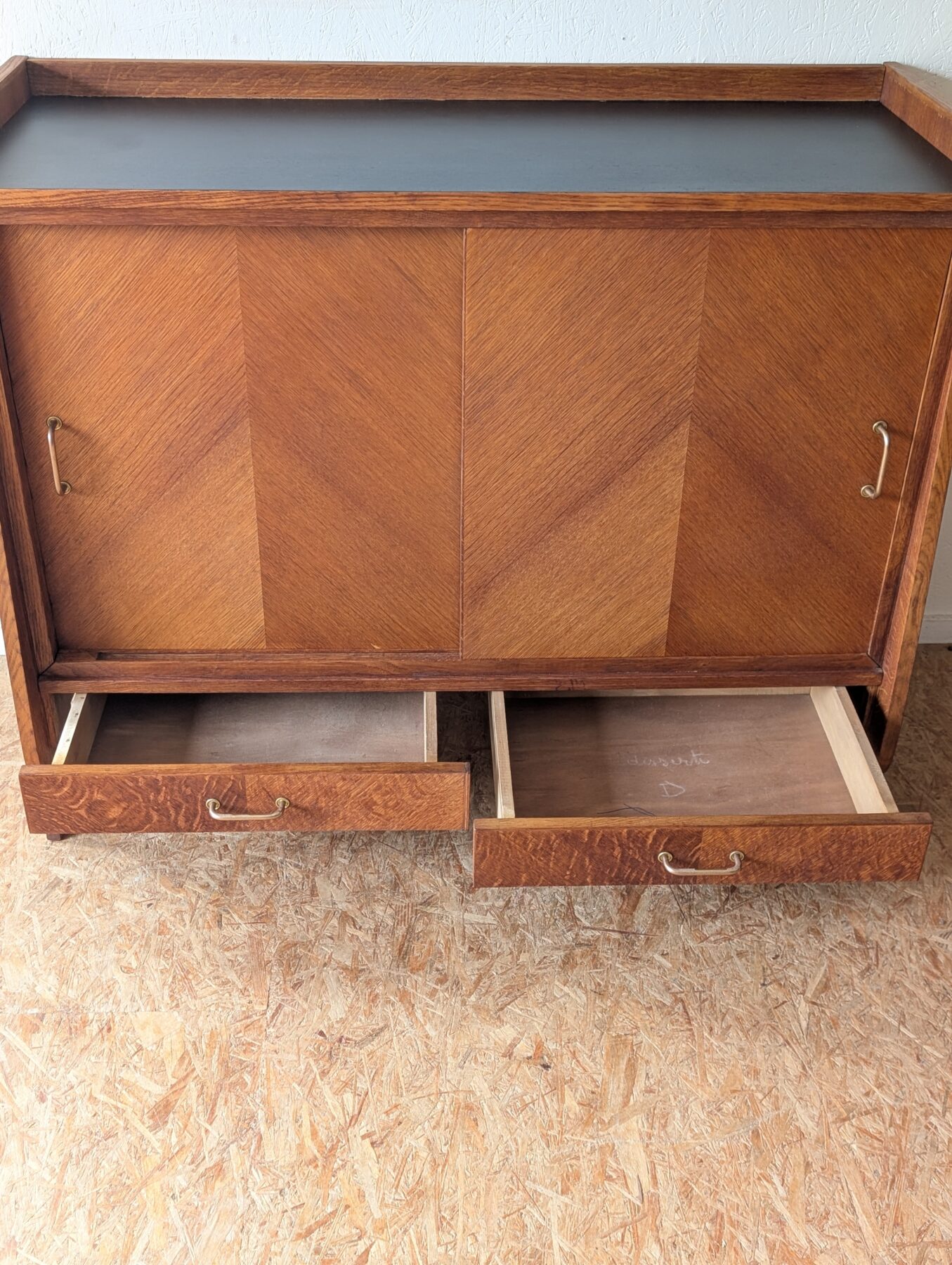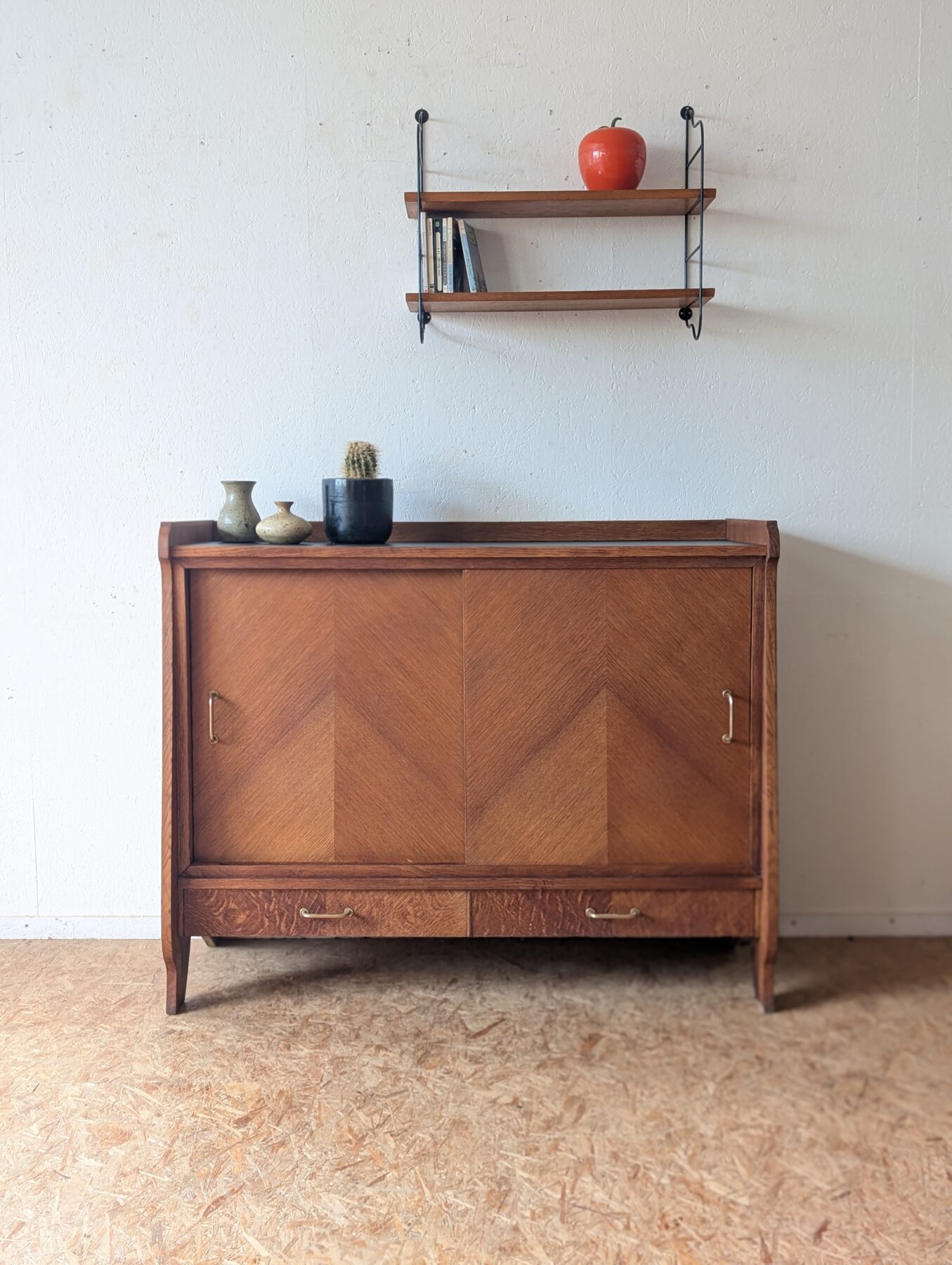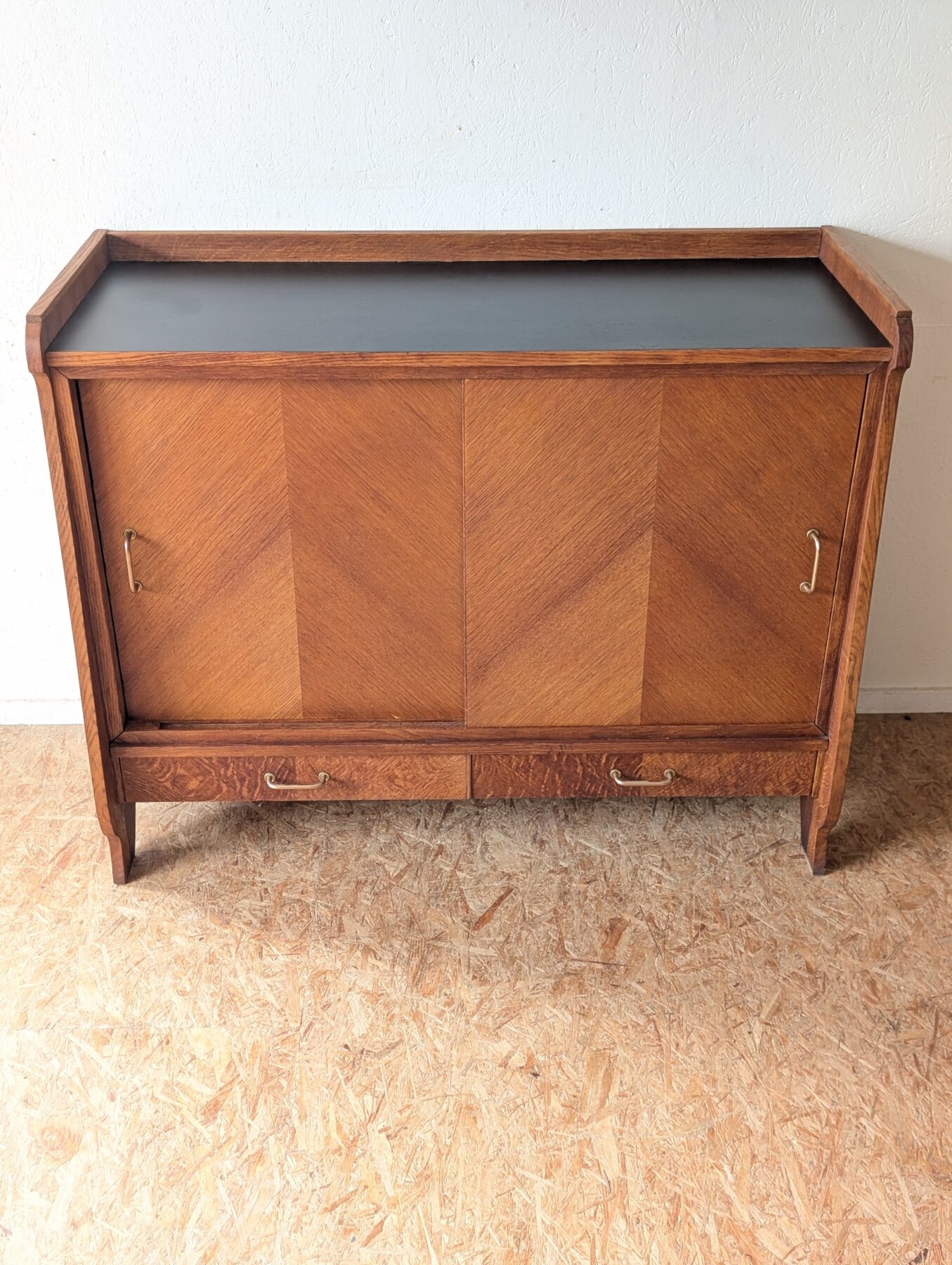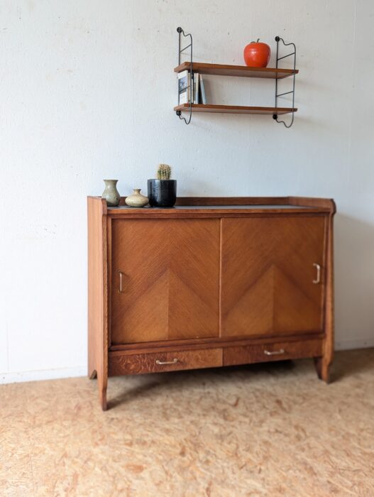 Buffet en placage chêne aux lignes typiques des années 50 doté de 2 portes coulissantes et de 2 tiroirs.