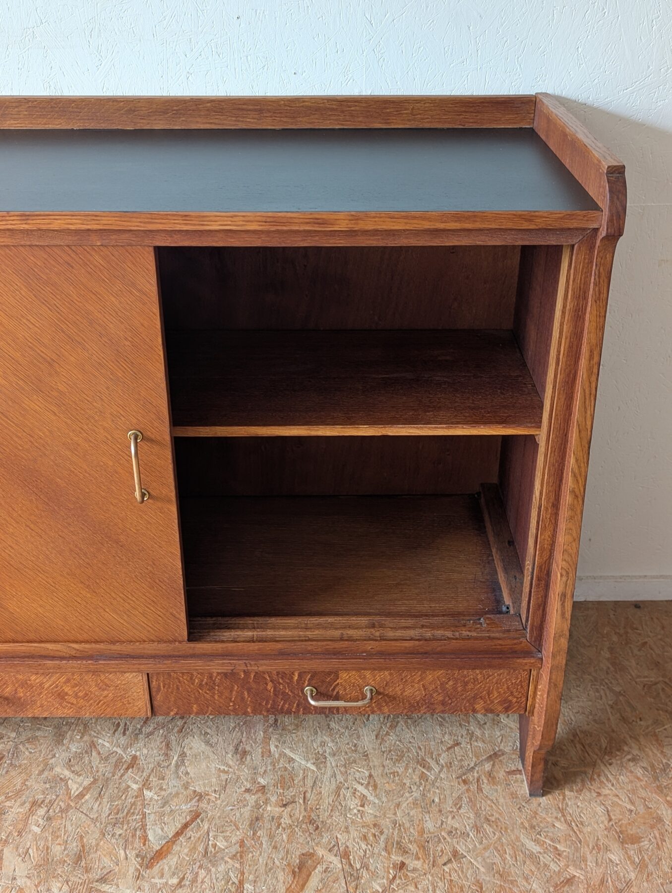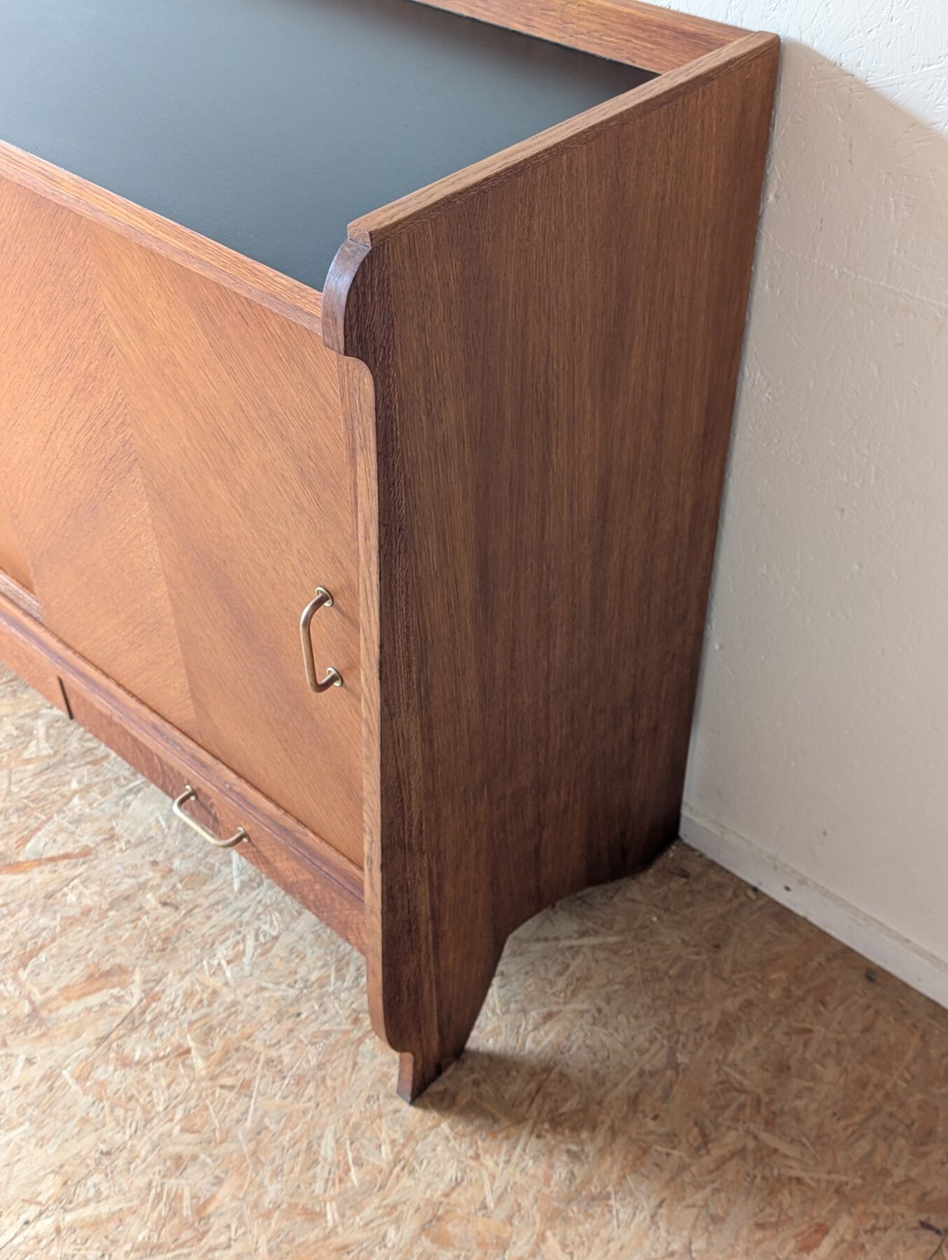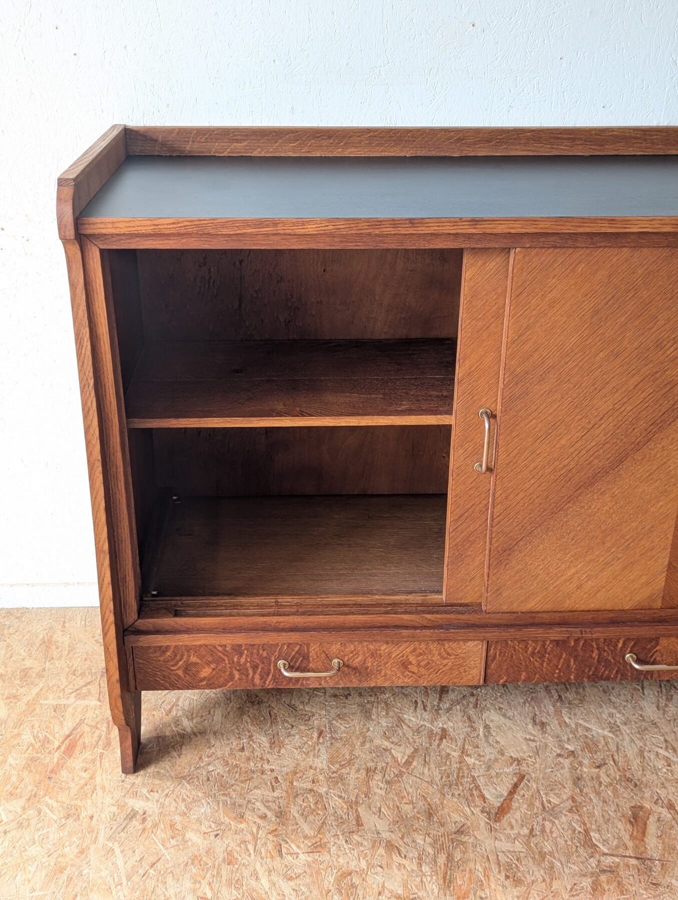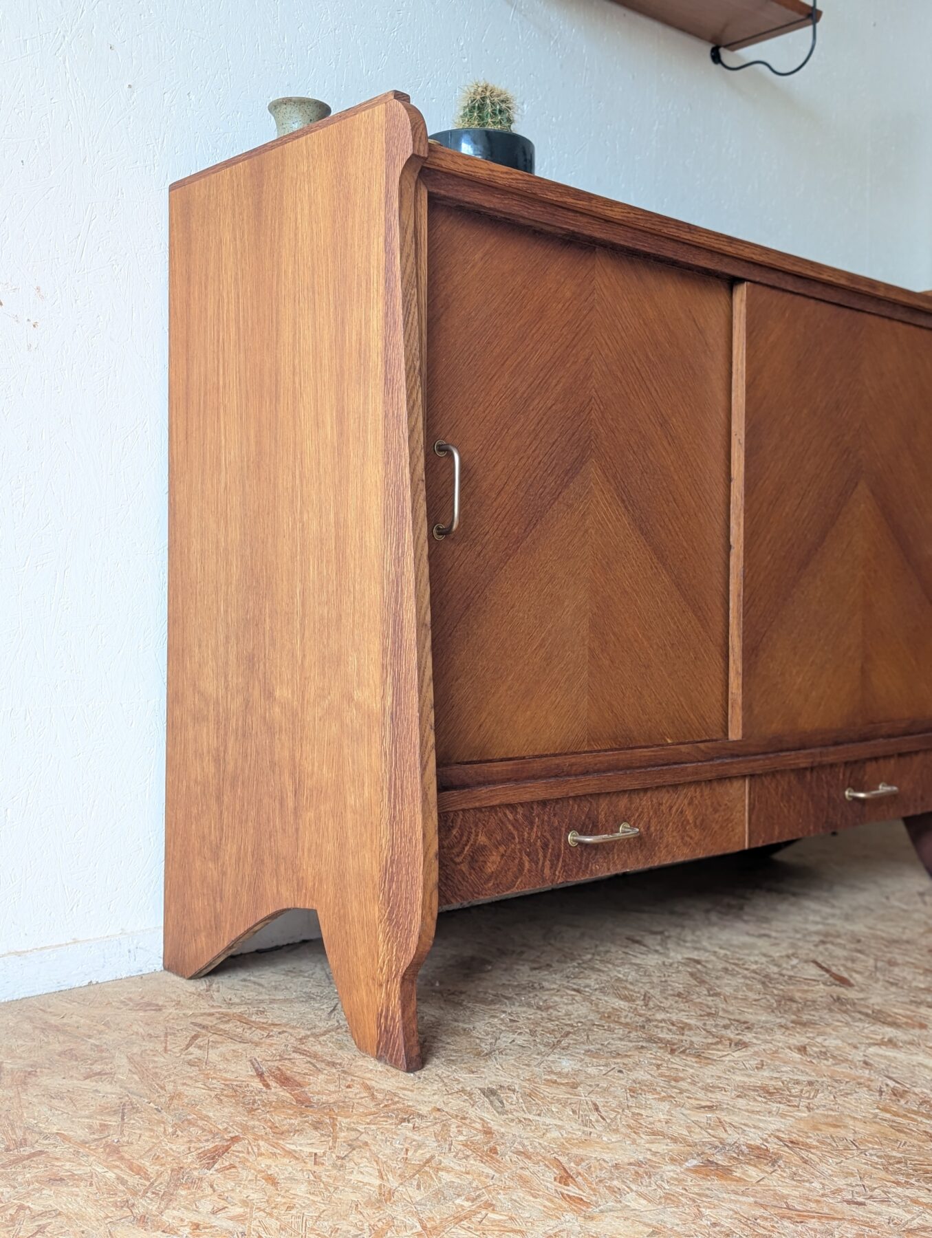Buffet en placage chêne aux lignes typiques des années 50 doté de 2 portes coulissantes et de 2 tiroirs.