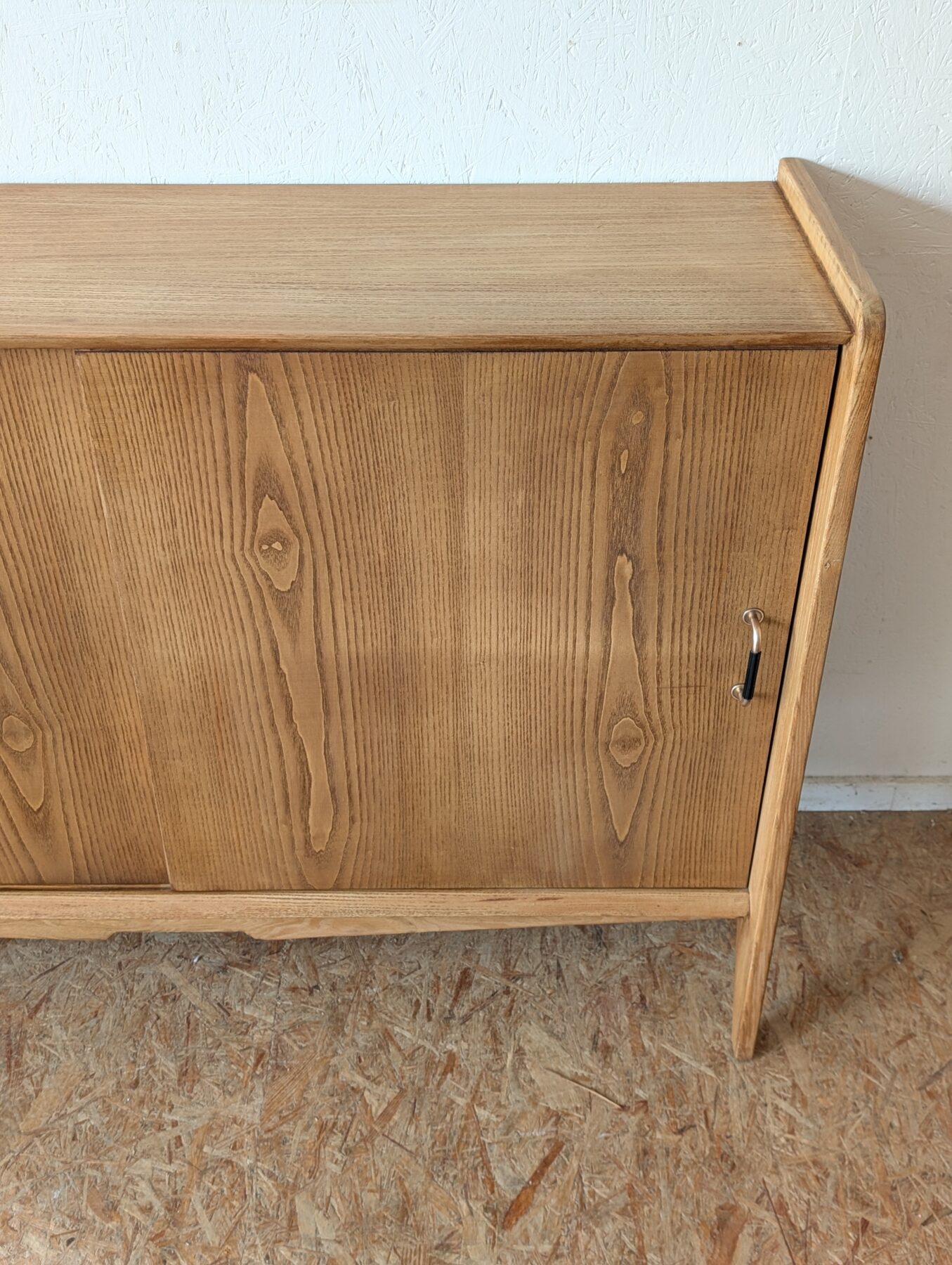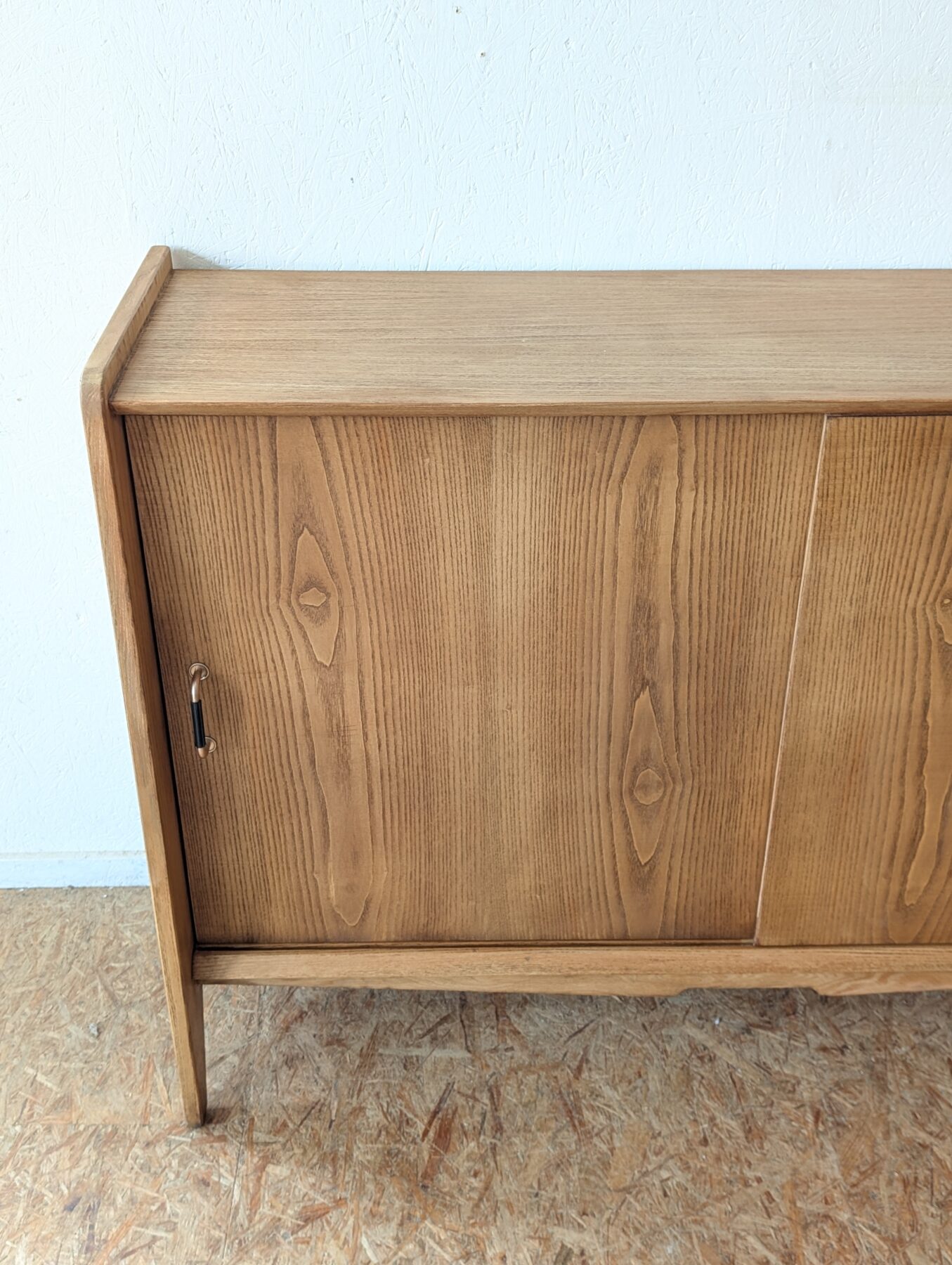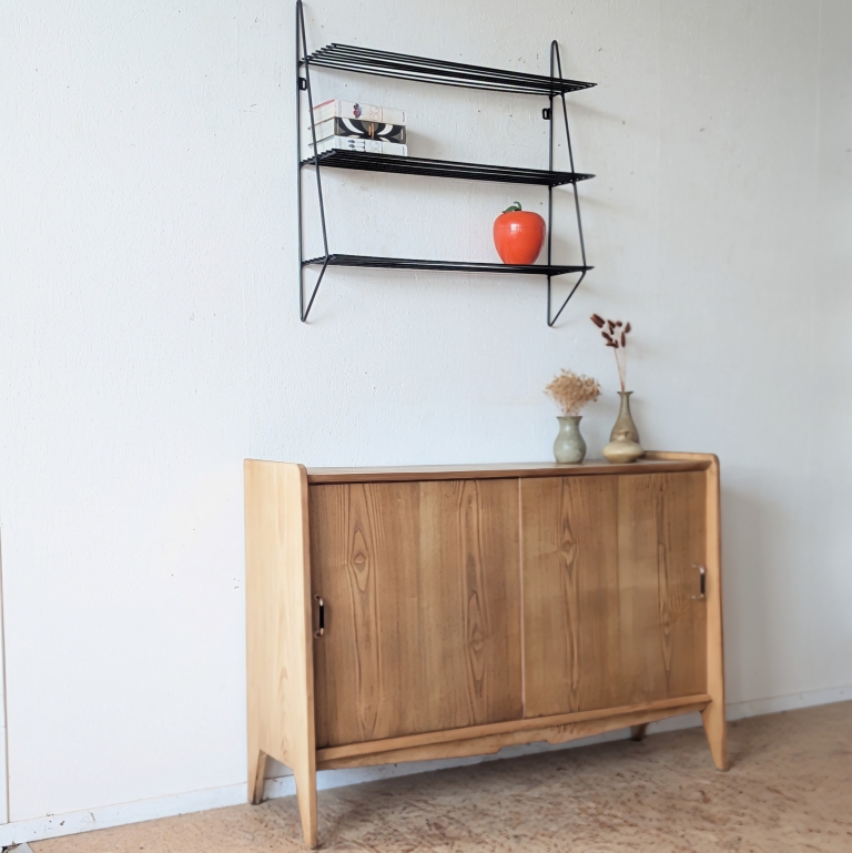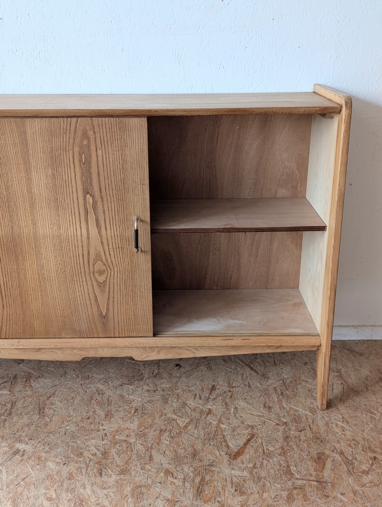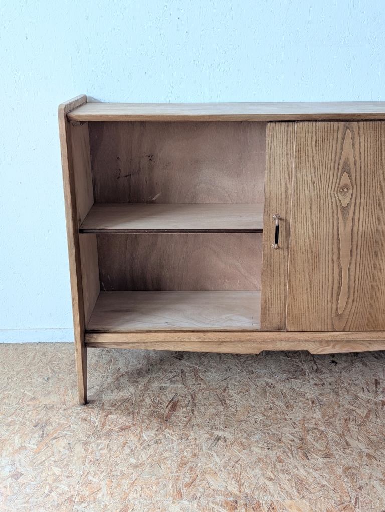 Buffet en placage chêne vintage avec 2 portes coulissantes. Faible profondeur.