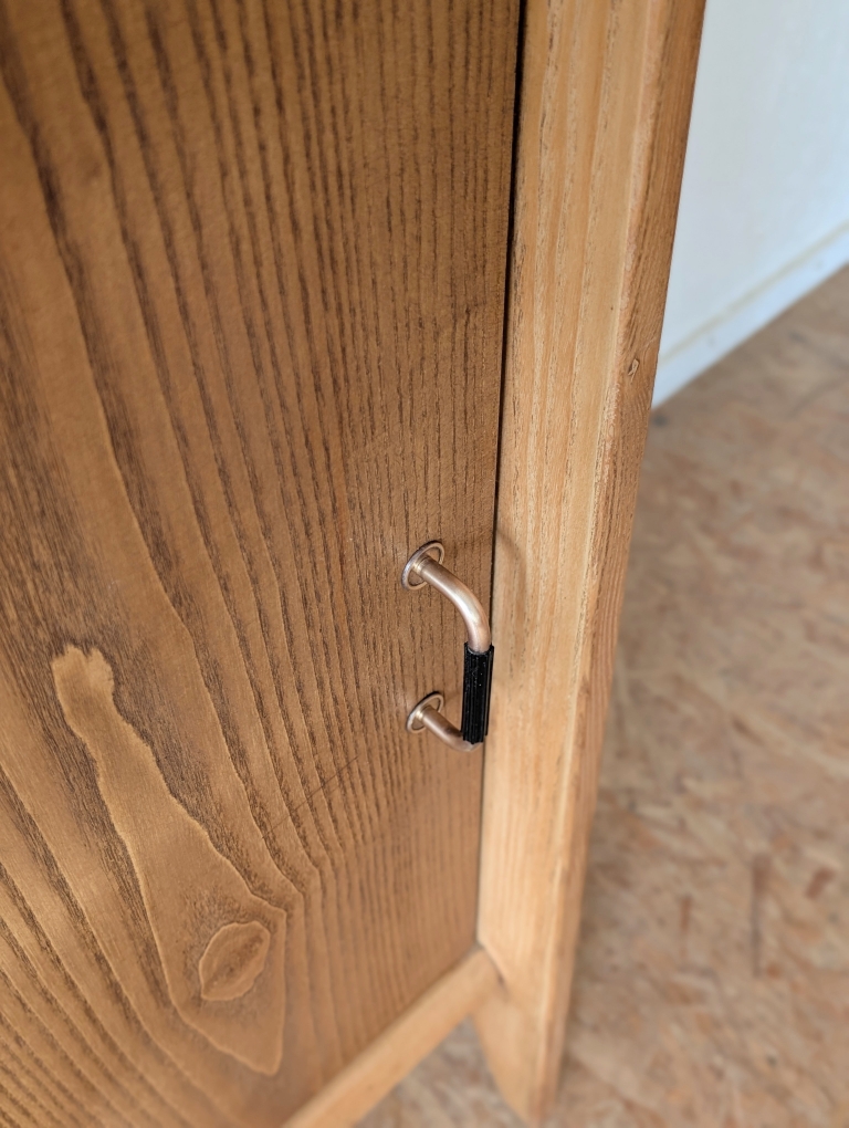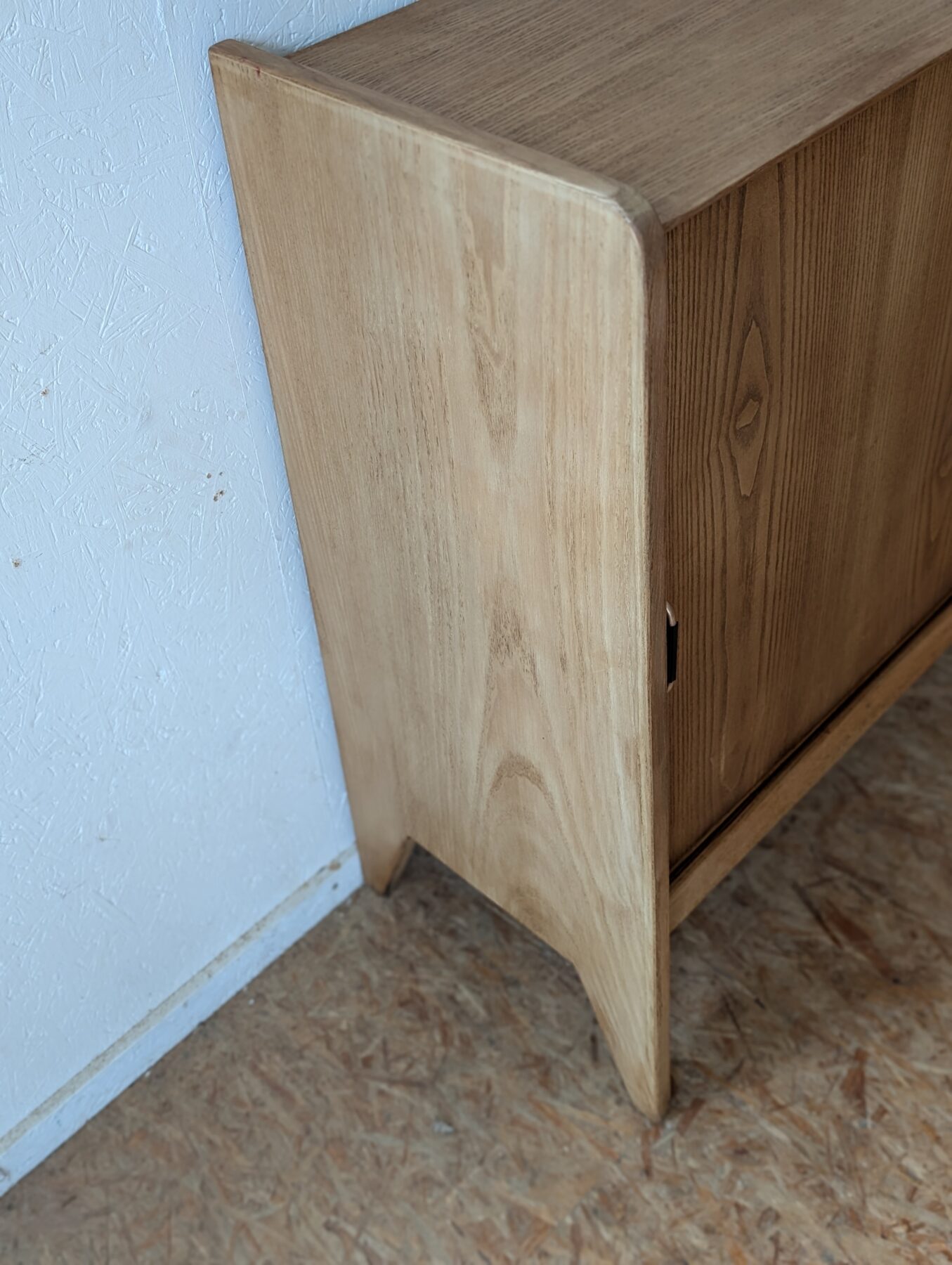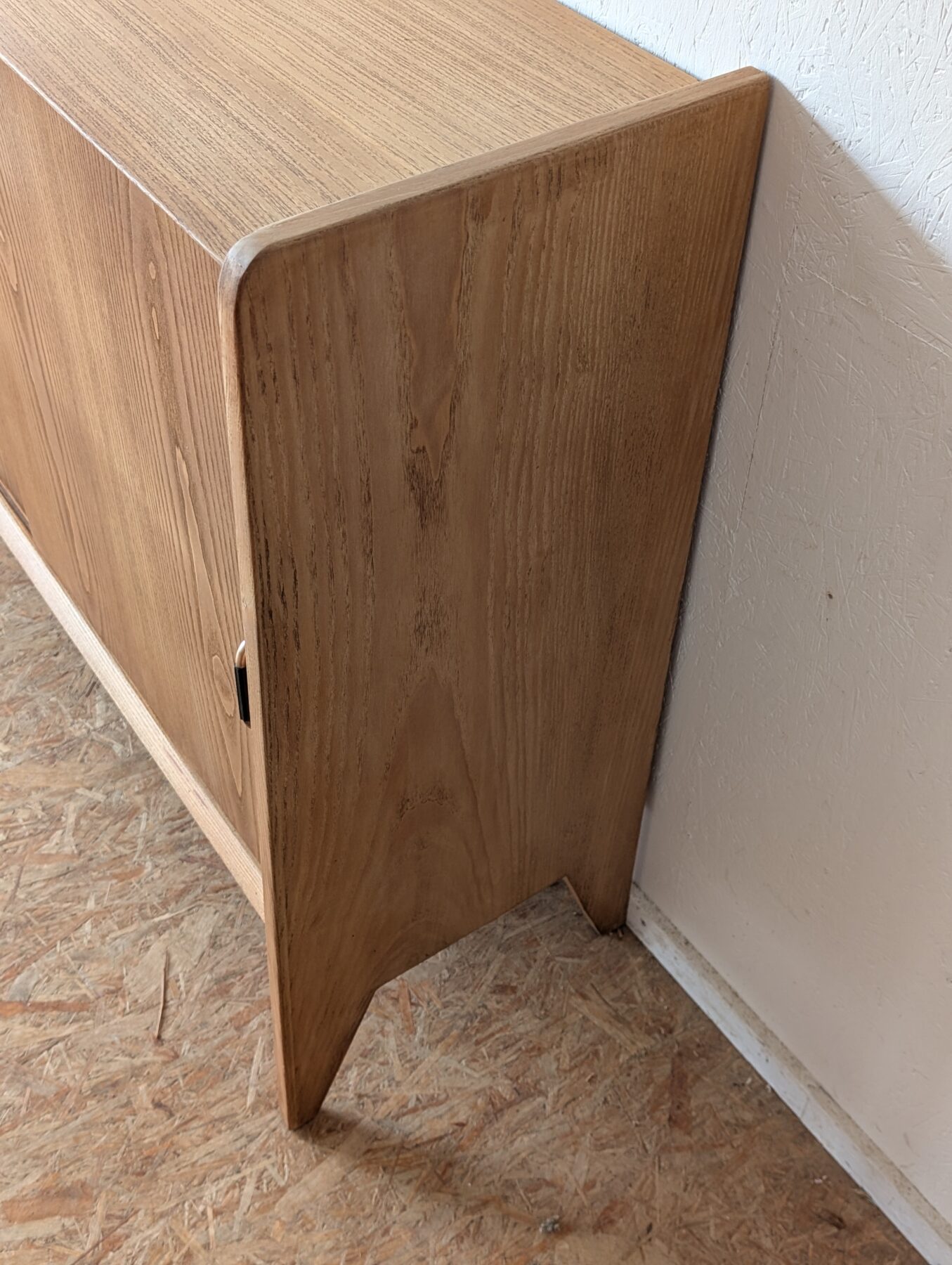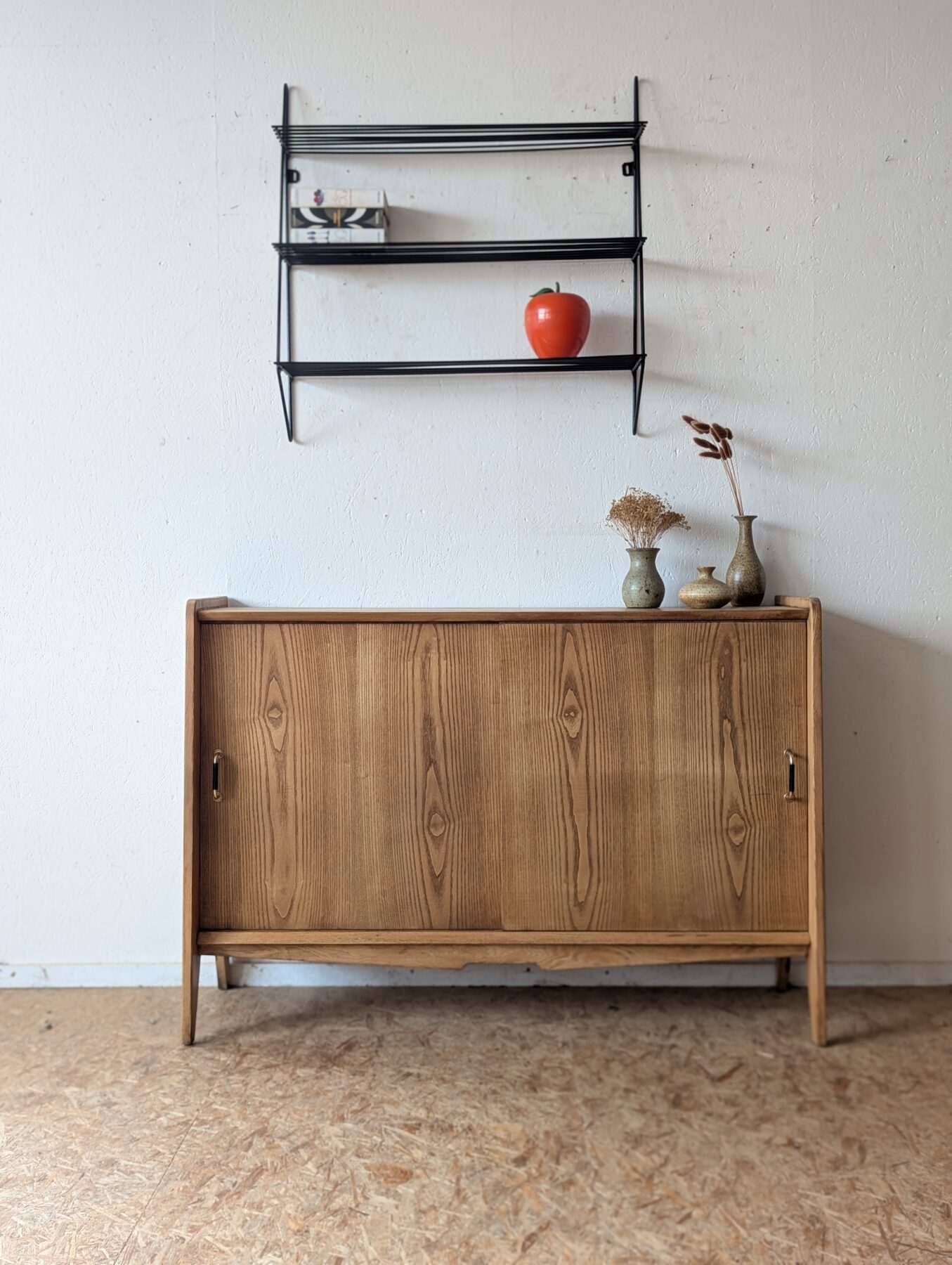 Buffet en placage chêne vintage avec 2 portes coulissantes. Faible profondeur.