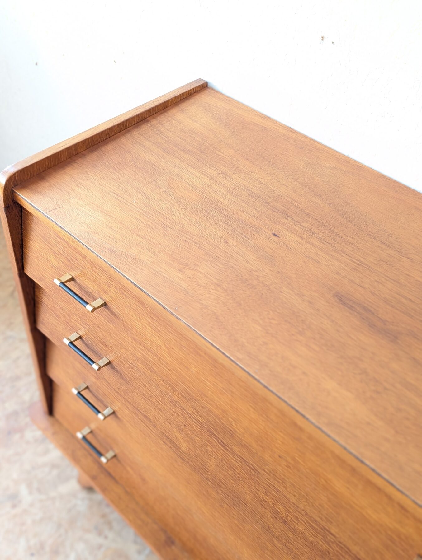Commode chêne et placage chêne des années 50 avec pieds compas et 4 tiroirs.