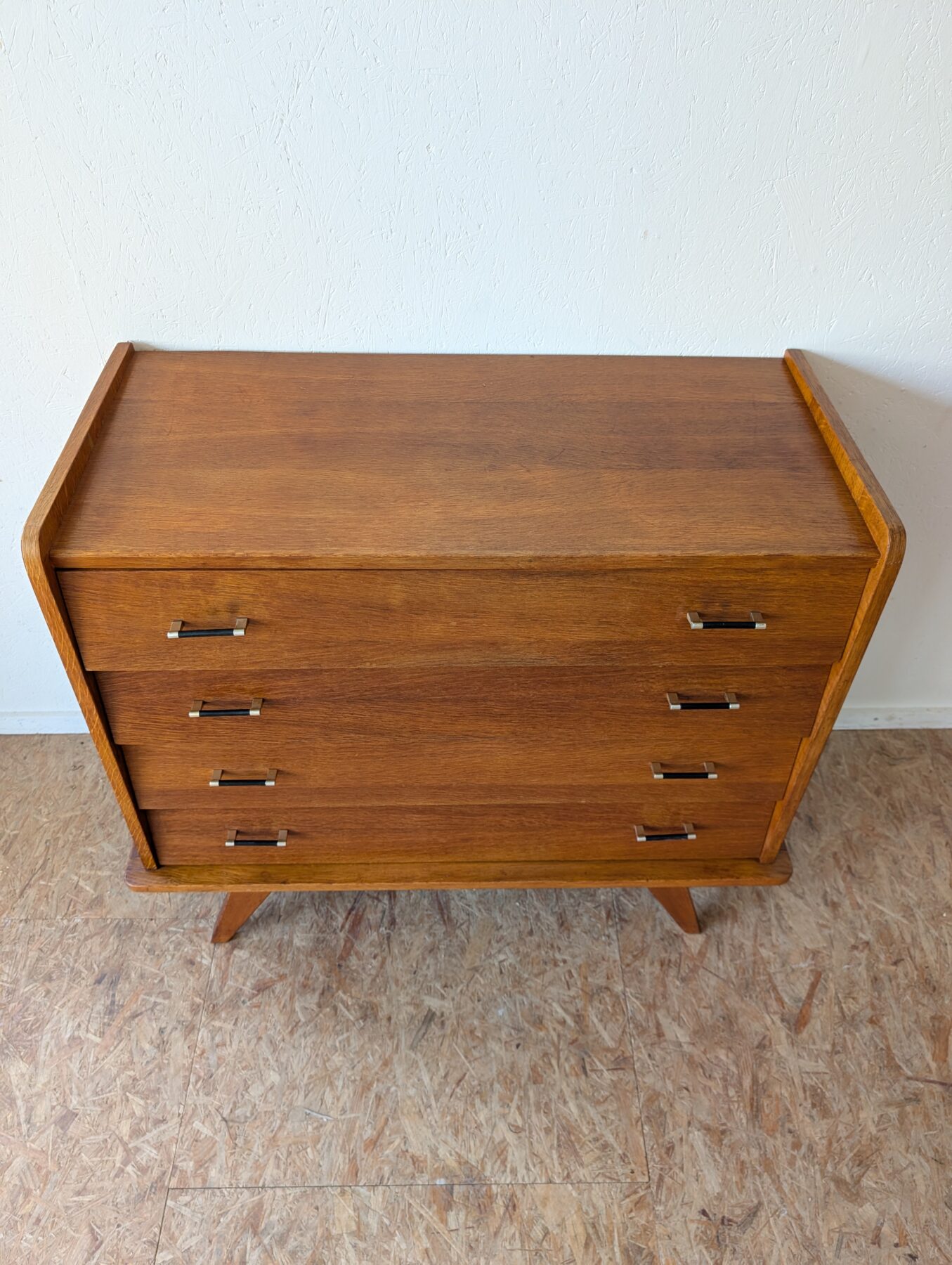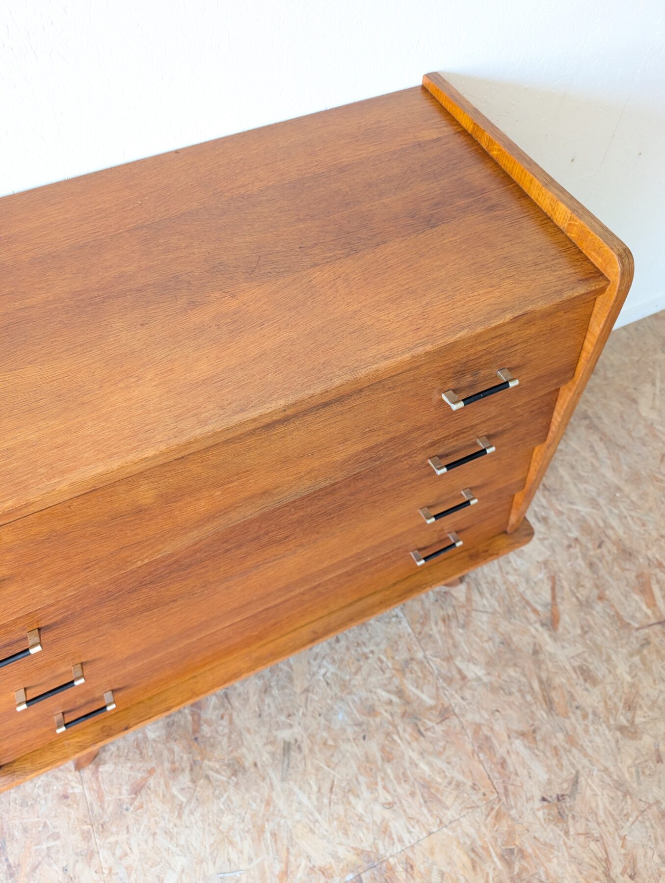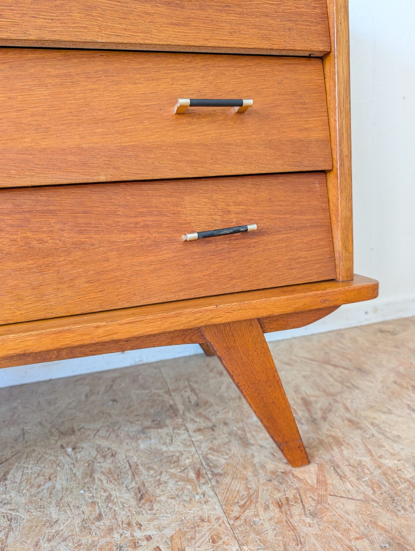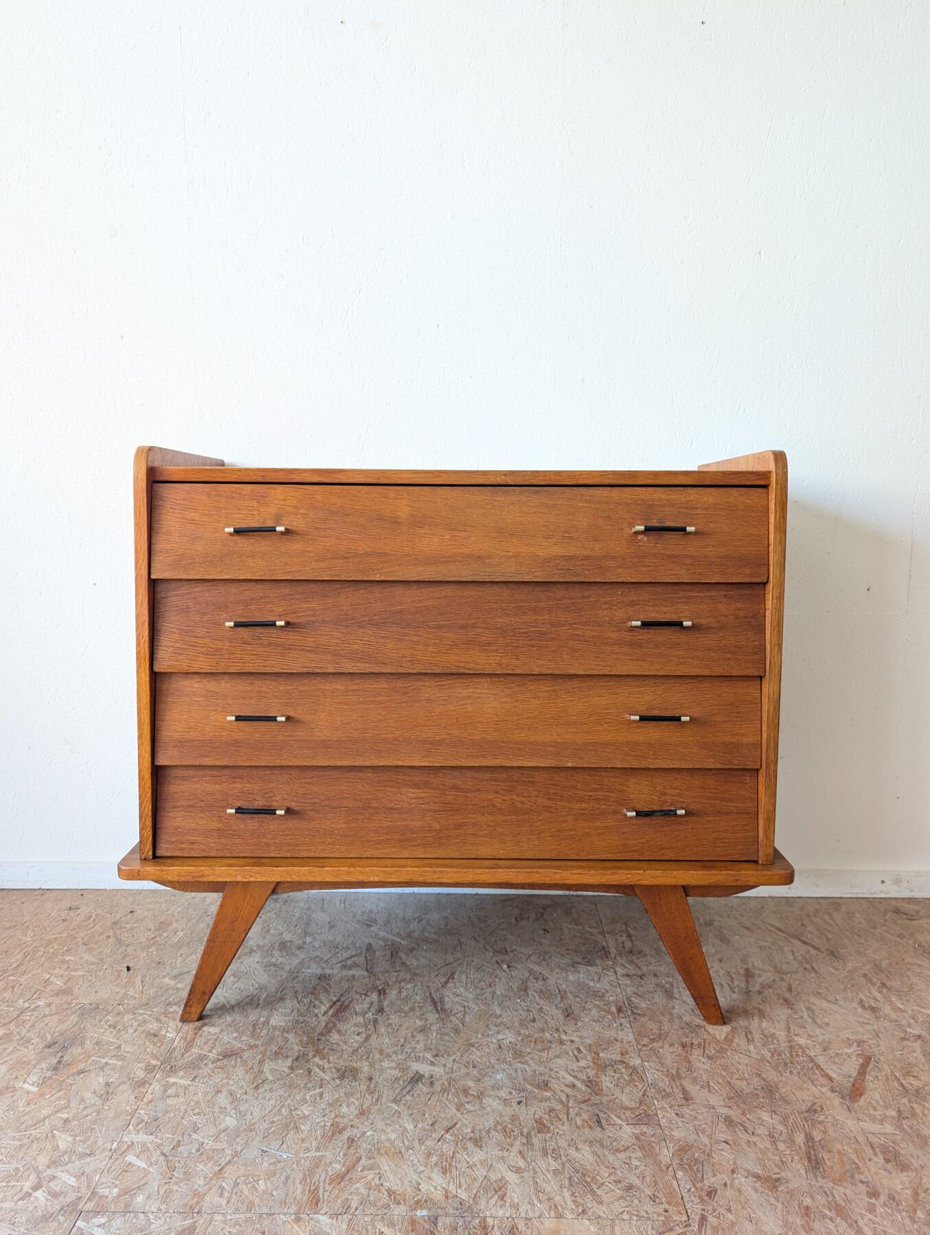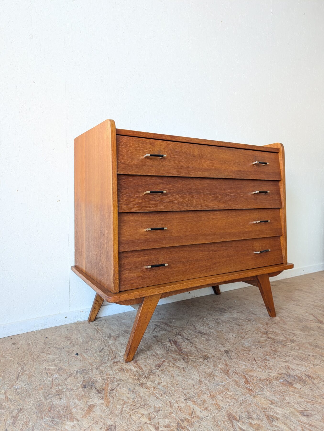 Commode chêne pieds compas des années 50 comprenant 4 tiroirs aux poignées bakélite noir et laiton.