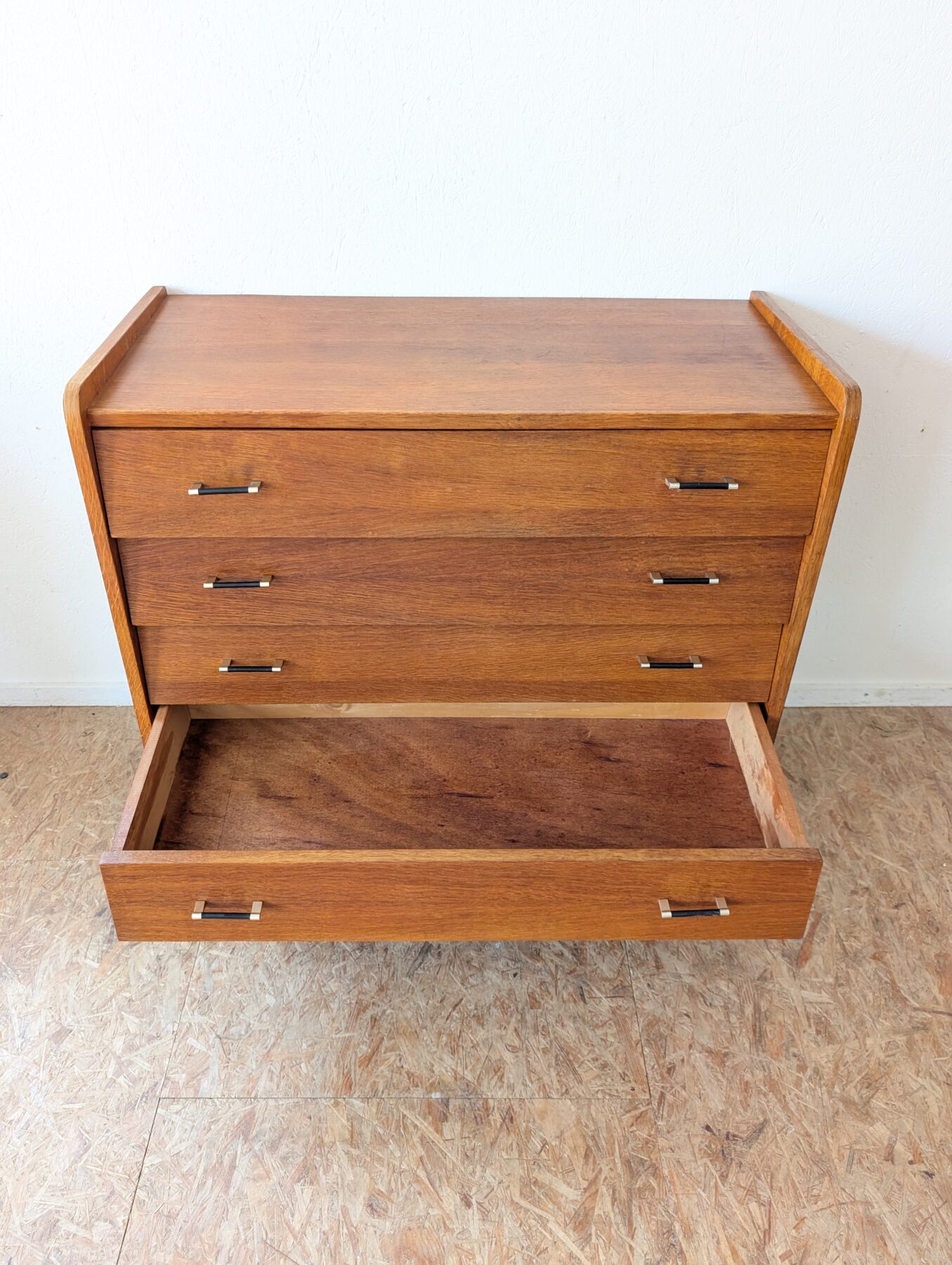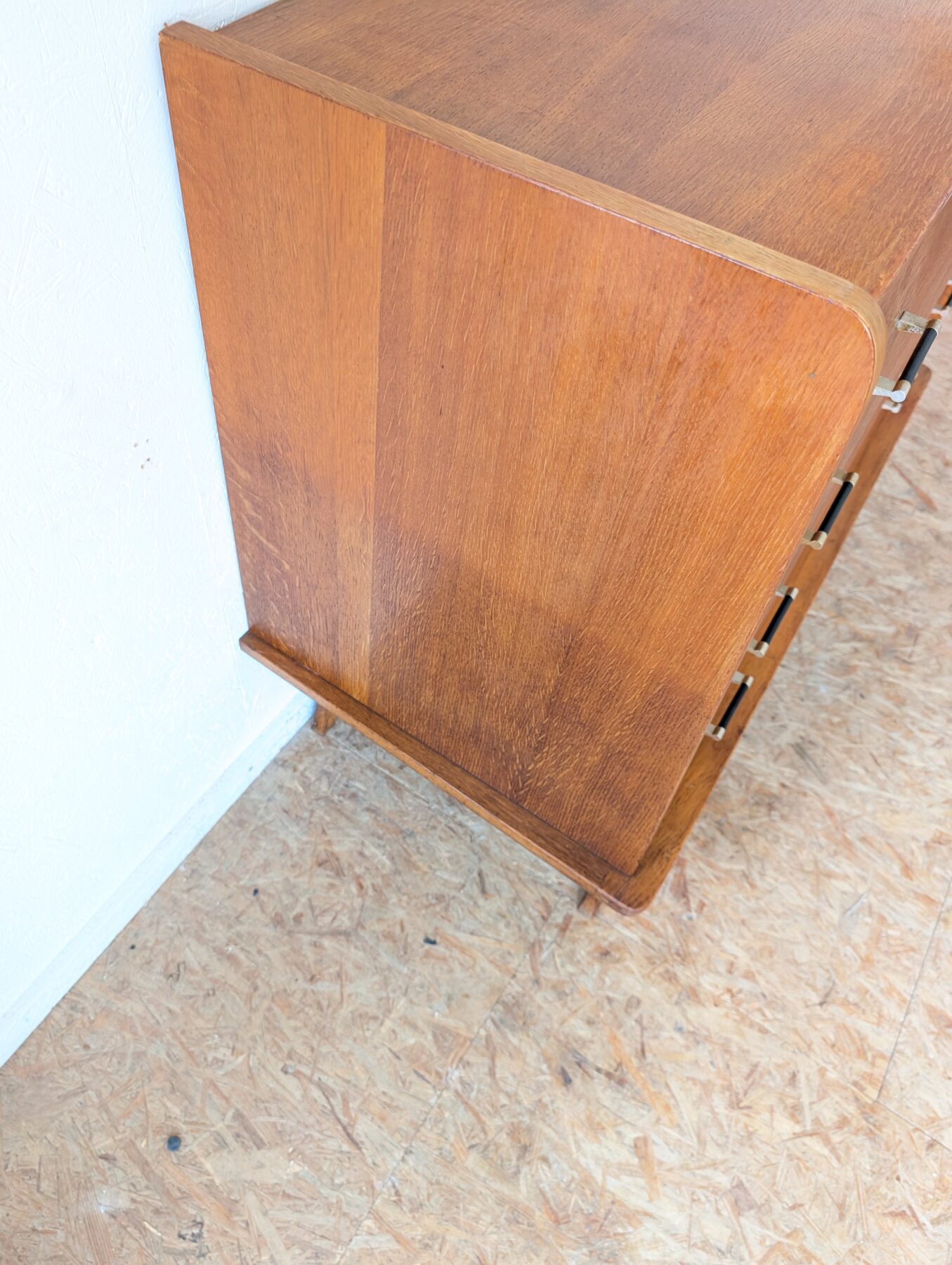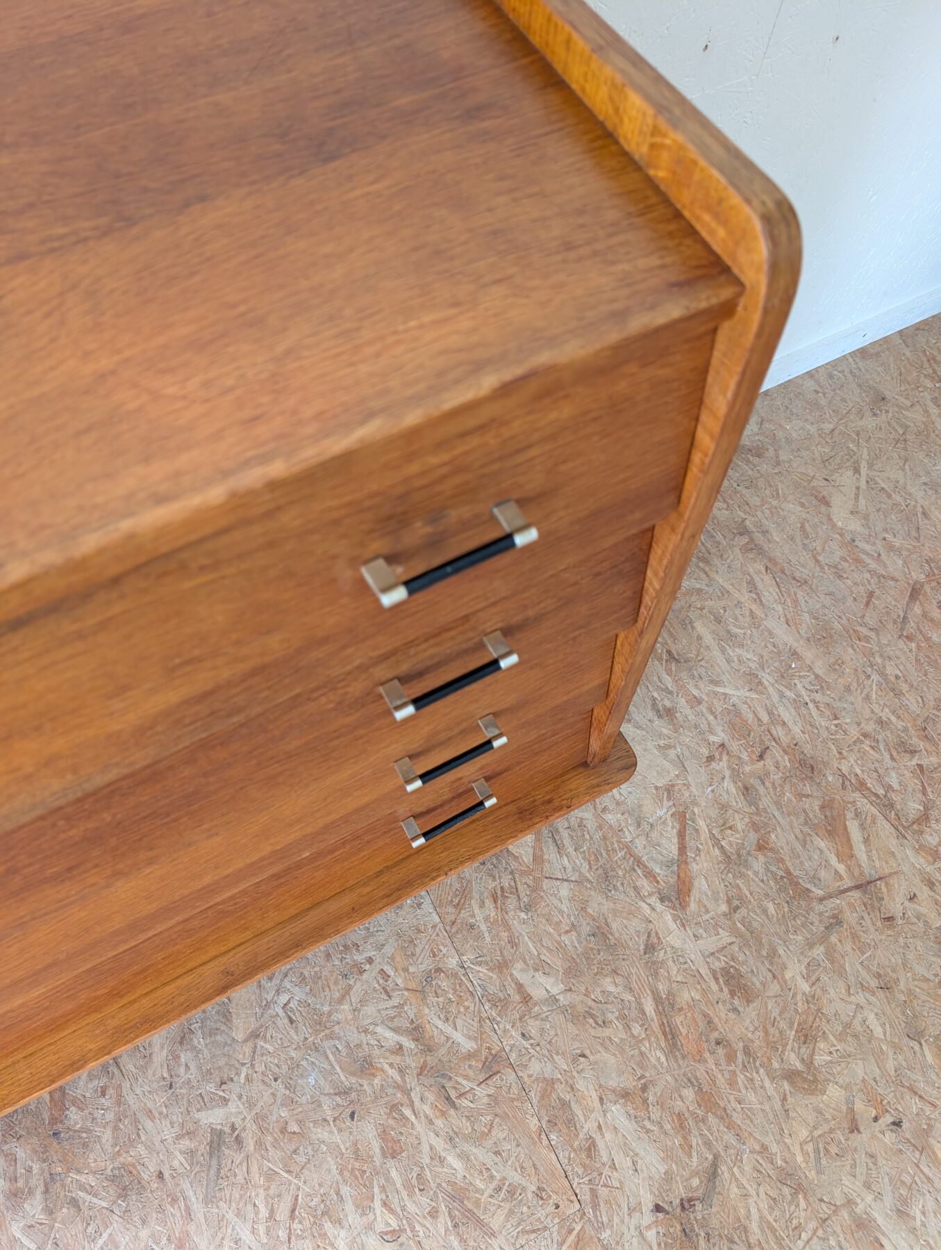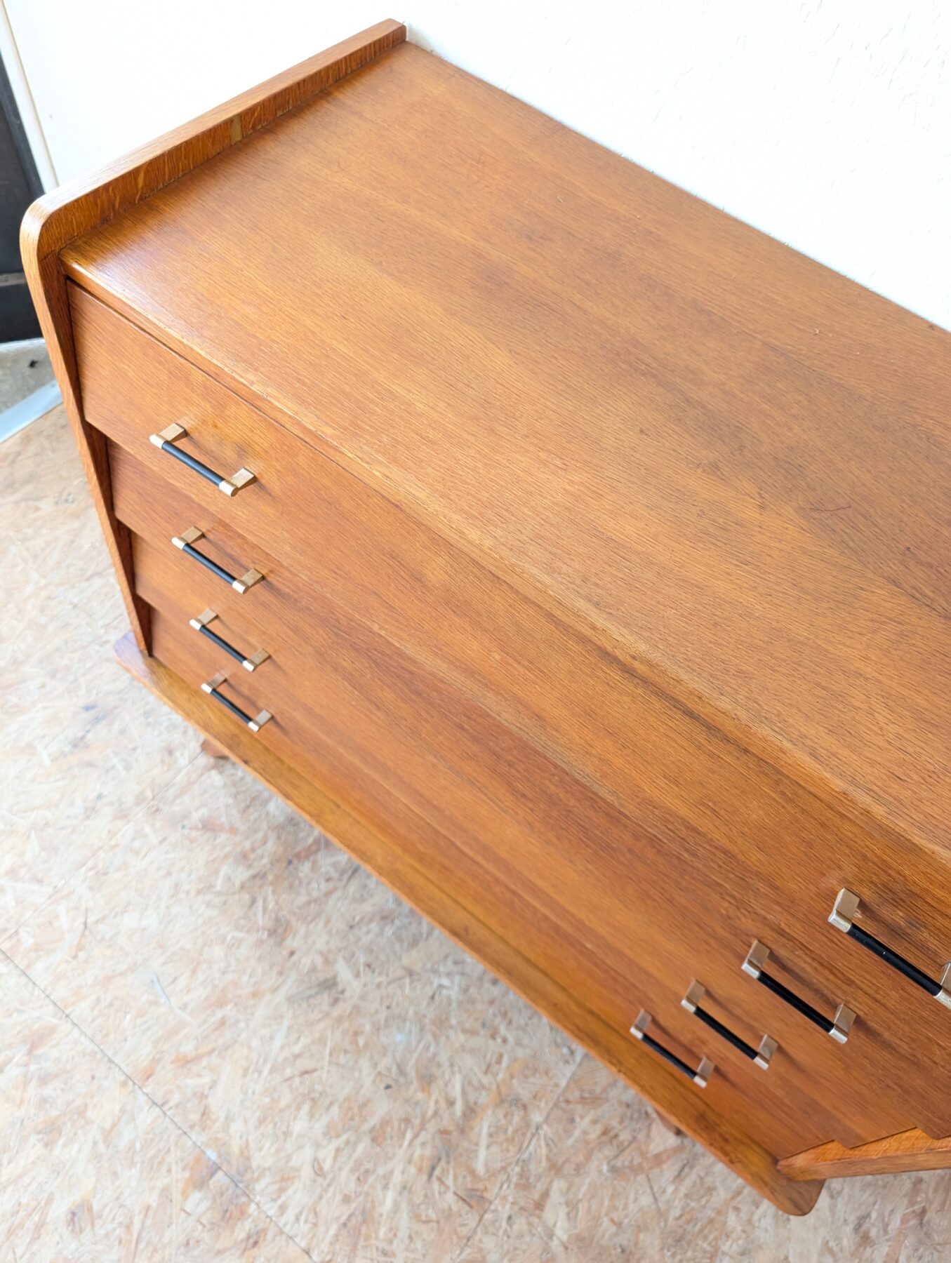 Commode chêne pieds compas des années 50 comprenant 4 tiroirs aux poignées bakélite noir et laiton.