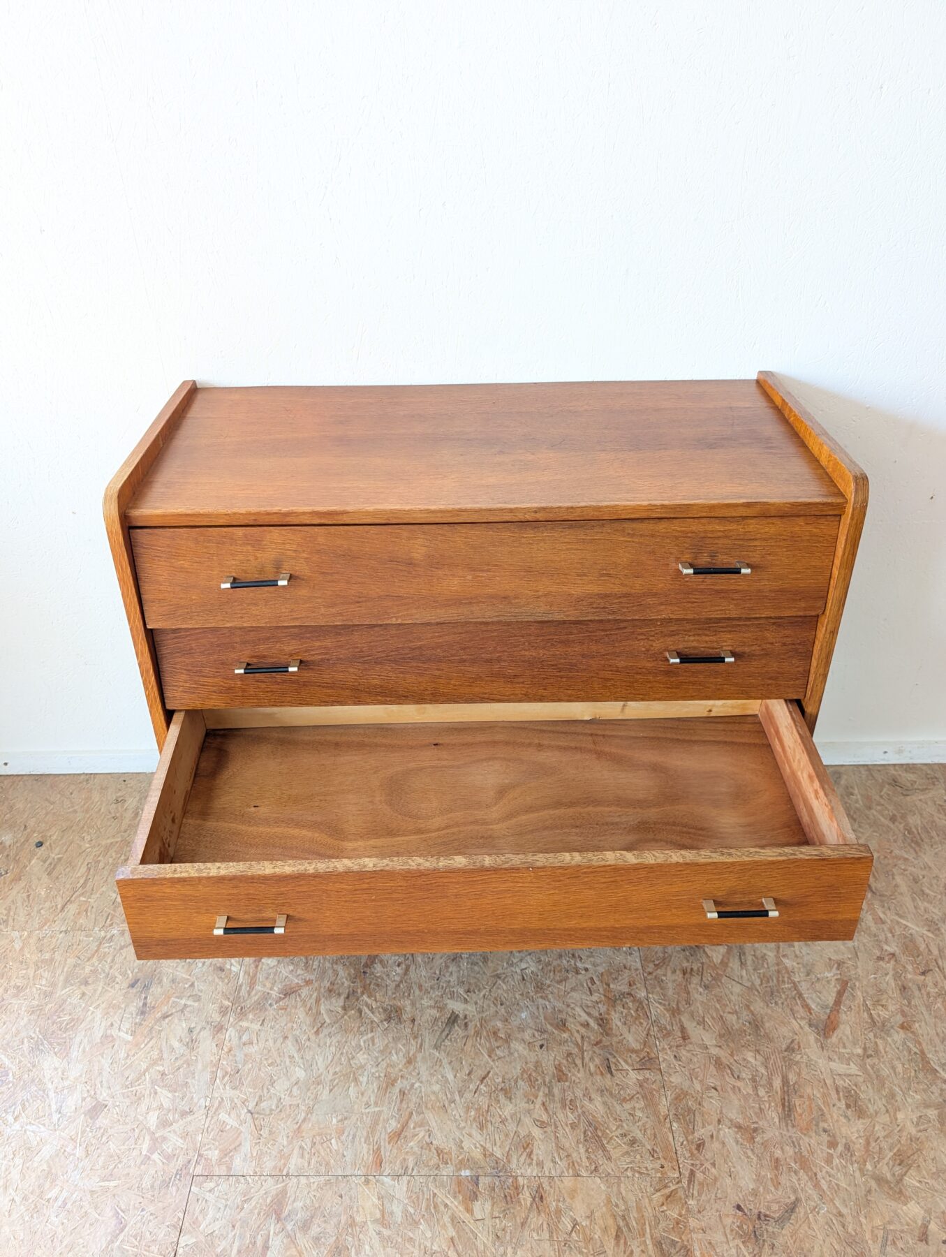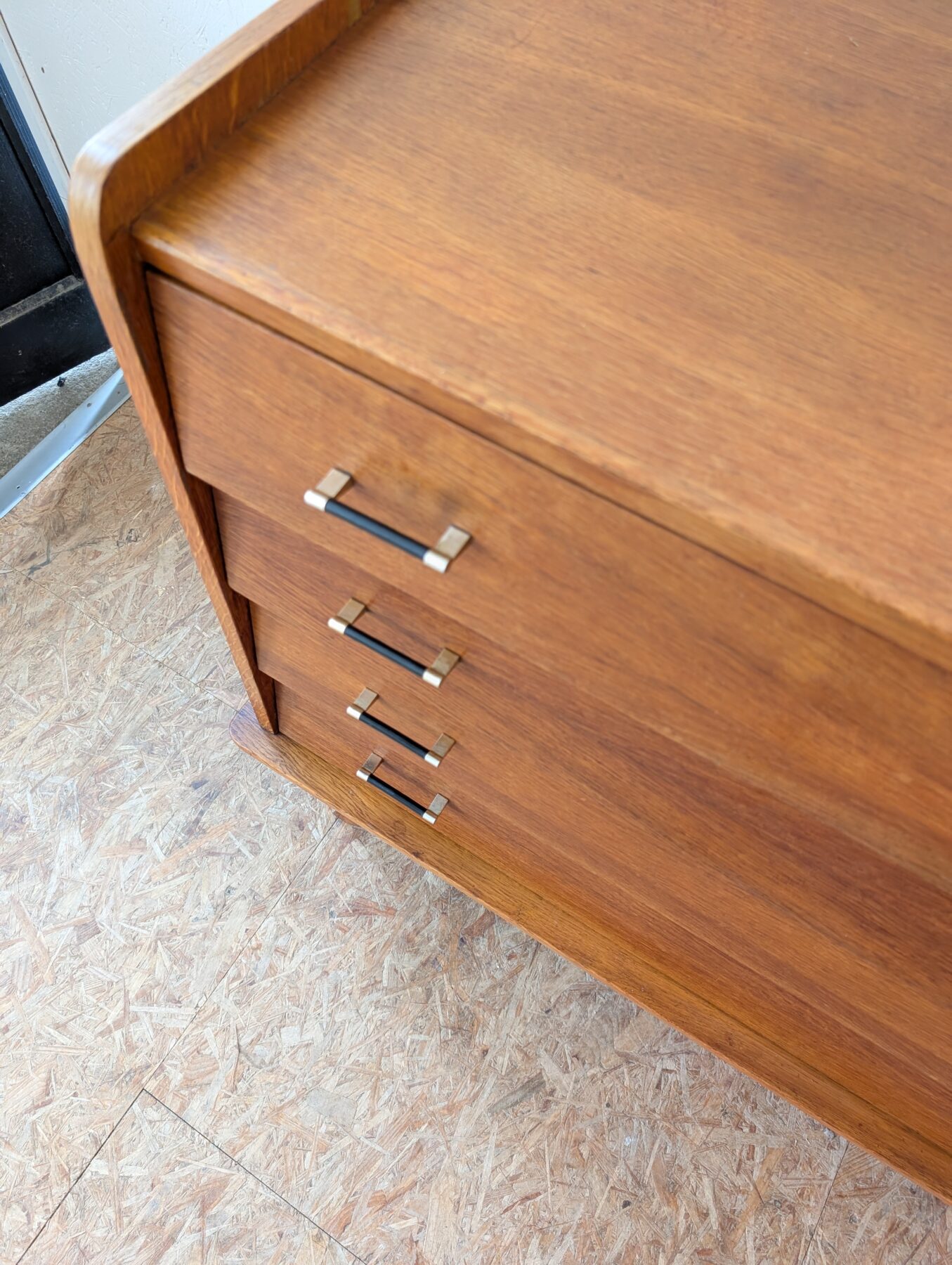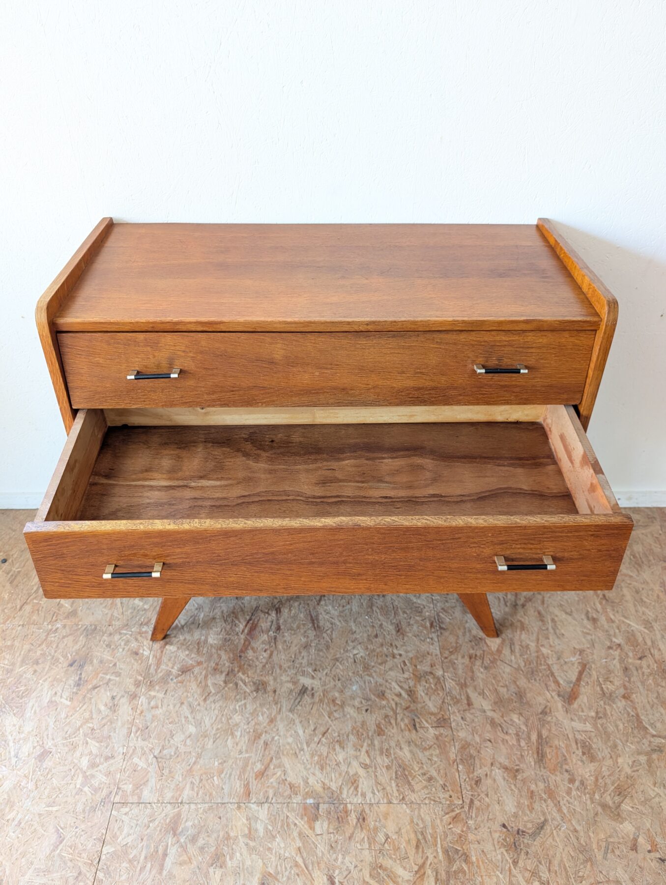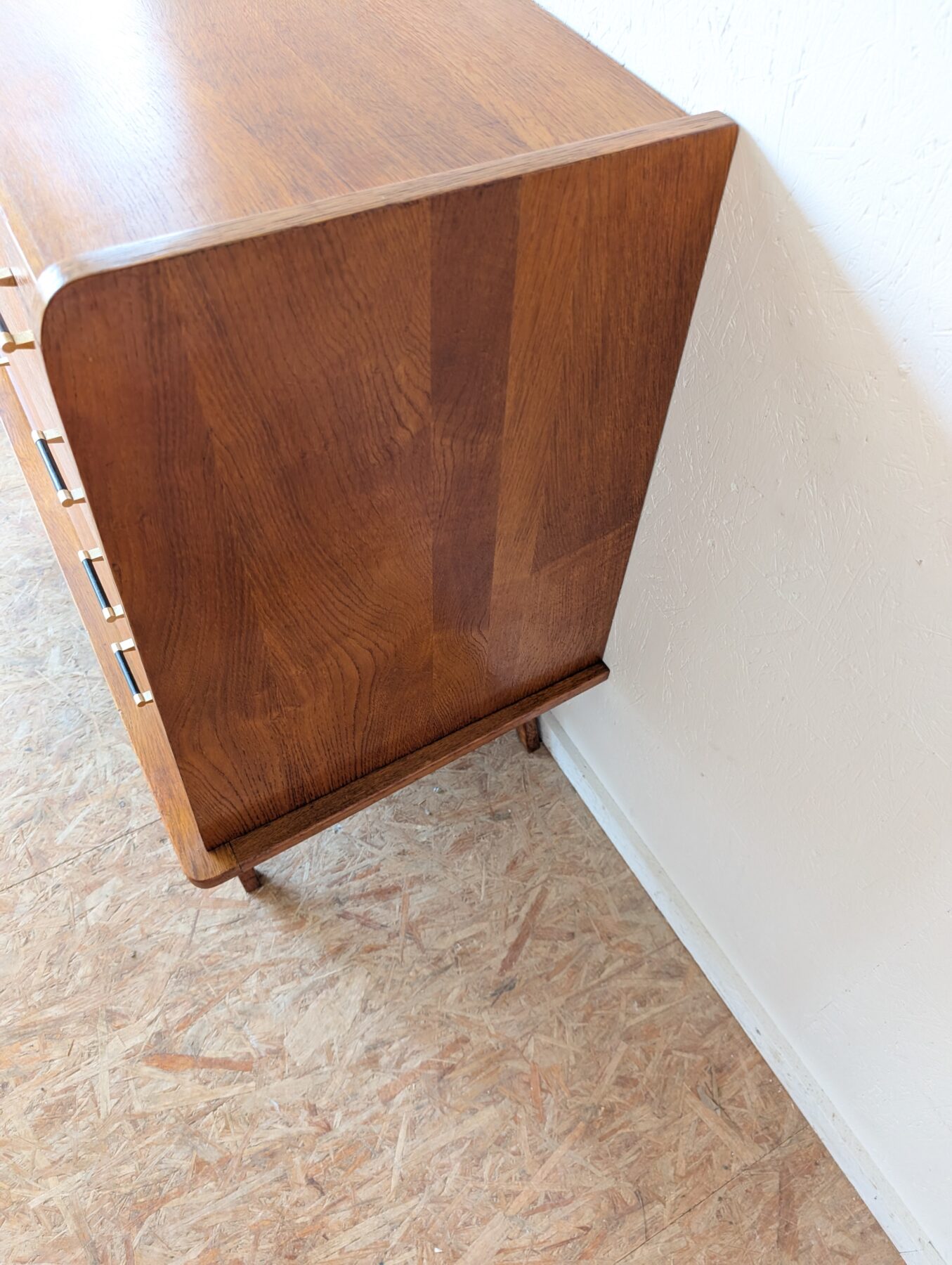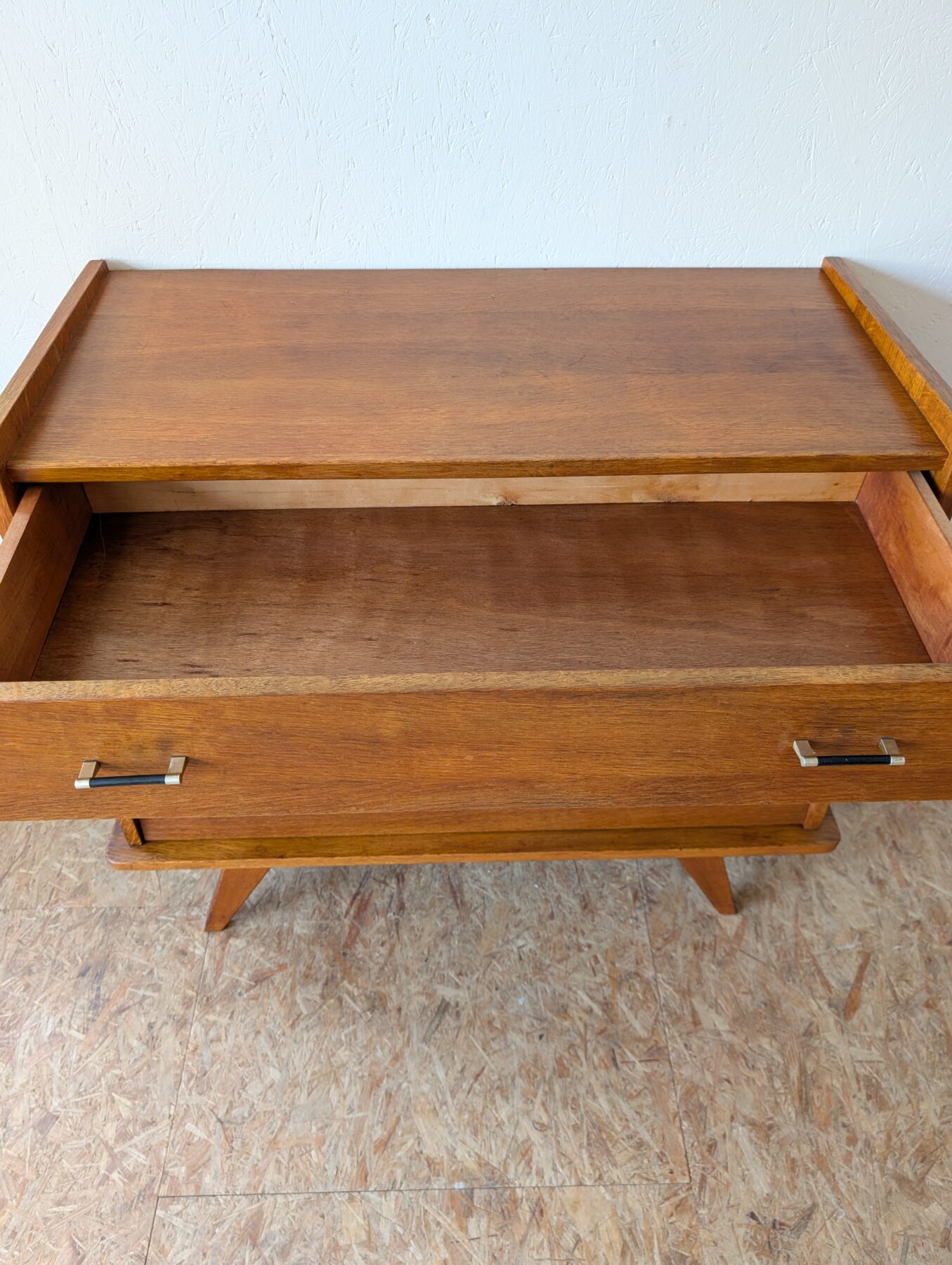Commode chêne pieds compas des années 50 comprenant 4 tiroirs aux poignées bakélite noir et laiton.