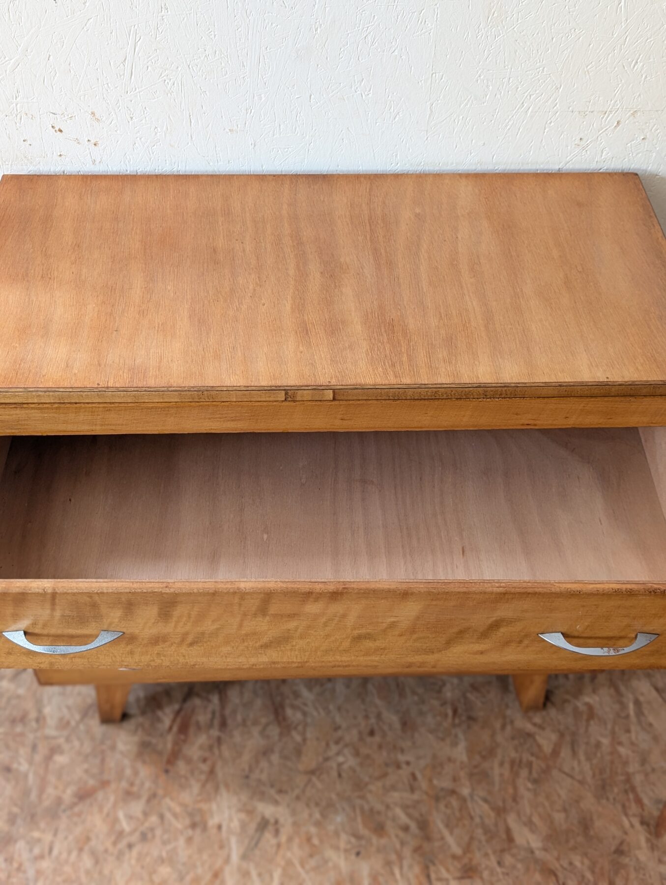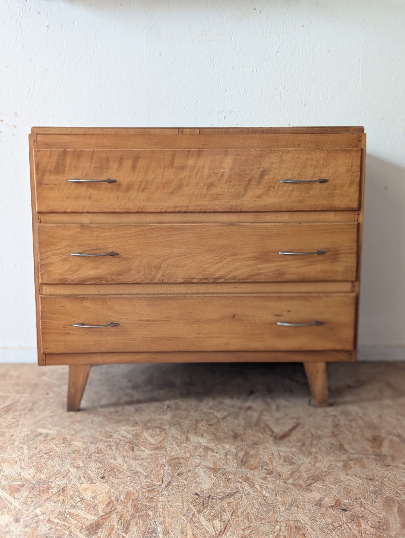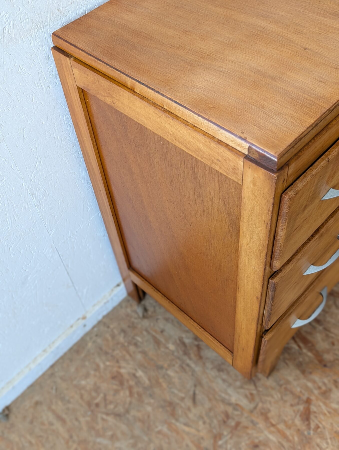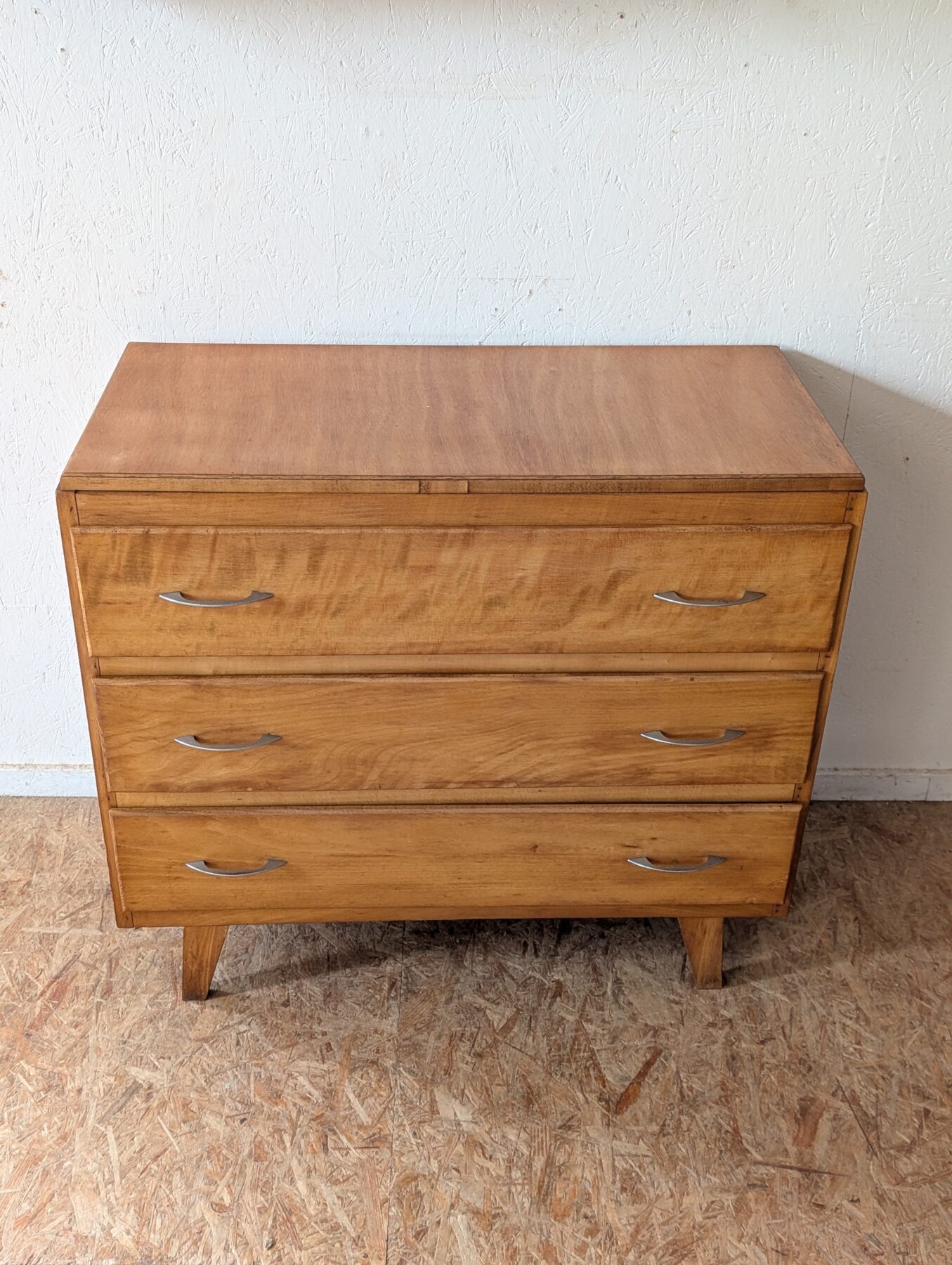 Commode vintage en placage hêtre avec 3 tiroirs.