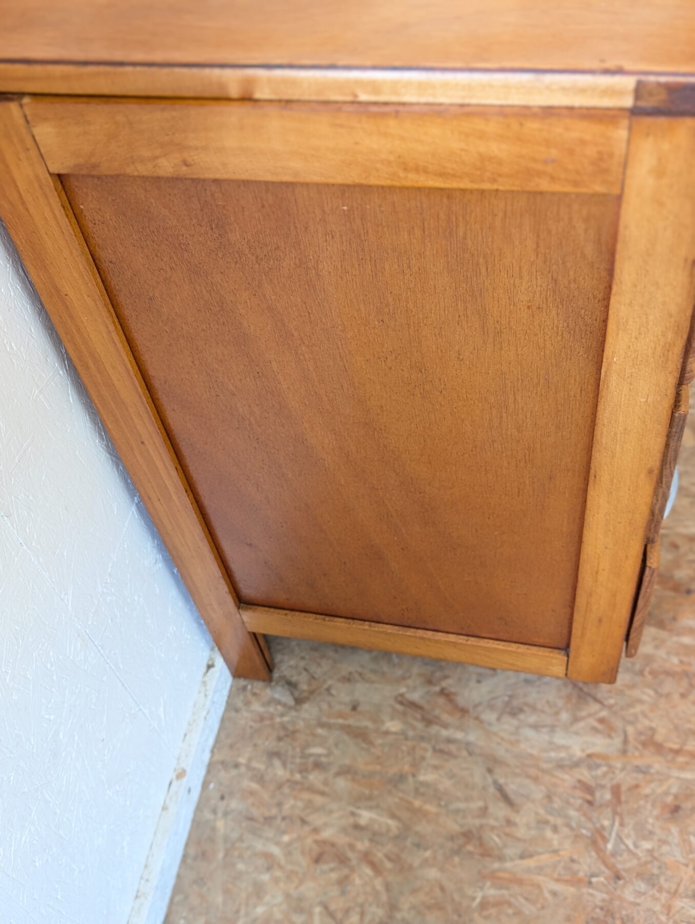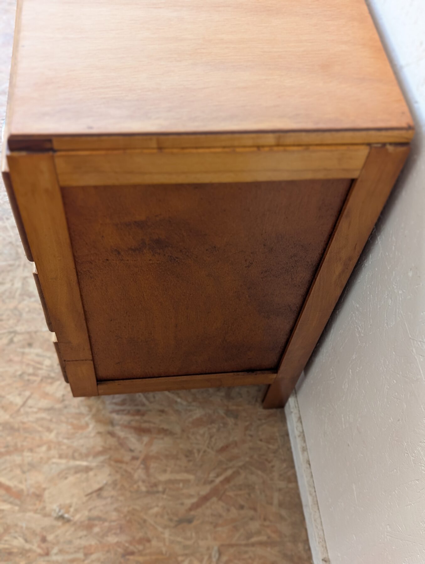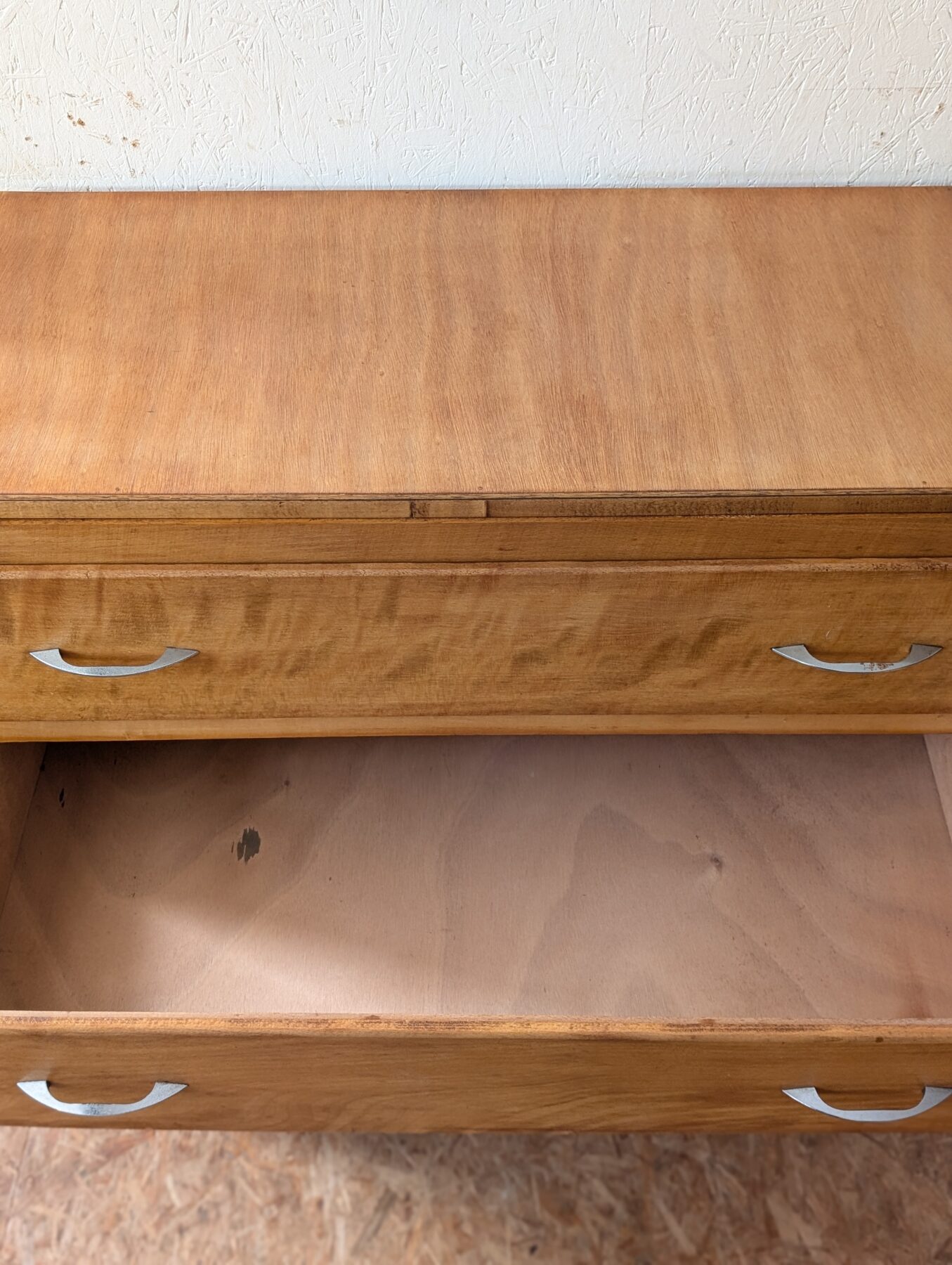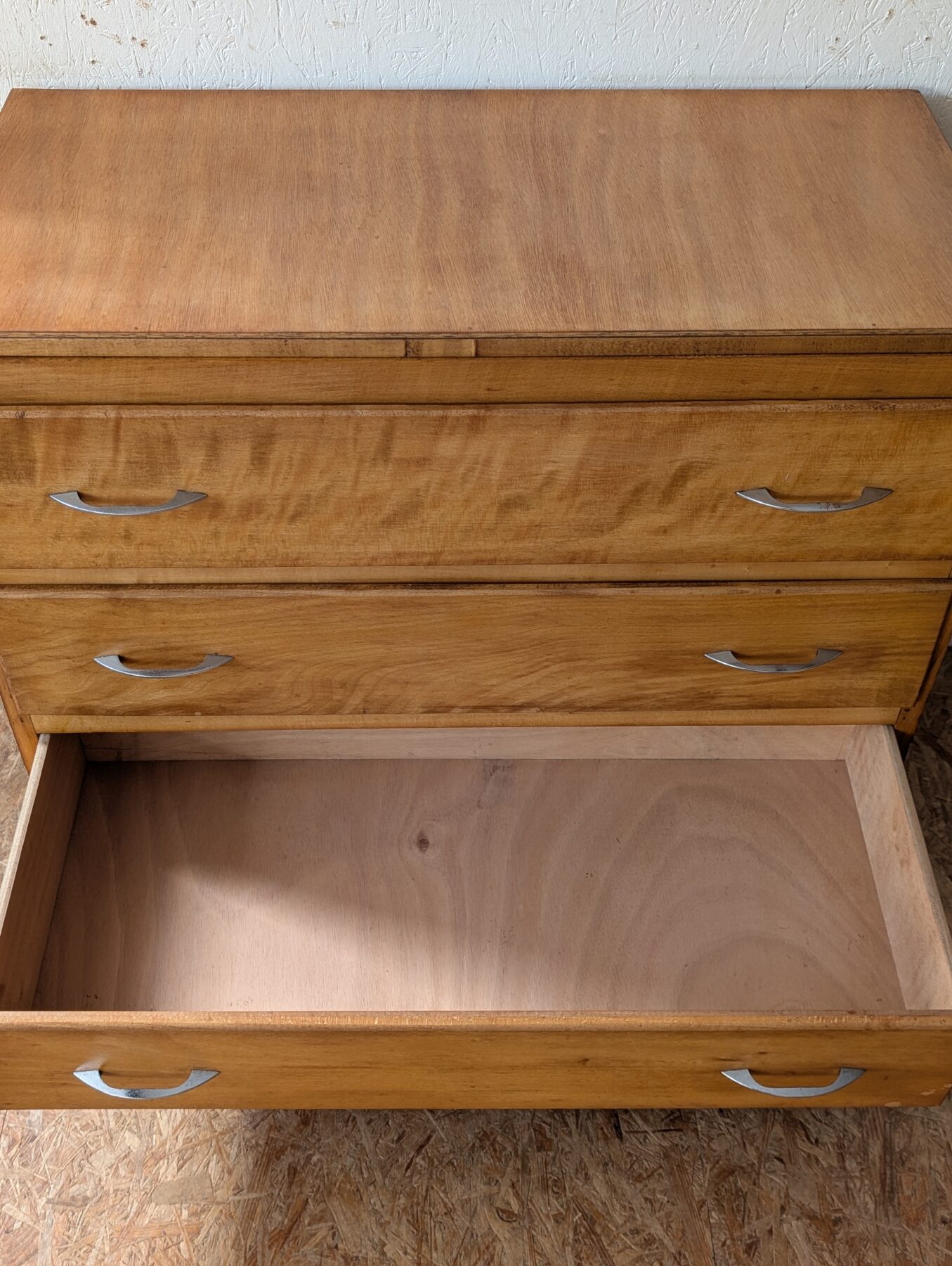 Commode vintage en placage hêtre avec 3 tiroirs.