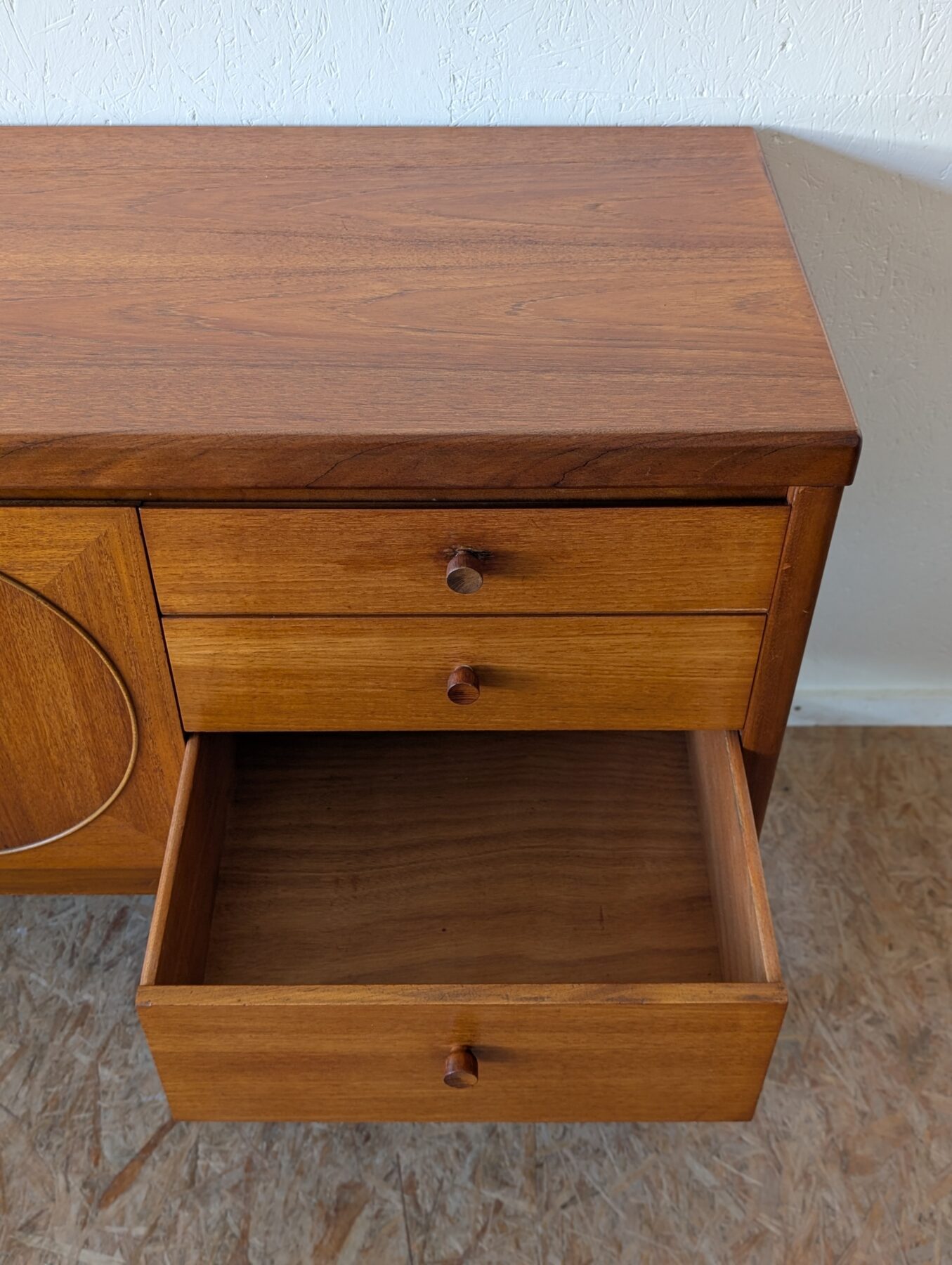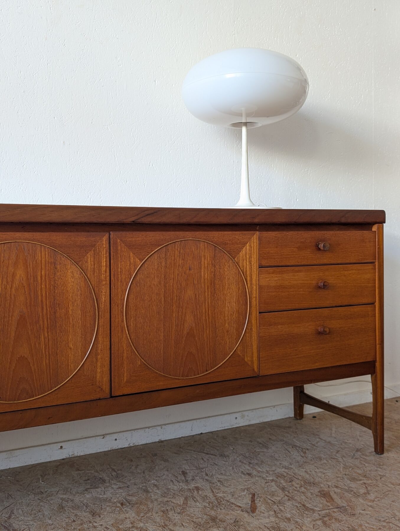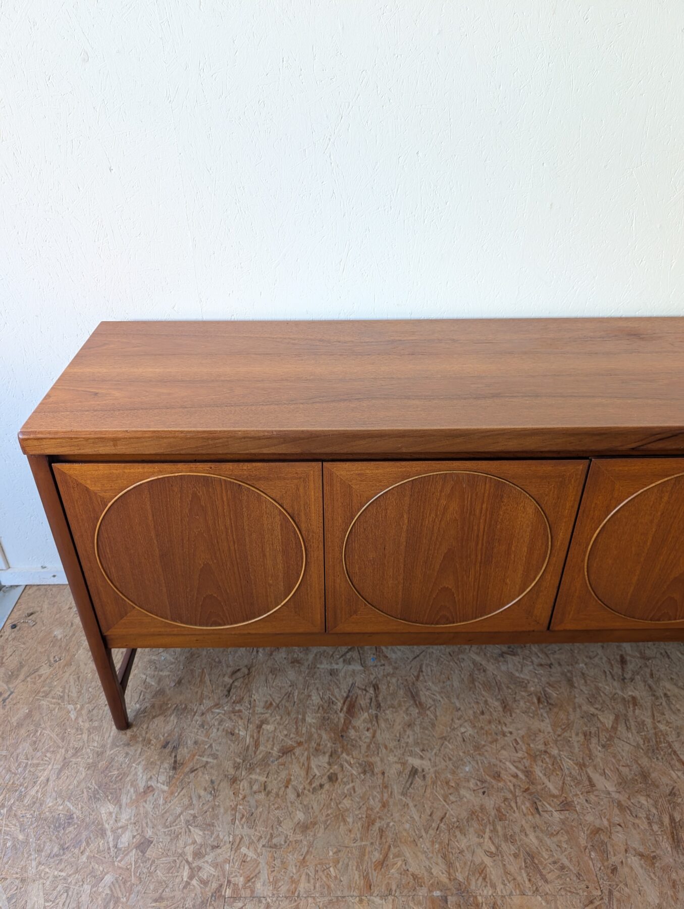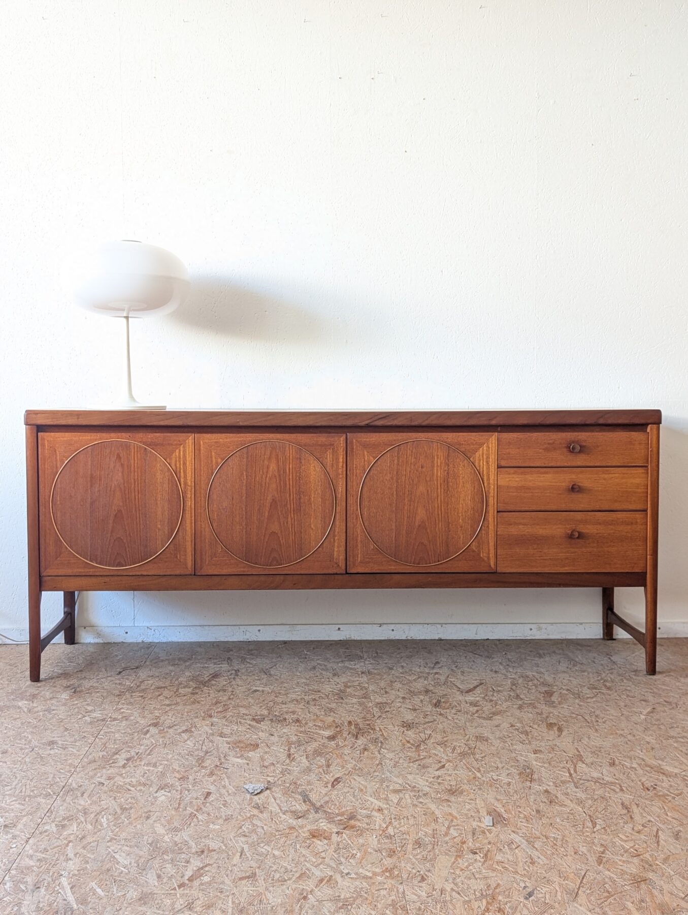 Enfilade teck Nathan « Circle » des années 60/70 comprenant 3 portes et 3 tiroirs.