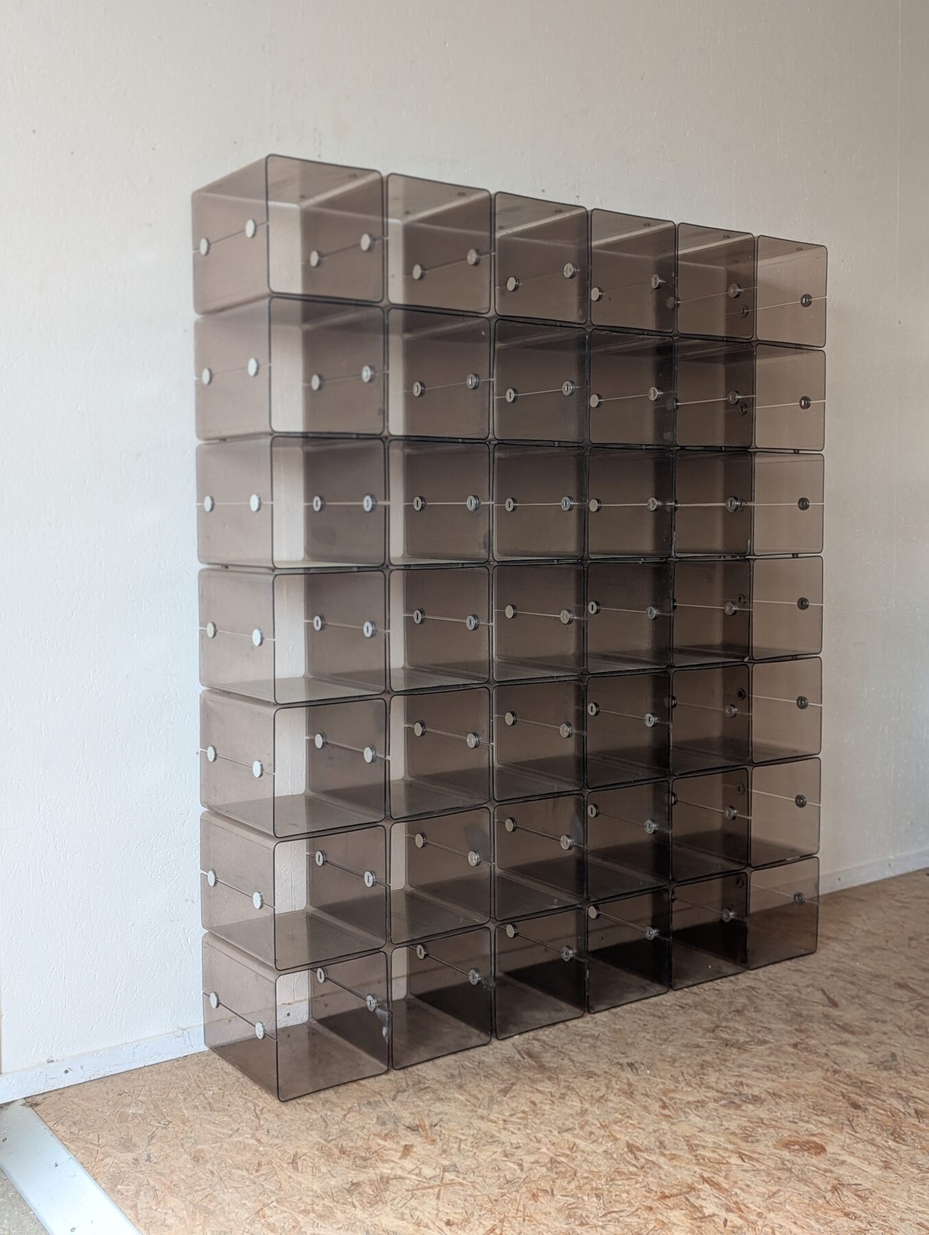 Ensemble de 42 cases en plexiglass fumé avec attaches en alu datant des années 70, toutes estampillées Made in Italy, Mestre Venezia. A moduler en fonction de vos envies.