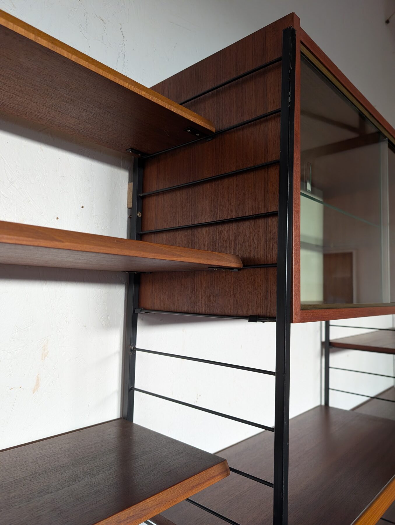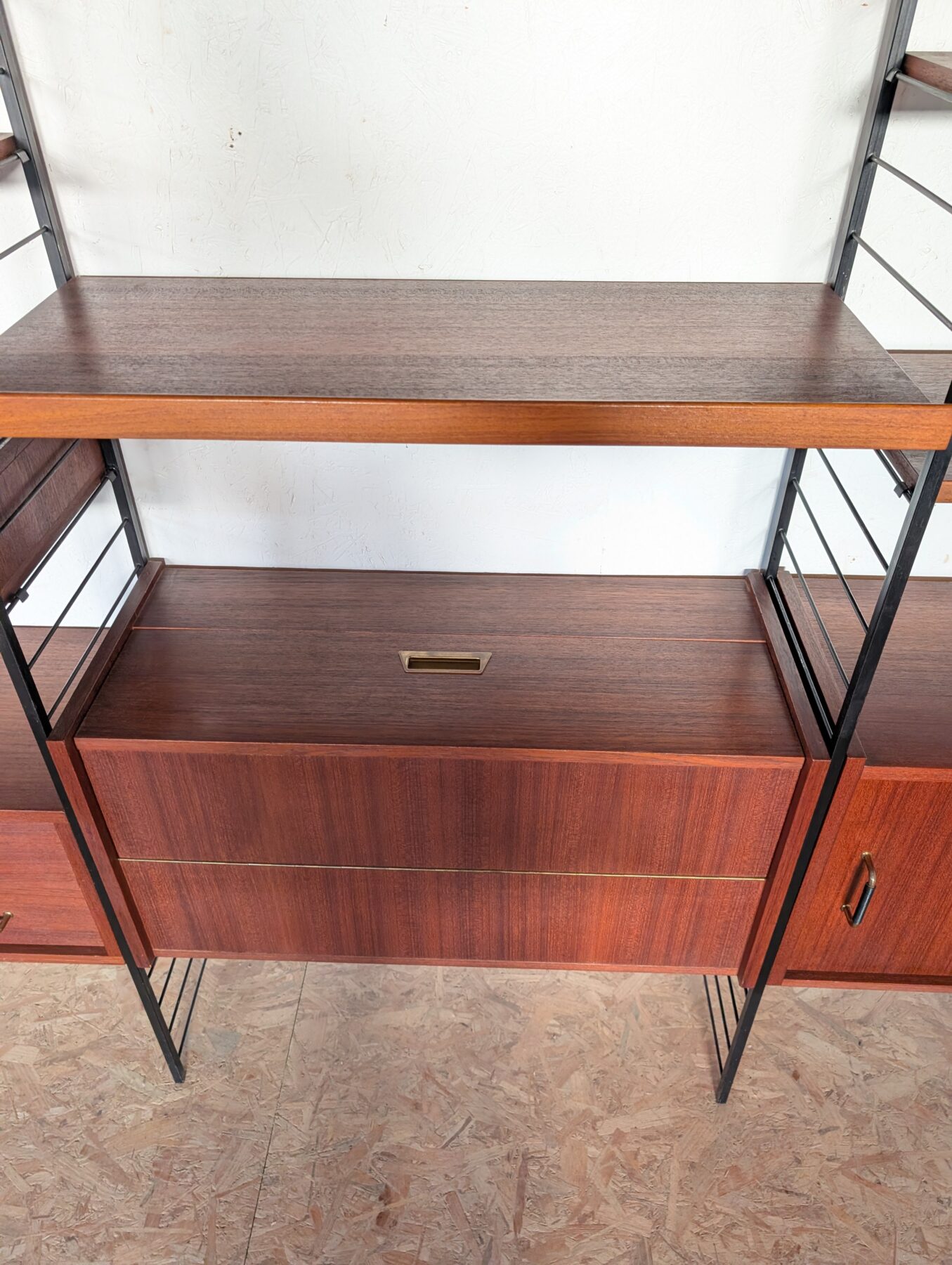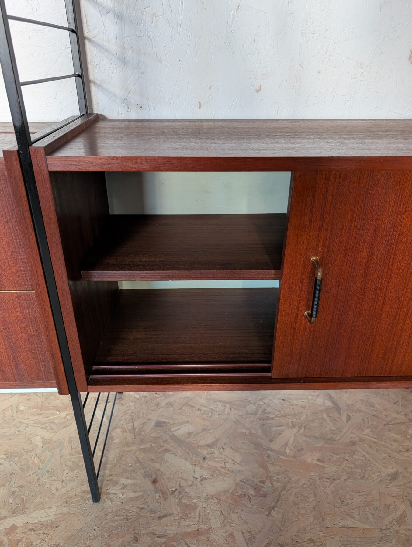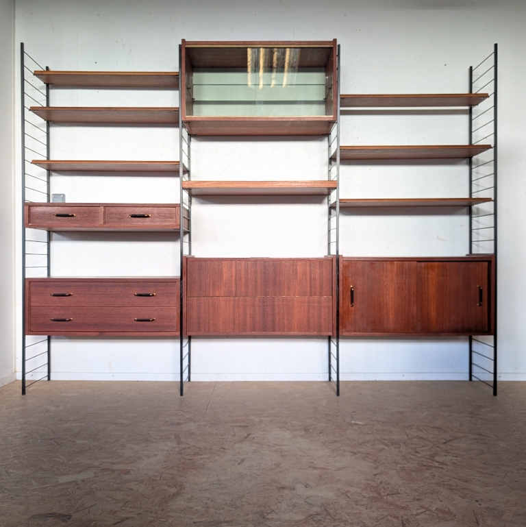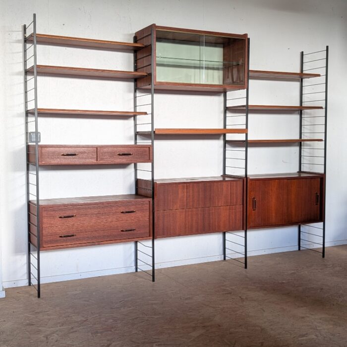 Ensemble mural teck des années 60 doté de 4 échelles métalliques noires, 7 étagères, un caisson 2 tiroirs, une commode 2 tiroirs, un bar, un caisson avec 2 portes coulissantes et un caisson avec vitrines.