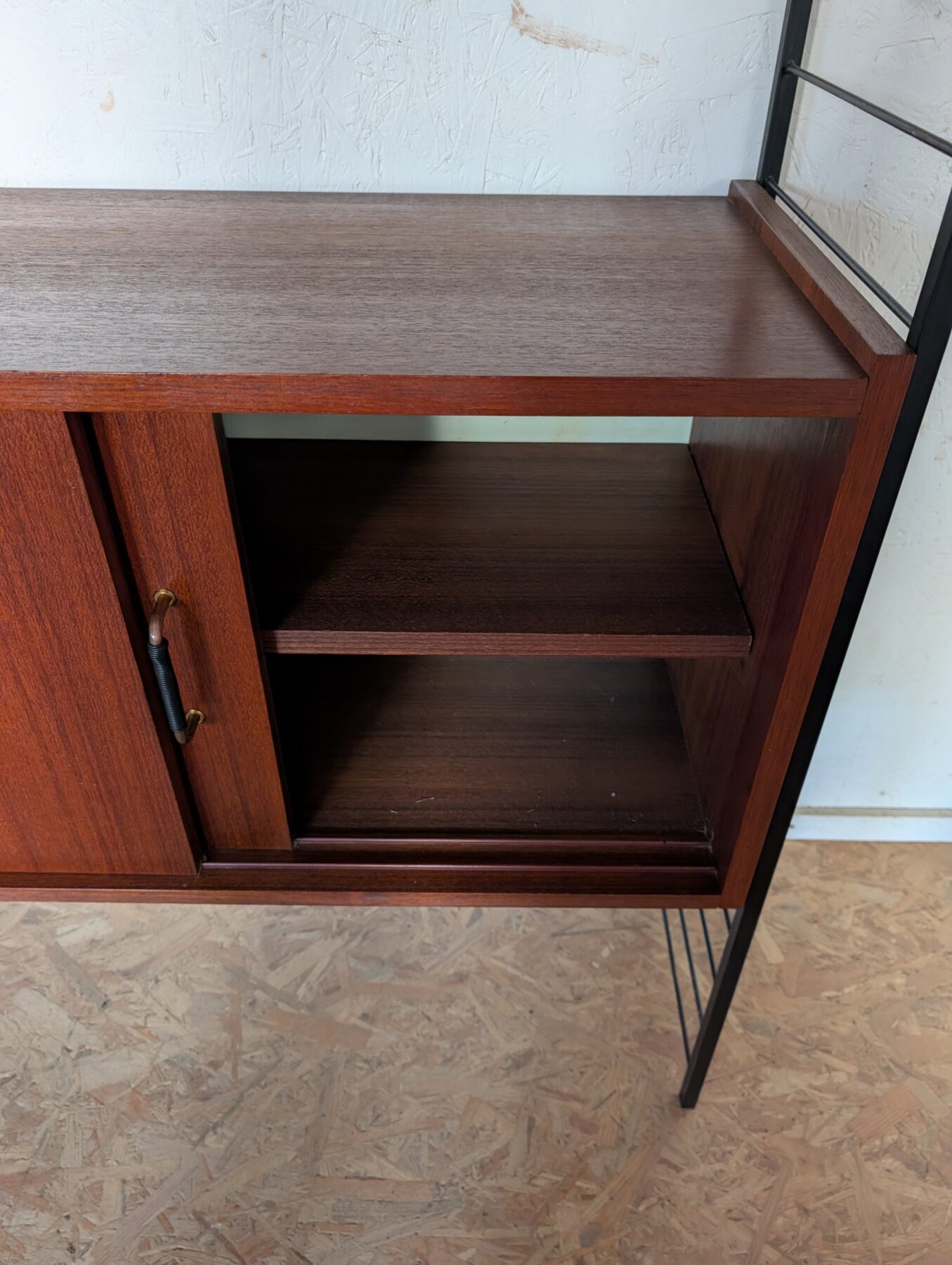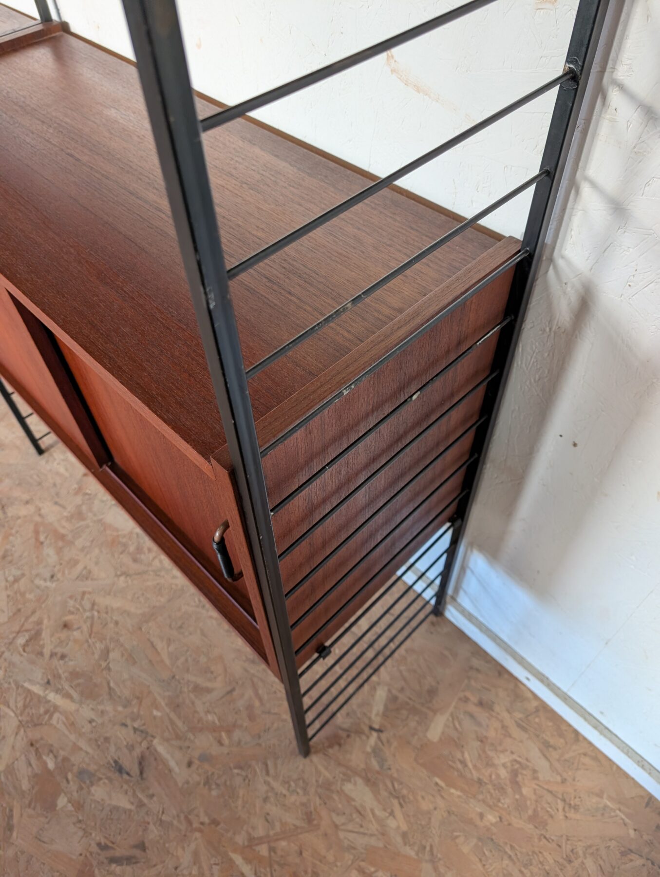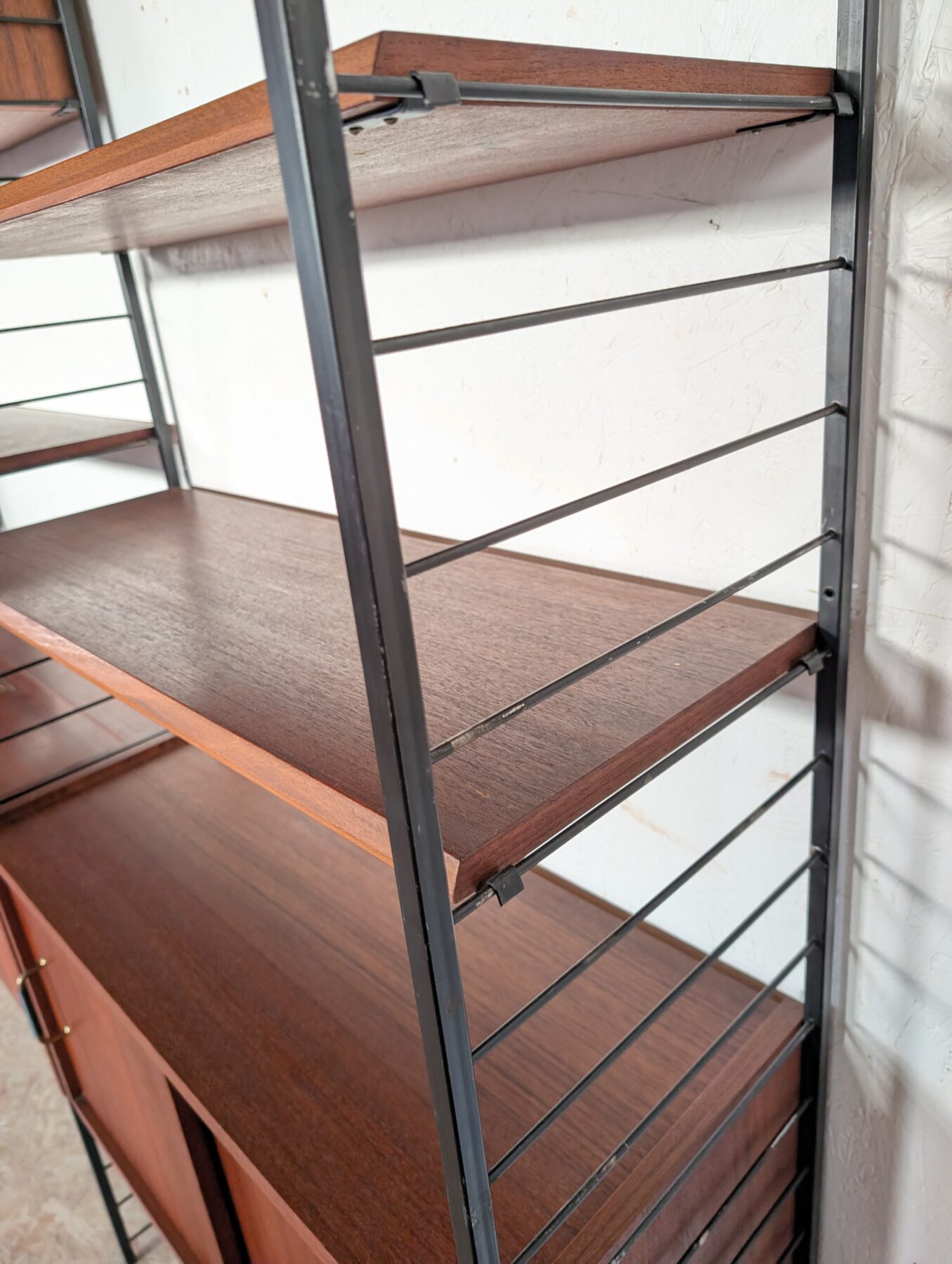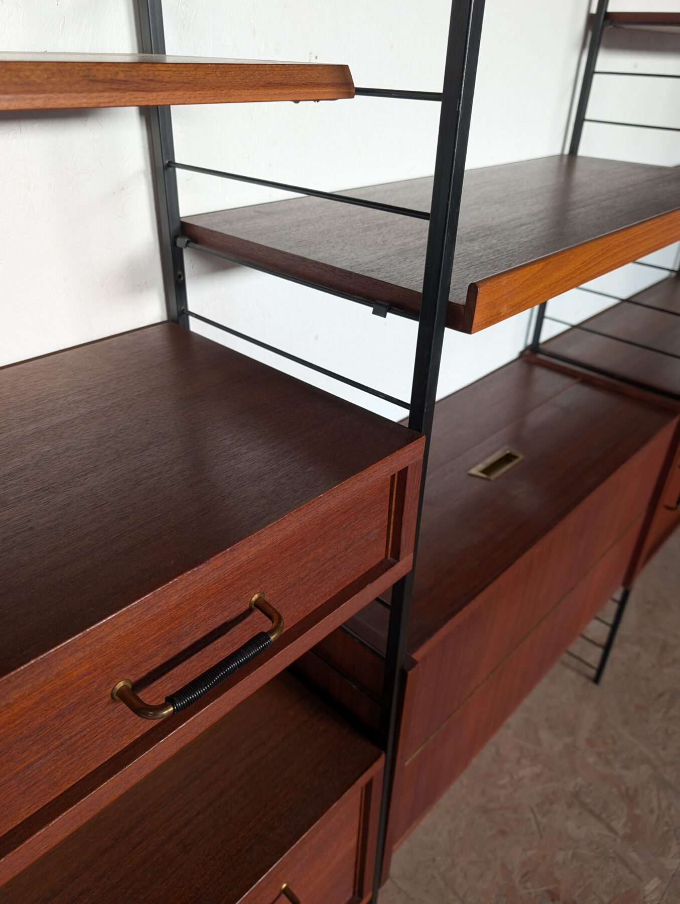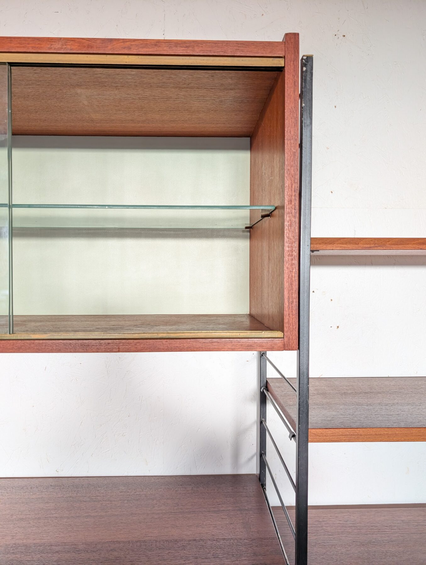 Ensemble mural teck des années 60 doté de 4 échelles métalliques noires, 7 étagères, un caisson 2 tiroirs, une commode 2 tiroirs, un bar, un caisson avec 2 portes coulissantes et un caisson avec vitrines.