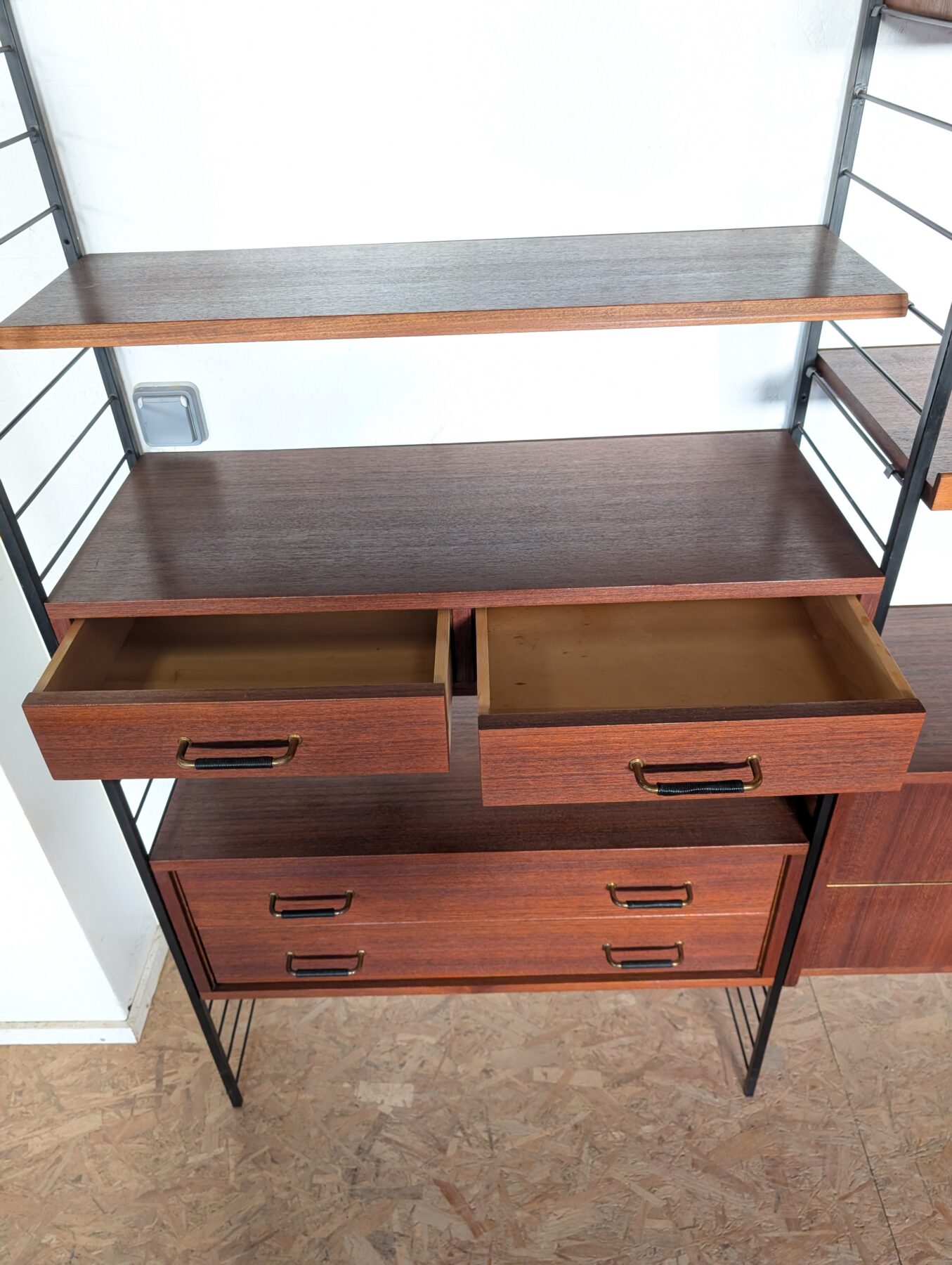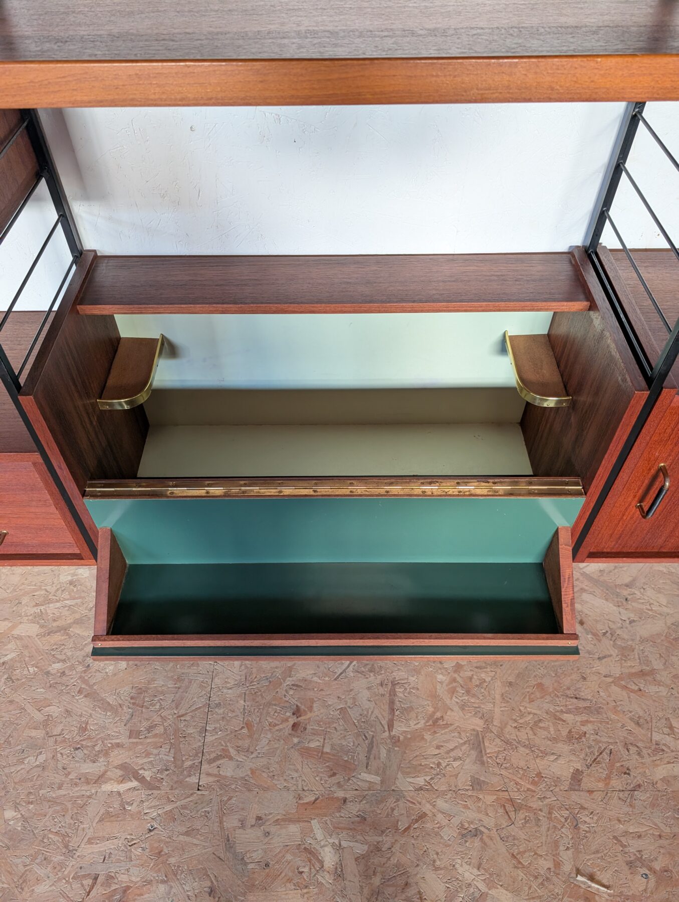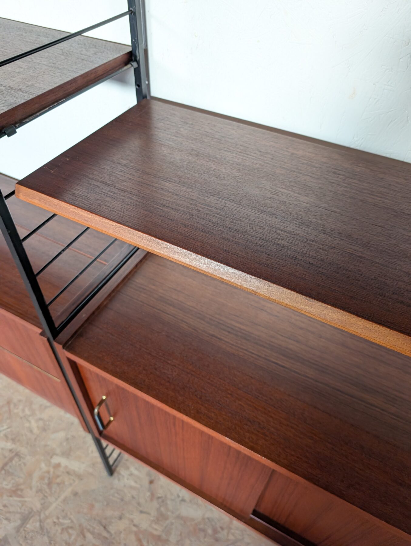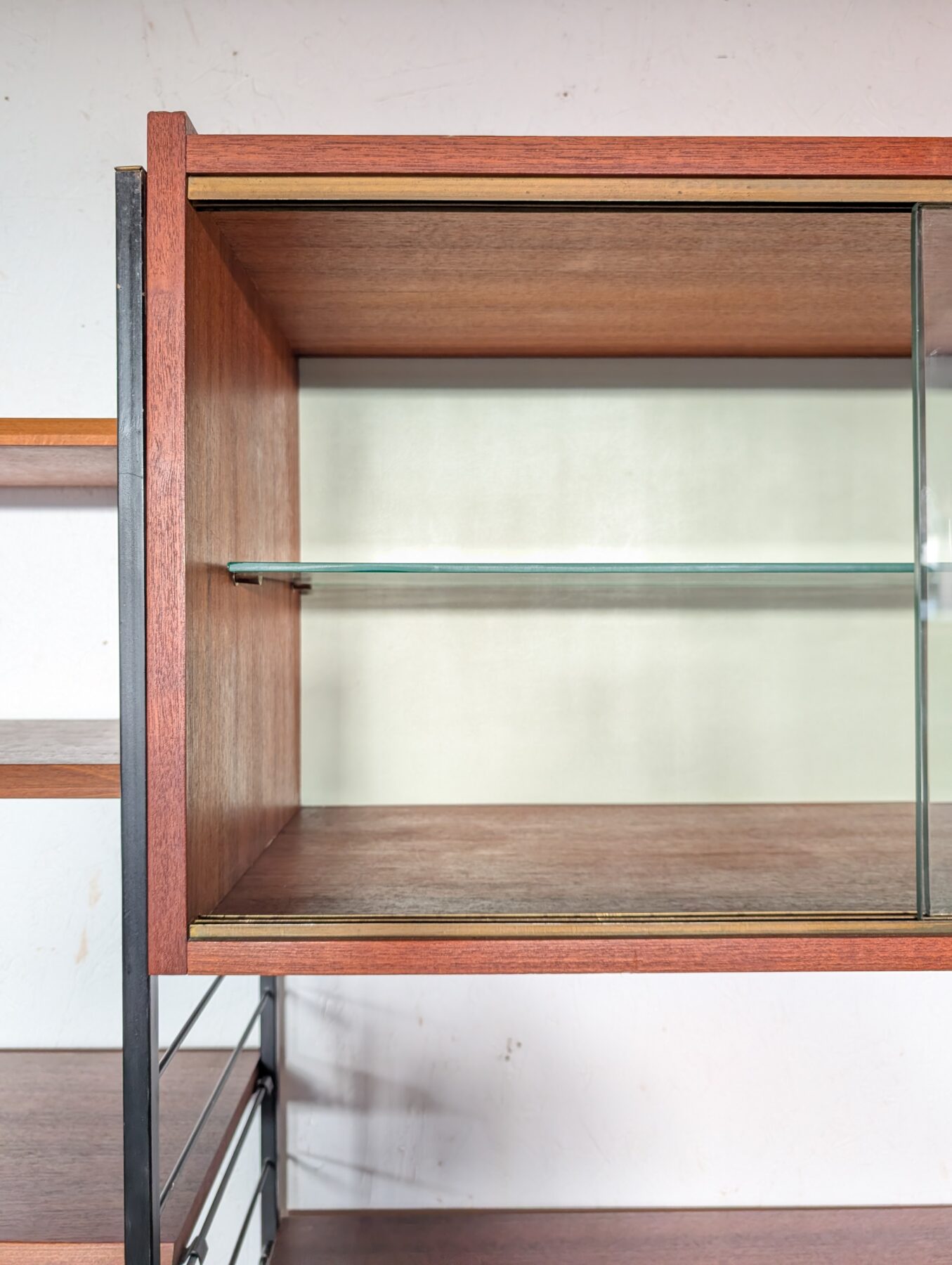 Ensemble mural teck des années 60 doté de 4 échelles métalliques noires, 7 étagères, un caisson 2 tiroirs, une commode 2 tiroirs, un bar, un caisson avec 2 portes coulissantes et un caisson avec vitrines.
