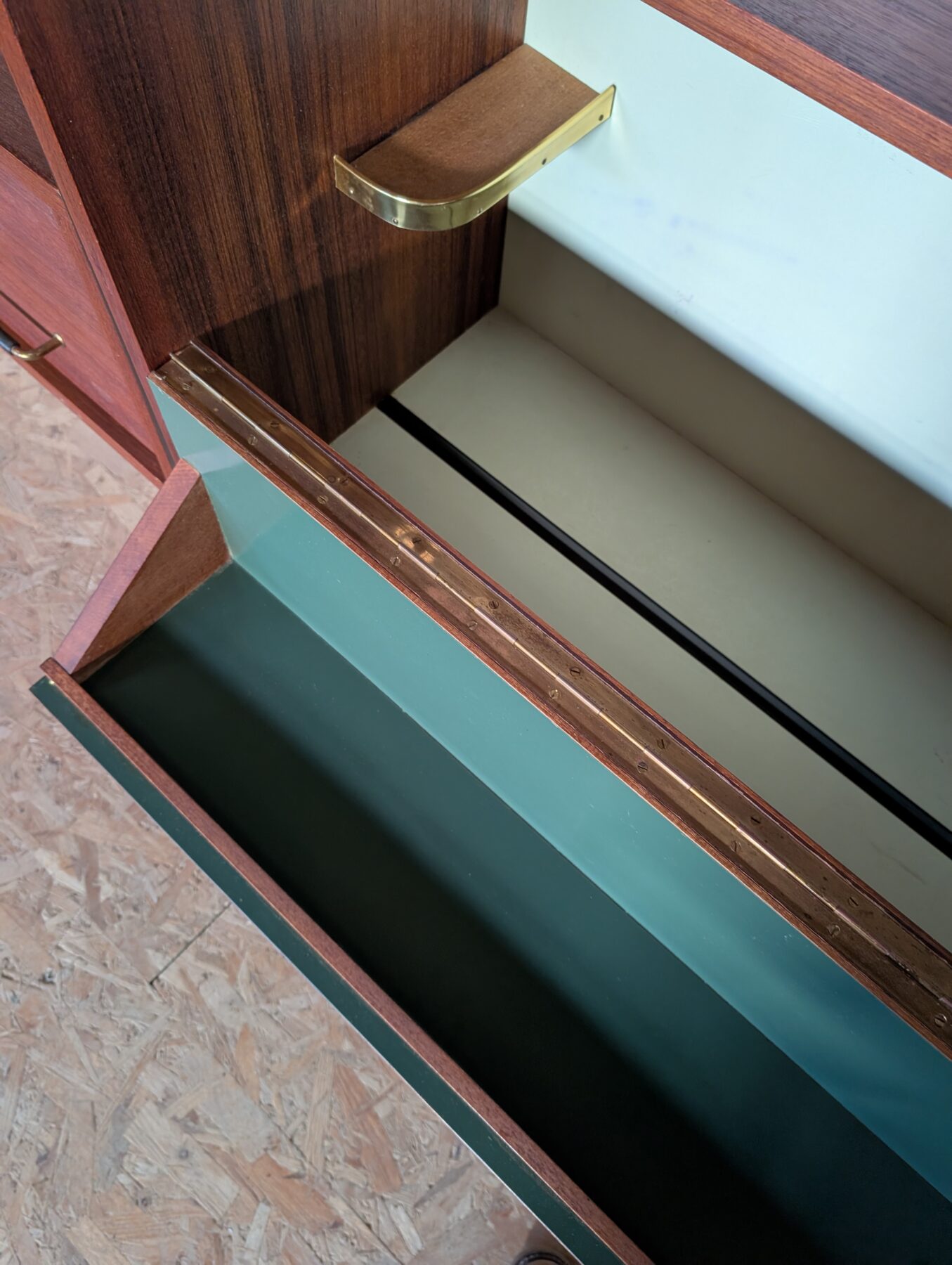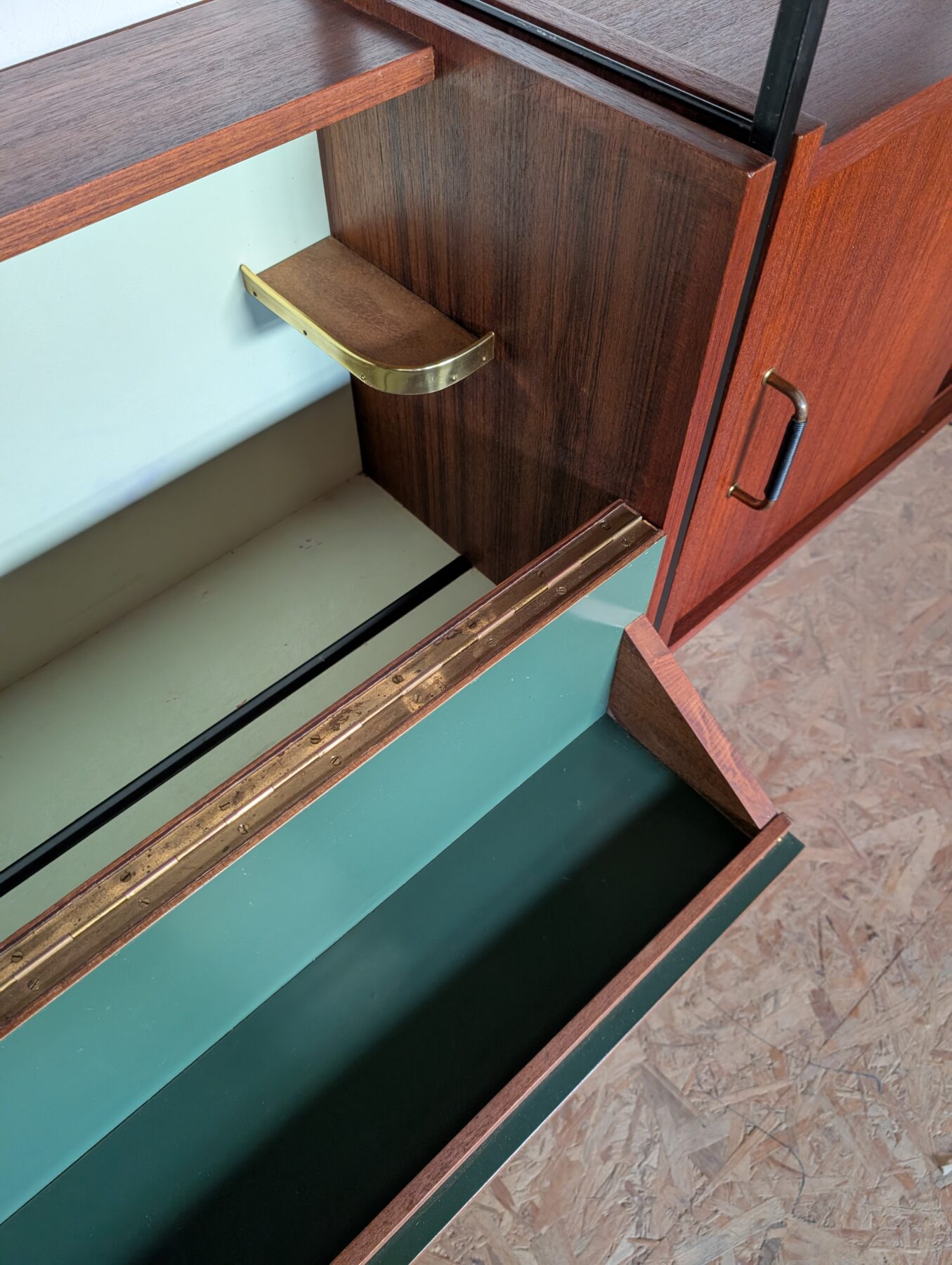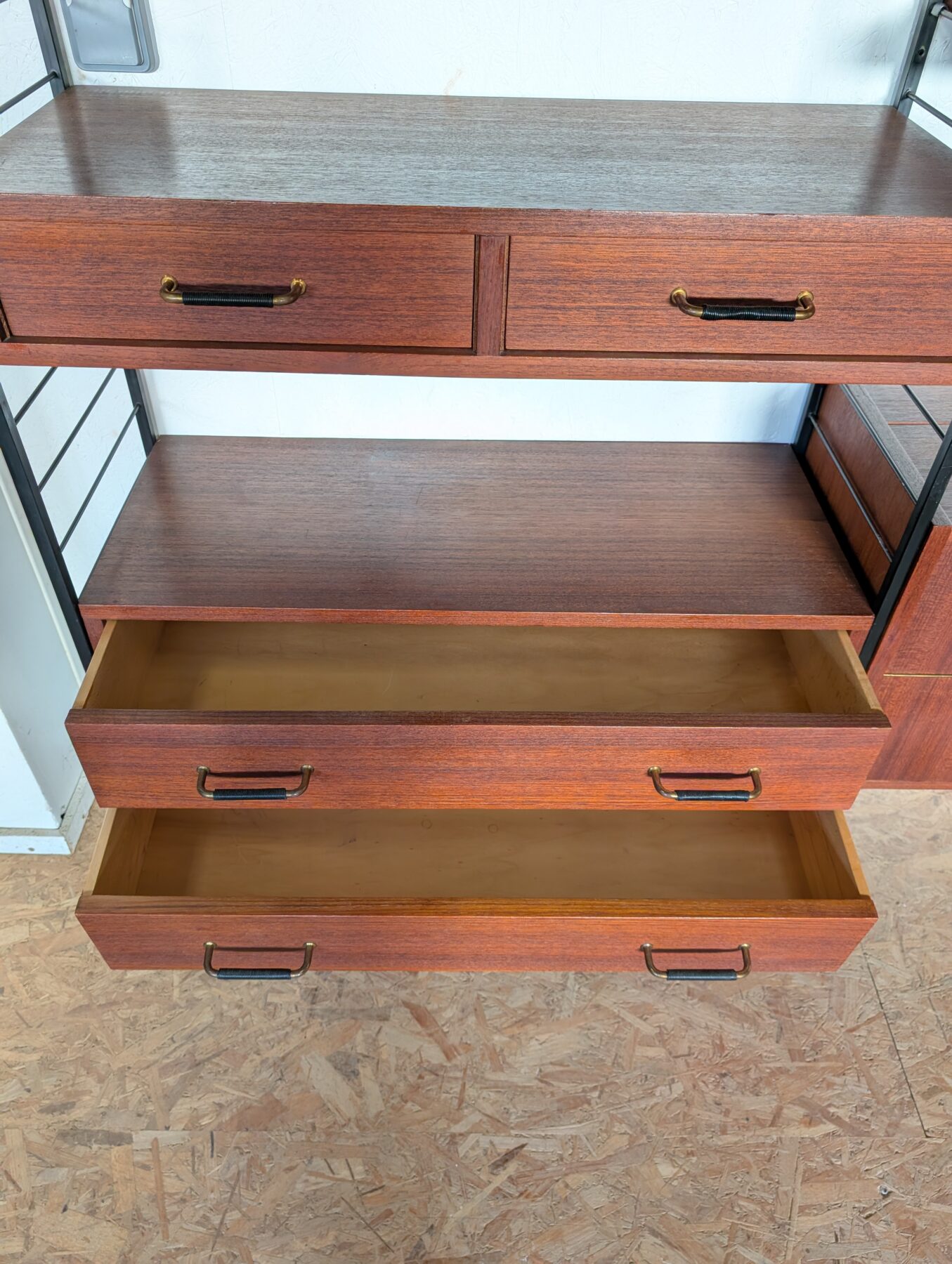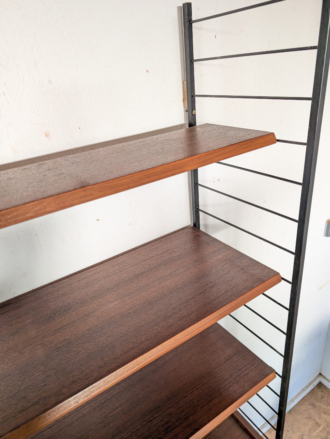 Ensemble mural teck des années 60 doté de 4 échelles métalliques noires, 7 étagères, un caisson 2 tiroirs, une commode 2 tiroirs, un bar, un caisson avec 2 portes coulissantes et un caisson avec vitrines.