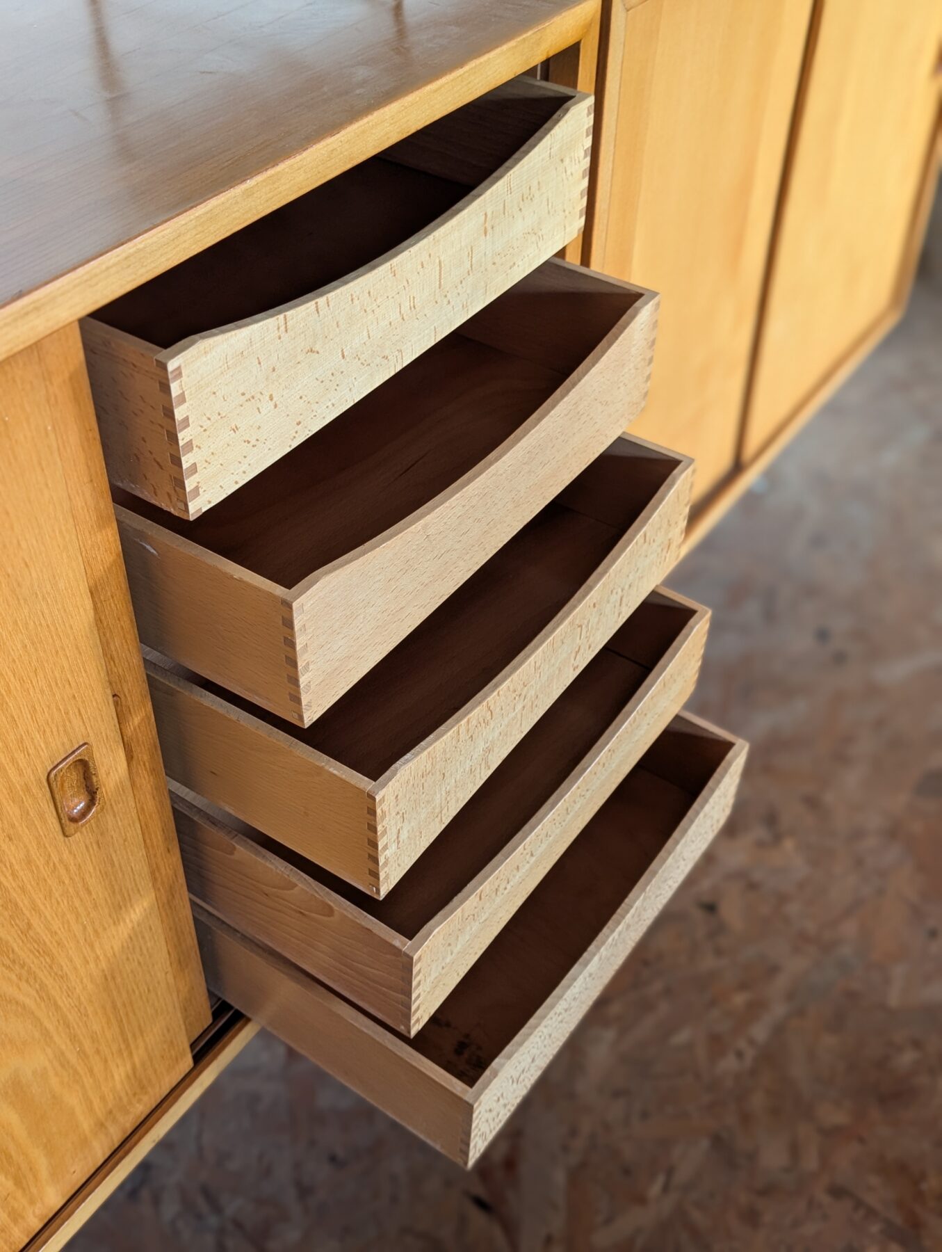 Il est composé de 5 étagères, 3 caissons avec 2 portes coulissantes, un caisson avec 3 portes coulissantes ouvrant sur étagères et 5 tiroirs ainsi que d’un range revues et 7 échelles métalliques noires.