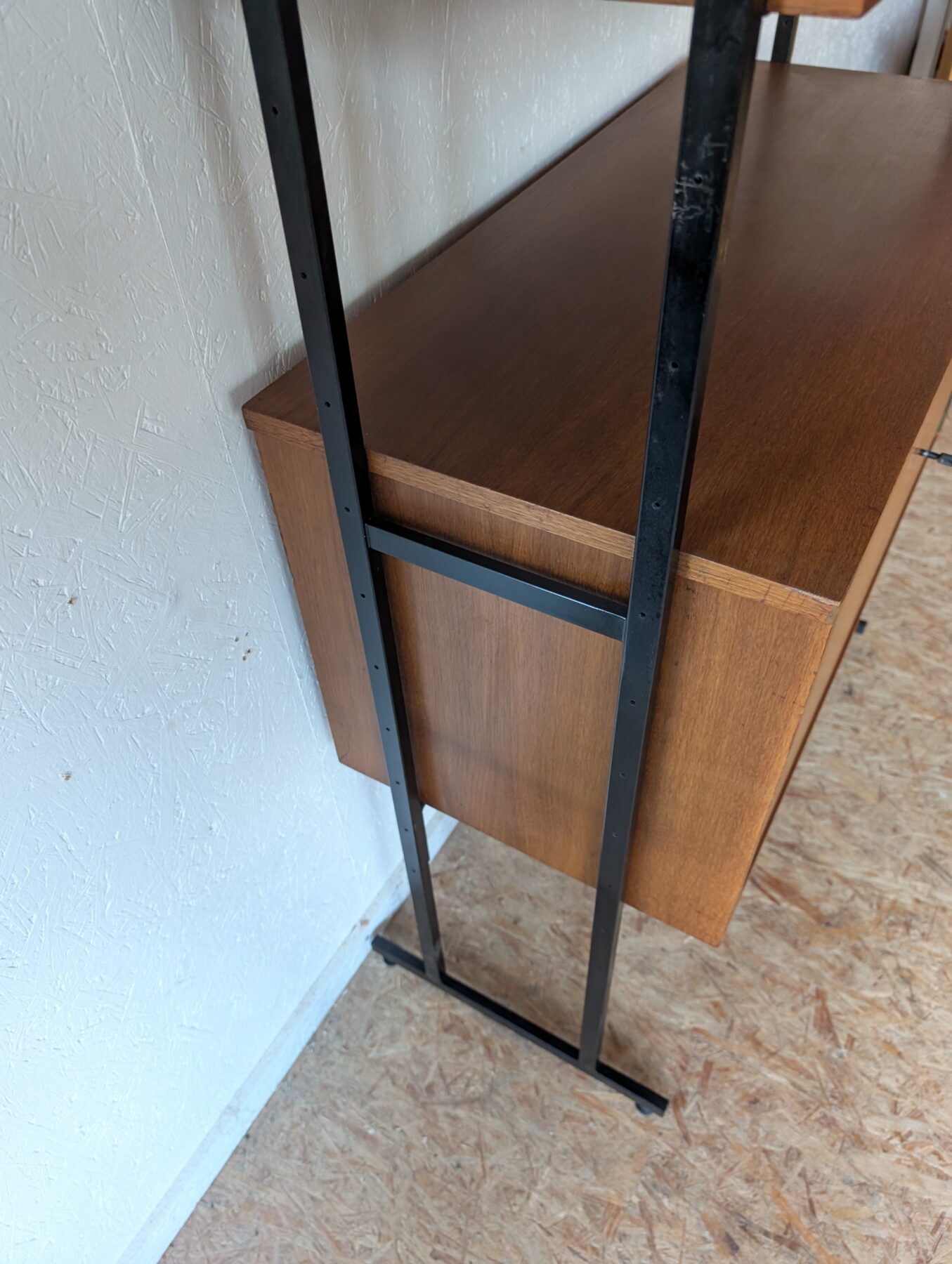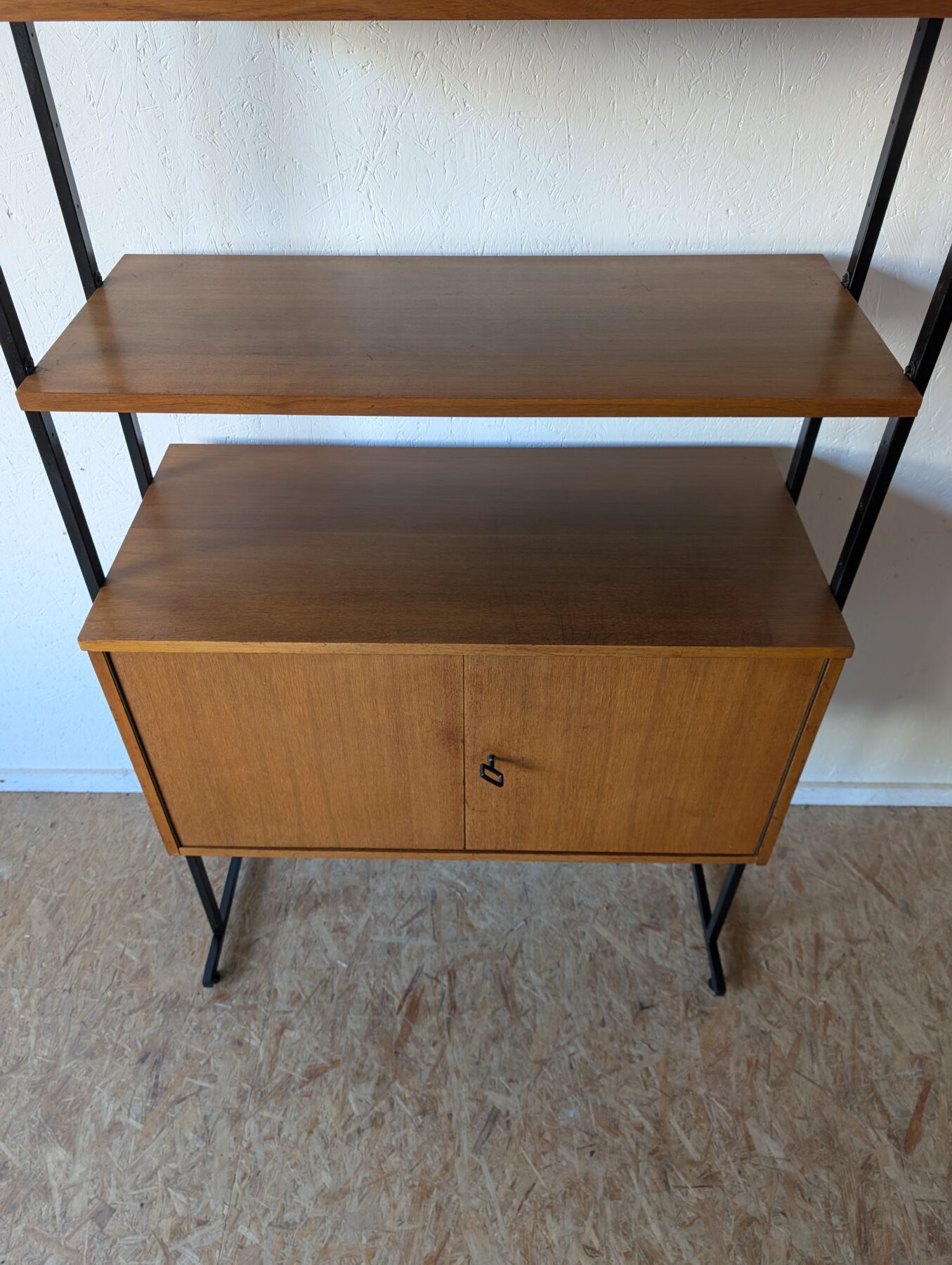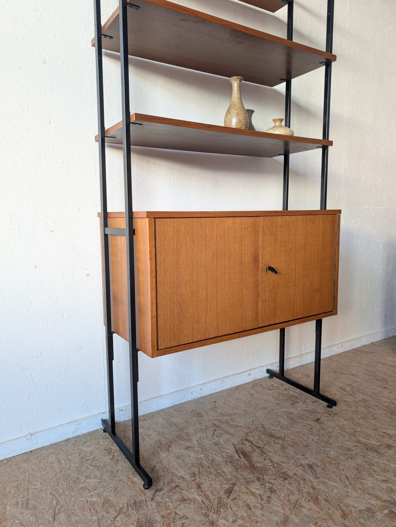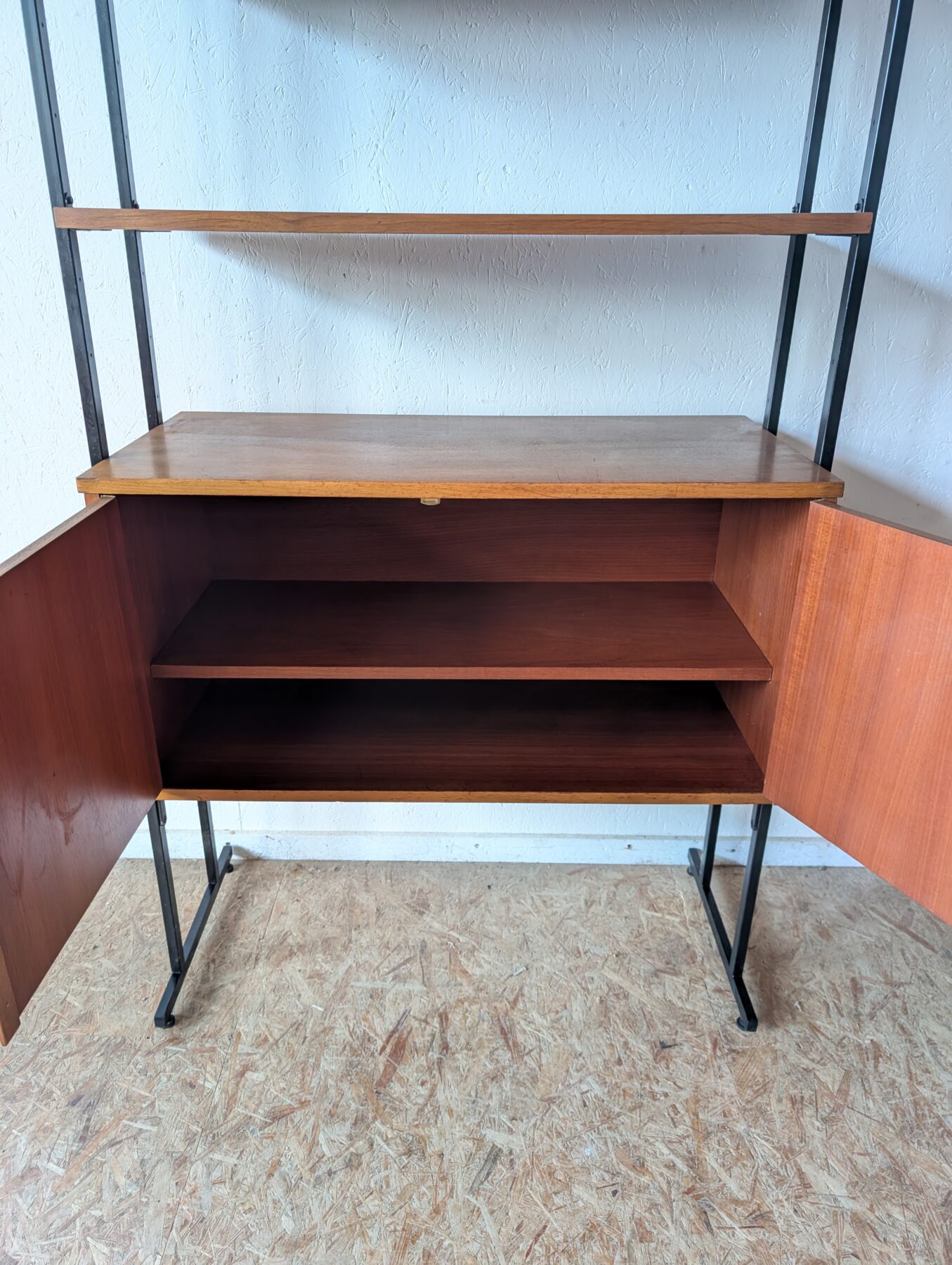 Ensemble mural modulable des années 60 avec 2 montants métalliques noirs, 3 étagères et un placard teck avec 2 portes.