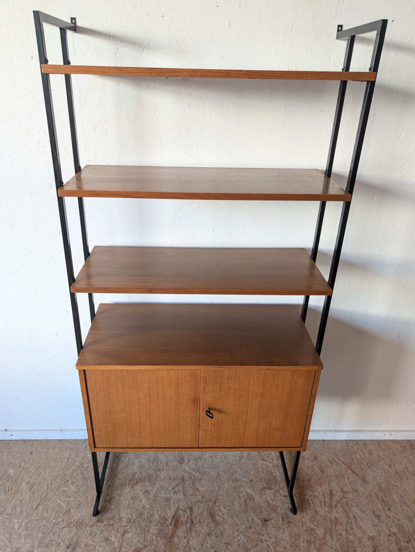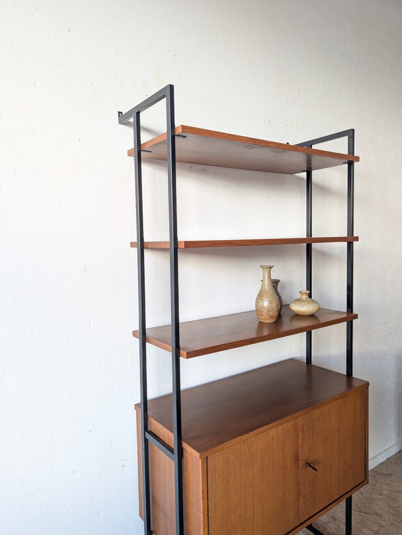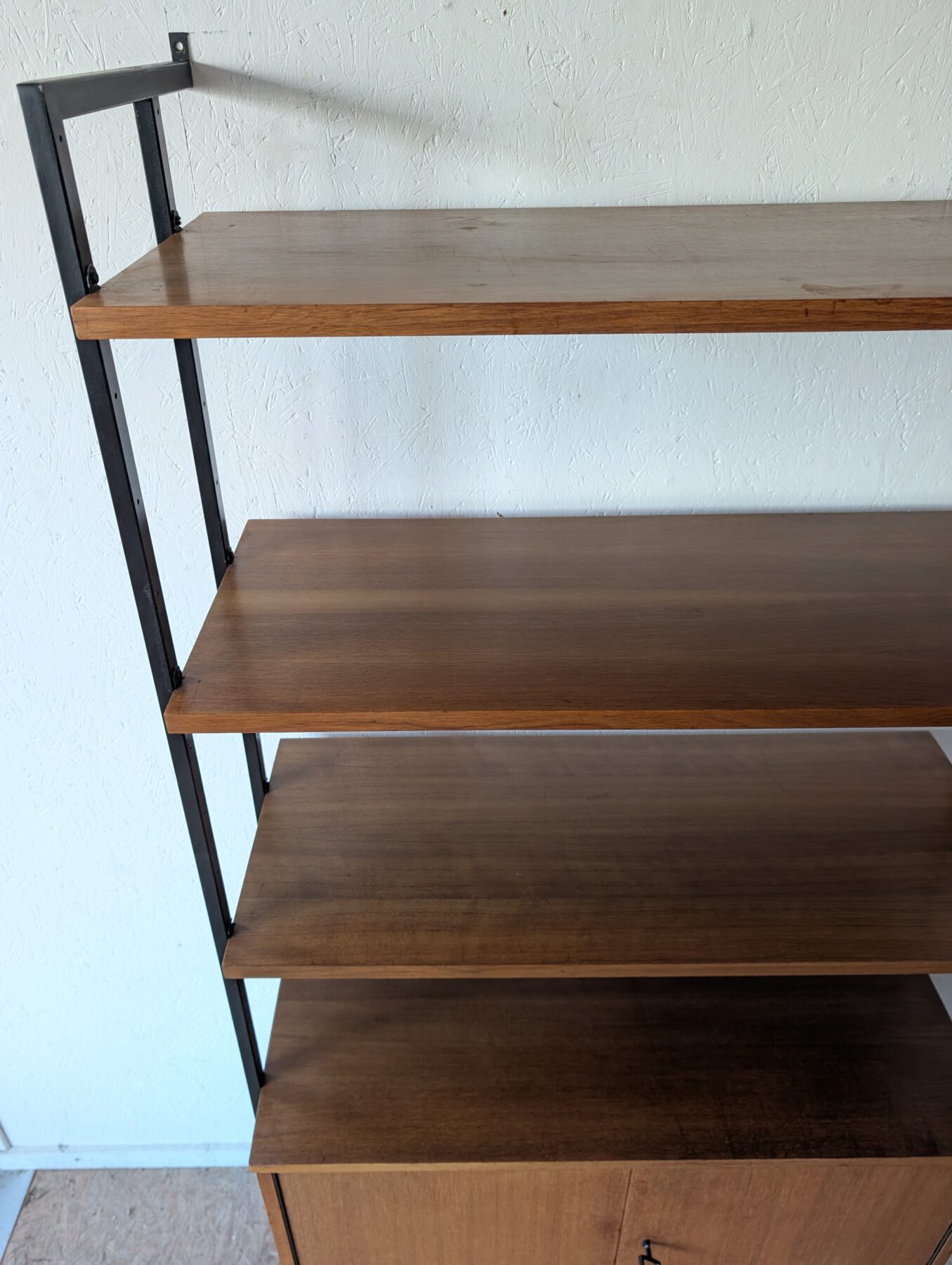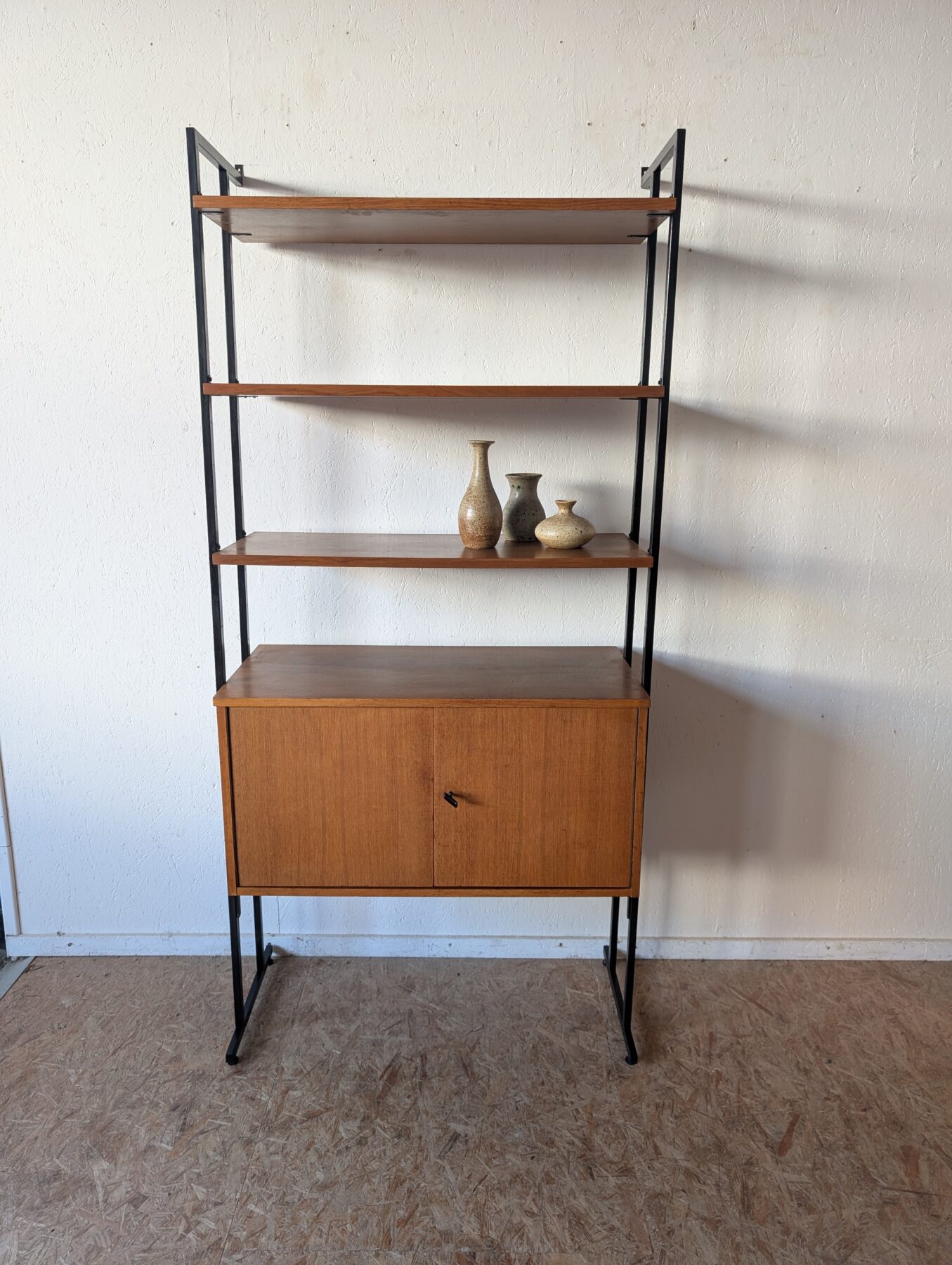 Ensemble mural modulable des années 60 avec 2 montants métalliques noirs, 3 étagères et un placard teck avec 2 portes.