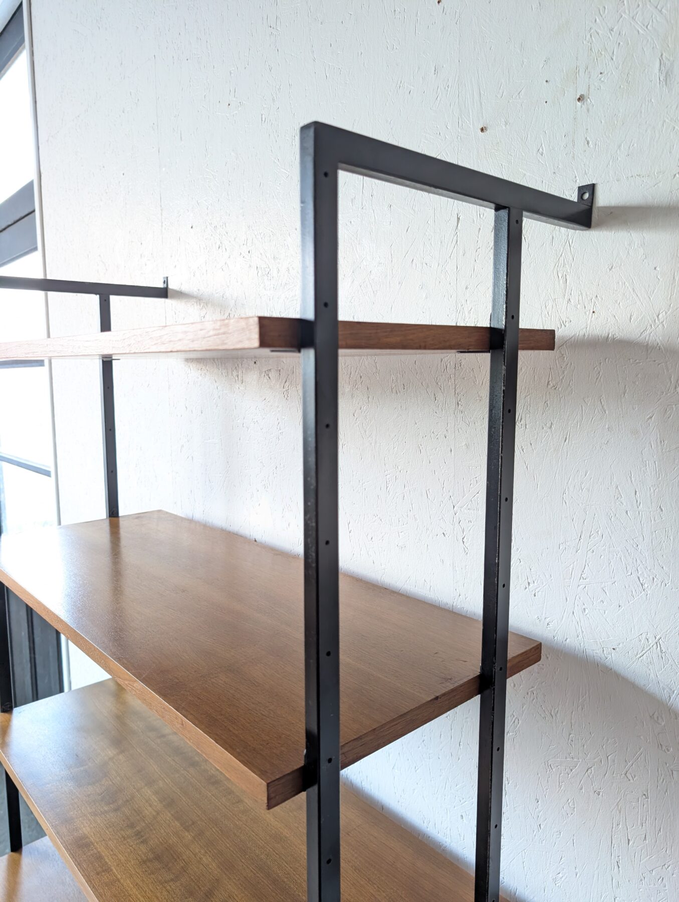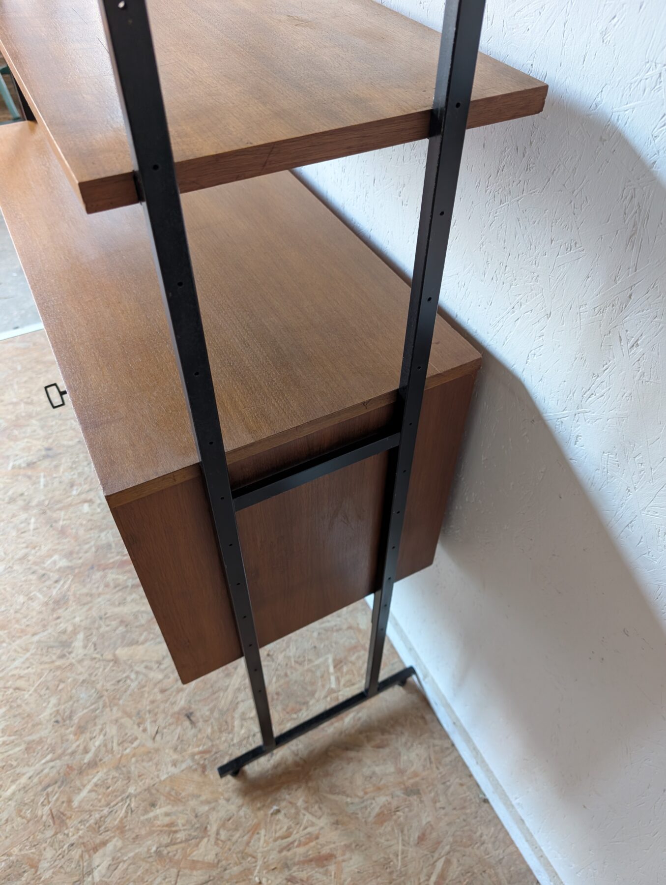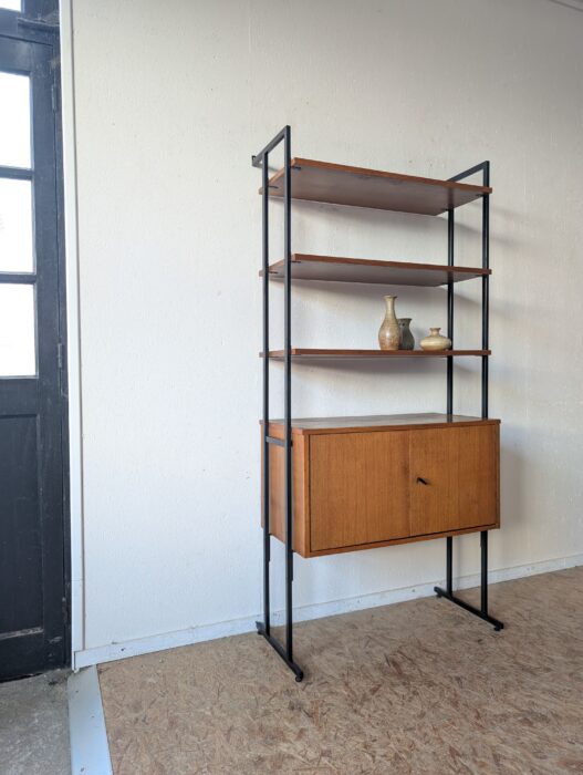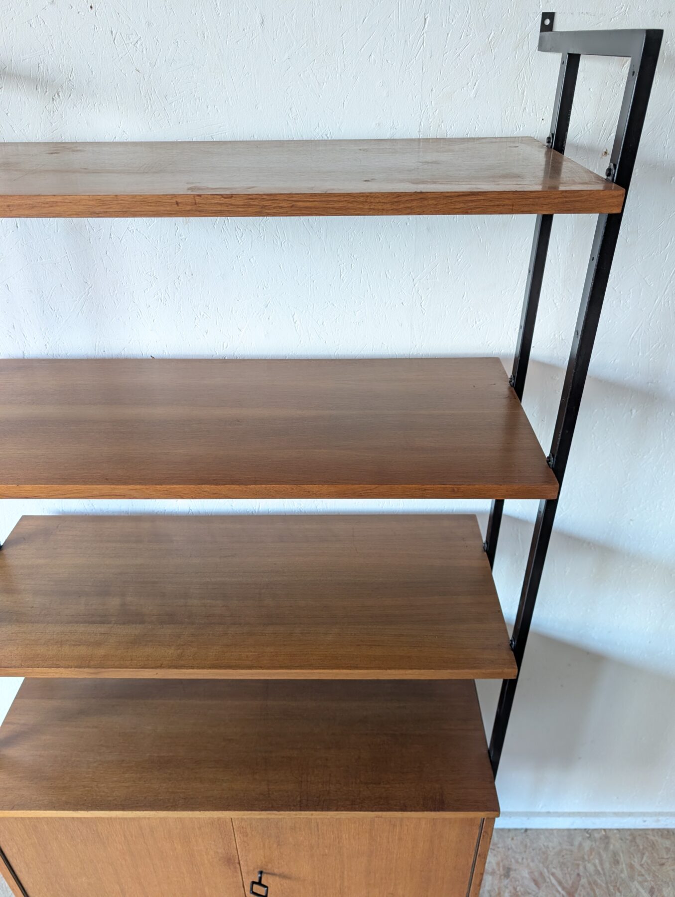 Ensemble mural modulable des années 60 avec 2 montants métalliques noirs, 3 étagères et un placard teck avec 2 portes.