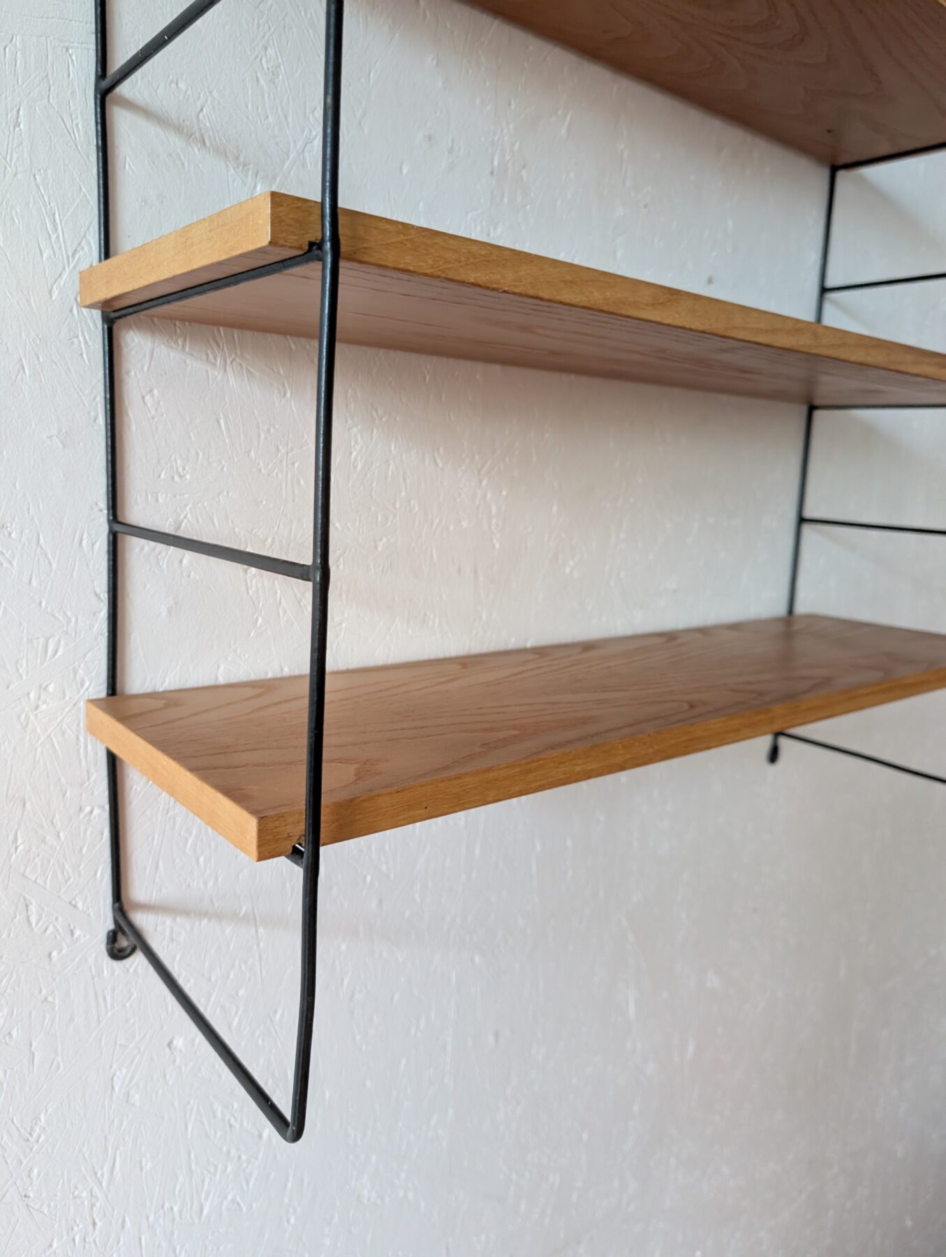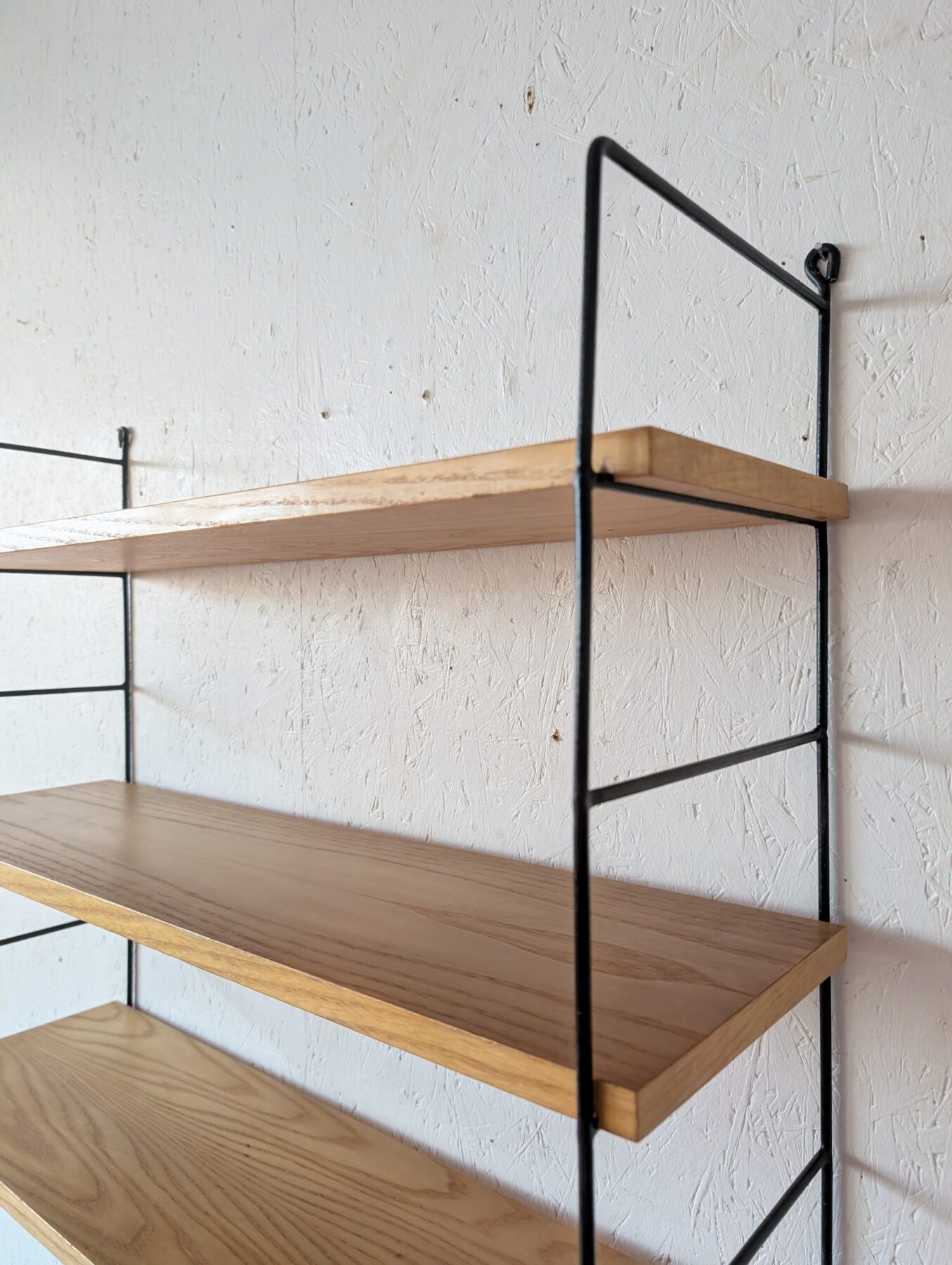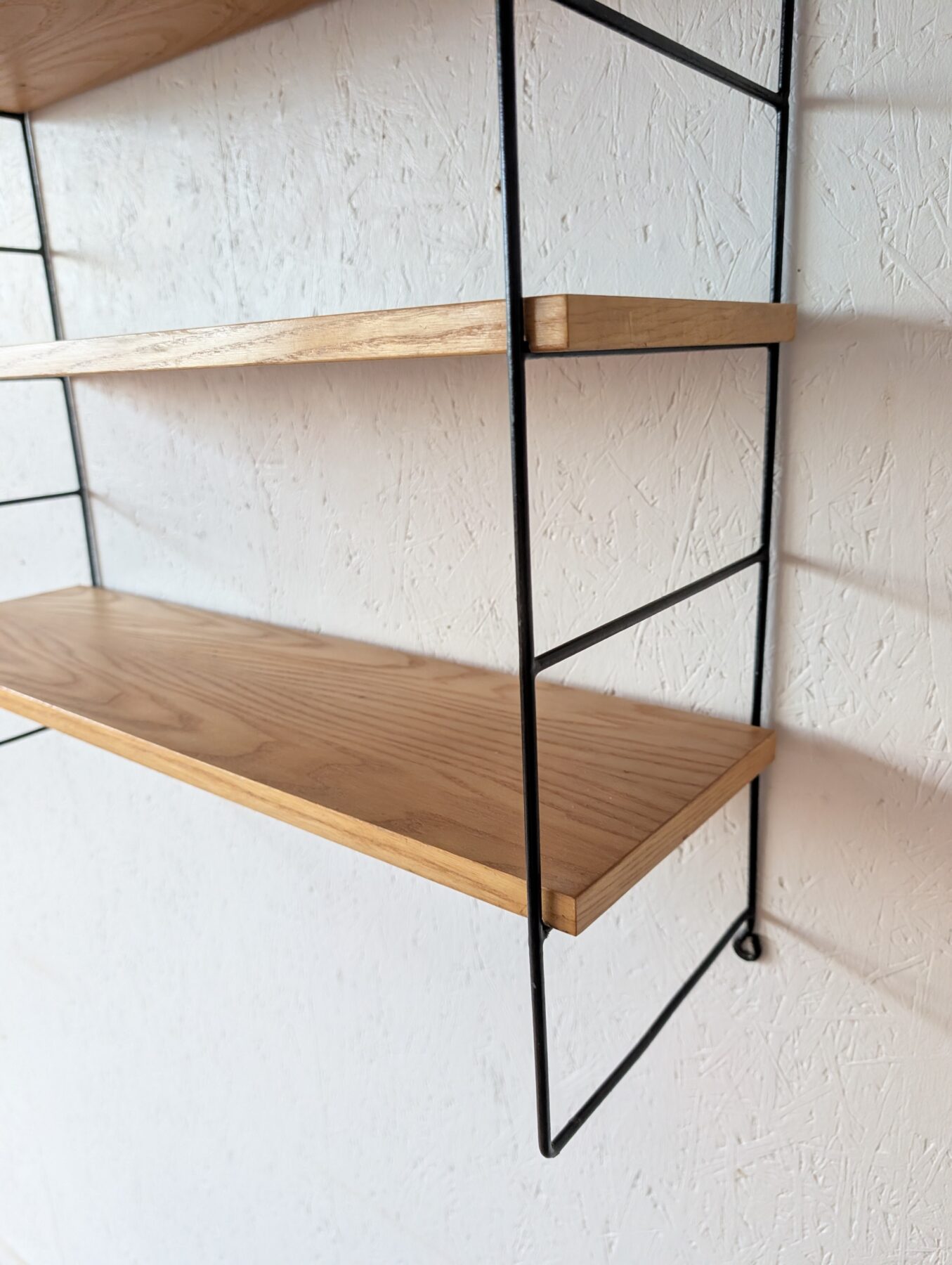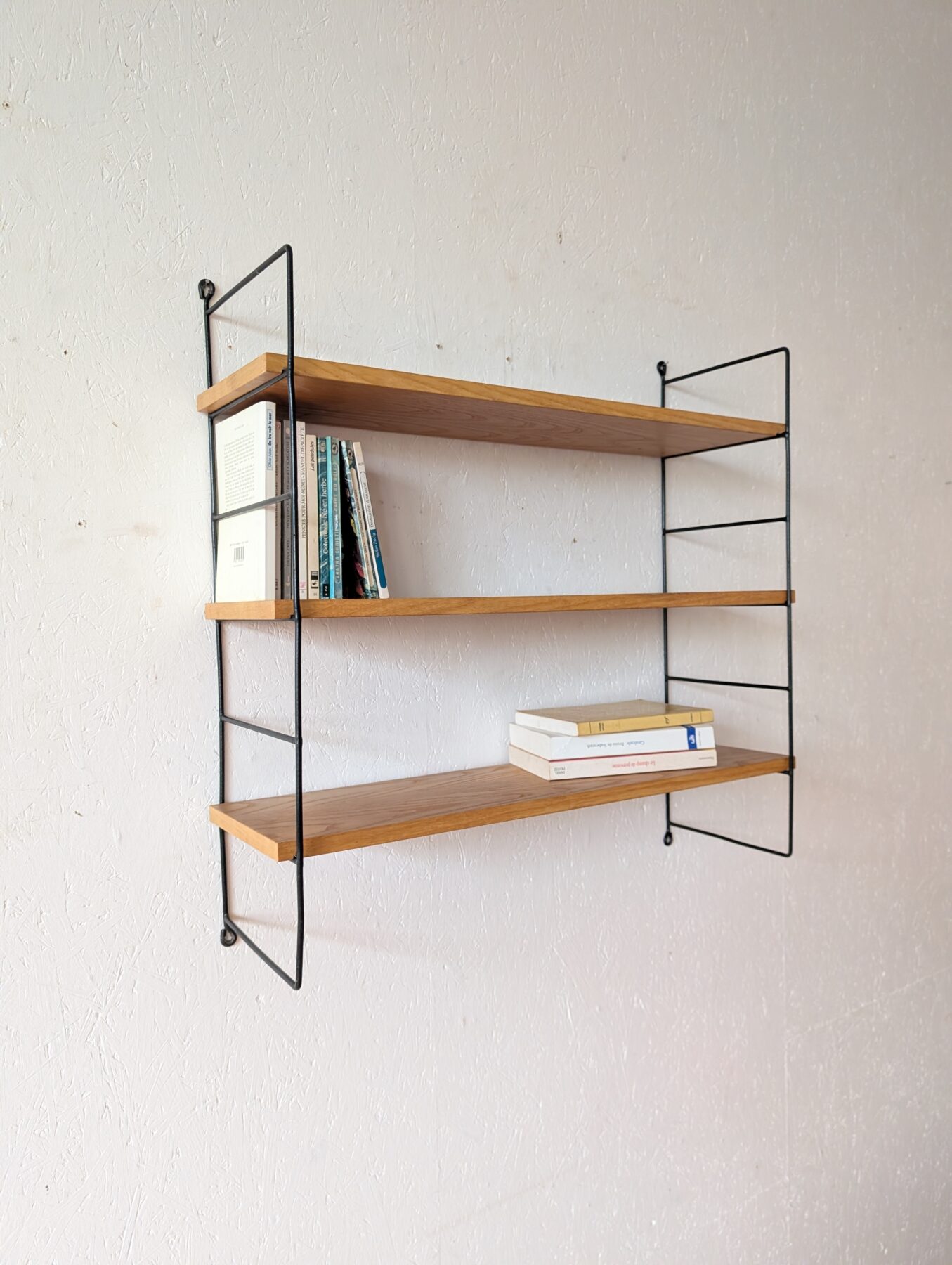 Etagère murale vintage avec 3 tablettes chêne clair et 2 échelles métalliques noires.