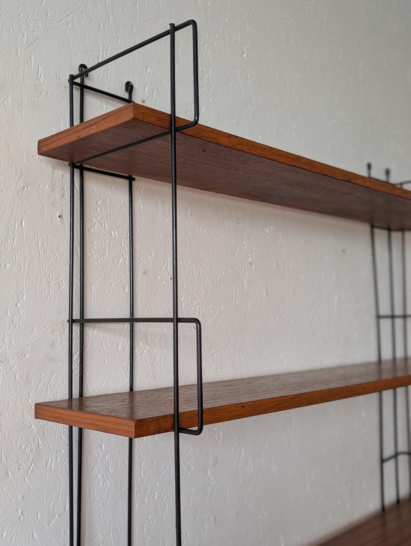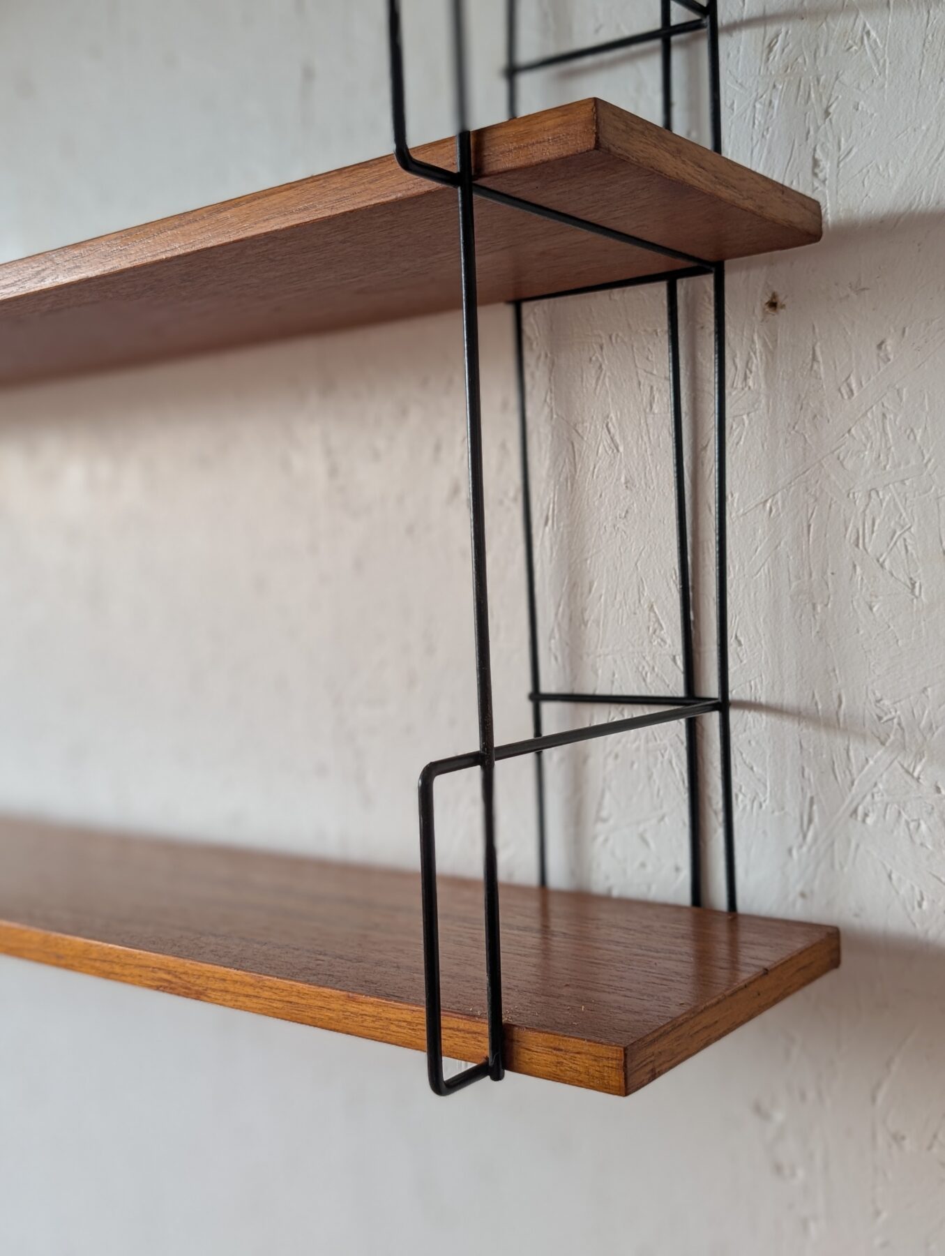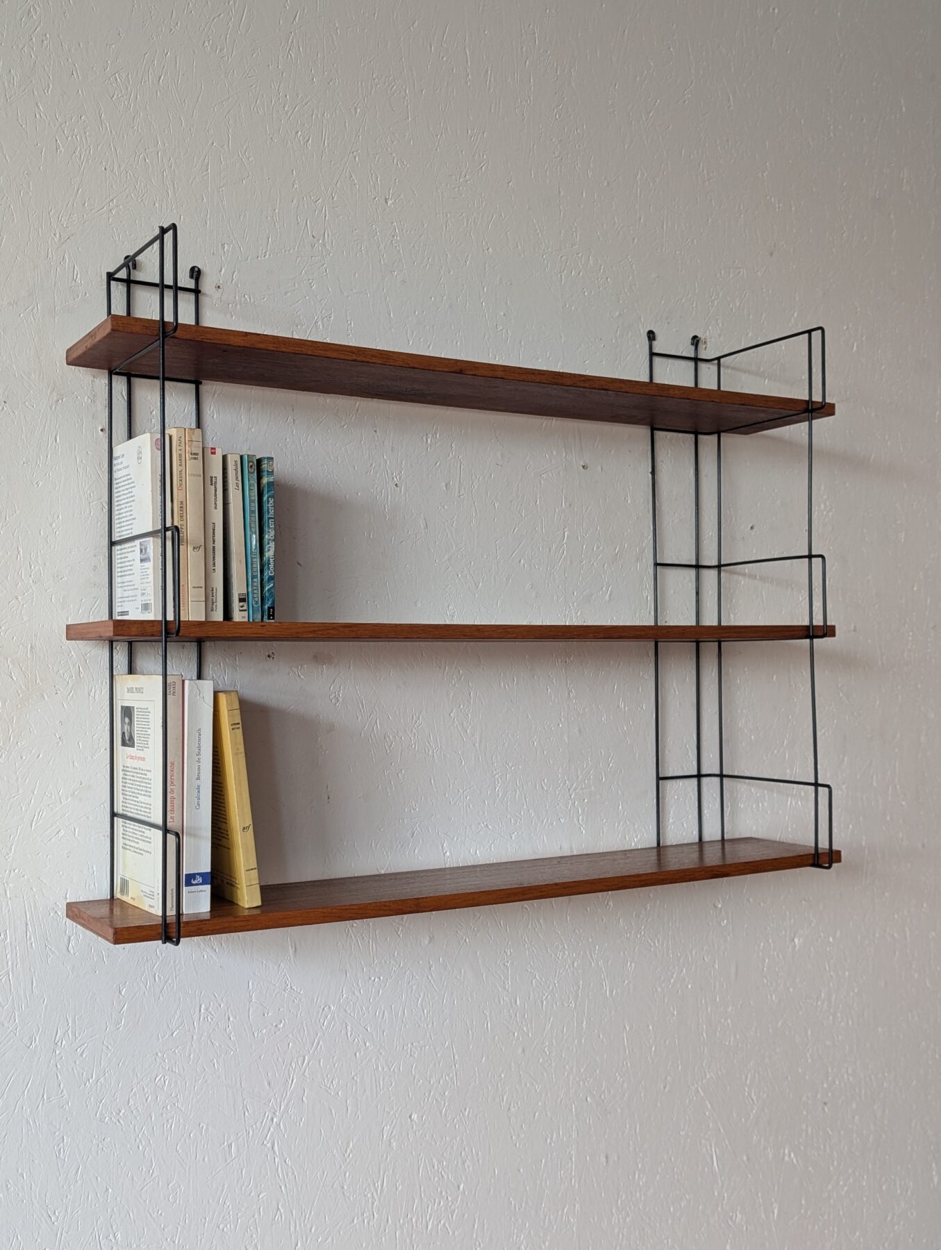 Etagère murale vintage, Allemagne comprenant 3 tablettes teck et 2 échelles métalliques noires.