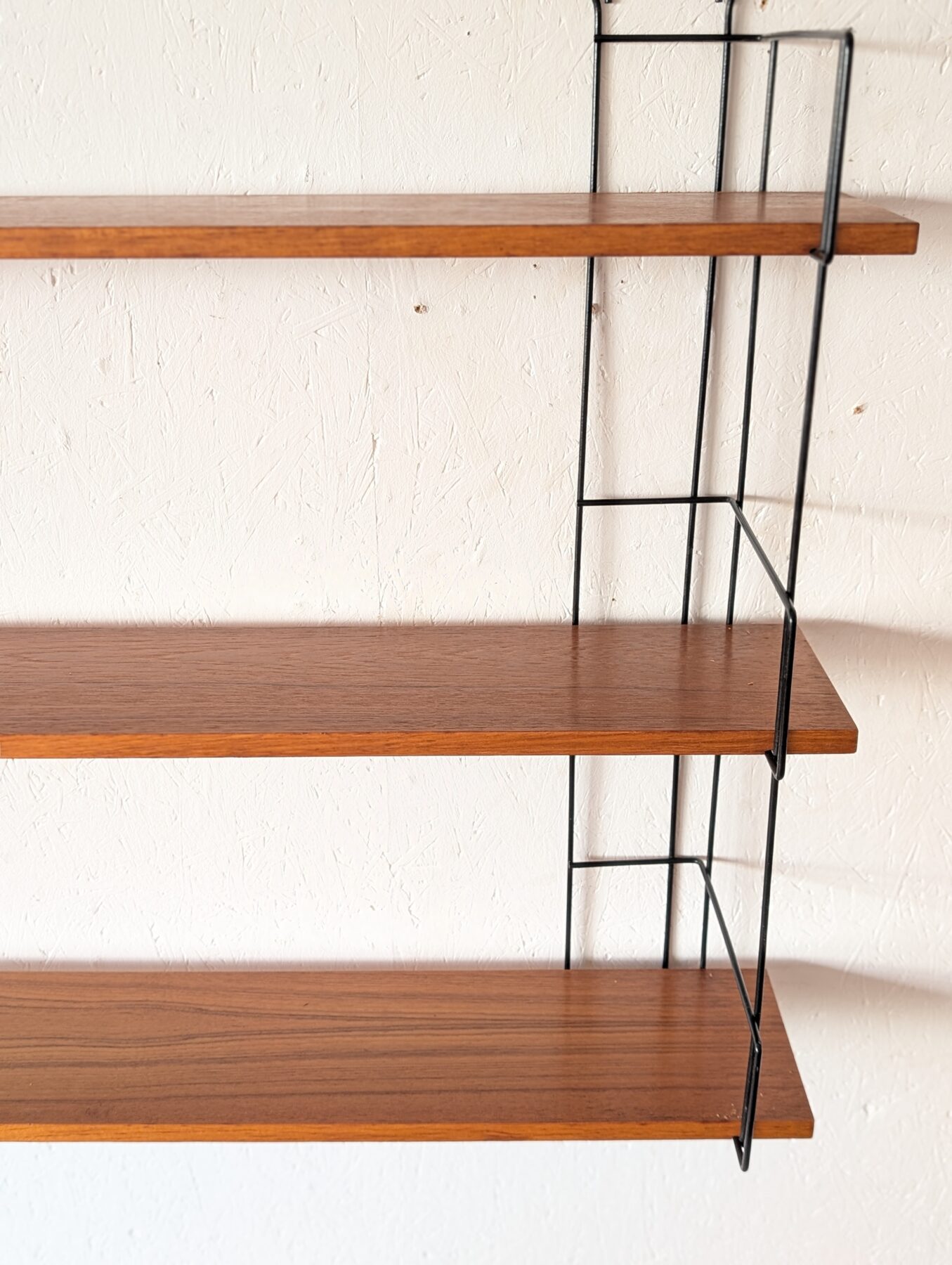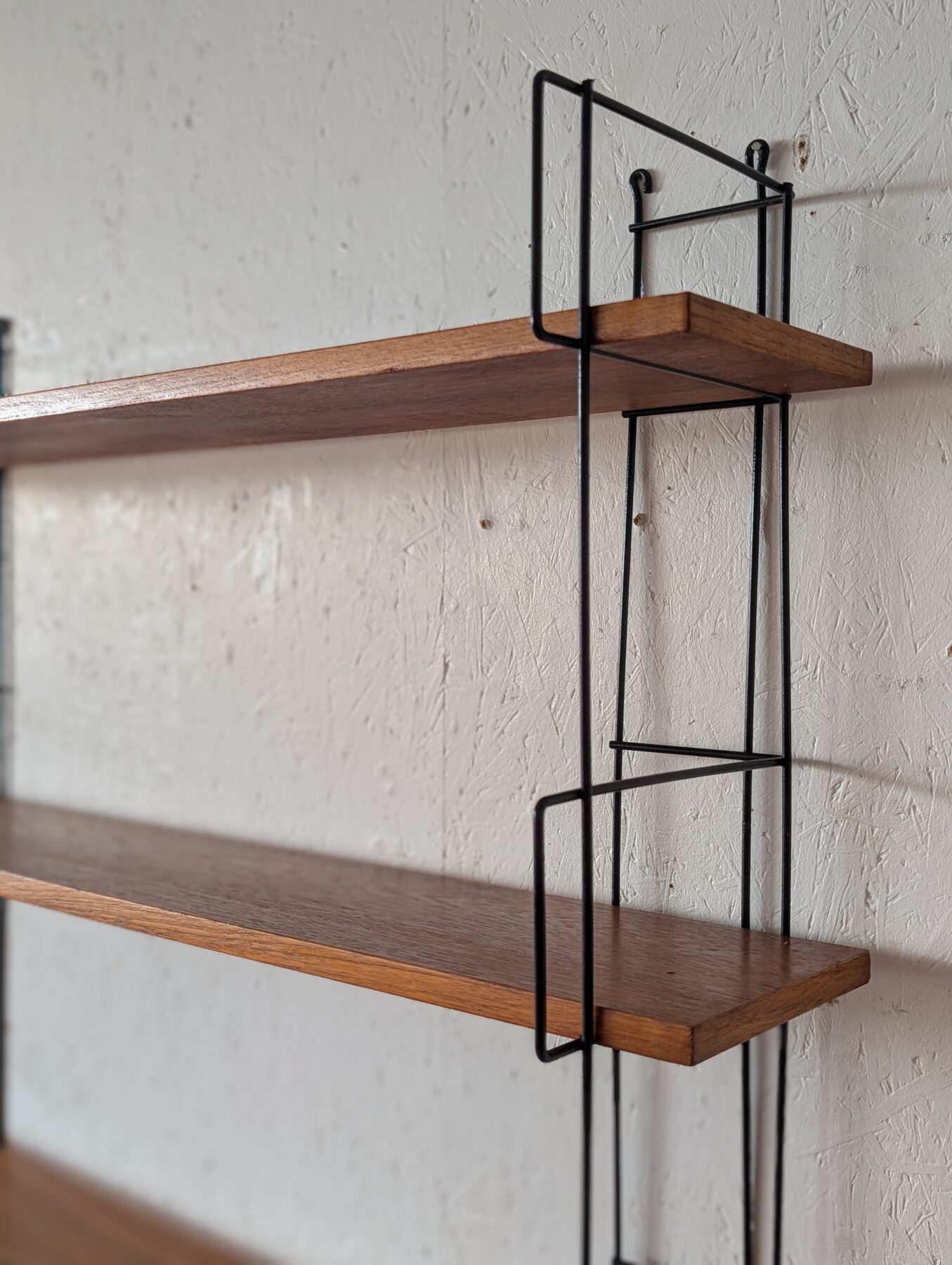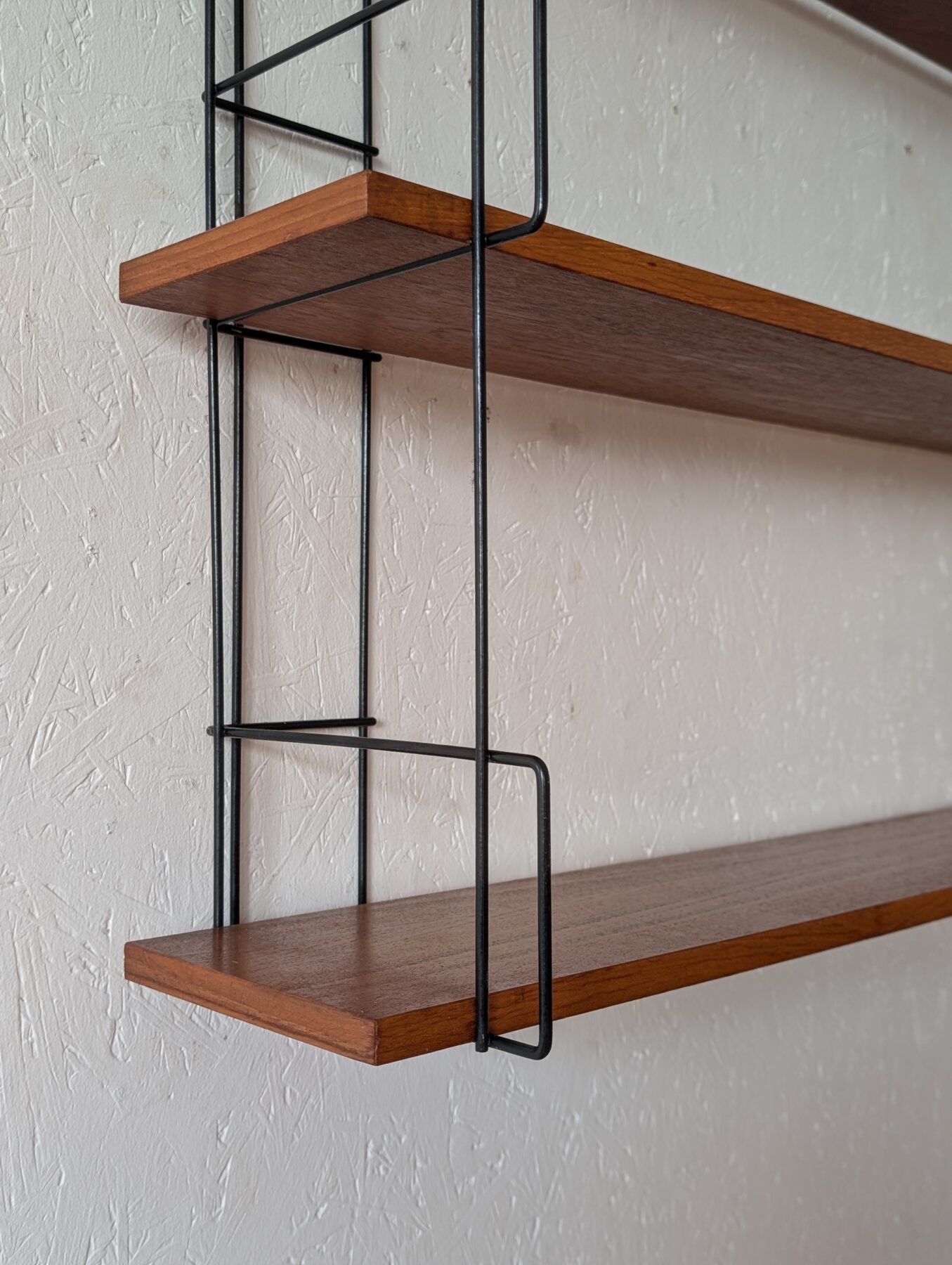 Etagère murale vintage, Allemagne comprenant 3 tablettes teck et 2 échelles métalliques noires.