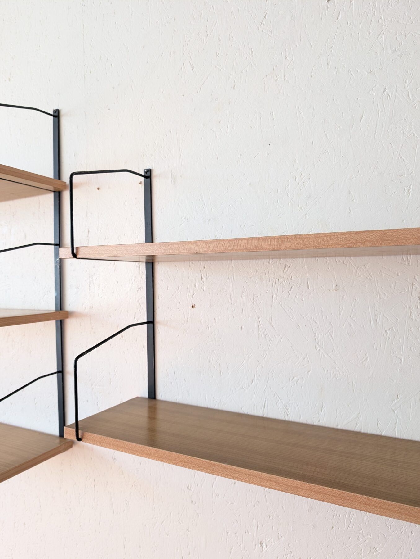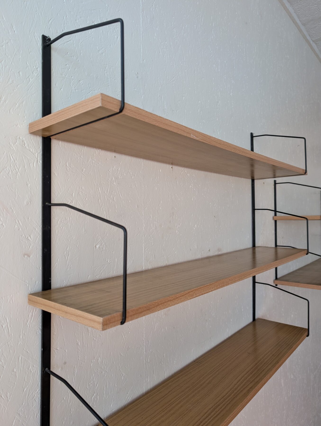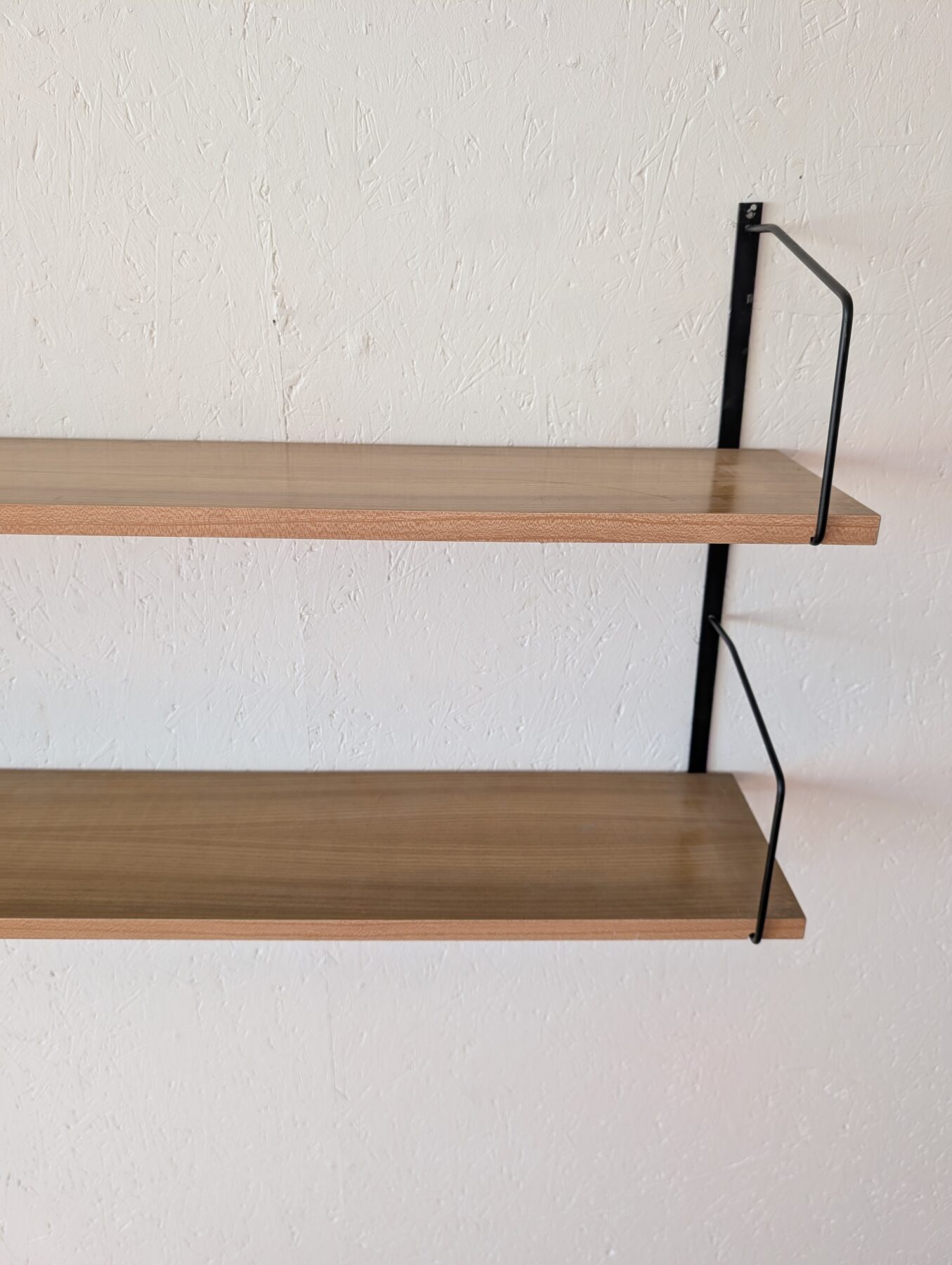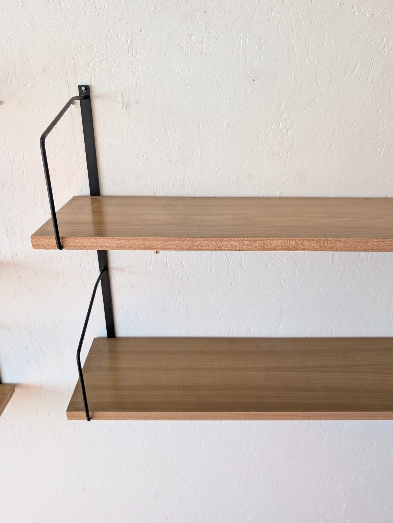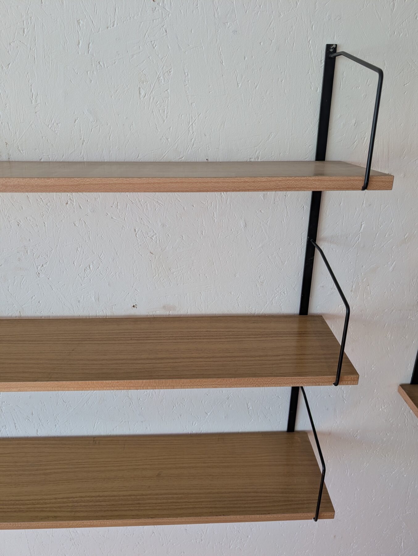 Duo d’étagères murales vintage avec 5 tablettes en stratifié imitation bois clair et 4 échelles métalliques noires.
