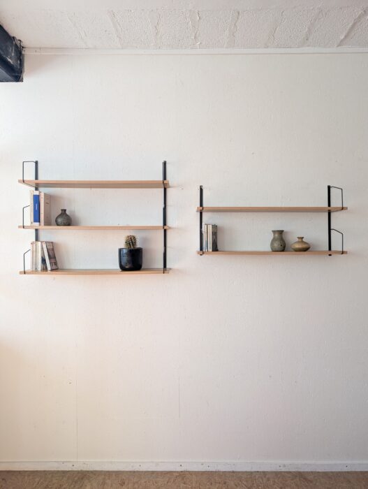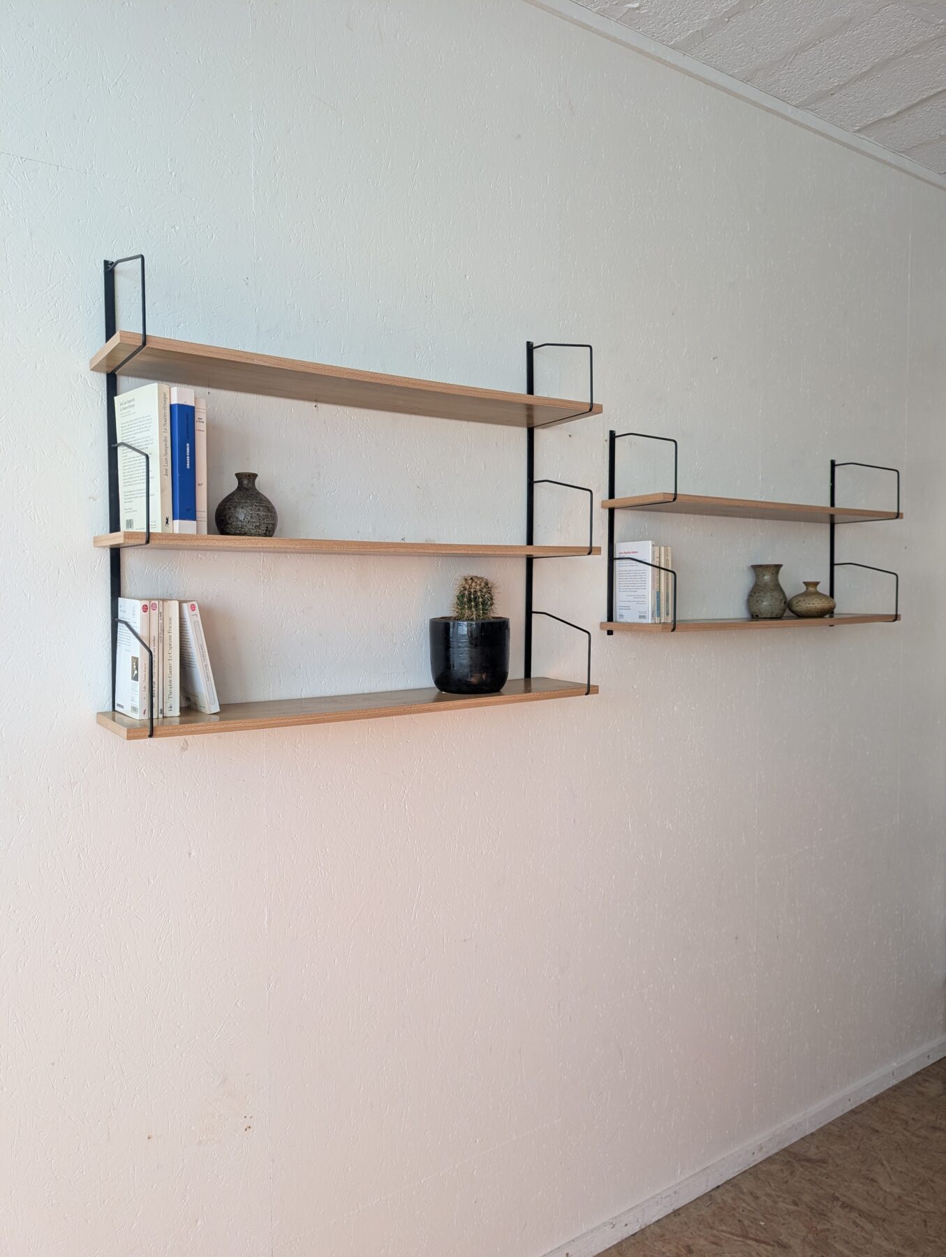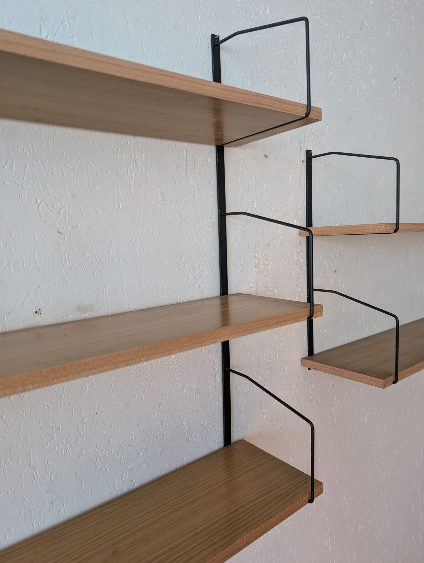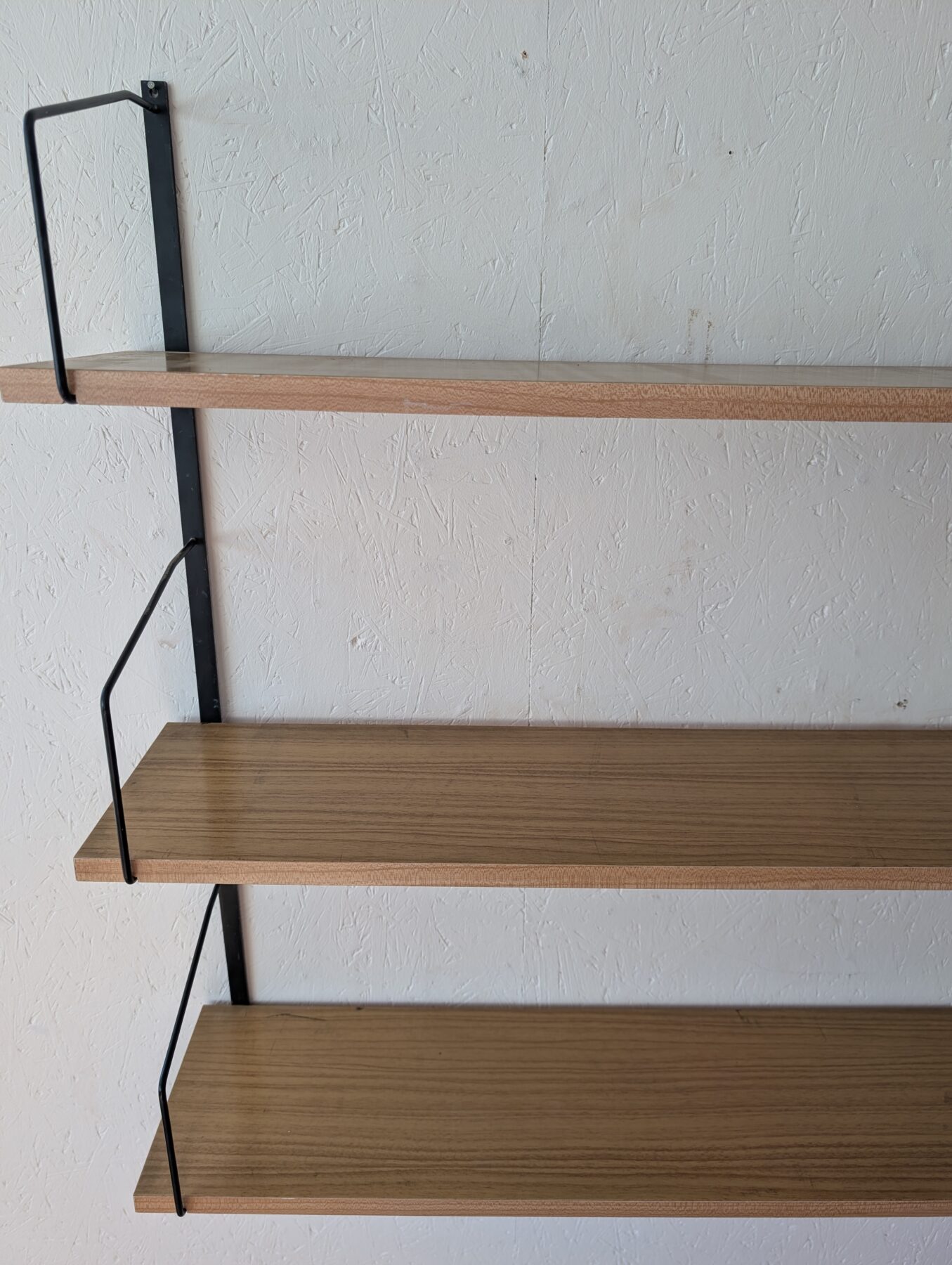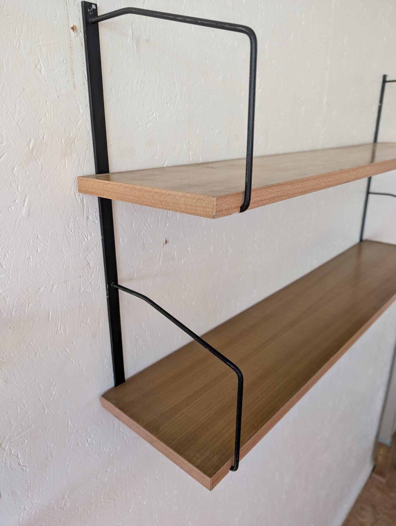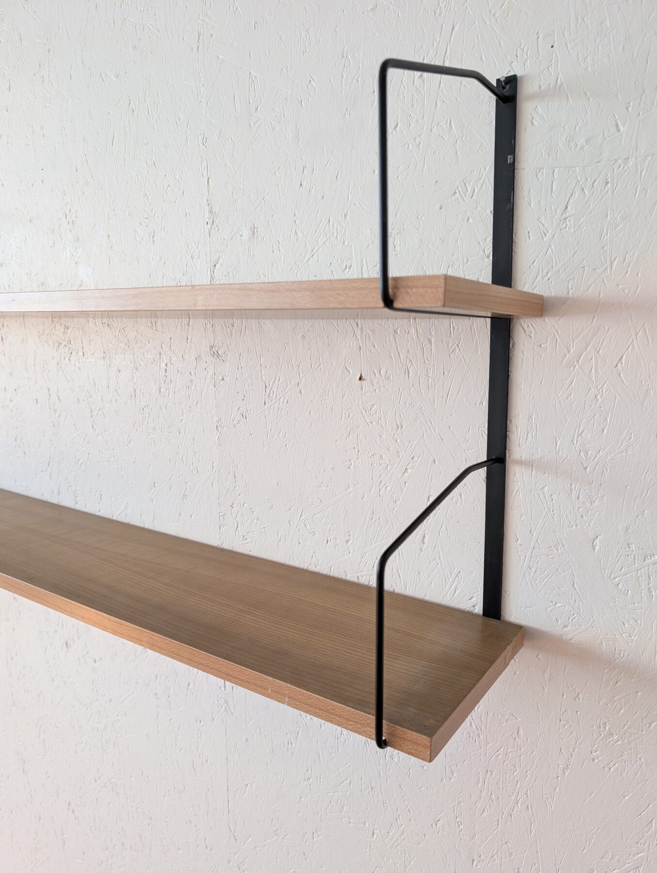 Duo d’étagères murales vintage avec 5 tablettes en stratifié imitation bois clair et 4 échelles métalliques noires.