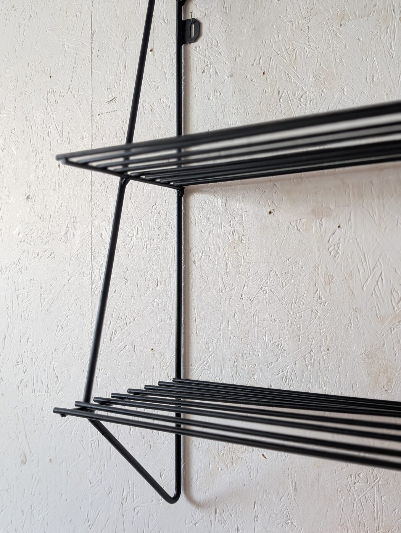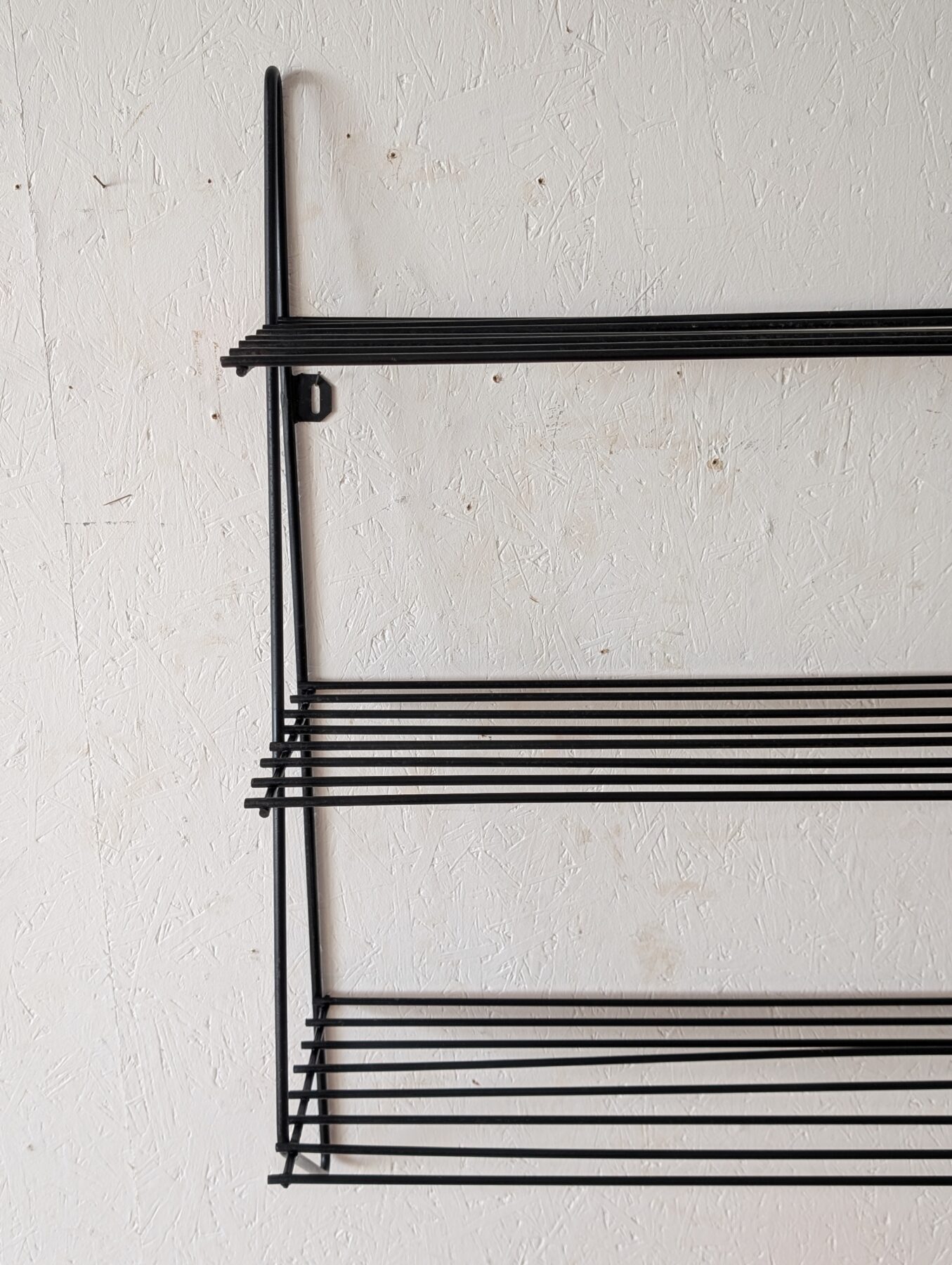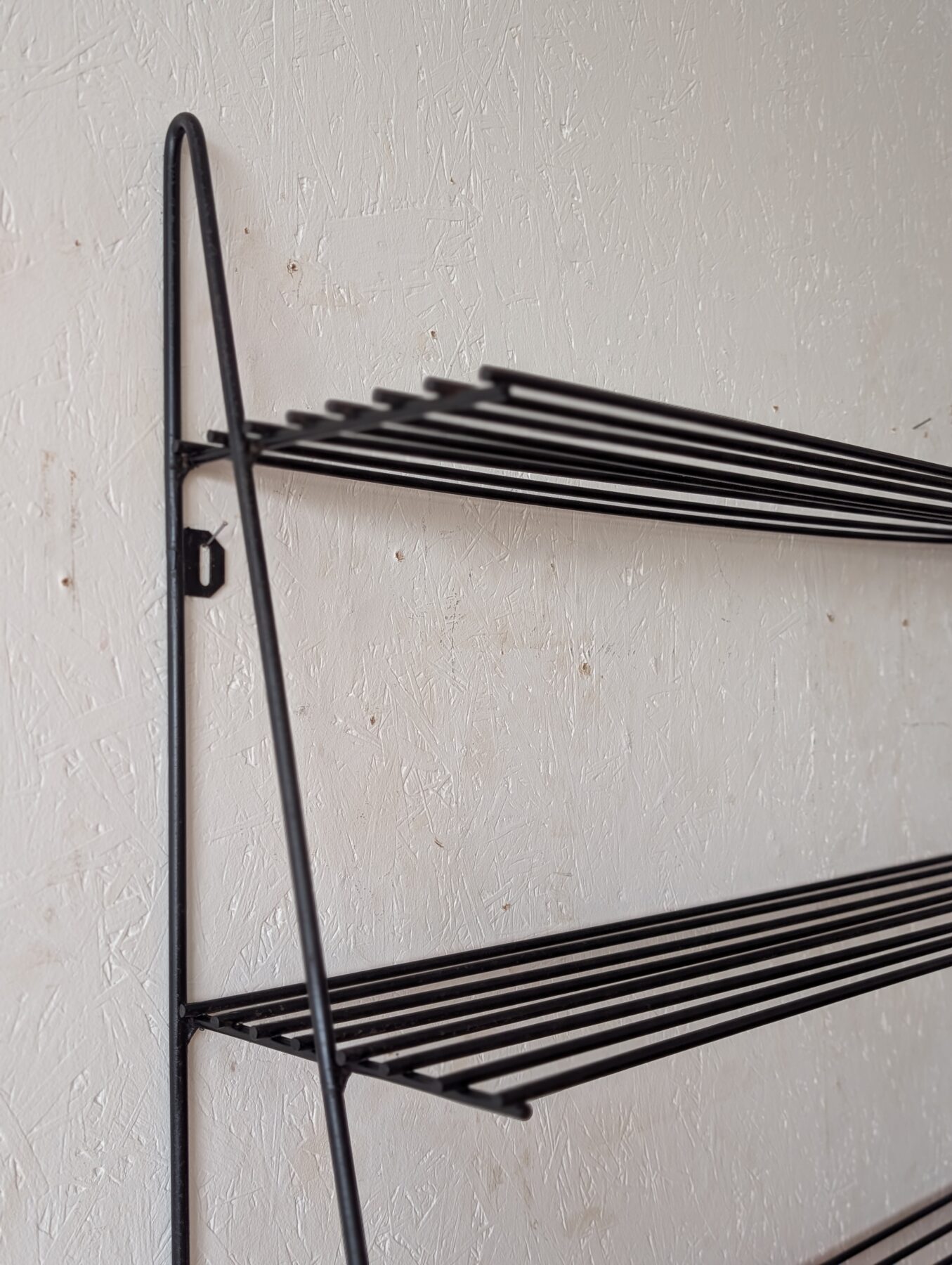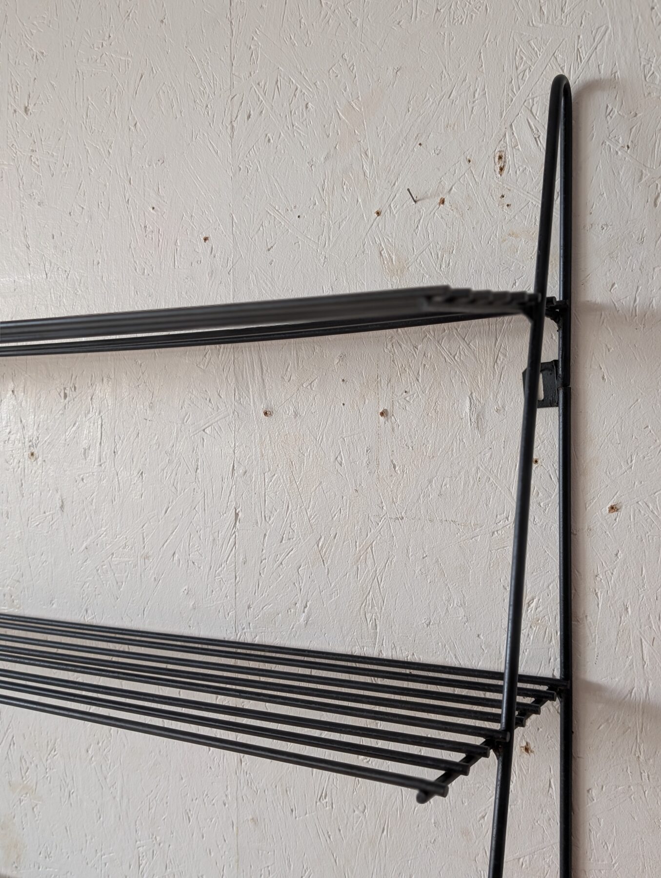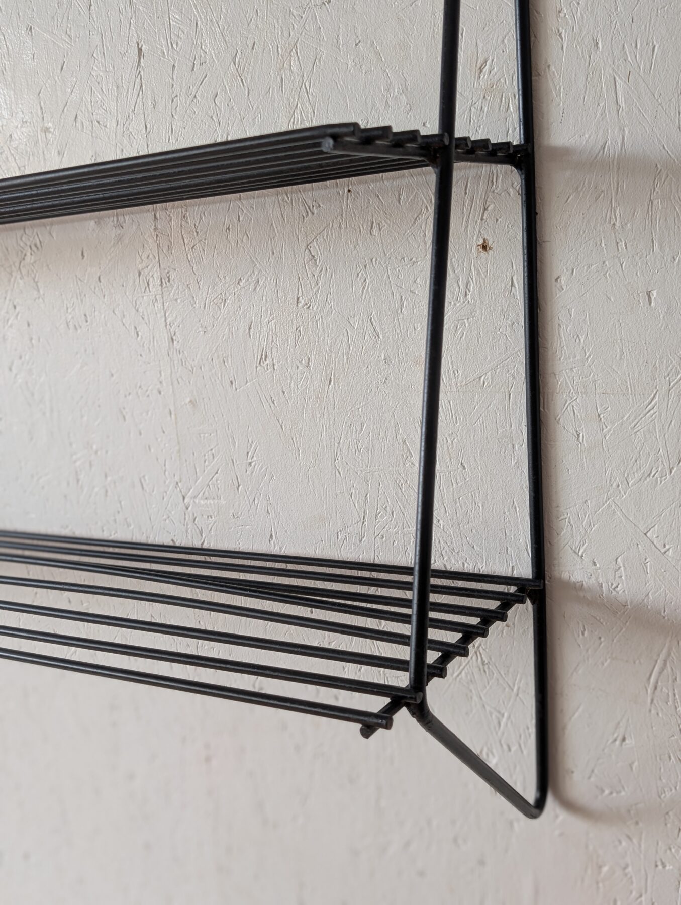 Etagère murale vintage noire en métal noire et tablettes en fils métalliques.