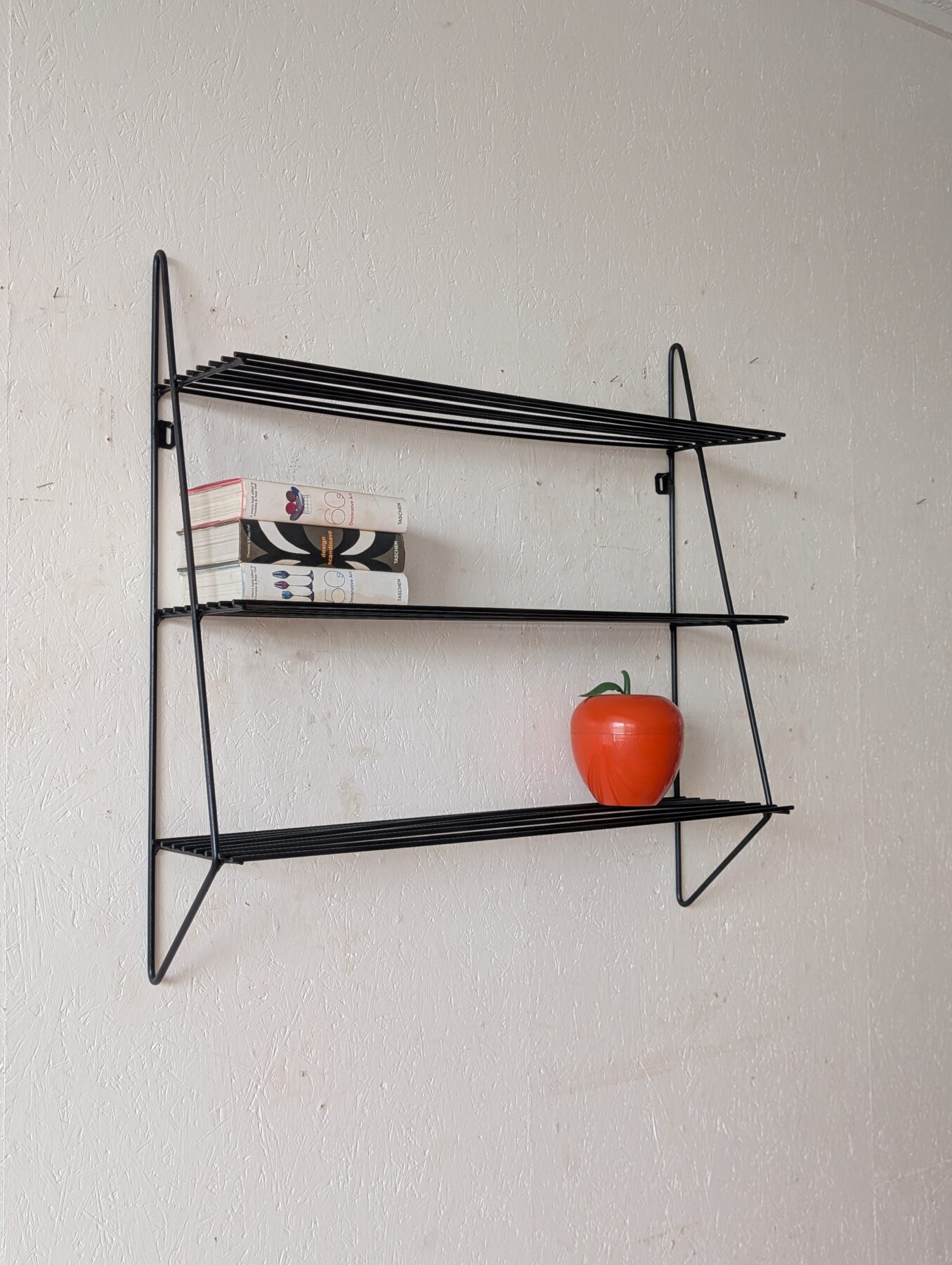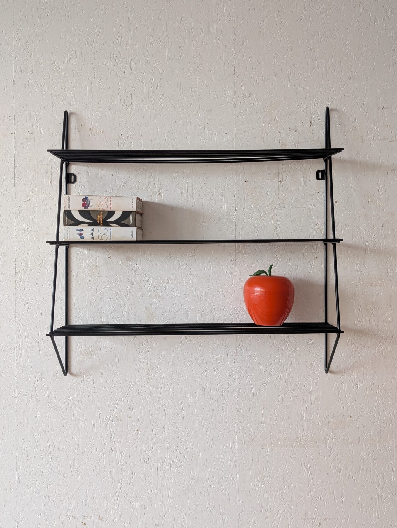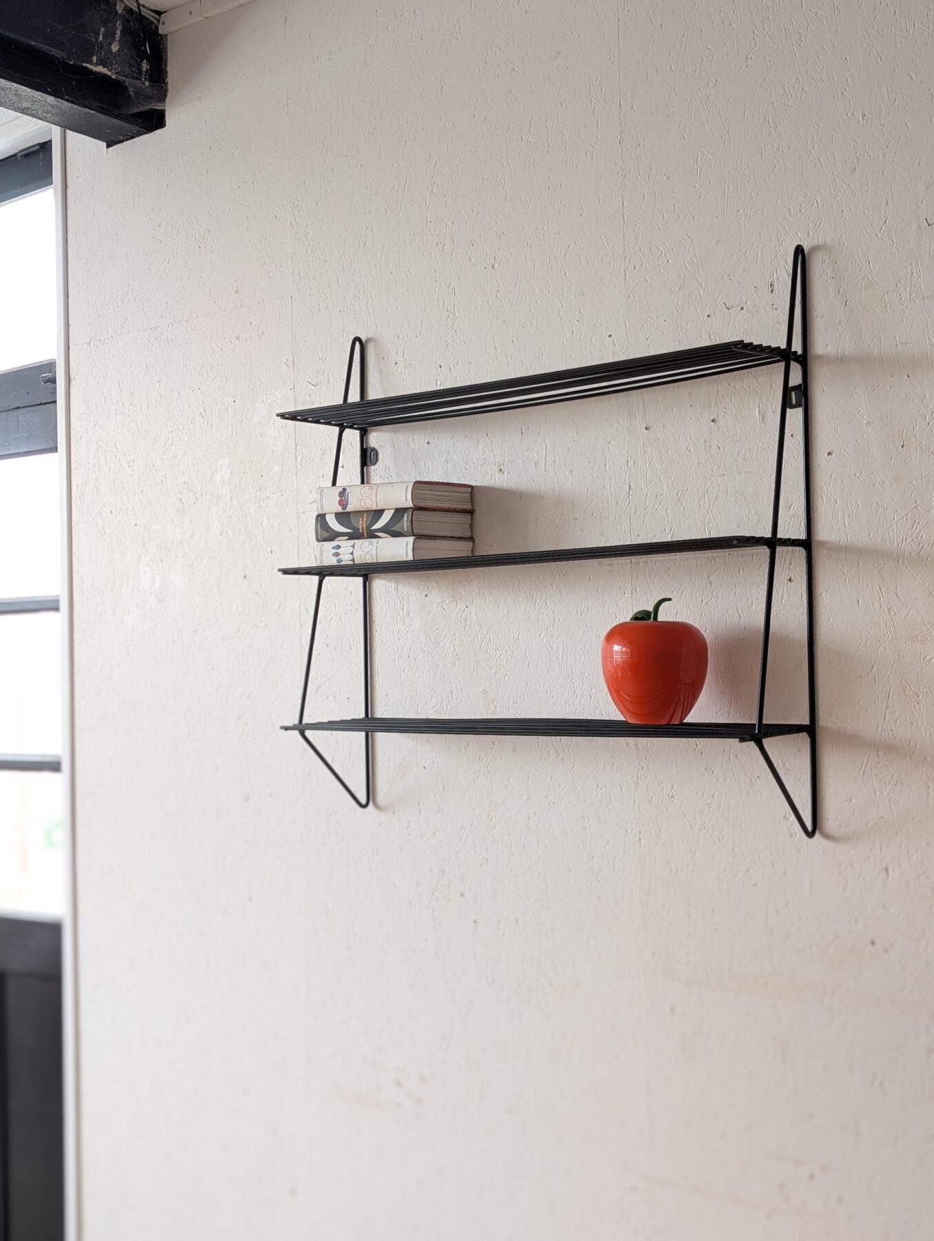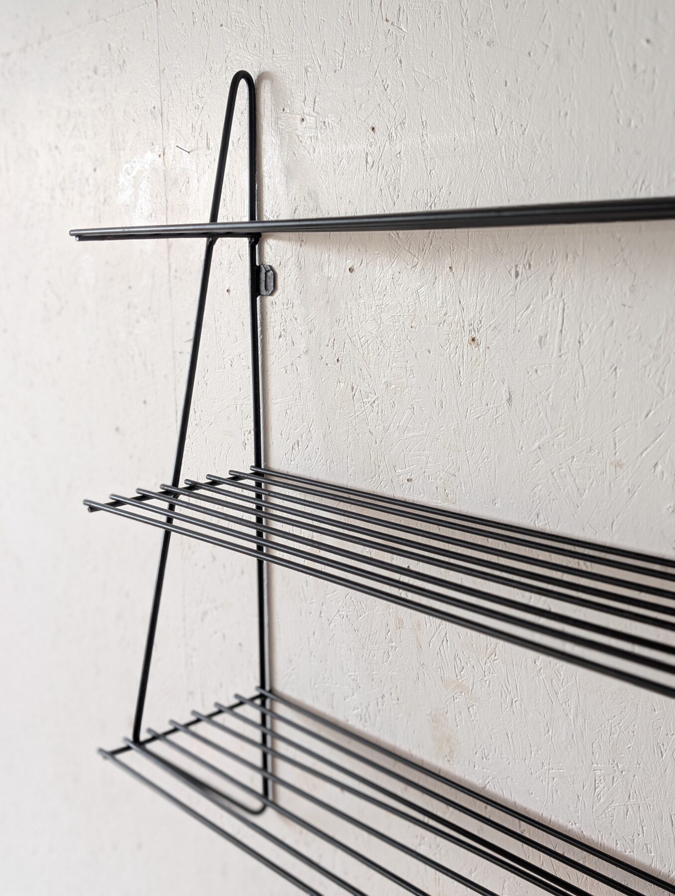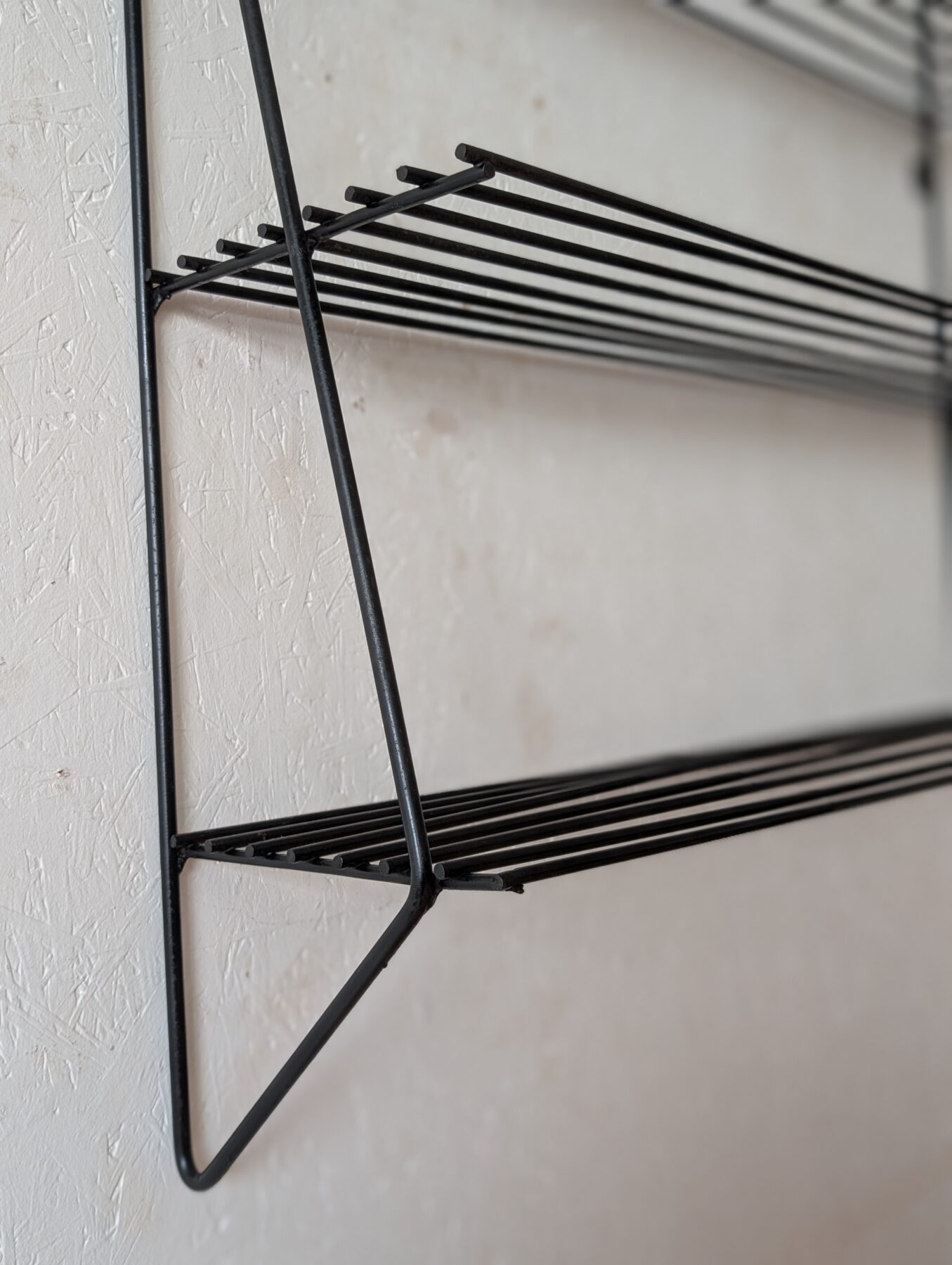Etagère murale vintage noire en métal noire et tablettes en fils métalliques.