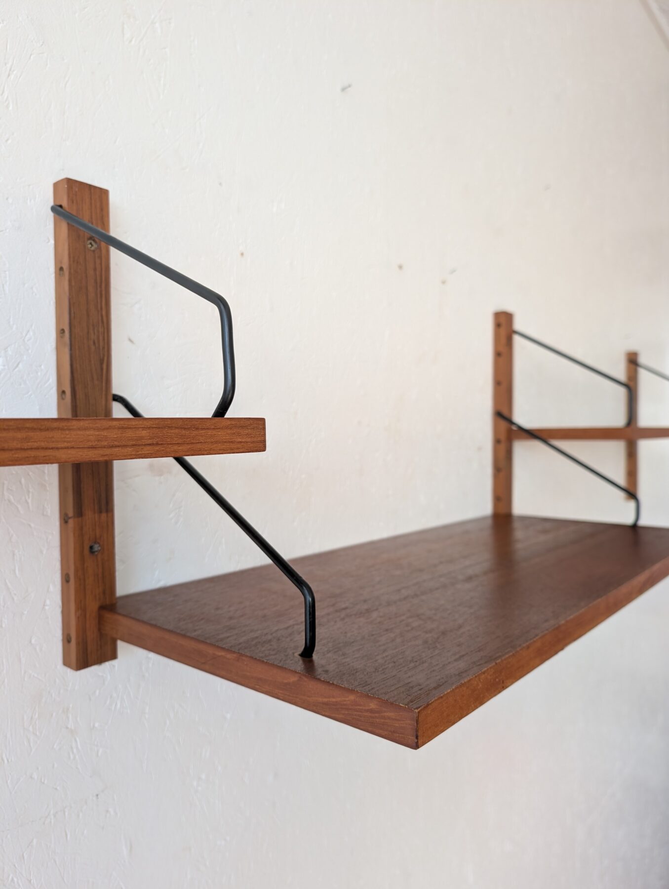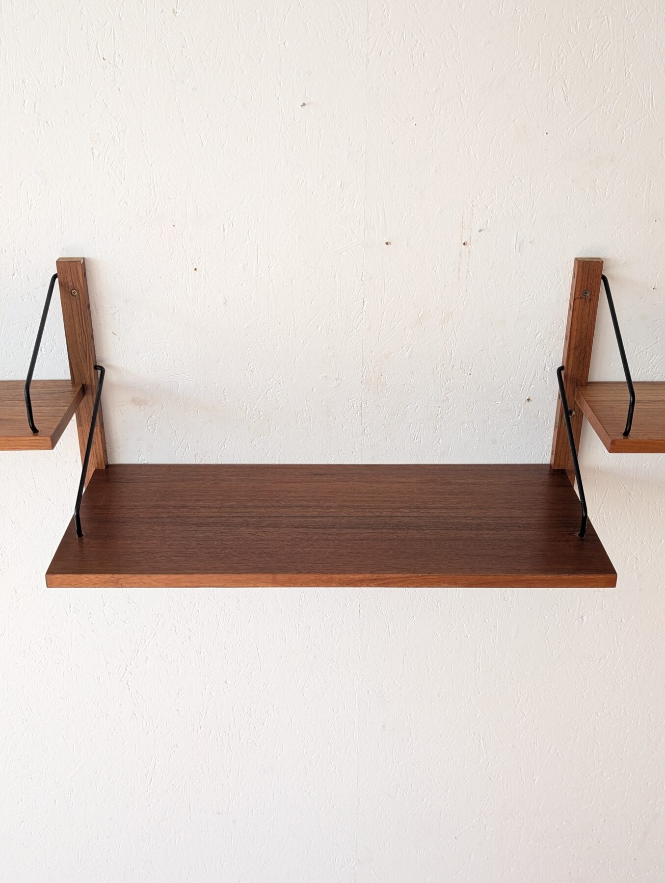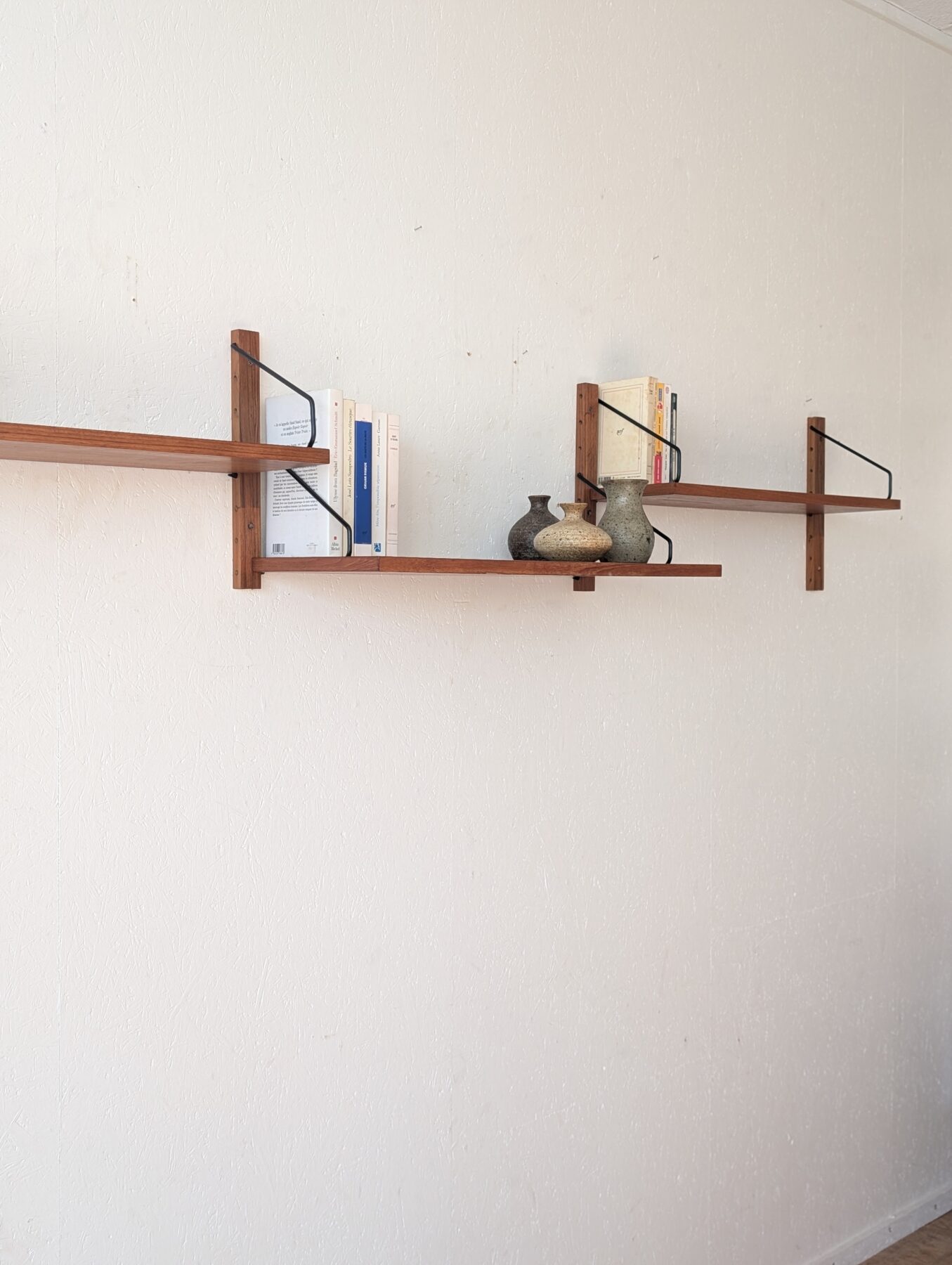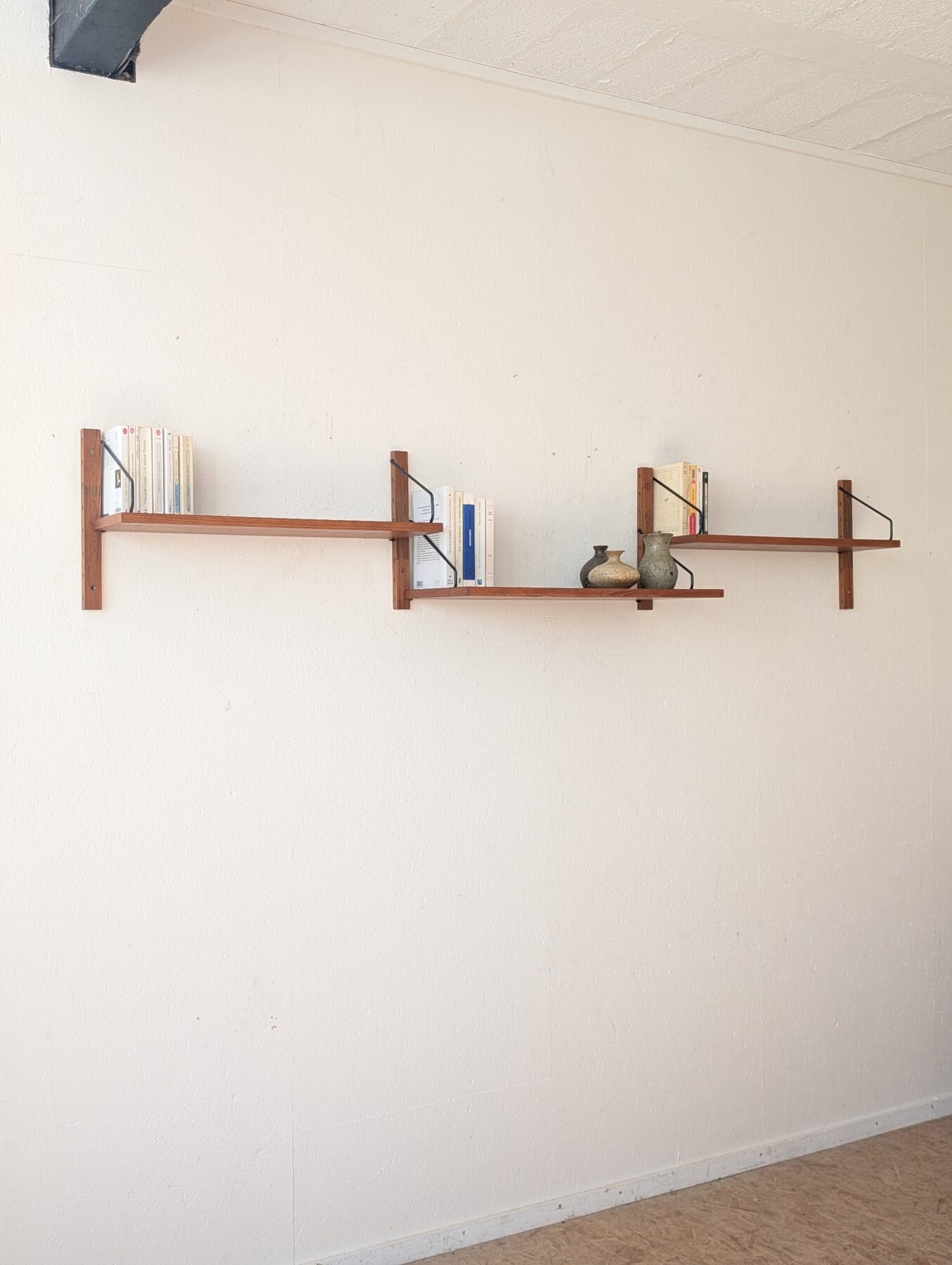 Ensemble d’étagères murales modulables en teck « Royal System » par Poul Cadovius composé de 4 montants teck avec supports métalliques et de 3 tablettes (2 de 20 cm de profondeur et 1 de 30 cm)
