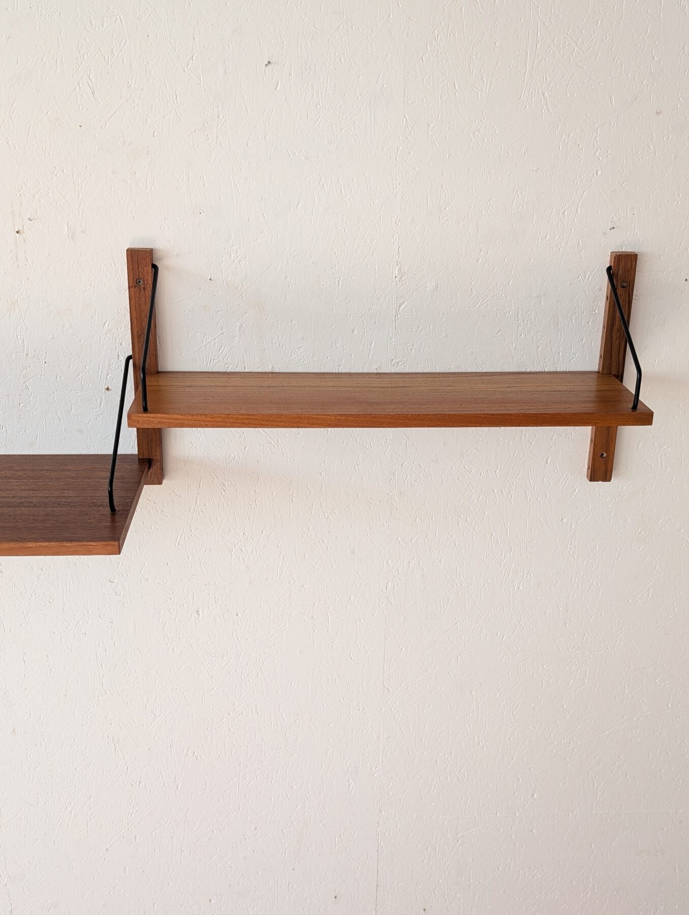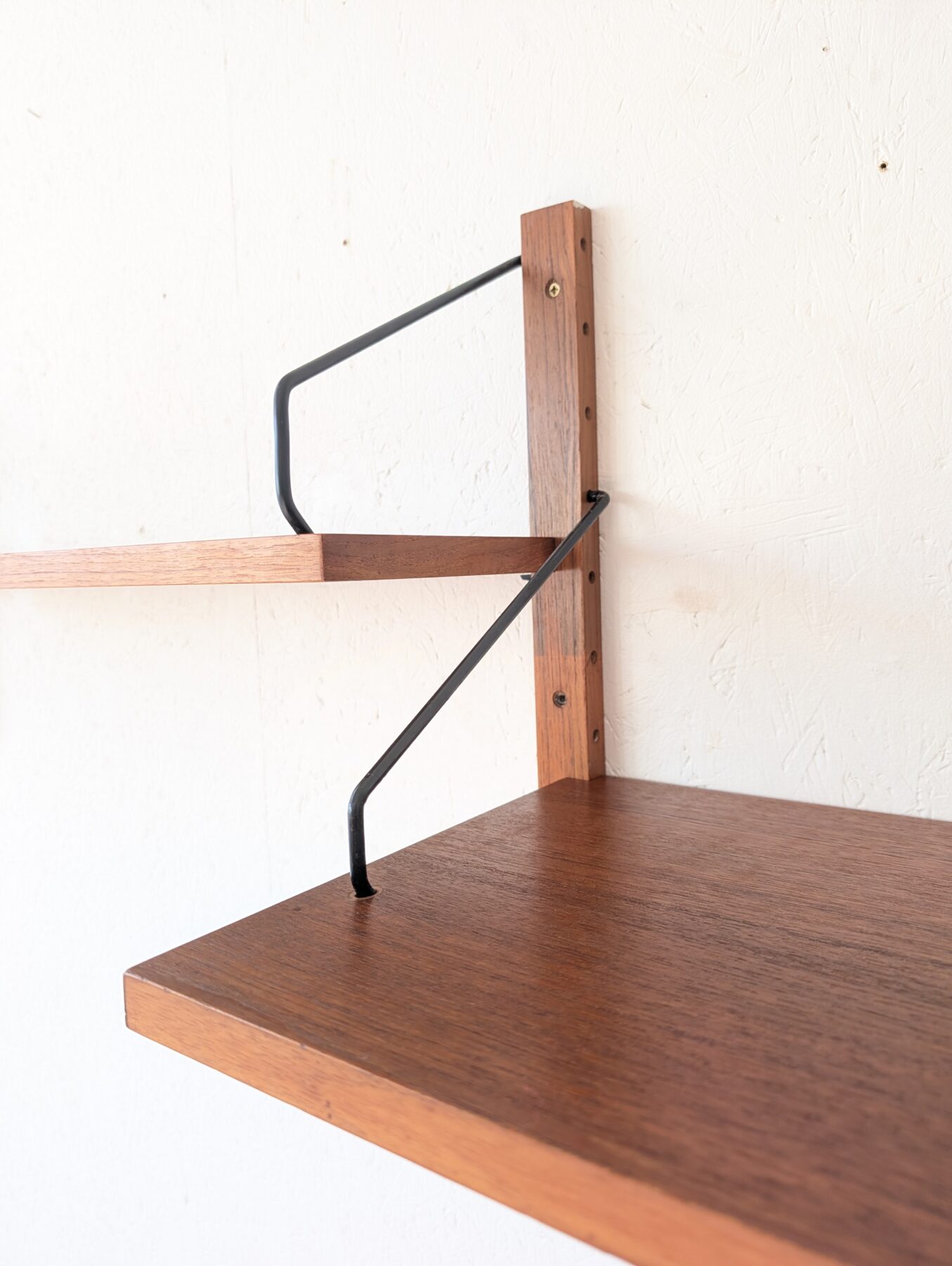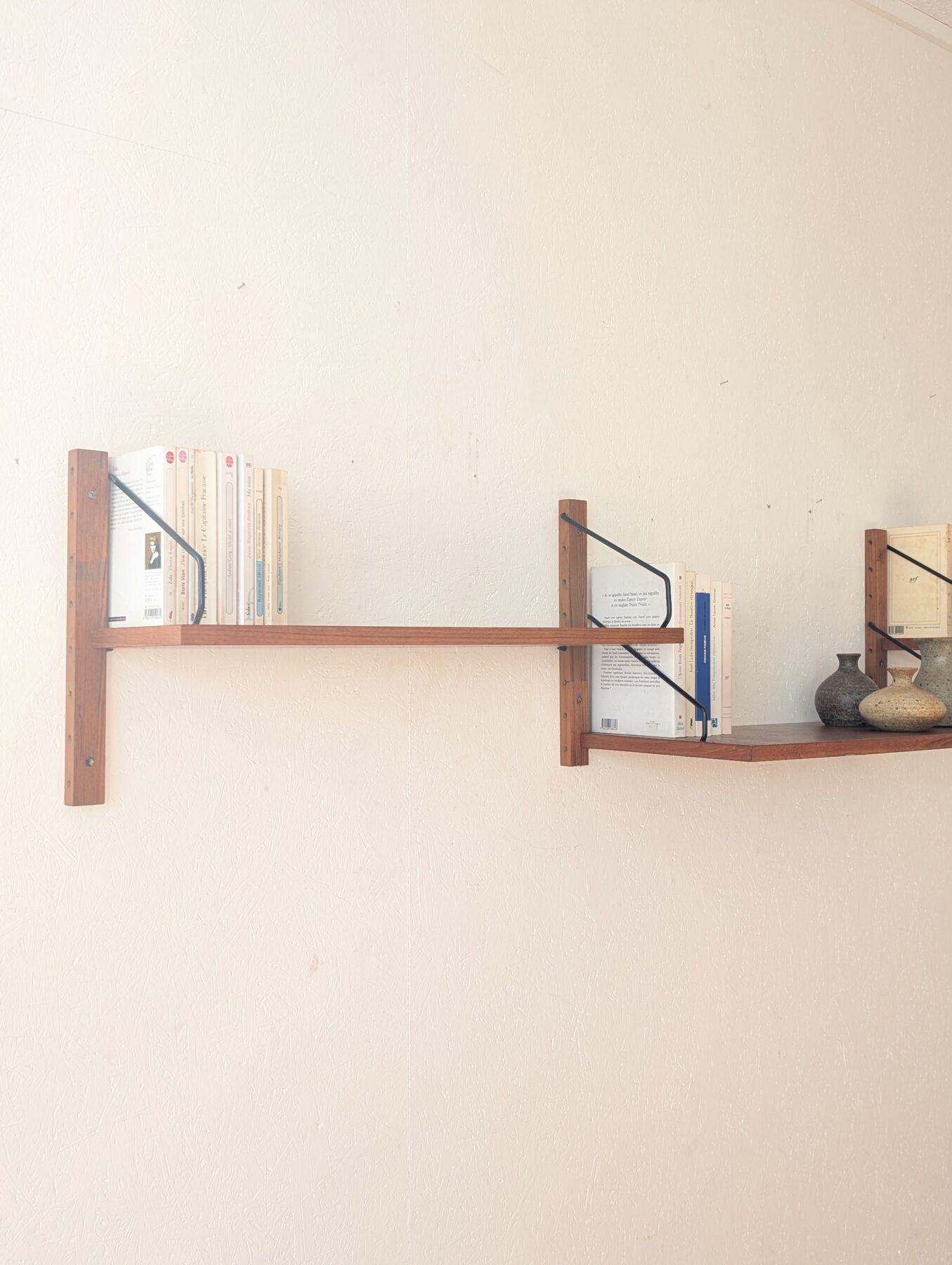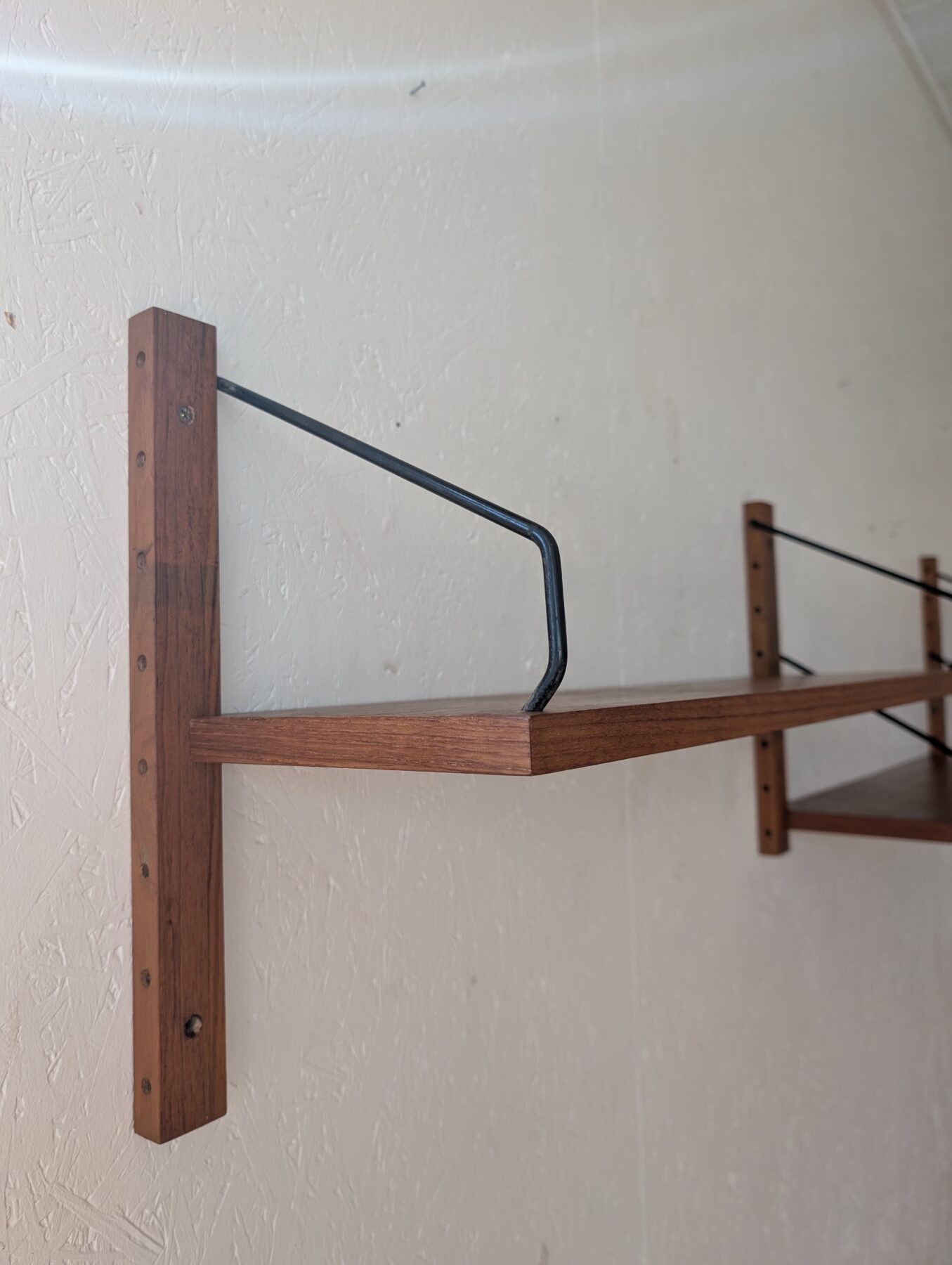 Ensemble d’étagères murales modulables en teck « Royal System » par Poul Cadovius composé de 4 montants teck avec supports métalliques et de 3 tablettes (2 de 20 cm de profondeur et 1 de 30 cm)