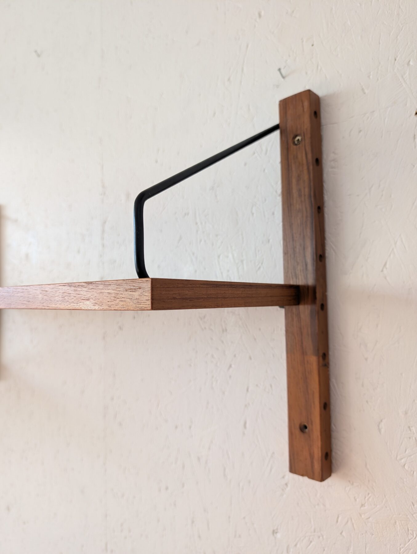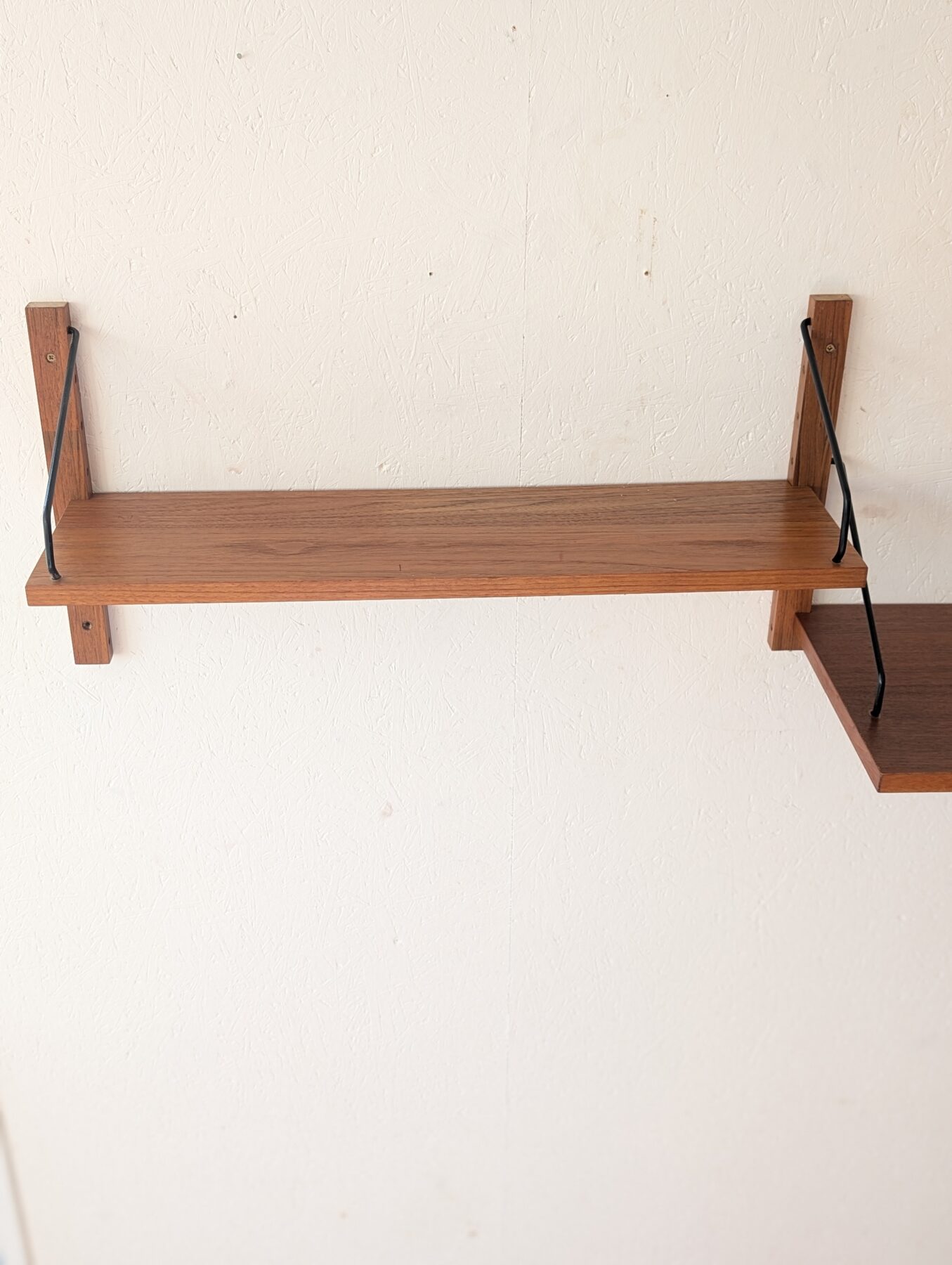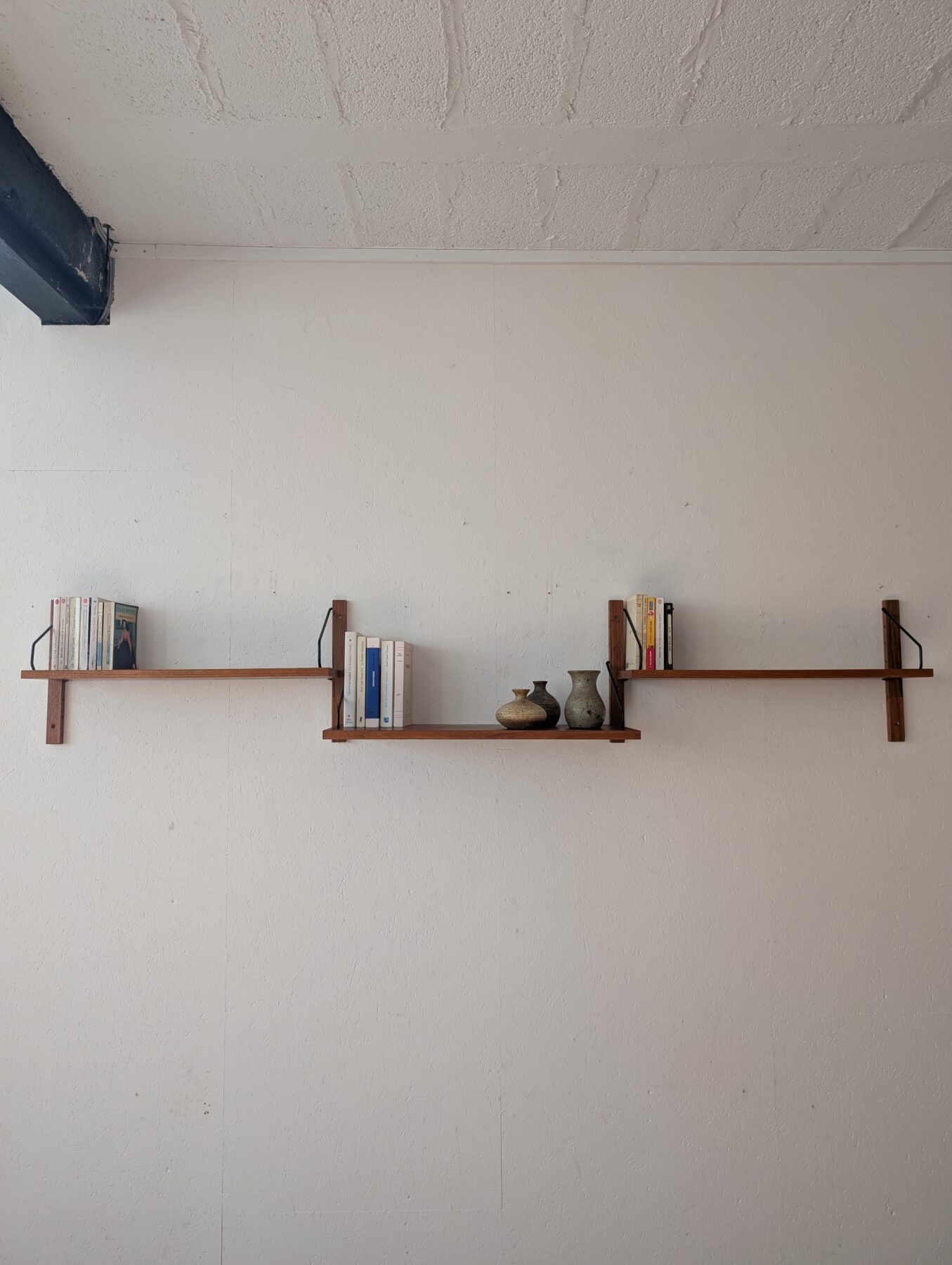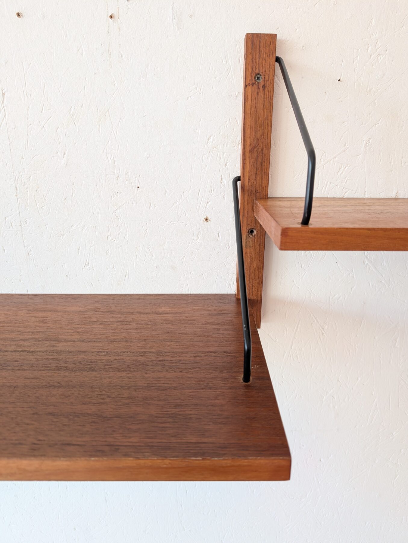 Ensemble d’étagères murales modulables en teck « Royal System » par Poul Cadovius composé de 4 montants teck avec supports métalliques et de 3 tablettes (2 de 20 cm de profondeur et 1 de 30 cm)