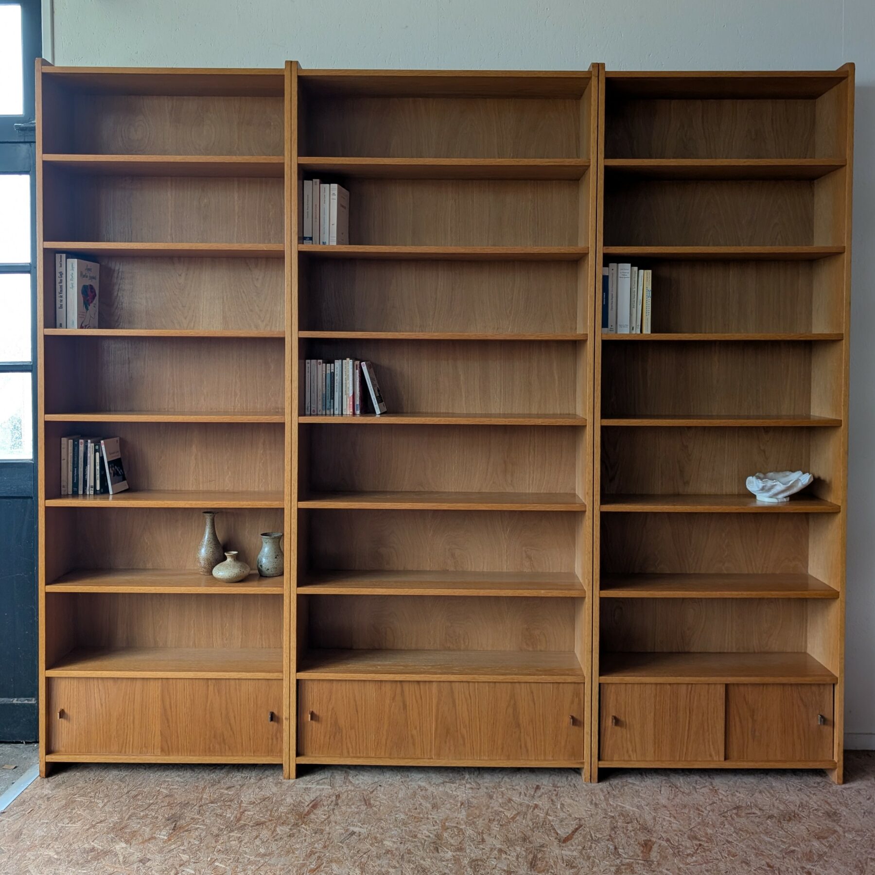 Grande bibliothèque en placage chêne des années 70 composée de 3 meubles (2 de 78 cm de long et 1 de 94 cm de long) avec 18 étagères fixes et 6 portes coulissantes.