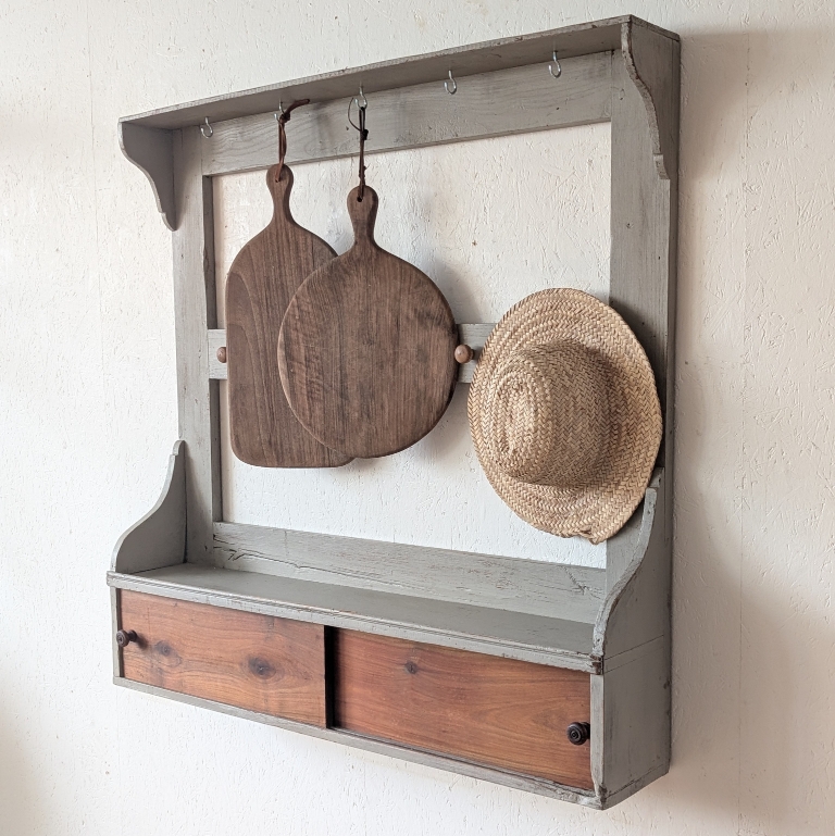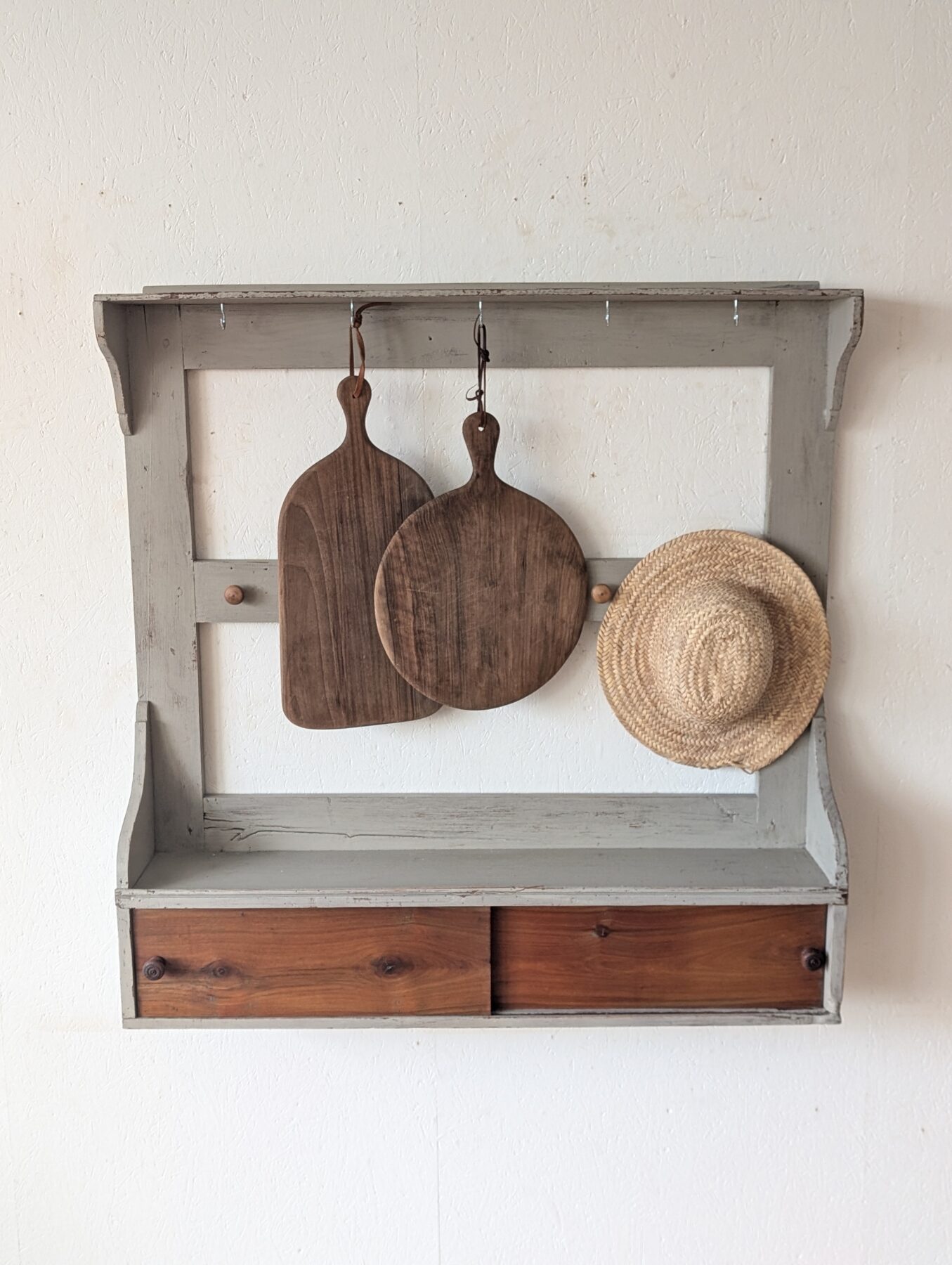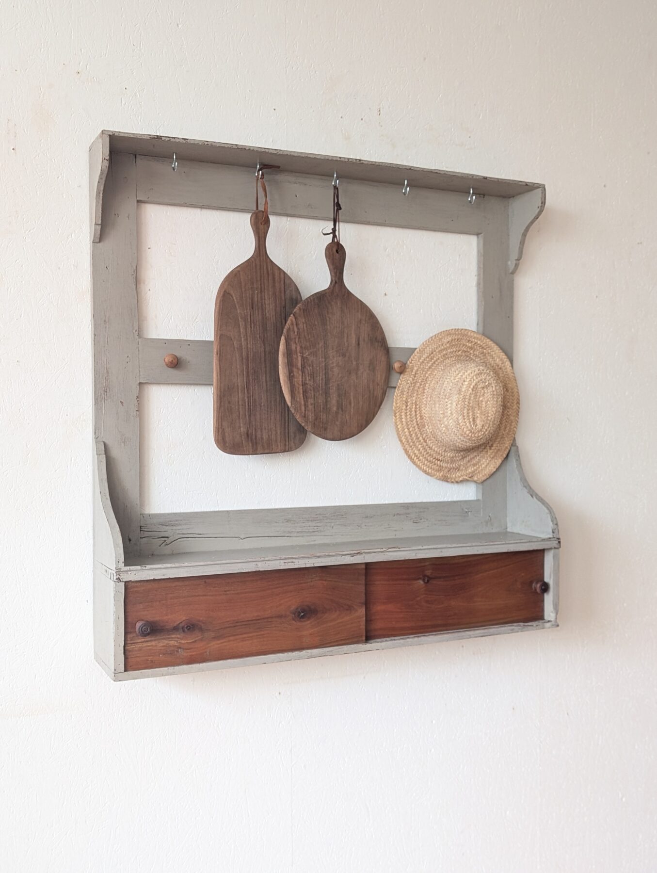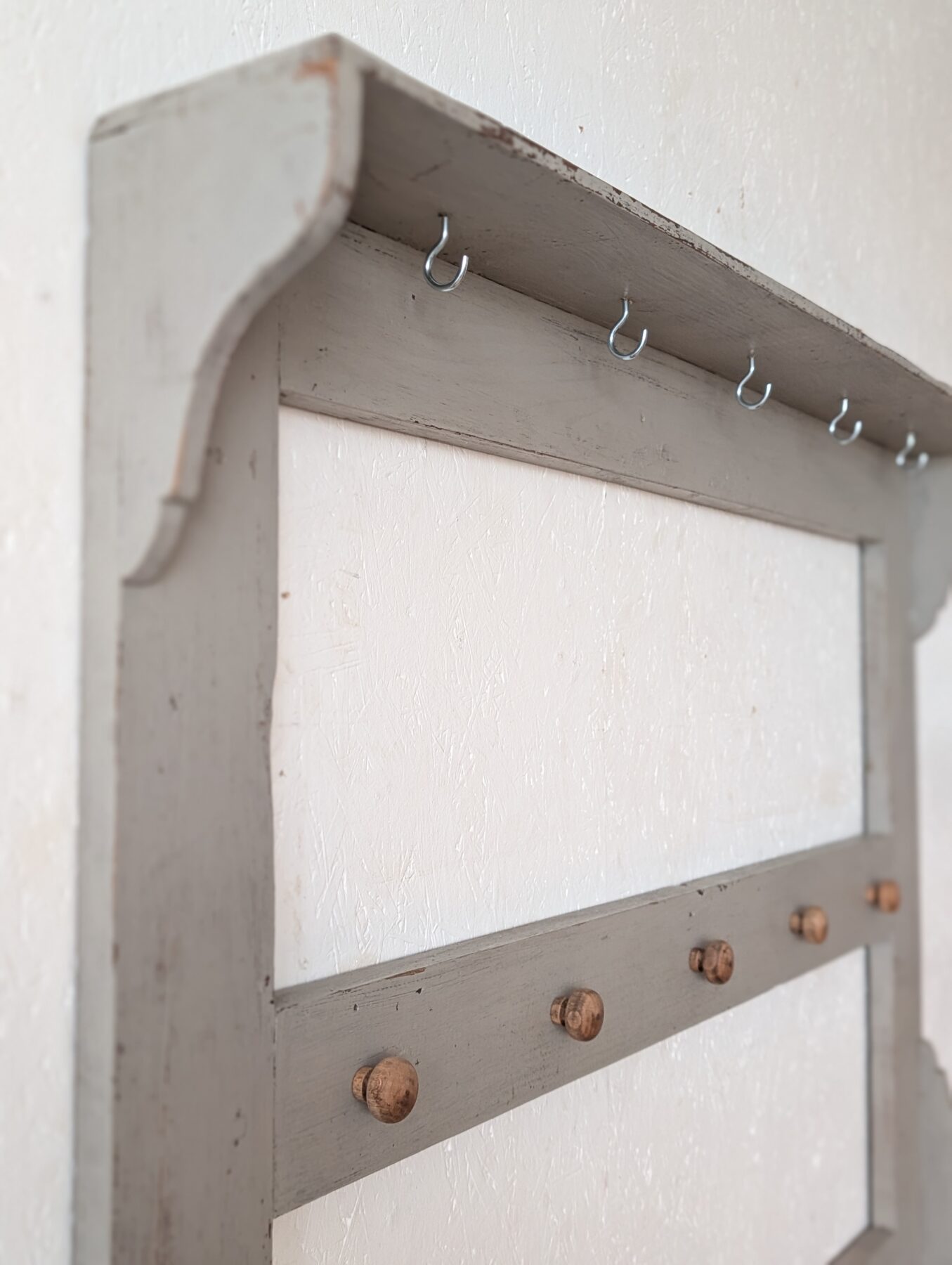 Etagère murale ancienne en chêne avec patine grise, de nombreux crochets pour suspendre déco, tasses, torchons,… ainsi que 2 portes coulissantes.
