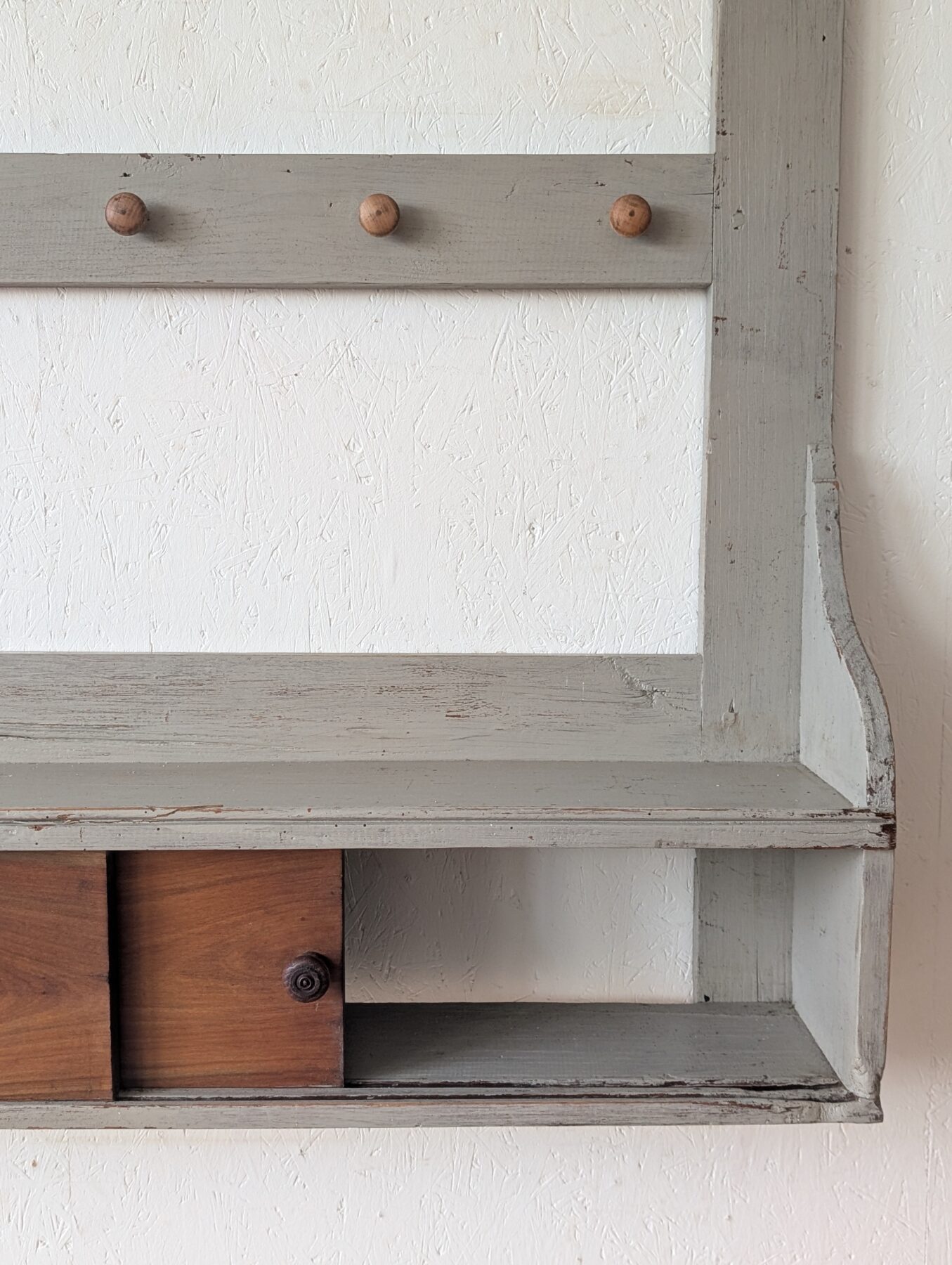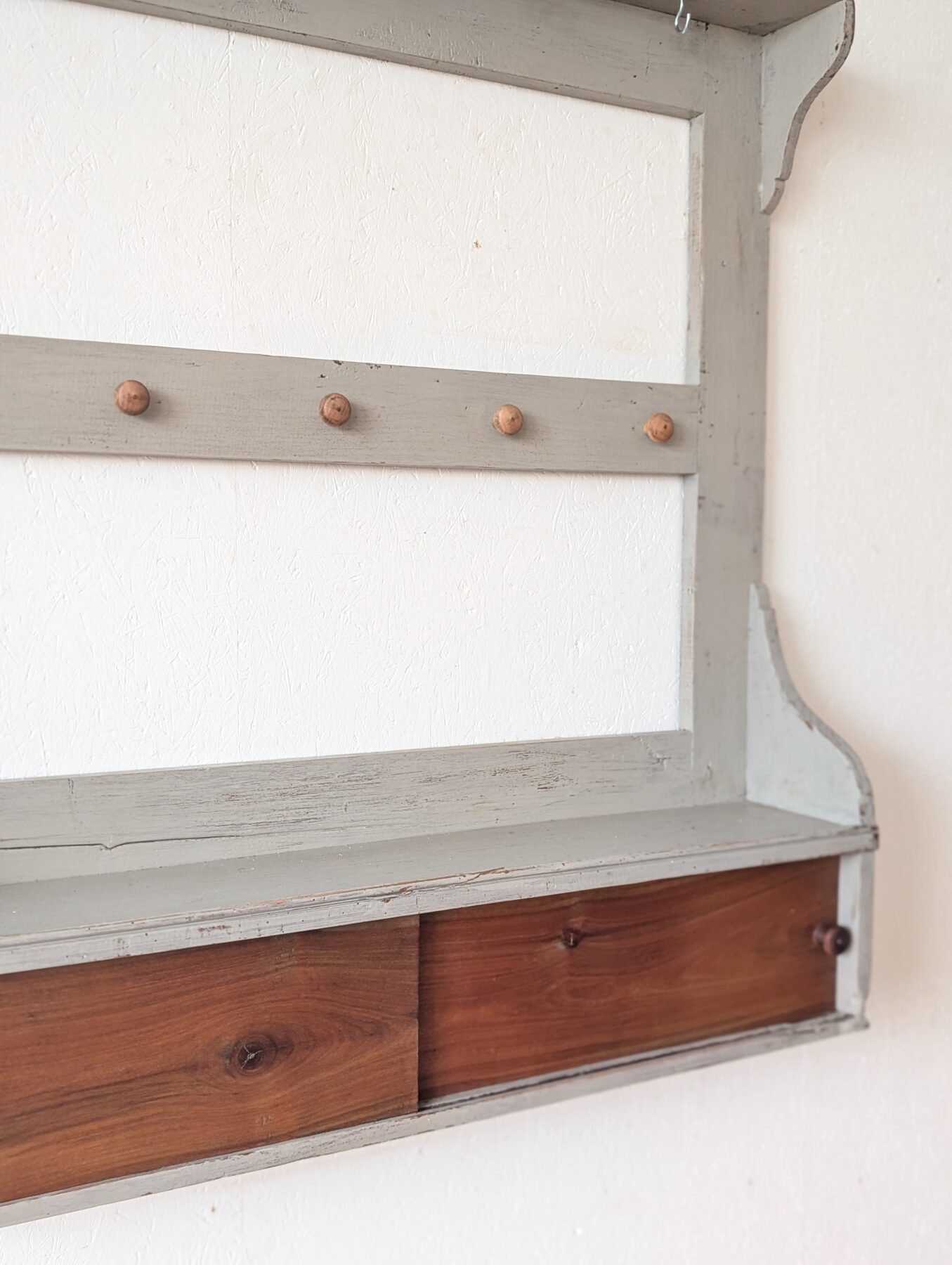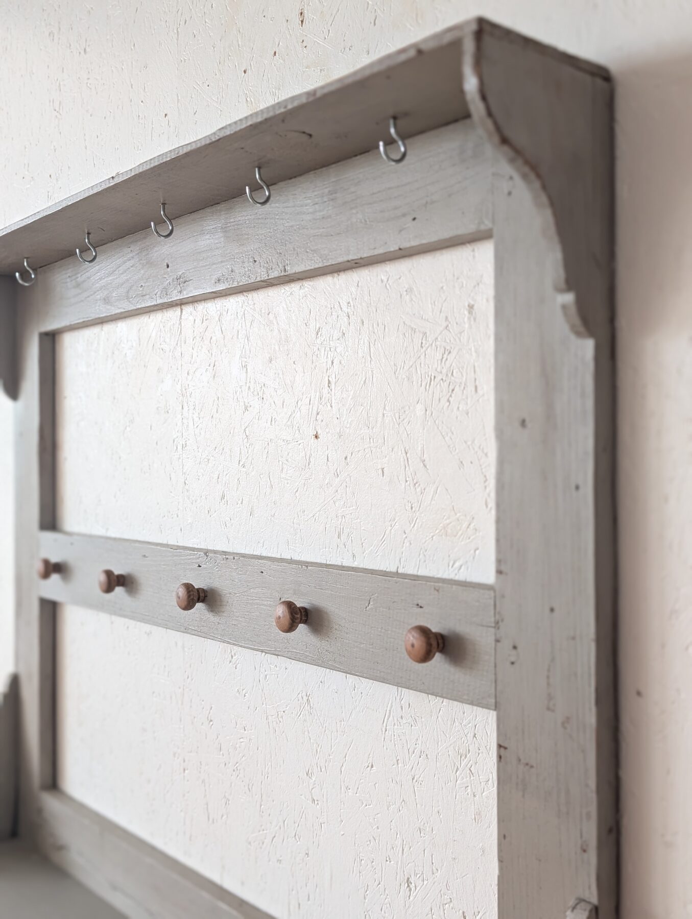 Etagère murale ancienne en chêne avec patine grise, de nombreux crochets pour suspendre déco, tasses, torchons,… ainsi que 2 portes coulissantes.