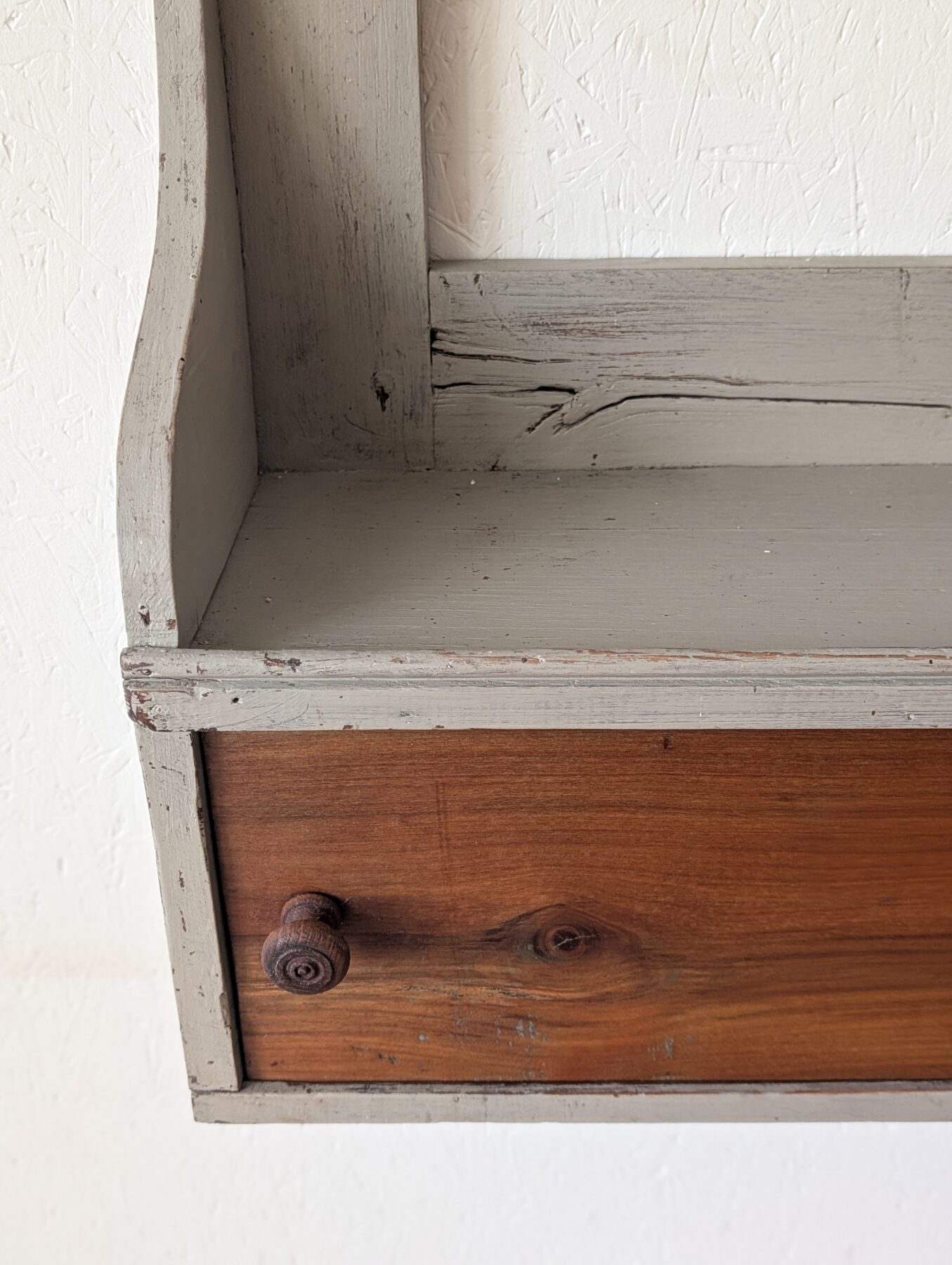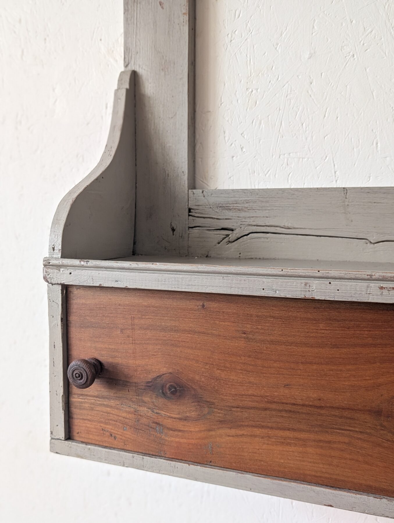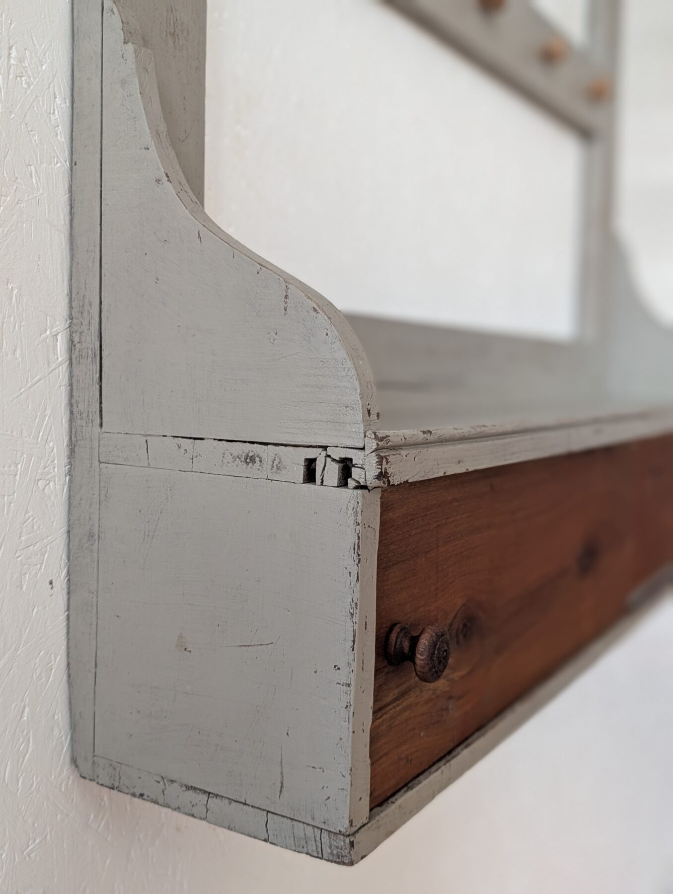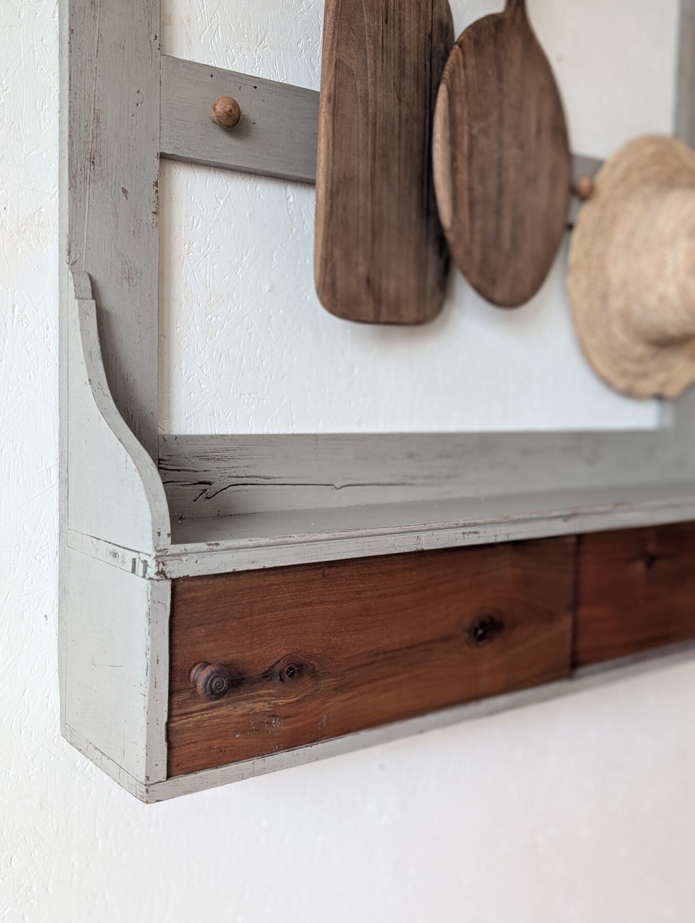 Etagère murale ancienne en chêne avec patine grise, de nombreux crochets pour suspendre déco, tasses, torchons,… ainsi que 2 portes coulissantes.