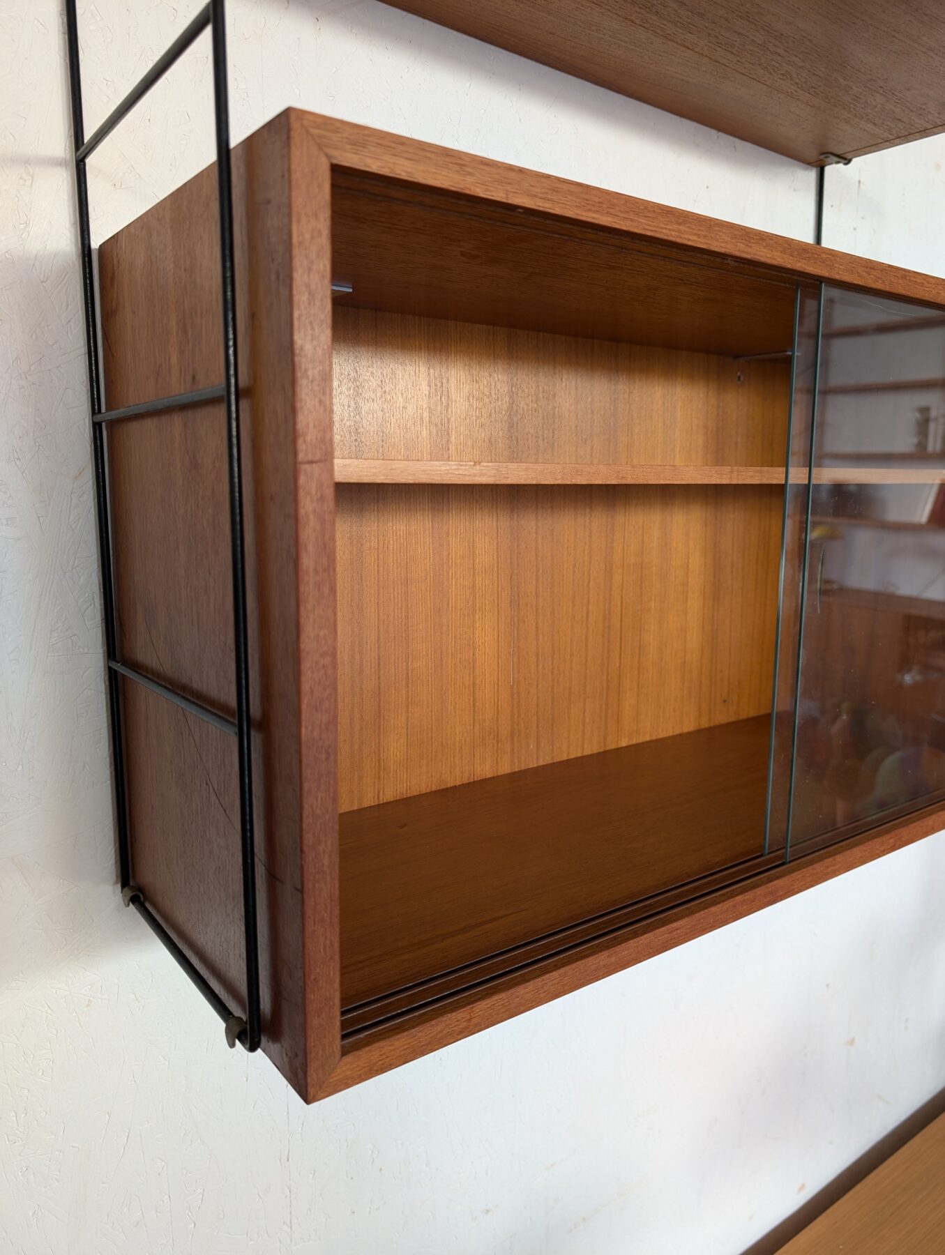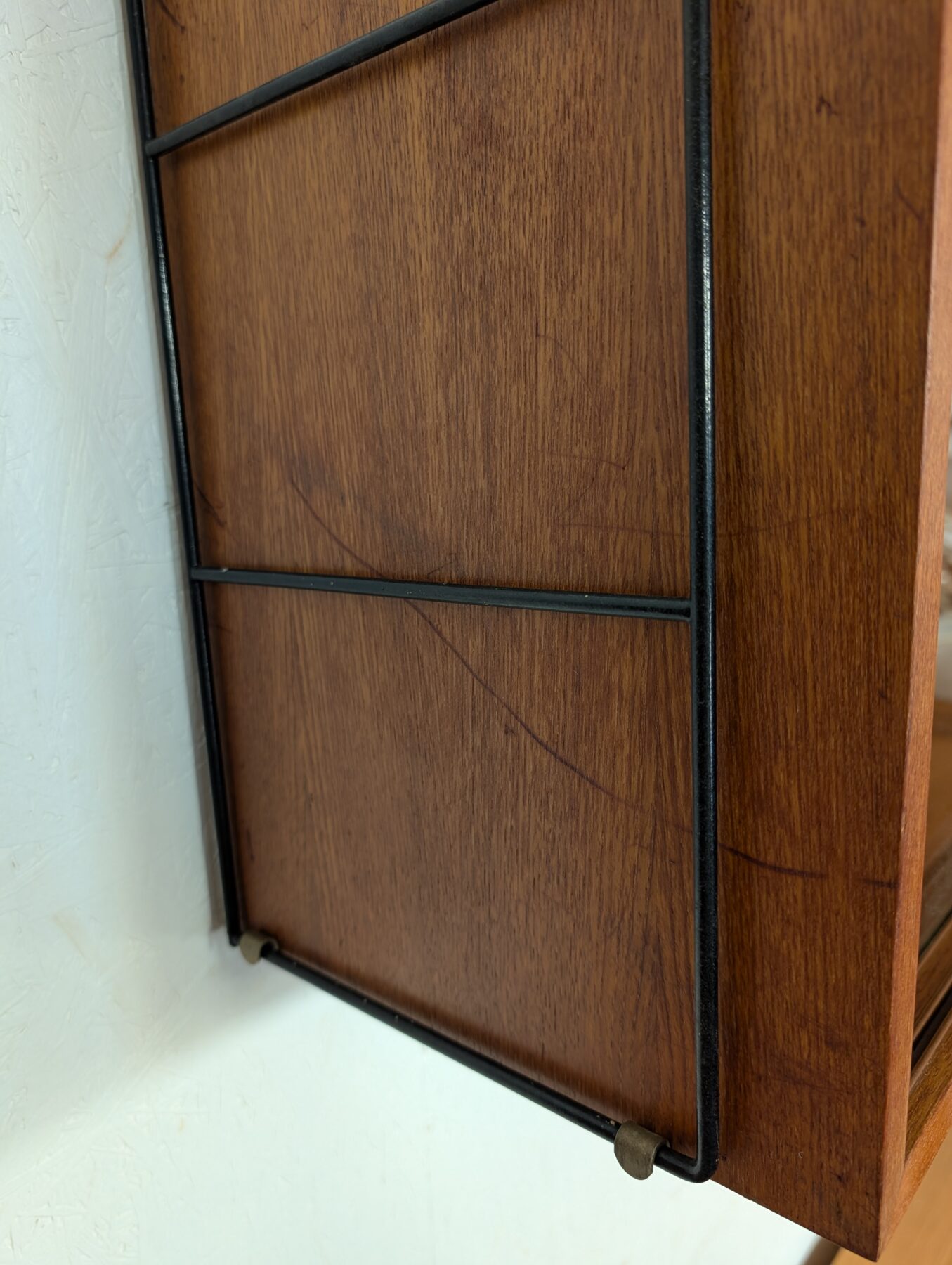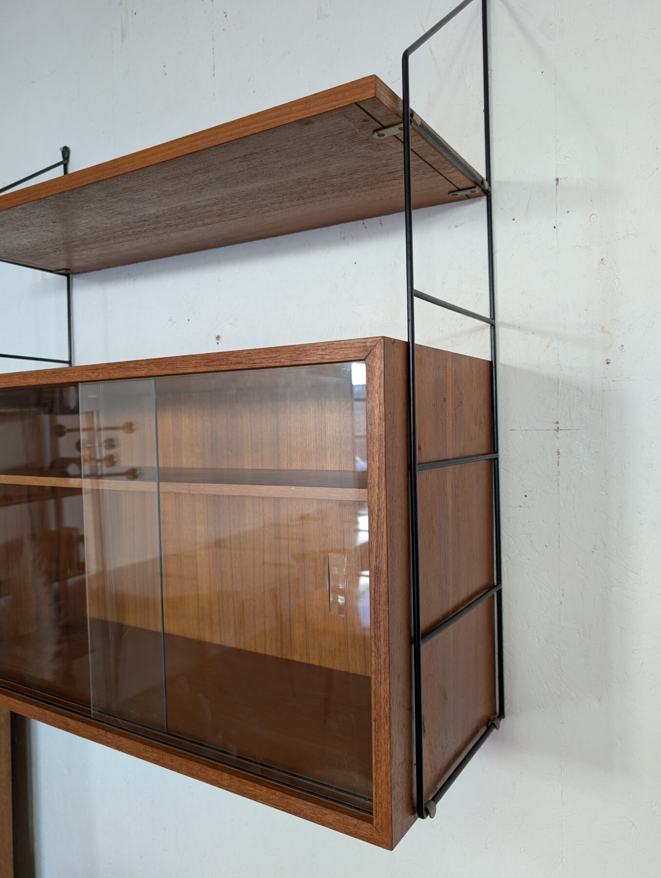Ensemble mural en teck avec 2 échelles métalliques noires comprenant un caisson avec vitrines et une tablette.