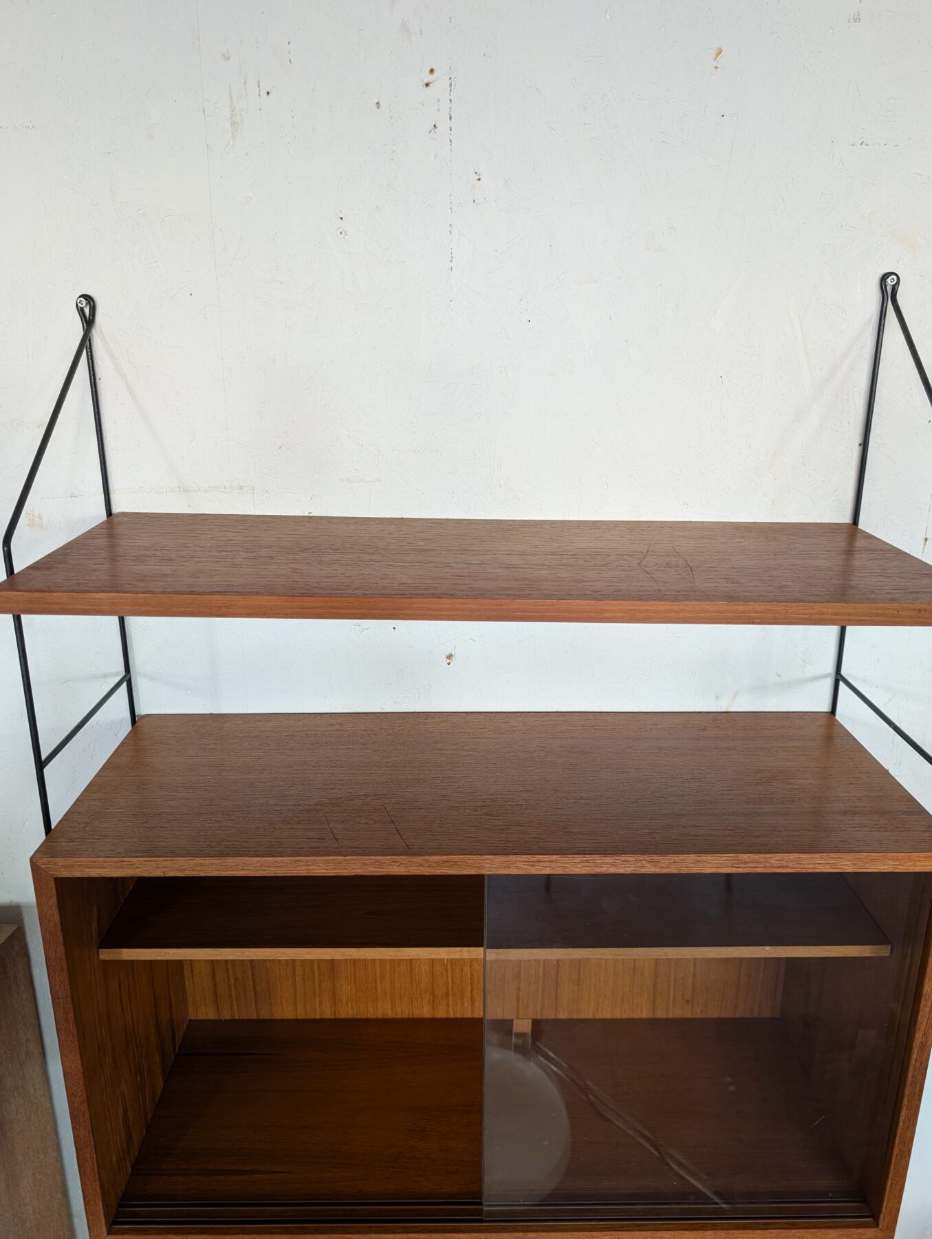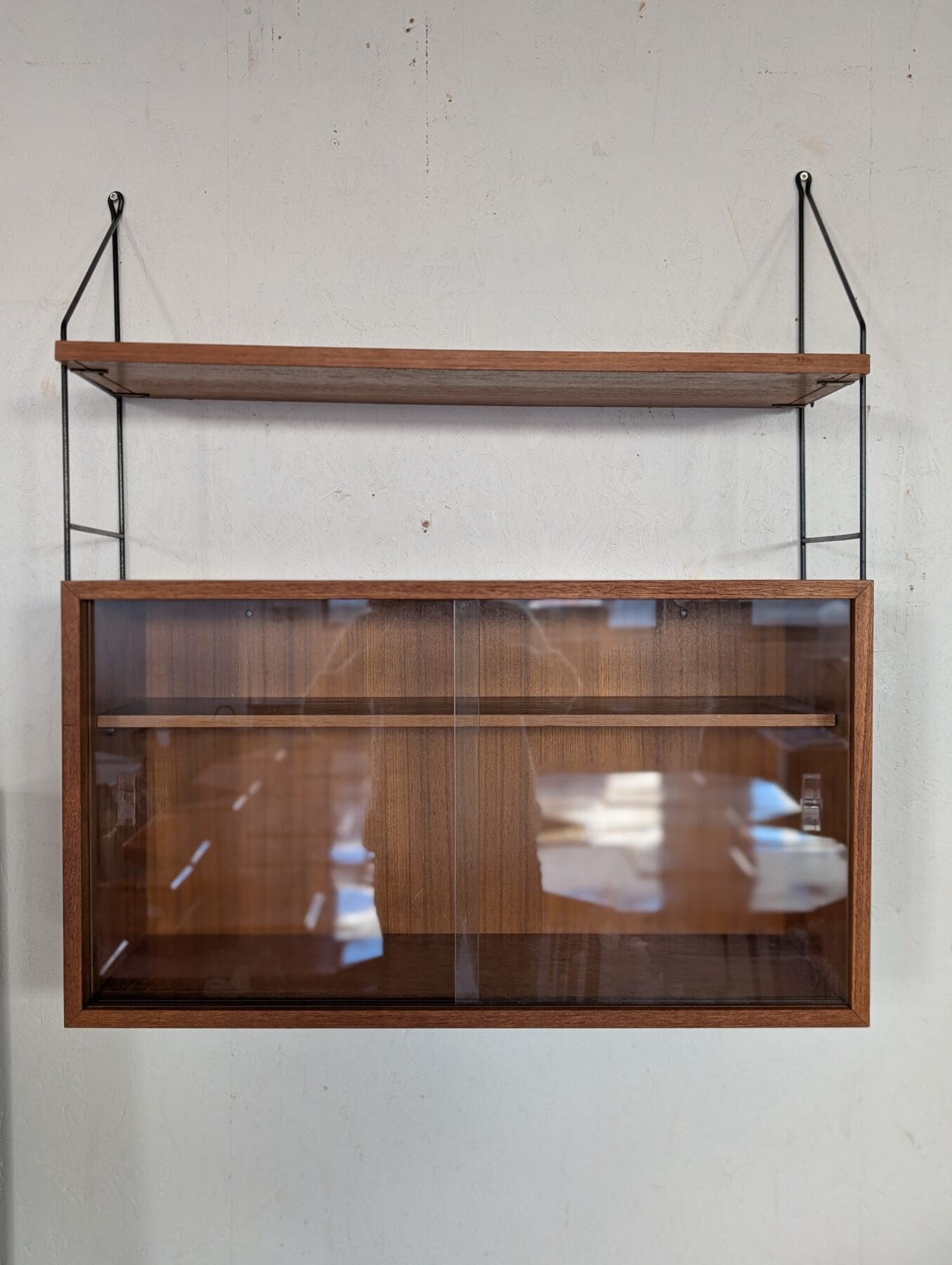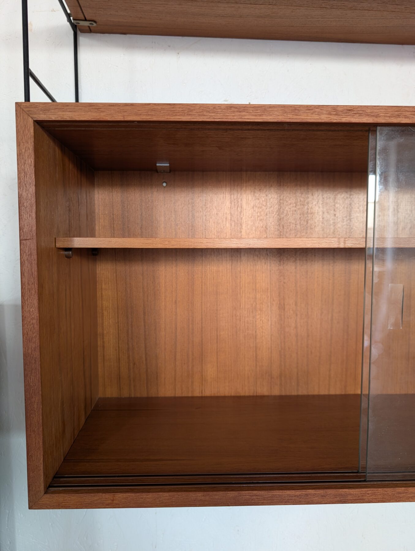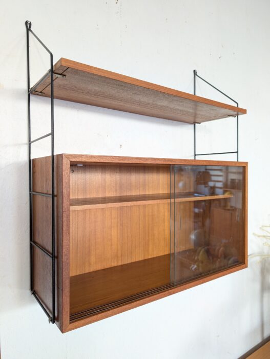 Ensemble mural en teck avec 2 échelles métalliques noires comprenant un caisson avec vitrines et une tablette.