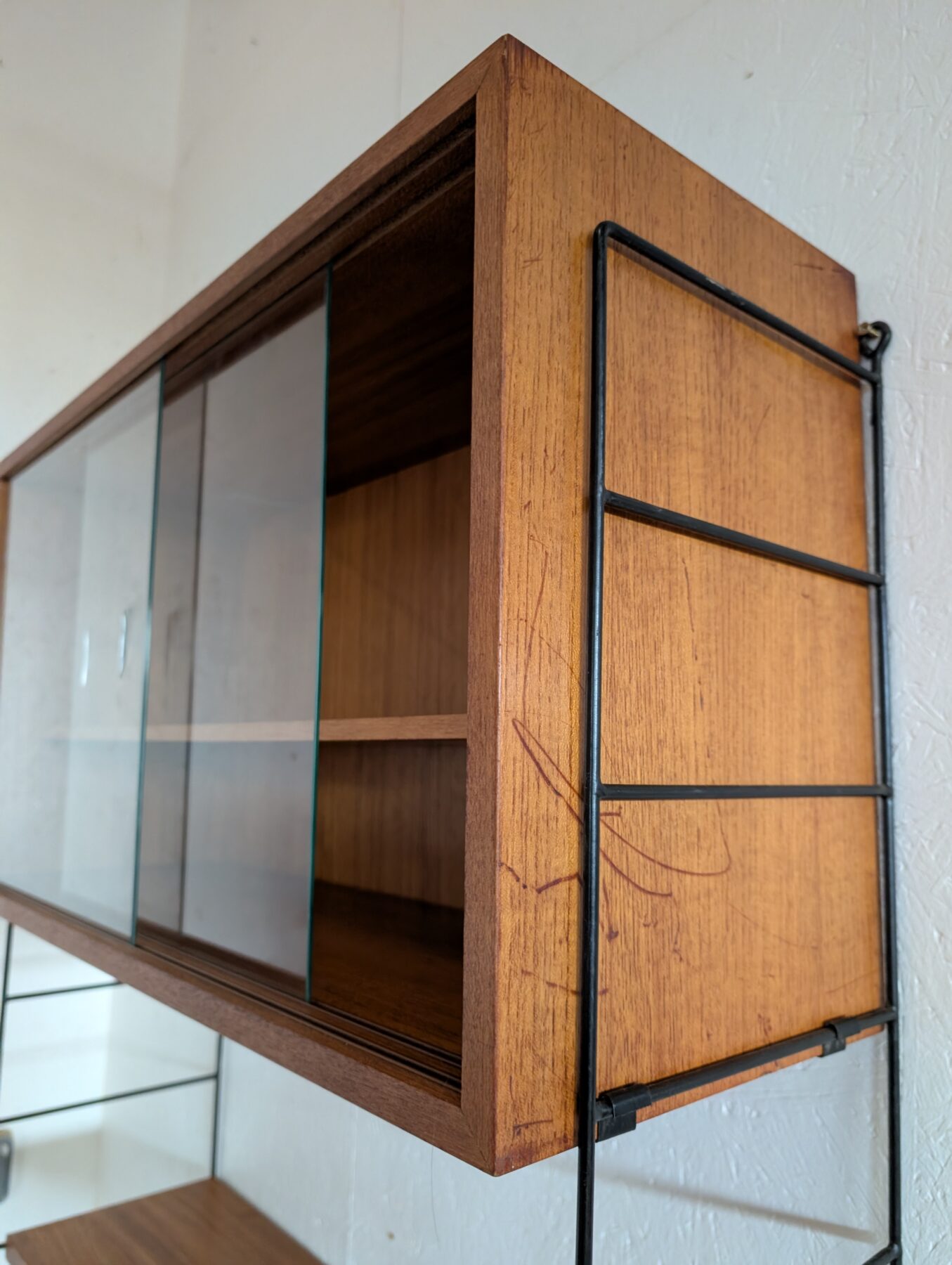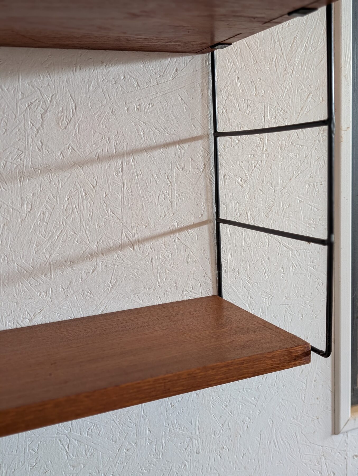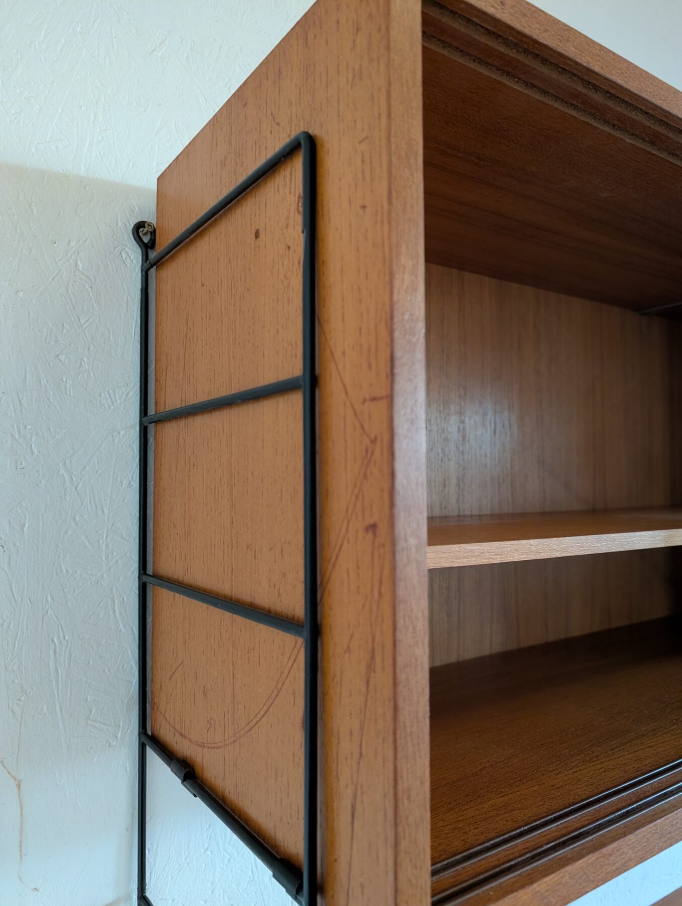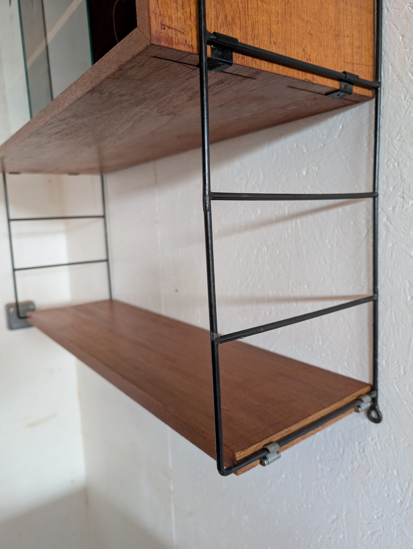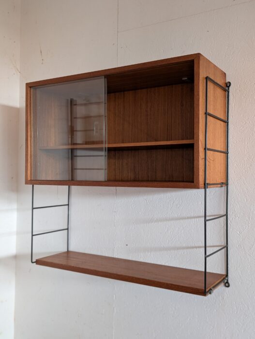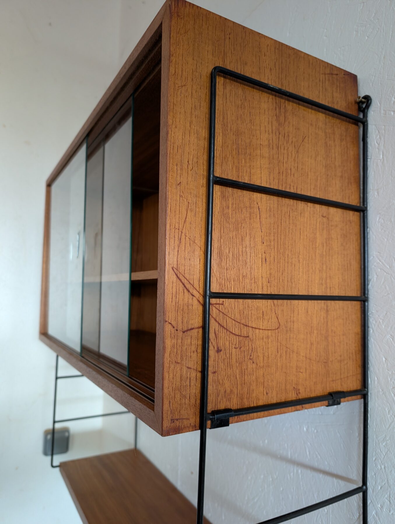 Meuble vitrine mural teck des années 60 avec étagère et échelles métalliques.