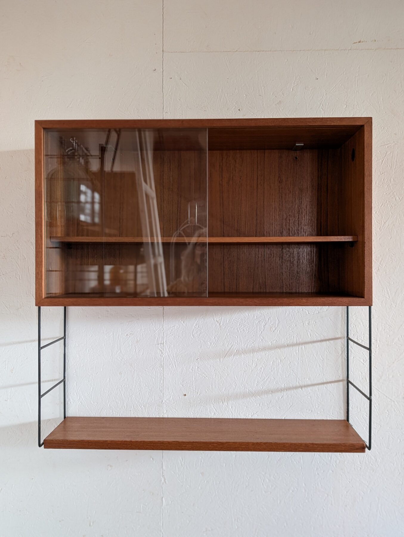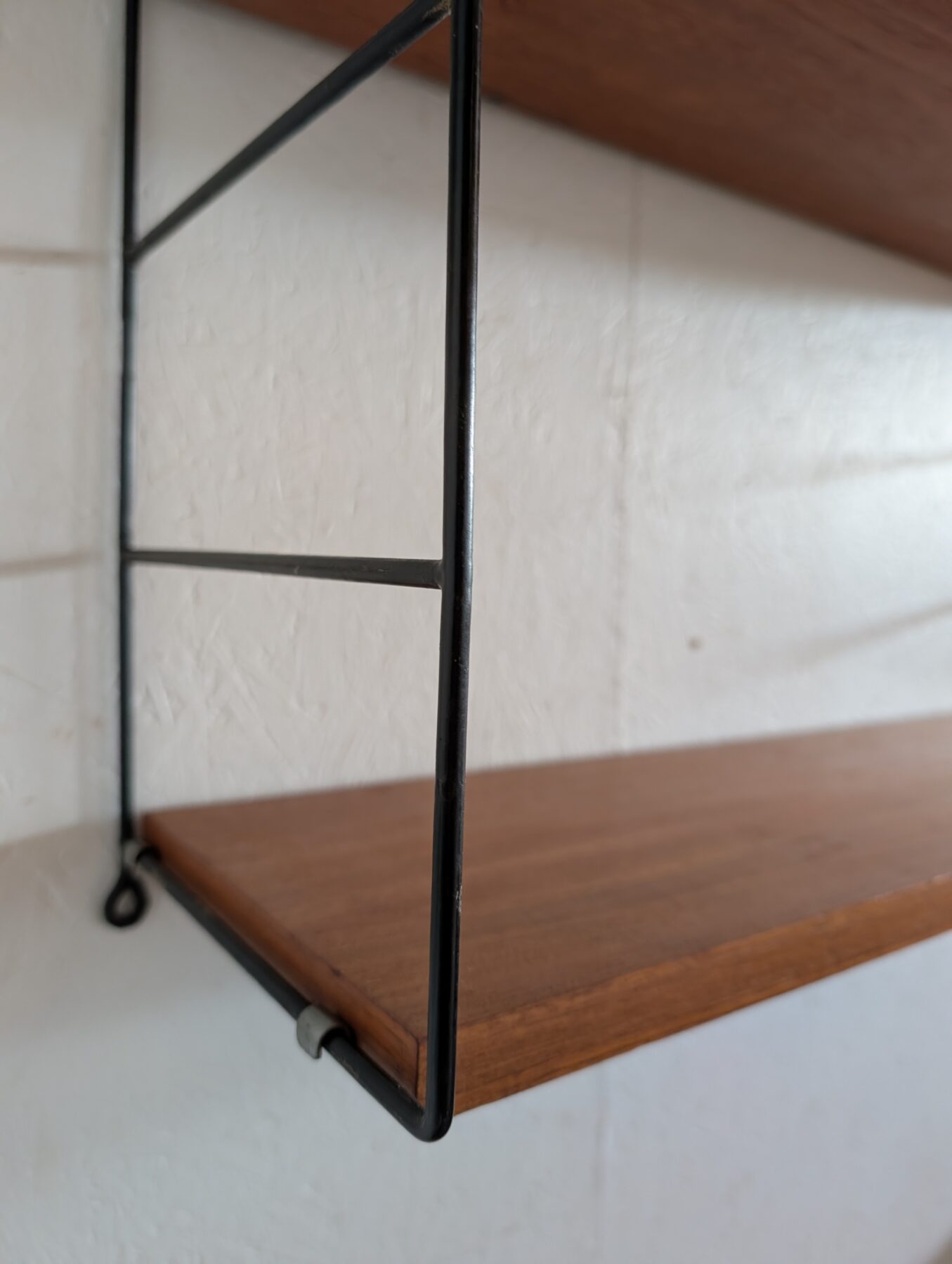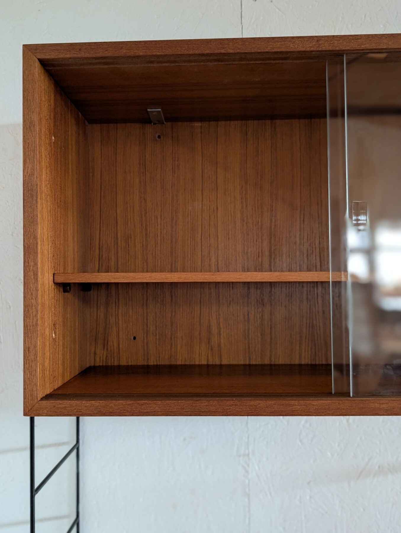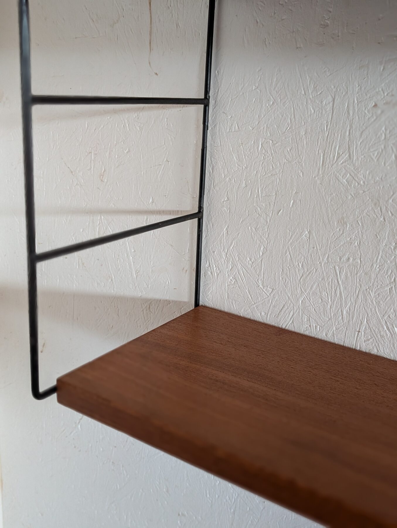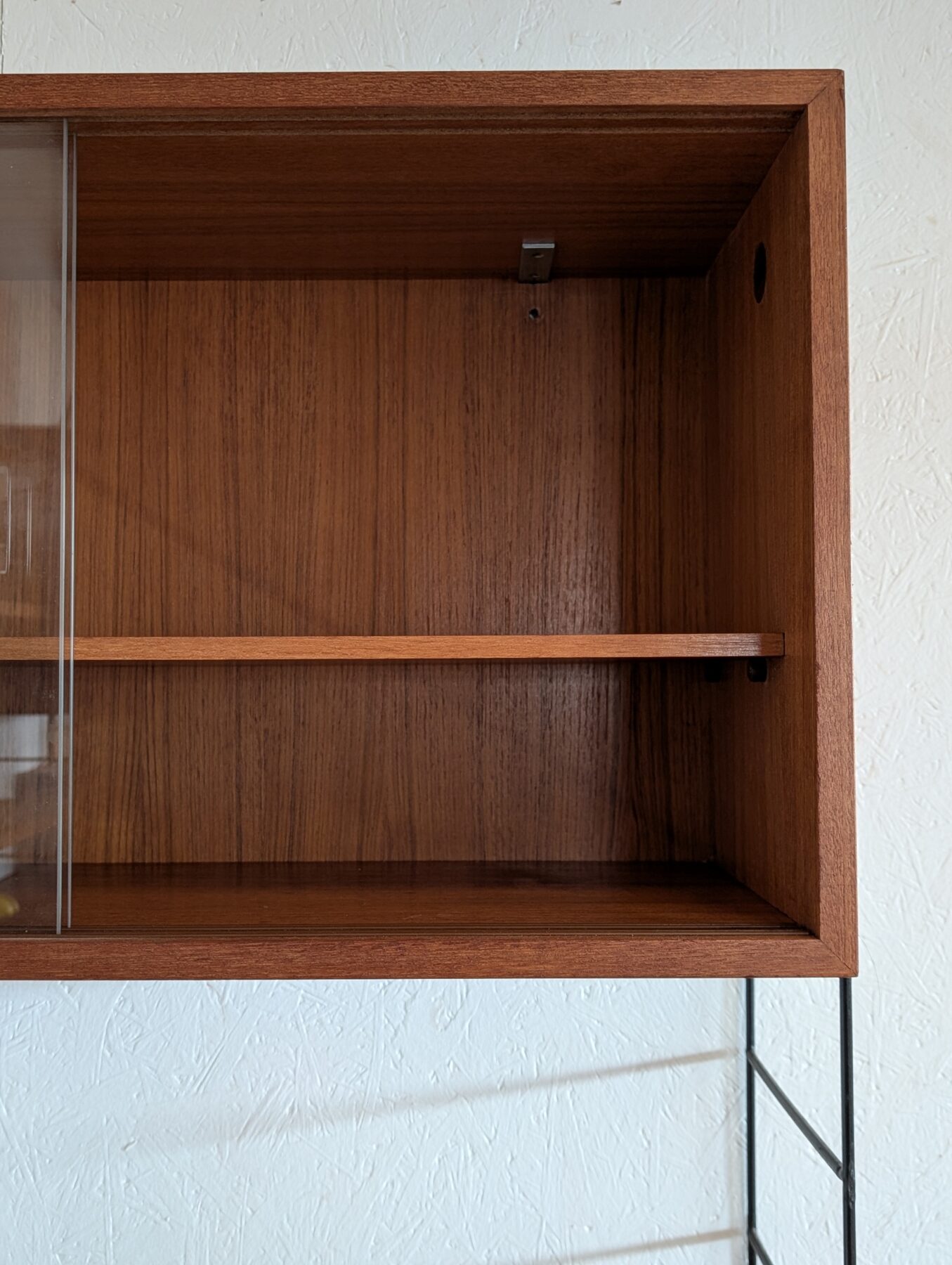 Meuble vitrine mural teck des années 60 avec étagère et échelles métalliques.